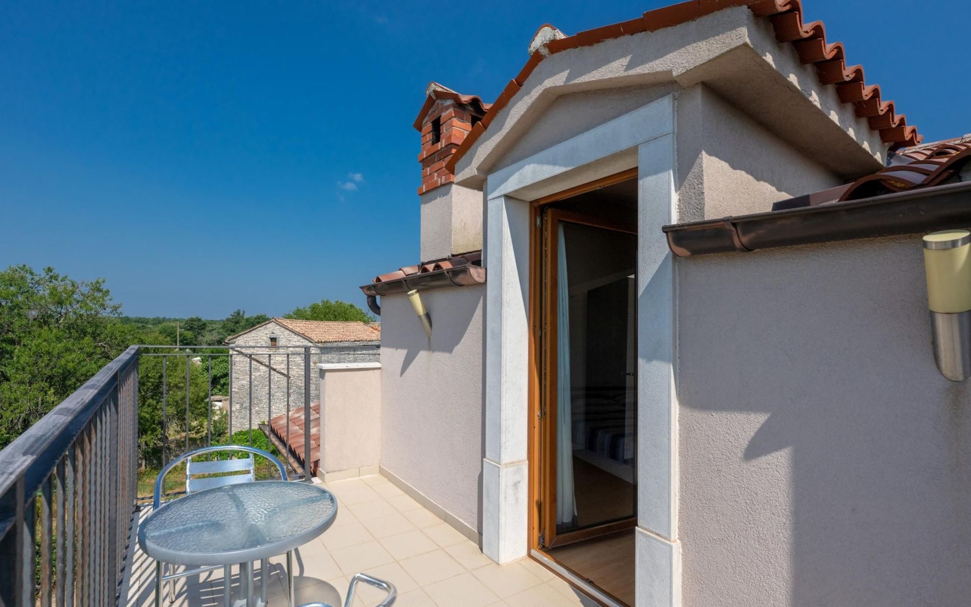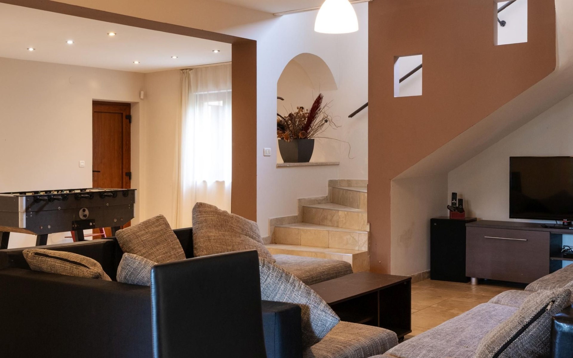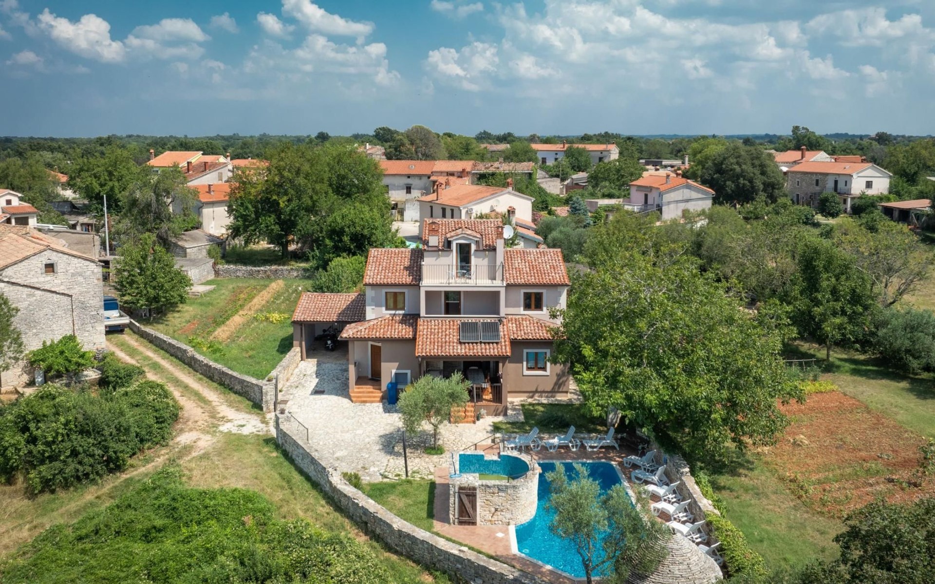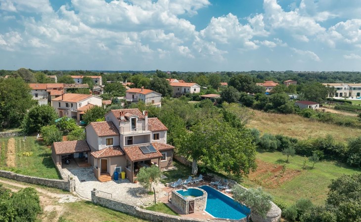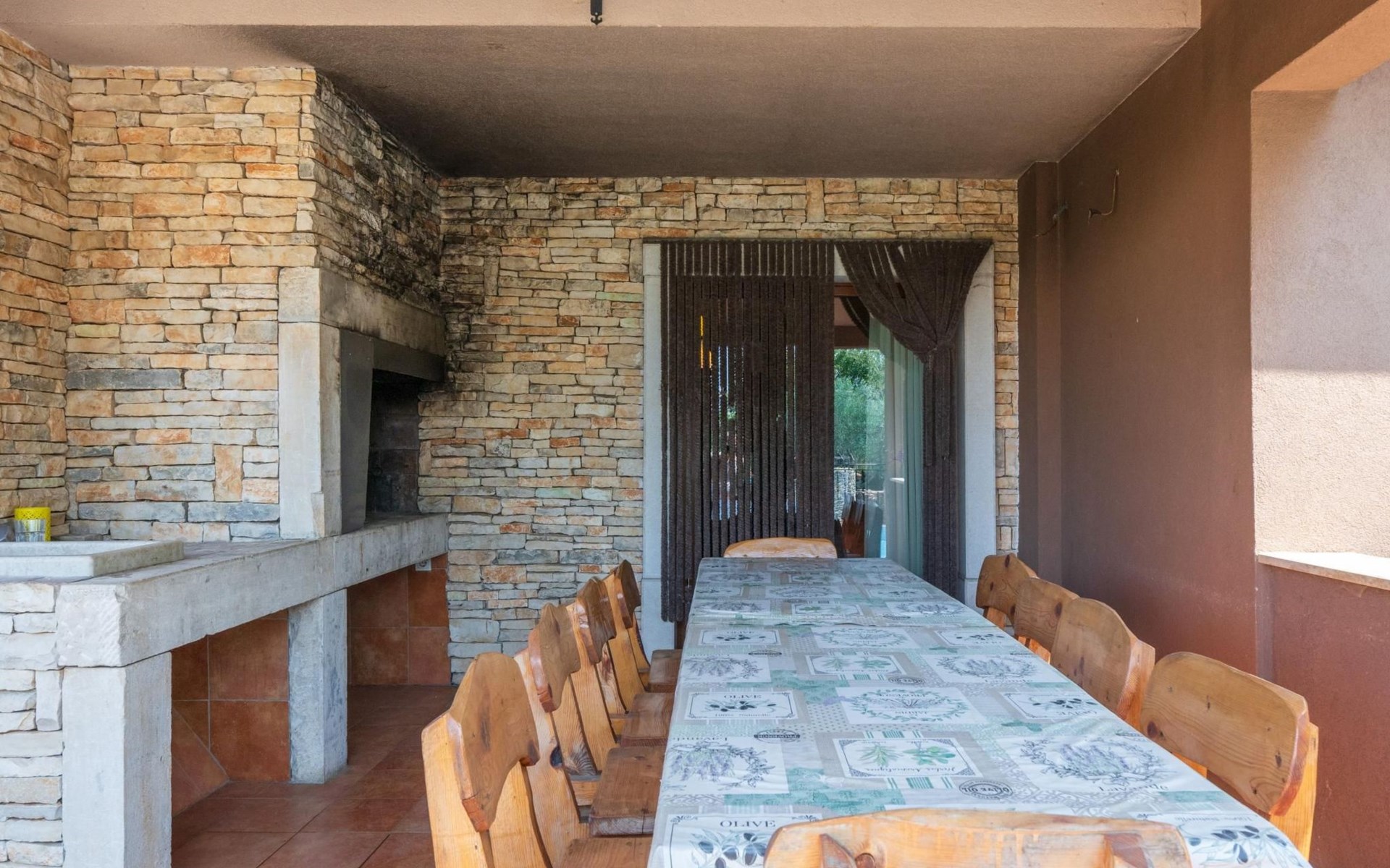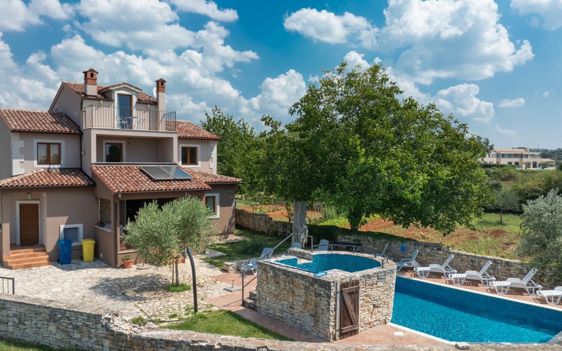 The outdoor area is a true highlight, centered around a private swimming pool surrounded by sunbeds. A traditional Istrian kažun stone hut adds rustic charm to the property, while the covered terrace and charcoal barbecue create the perfect setting for outdoor meals.