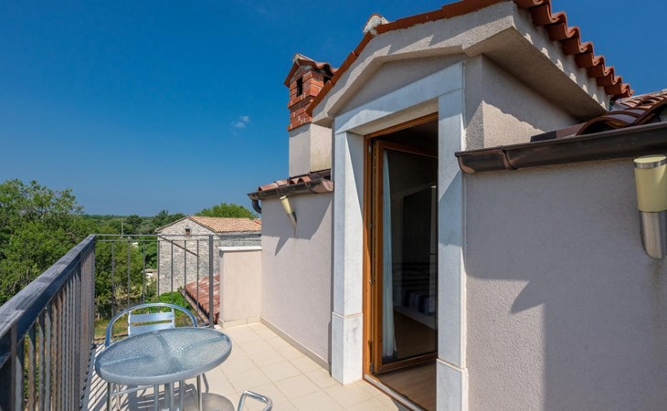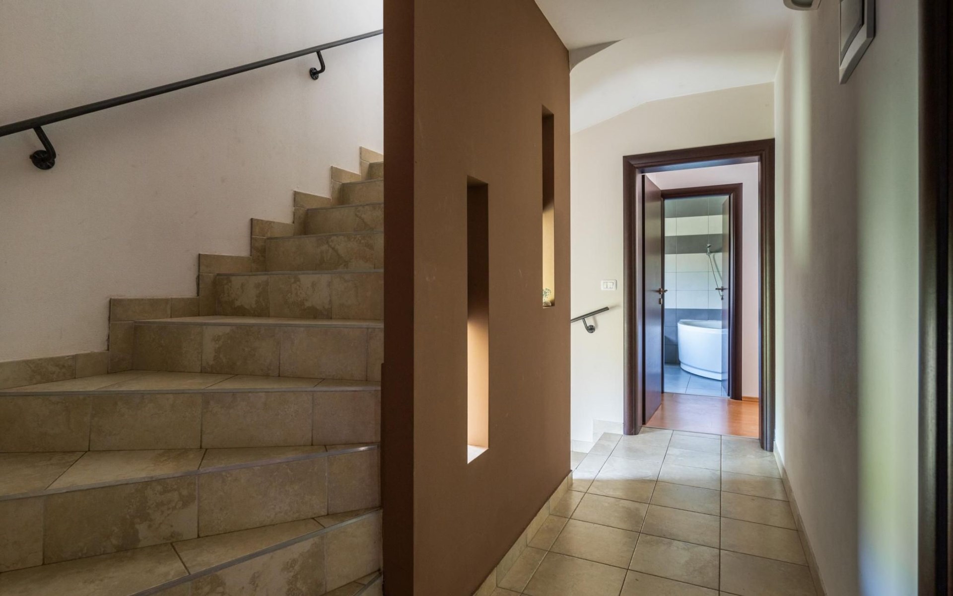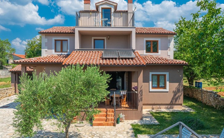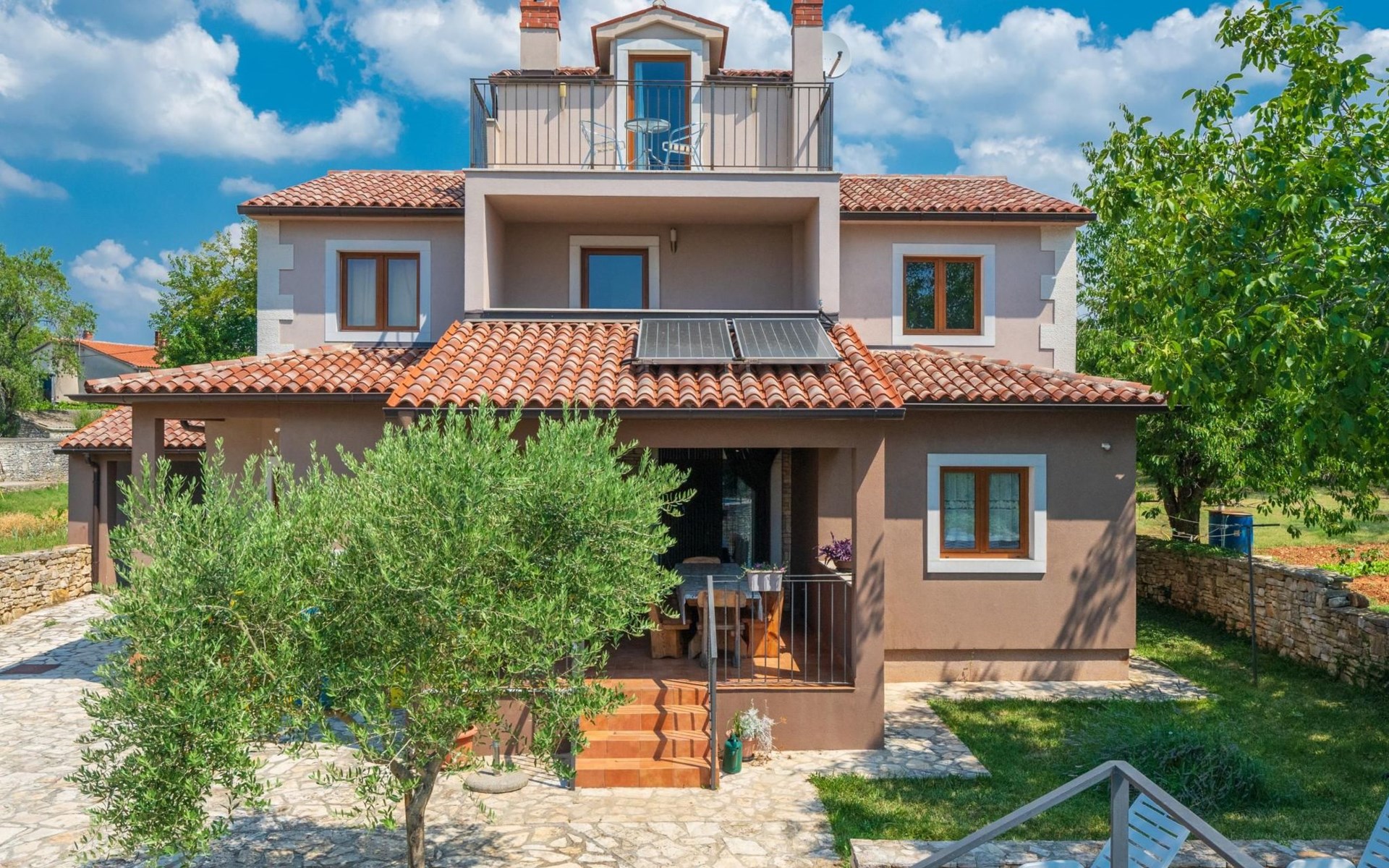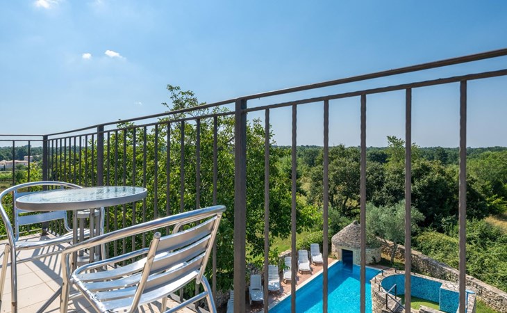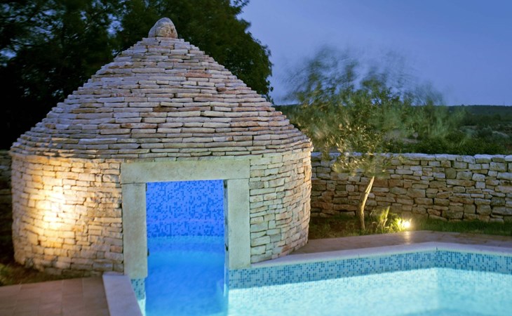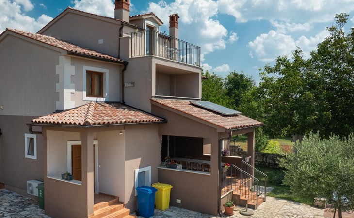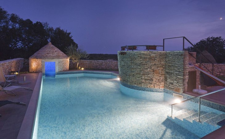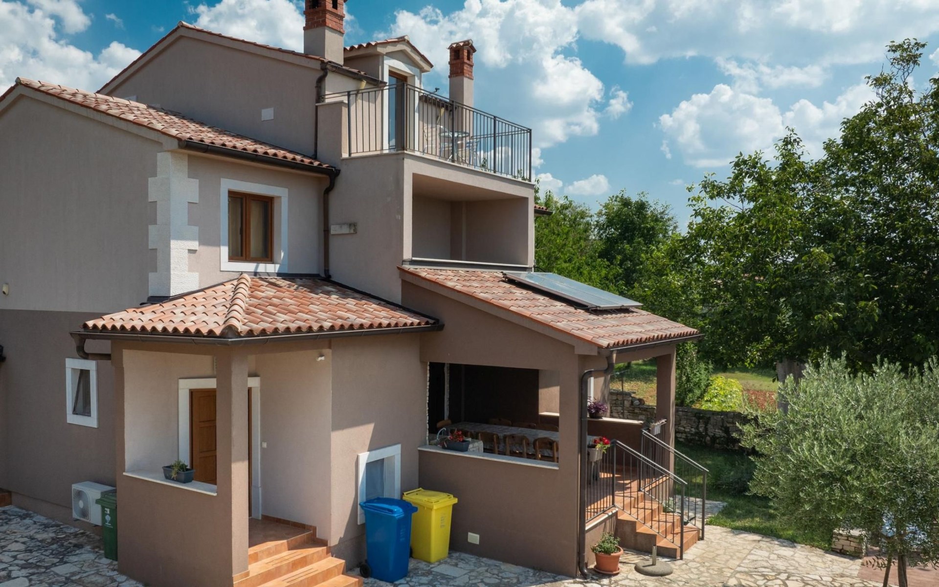 The outdoor area is a true highlight, centered around a private swimming pool surrounded by sunbeds. A traditional Istrian kažun stone hut adds rustic charm to the property, while the covered terrace and charcoal barbecue create the perfect setting for outdoor meals.