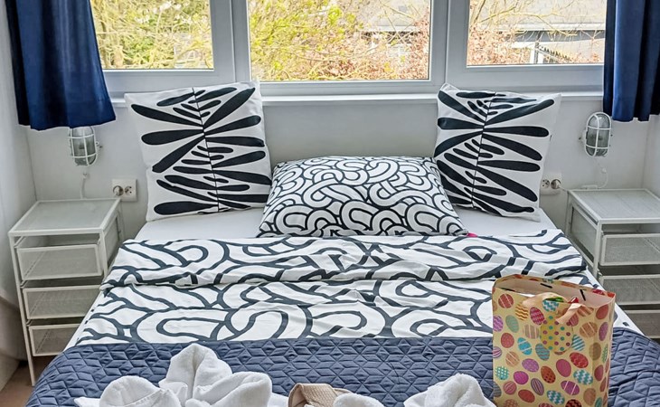 This holiday home features three bedrooms, one of which is on the ground floor and two on the first floor. The cozy living room is equipped with a comfortable seating area and an extensive German channel package (including RTL, SAT1, and Pro Sieben). The modern kitchen is fully equipped, including a dishwasher, XL Airfryer, and combination microwave.