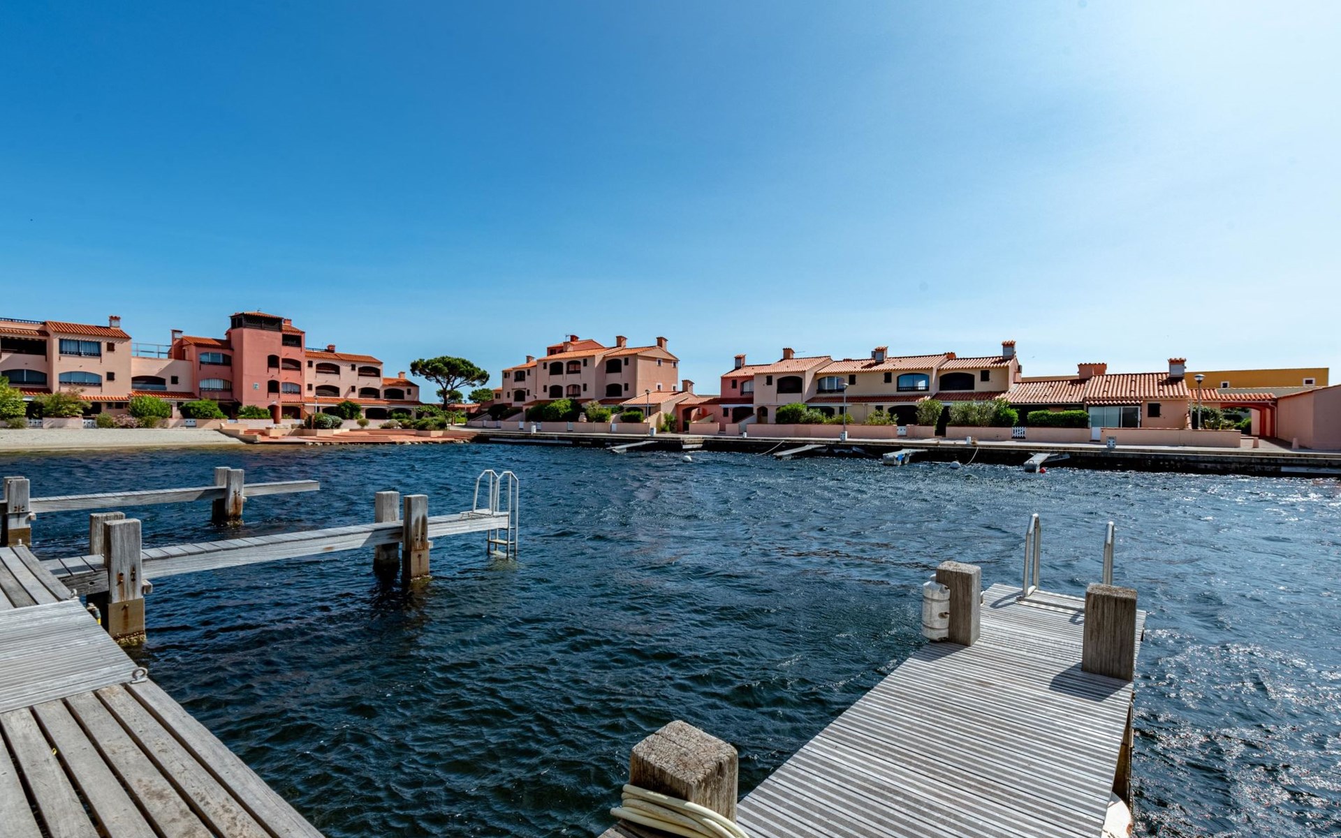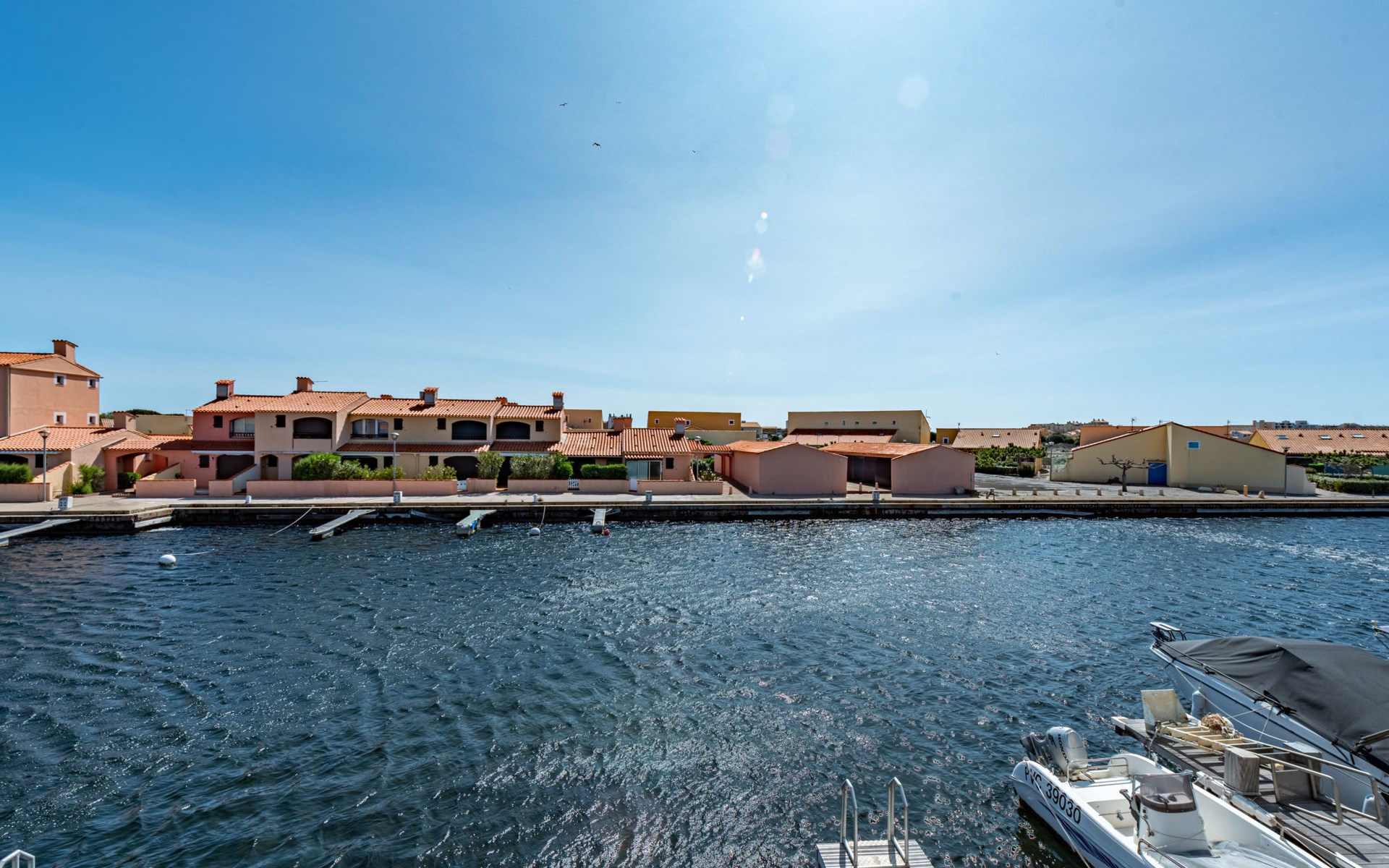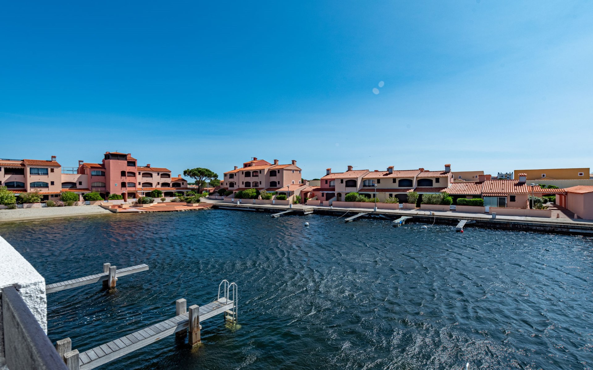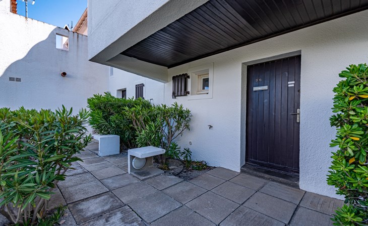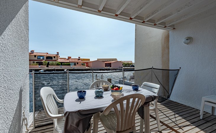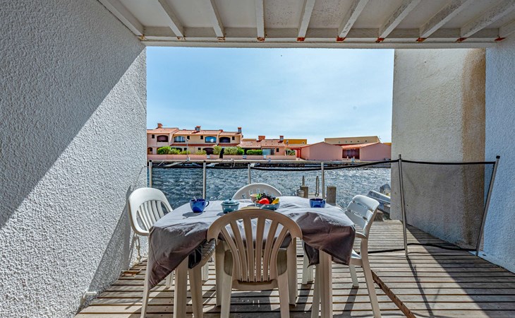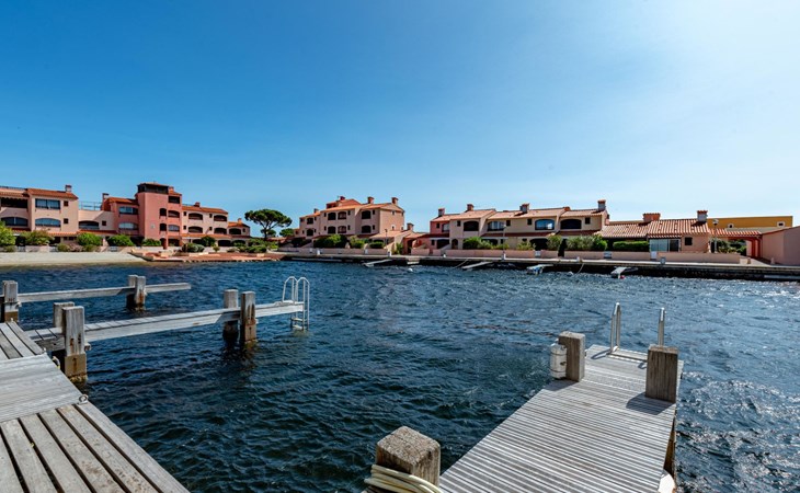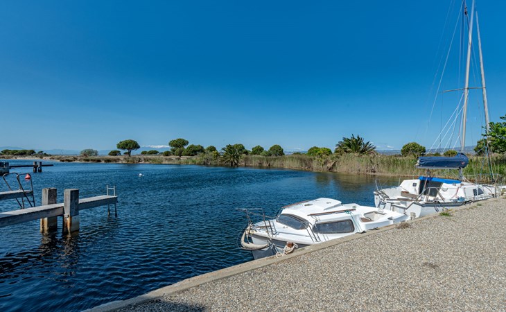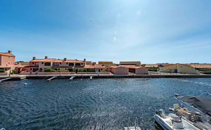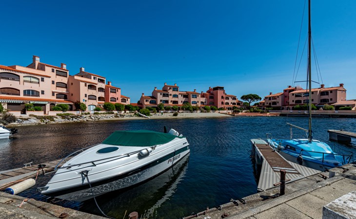 Residence "Les Brigantins". On the outskirts, 3 km from the sea, 50 m from the lake, 3 km from the beach, in a cul-de-sac. For shared use: natural pond, public parking 80 m. Grocery 3 km, supermarket 5 km, shopping centre 4 km, restaurant 2 km, bar 2 km, bakery 3 km, bus stop "Le Barcarès" 600 m, railway station "La Franqui" 16 km, sandy beach 3 km, diving center 6 km, outdoor swimming pool 4 km, nudist beach 5 km. Sports harbour 7 km, surf school 1 km, sailing school 3 km, tennis 3 km, minigolf 5 km, riding stable 9 km. Nearby attractions: Aqualand Port Leucate 7 km, Réserve Africaine de Sigean 41 km, Fort de Salses 20 km, Narbonne 55 km, Perpignan 25 km, Barcelone 215 km. Well-known lakes can easily be reached: Etang de Leucate ou Salses 7 km, Lac de Villeneuve de La Raho 28 km. Hiking paths: Sentier du guetteur 8 km, Station meteorologique de Opoul Perillos 25 km, Sentier du littoral Collioure 40 km. Please note: car recommended. Residence with electric gates. The photograph shows a typical example. Additional accommodations can be booked. Protection barrier on the pontoon.
