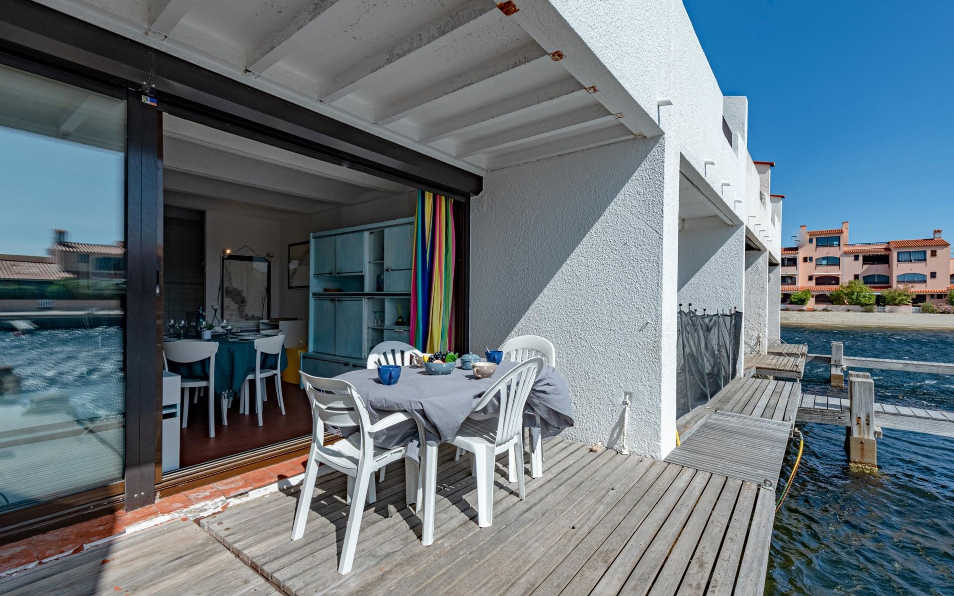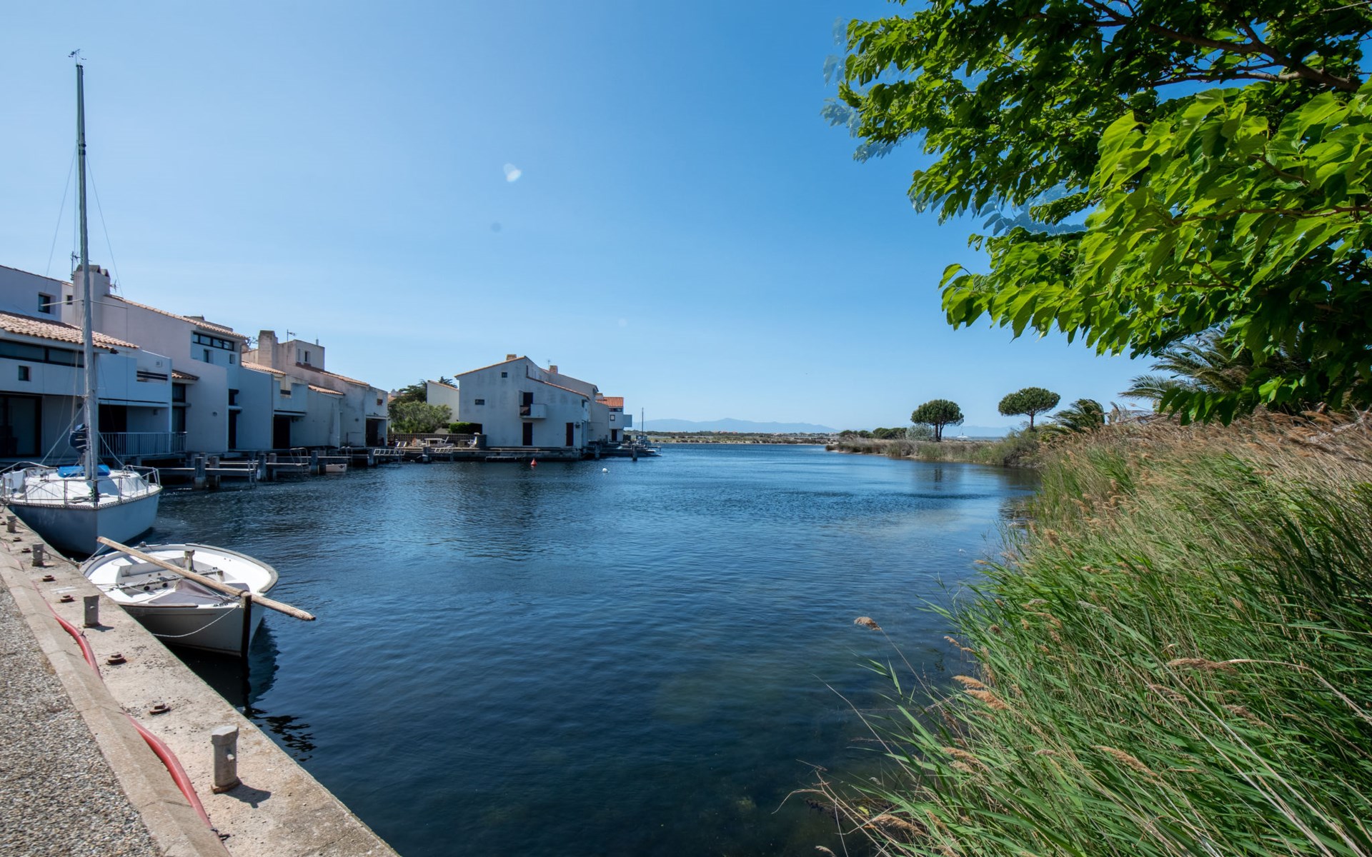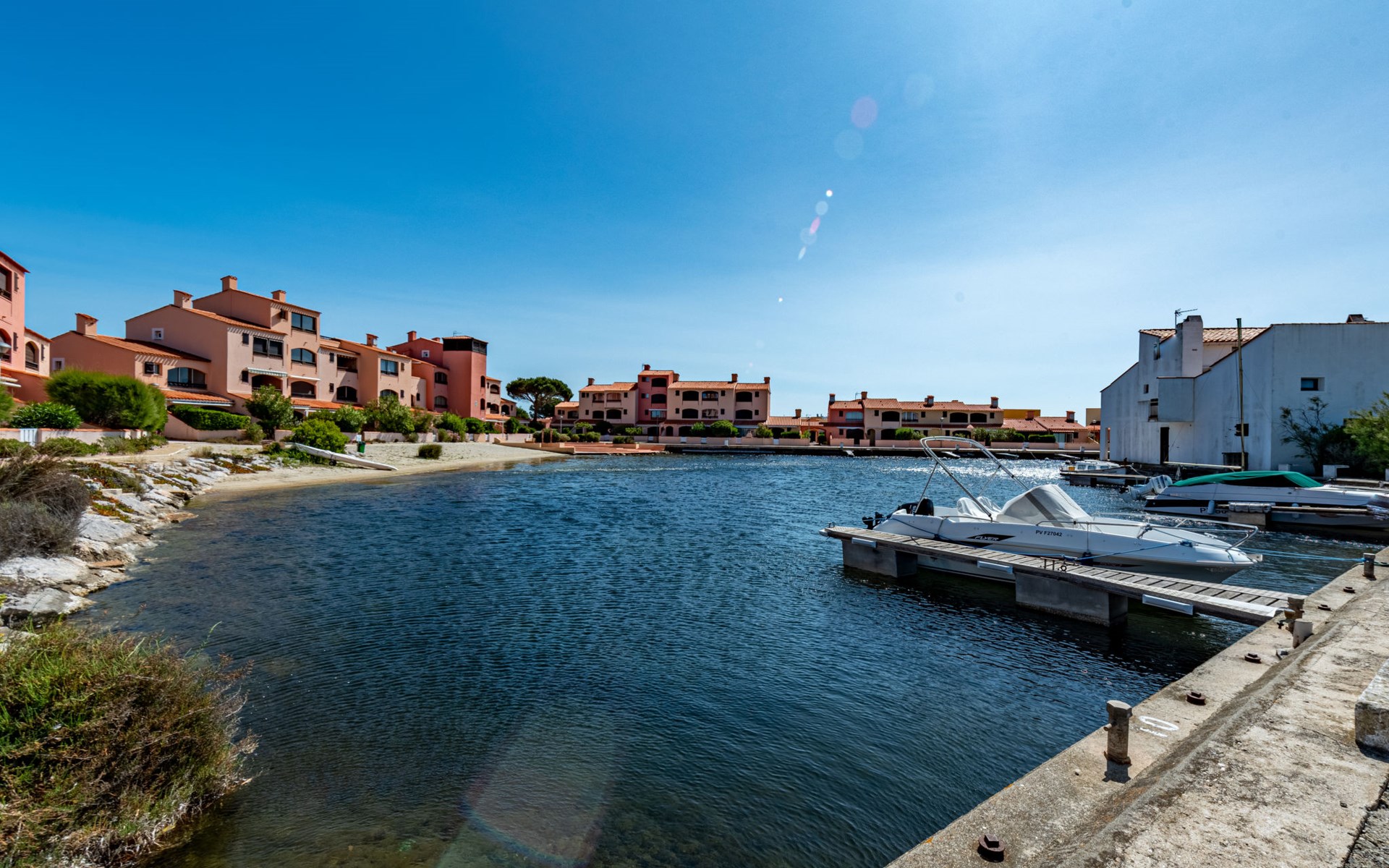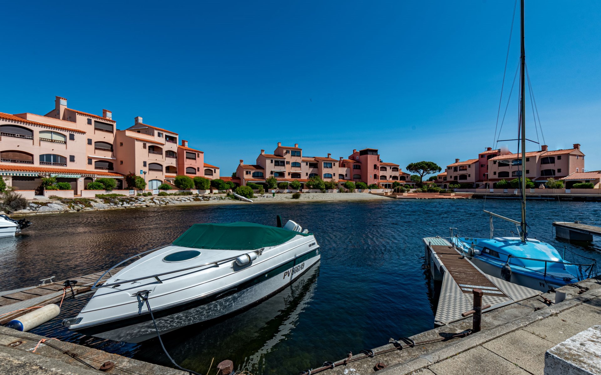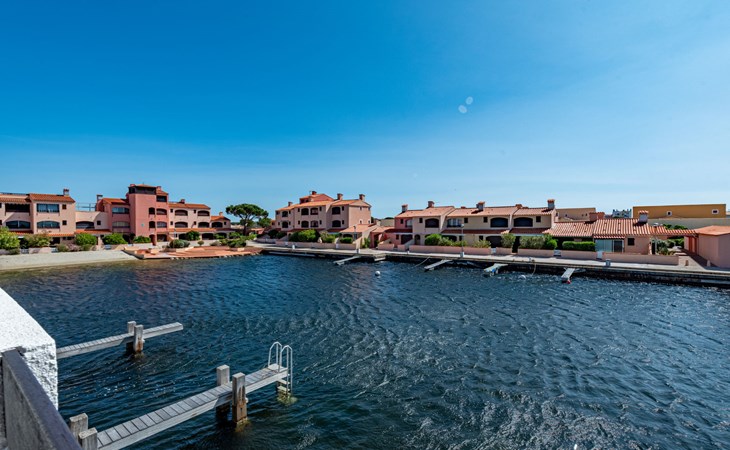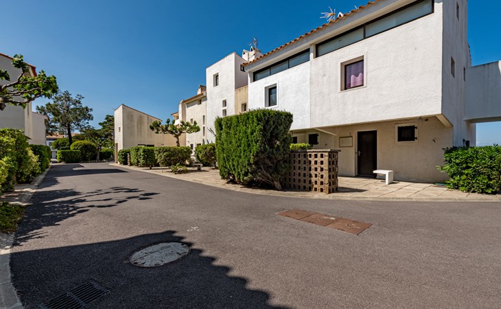 Residence "Les Brigantins". On the outskirts, 3 km from the sea, 50 m from the lake, 3 km from the beach, in a cul-de-sac. For shared use: natural pond, public parking 80 m. Grocery 3 km, supermarket 5 km, shopping centre 4 km, restaurant 2 km, bar 2 km, bakery 3 km, bus stop "Le Barcarès" 600 m, railway station "La Franqui" 16 km, sandy beach 3 km, diving center 6 km, outdoor swimming pool 4 km, nudist beach 5 km. Sports harbour 7 km, surf school 1 km, sailing school 3 km, tennis 3 km, minigolf 5 km, riding stable 9 km. Nearby attractions: Aqualand Port Leucate 7 km, Réserve Africaine de Sigean 41 km, Fort de Salses 20 km, Narbonne 55 km, Perpignan 25 km, Barcelone 215 km. Well-known lakes can easily be reached: Etang de Leucate ou Salses 7 km, Lac de Villeneuve de La Raho 28 km. Hiking paths: Sentier du guetteur 8 km, Station meteorologique de Opoul Perillos 25 km, Sentier du littoral Collioure 40 km. Please note: car recommended. Residence with electric gates. The photograph shows a typical example. Additional accommodations can be booked. Protection barrier on the pontoon.