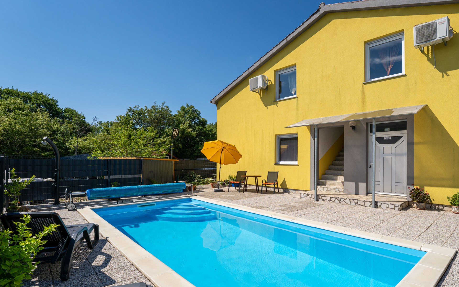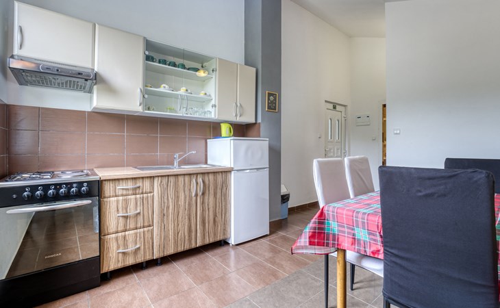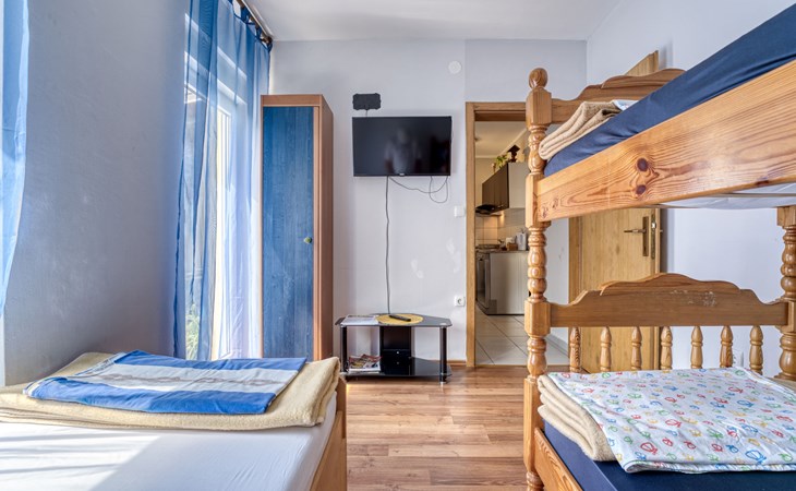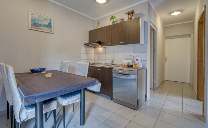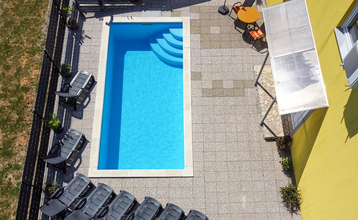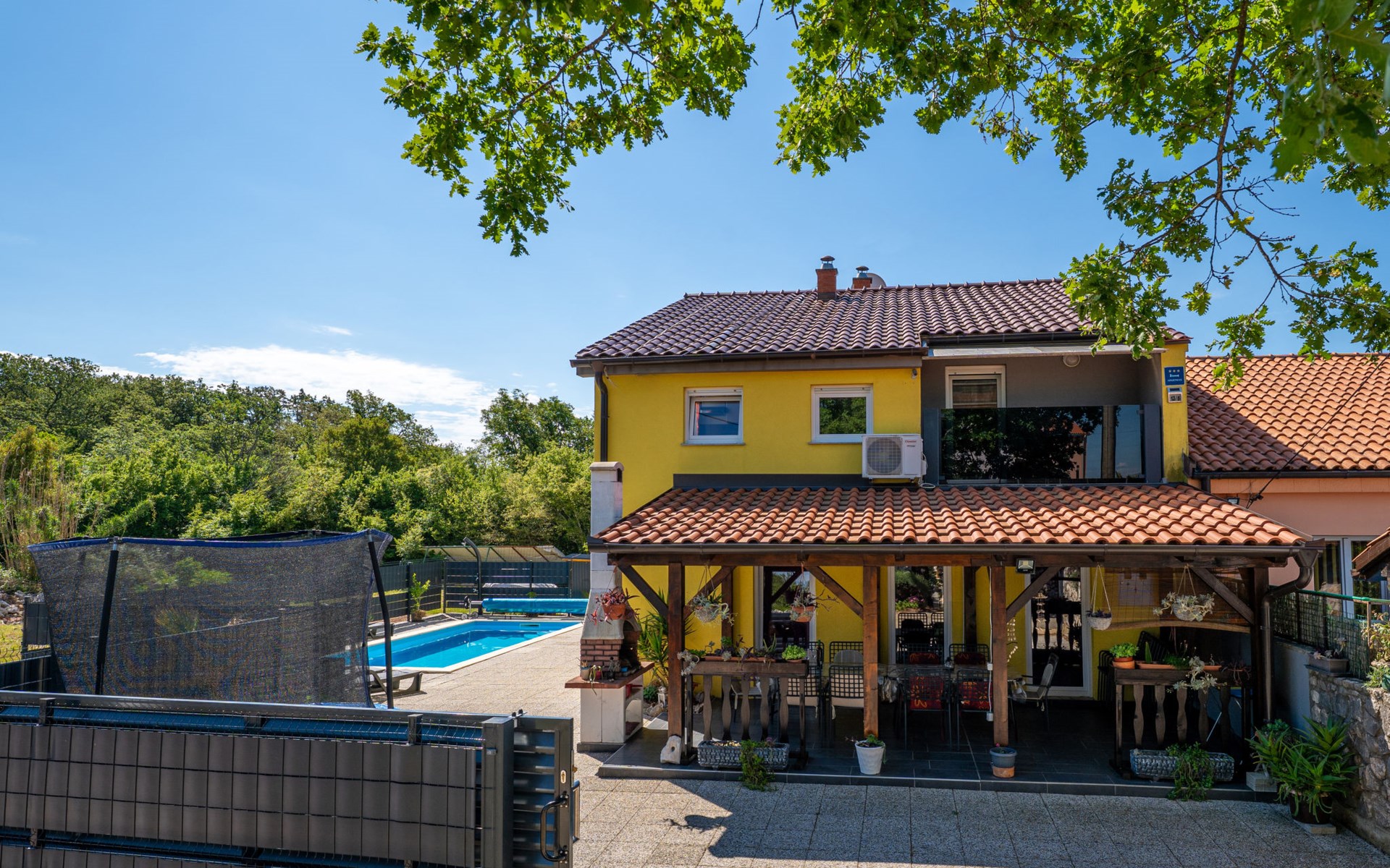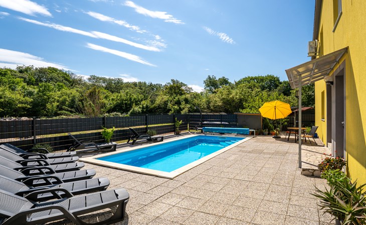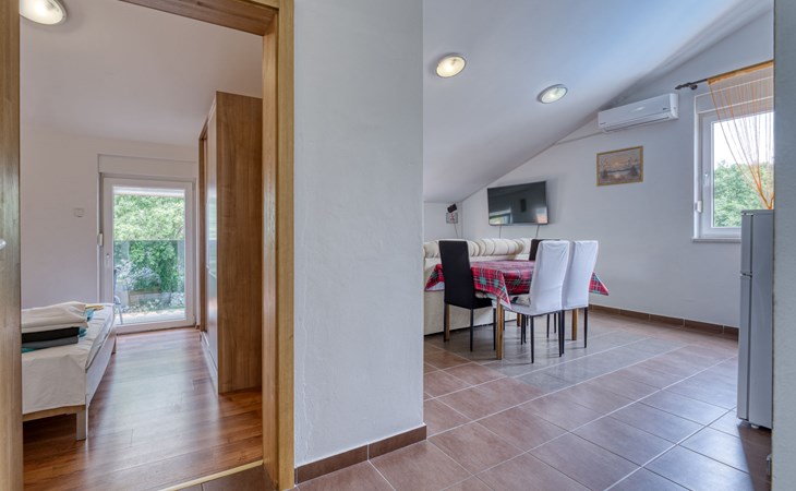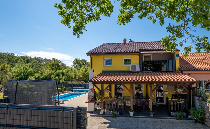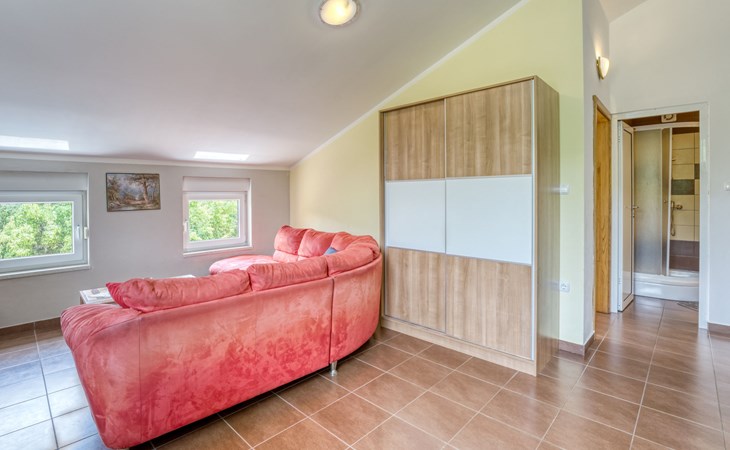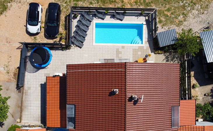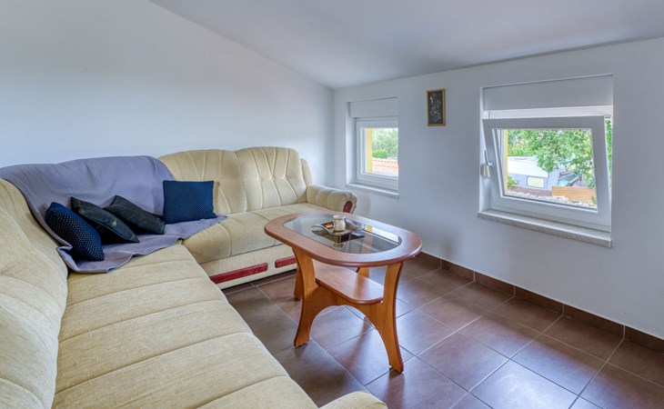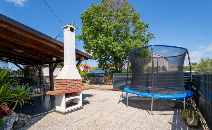 Semi-detached house "Radmila", 2 storeys. 3 km from the centre of Šilo, 13 km from the centre of Vrbnik, 3 km from the sea, 3 km from the beach, in a cul-de-sac. Private: property 300 m2 (fenced), swimming pool (above ground) (3 x 7 m, depth 130 cm, seasonal availability: 15.Mar. - 15.Nov.). Terrace, barbecue, pool maintenance by the owner/gardener. In the house: internet access, table football, trampoline, washing machine. Parking (for 4 cars) at the house. Shop 1.4 km, restaurant 3 km, bus stop 3.5 km, sandy beach 4 km pebble beach 3 km. Please note: airfield 16 km from the property. Semi-detached house consists of 3 apartments rented as one unit: one apartment on the ground floor and two apartments on the first floor.