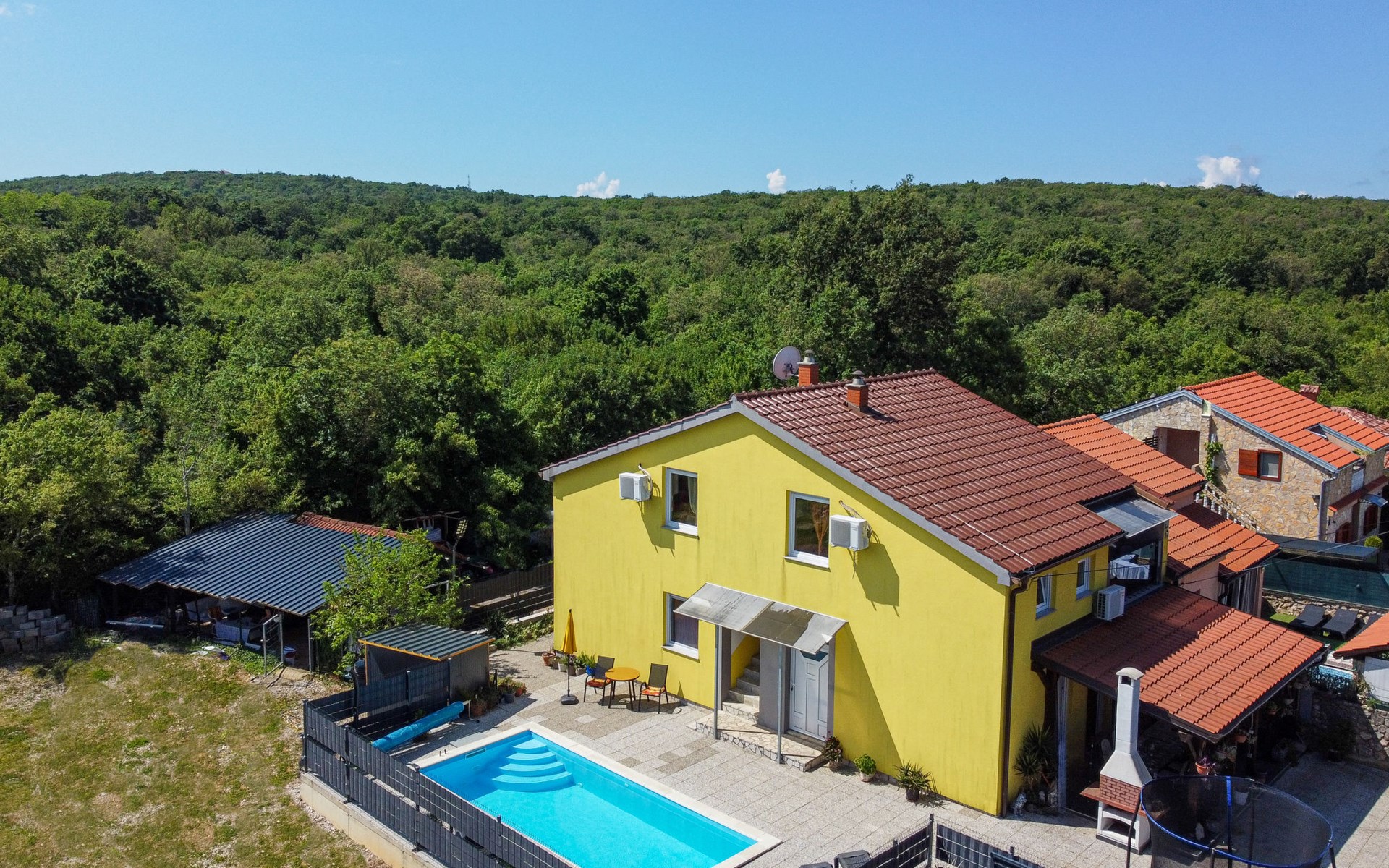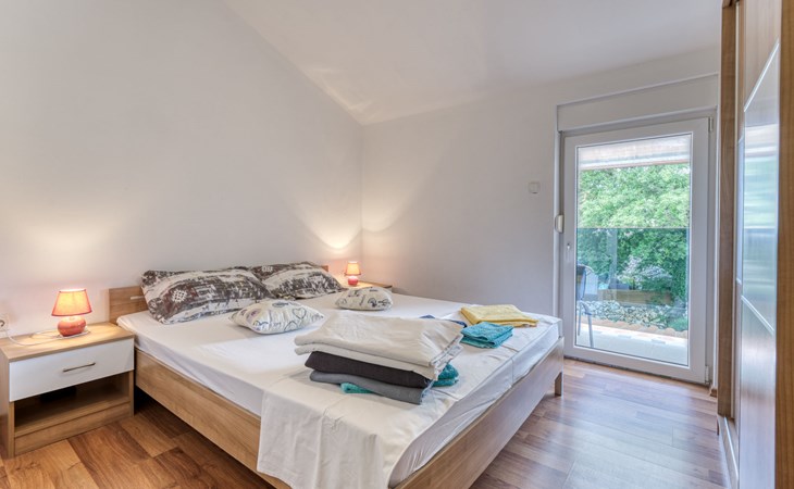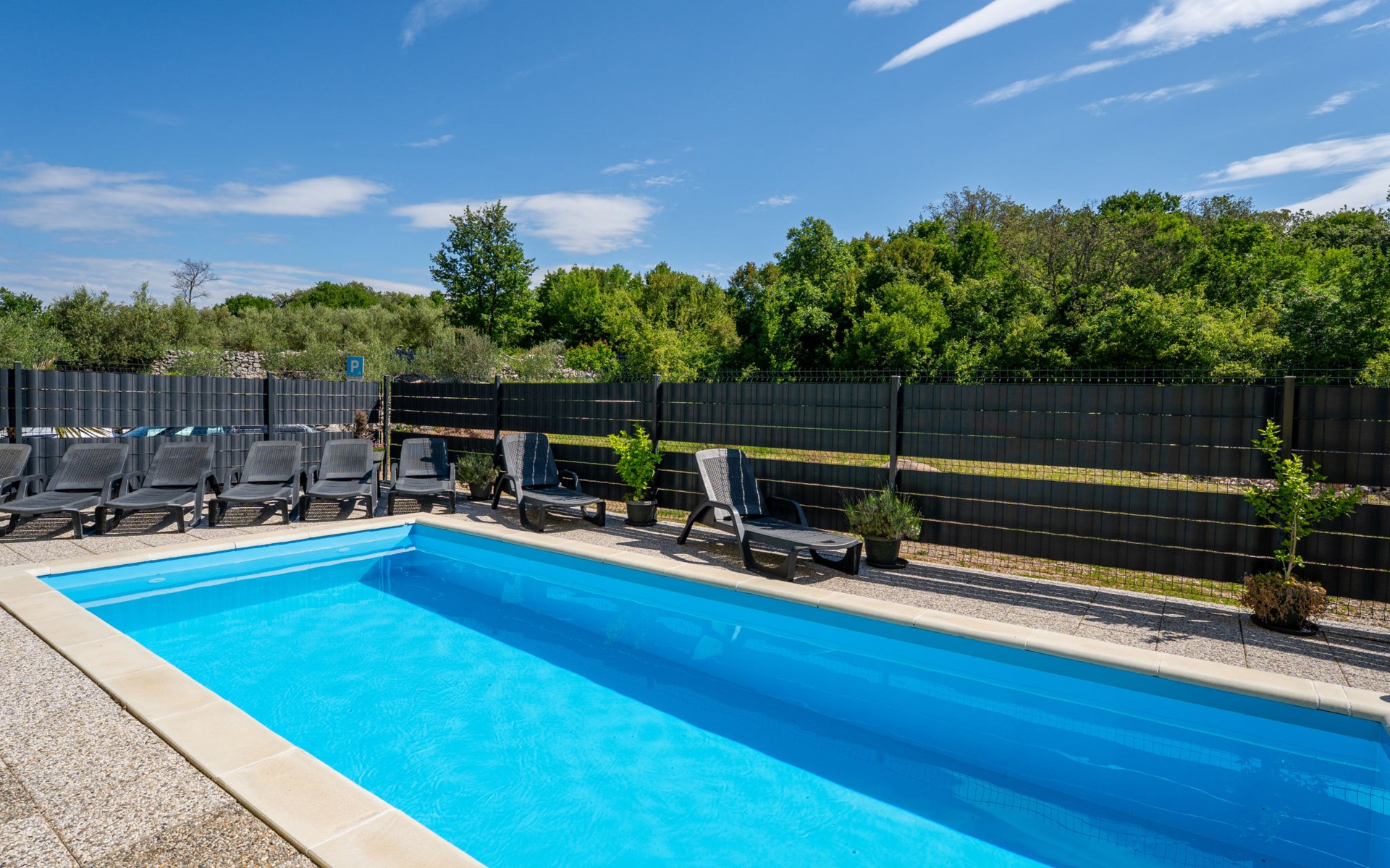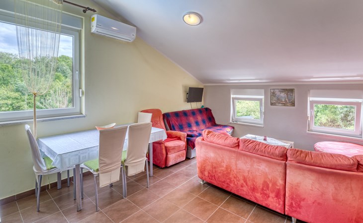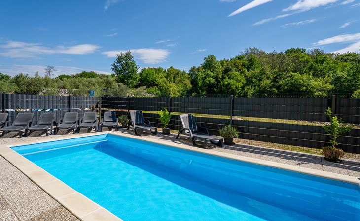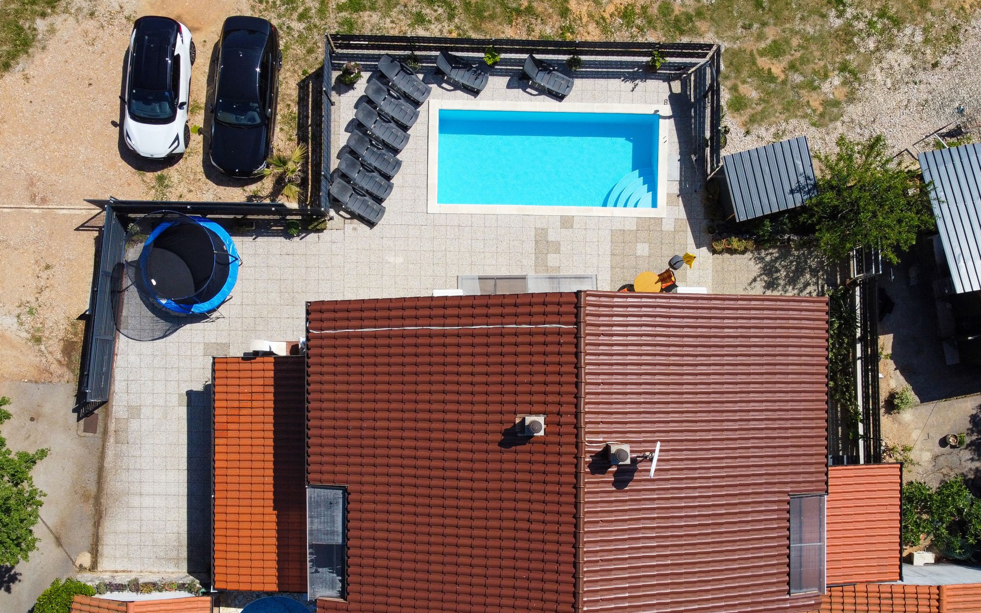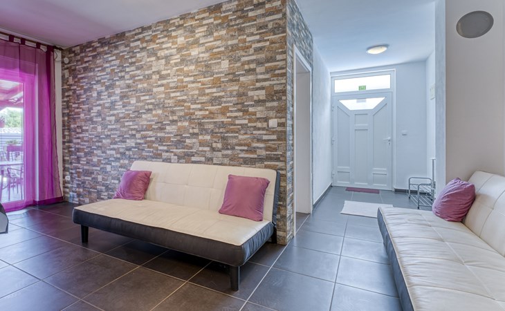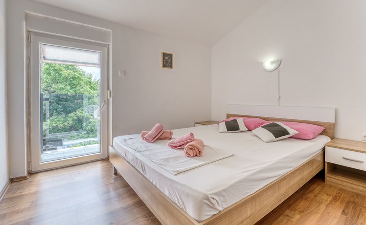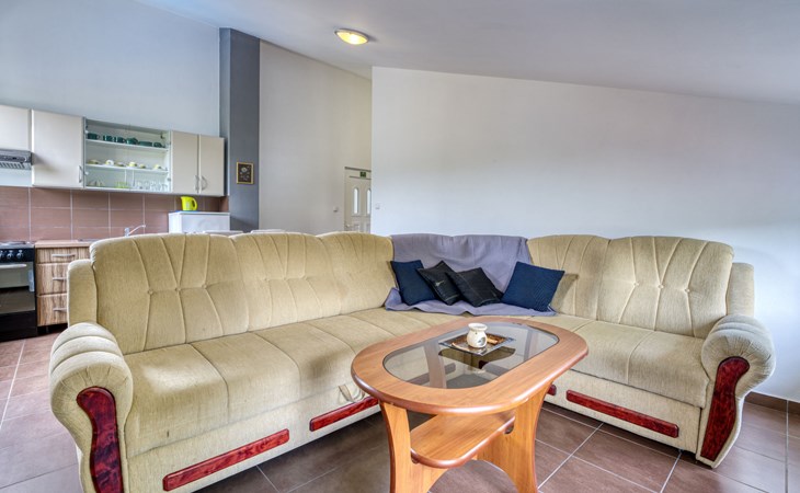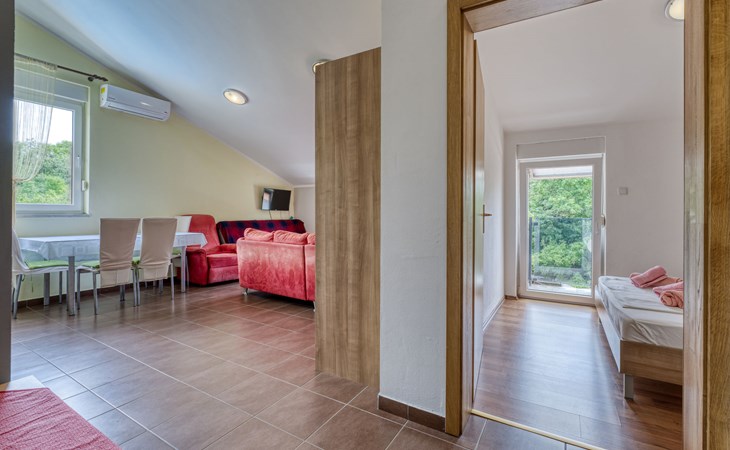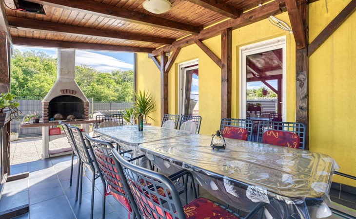 Semi-detached house "Radmila", 2 storeys. 3 km from the centre of Šilo, 13 km from the centre of Vrbnik, 3 km from the sea, 3 km from the beach, in a cul-de-sac. Private: property 300 m2 (fenced), swimming pool (above ground) (3 x 7 m, depth 130 cm, seasonal availability: 15.Mar. - 15.Nov.). Terrace, barbecue, pool maintenance by the owner/gardener. In the house: internet access, table football, trampoline, washing machine. Parking (for 4 cars) at the house. Shop 1.4 km, restaurant 3 km, bus stop 3.5 km, sandy beach 4 km pebble beach 3 km. Please note: airfield 16 km from the property. Semi-detached house consists of 3 apartments rented as one unit: one apartment on the ground floor and two apartments on the first floor.