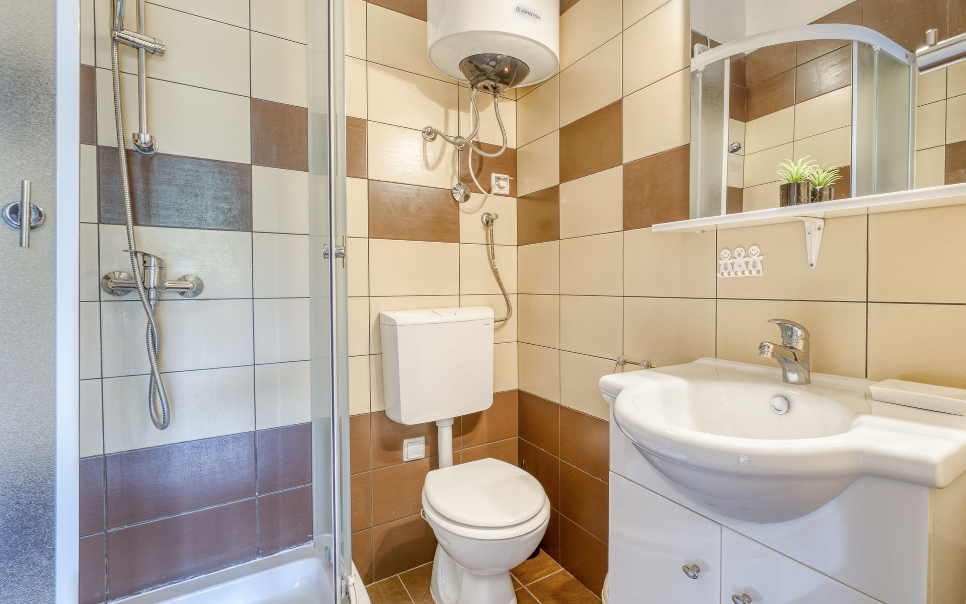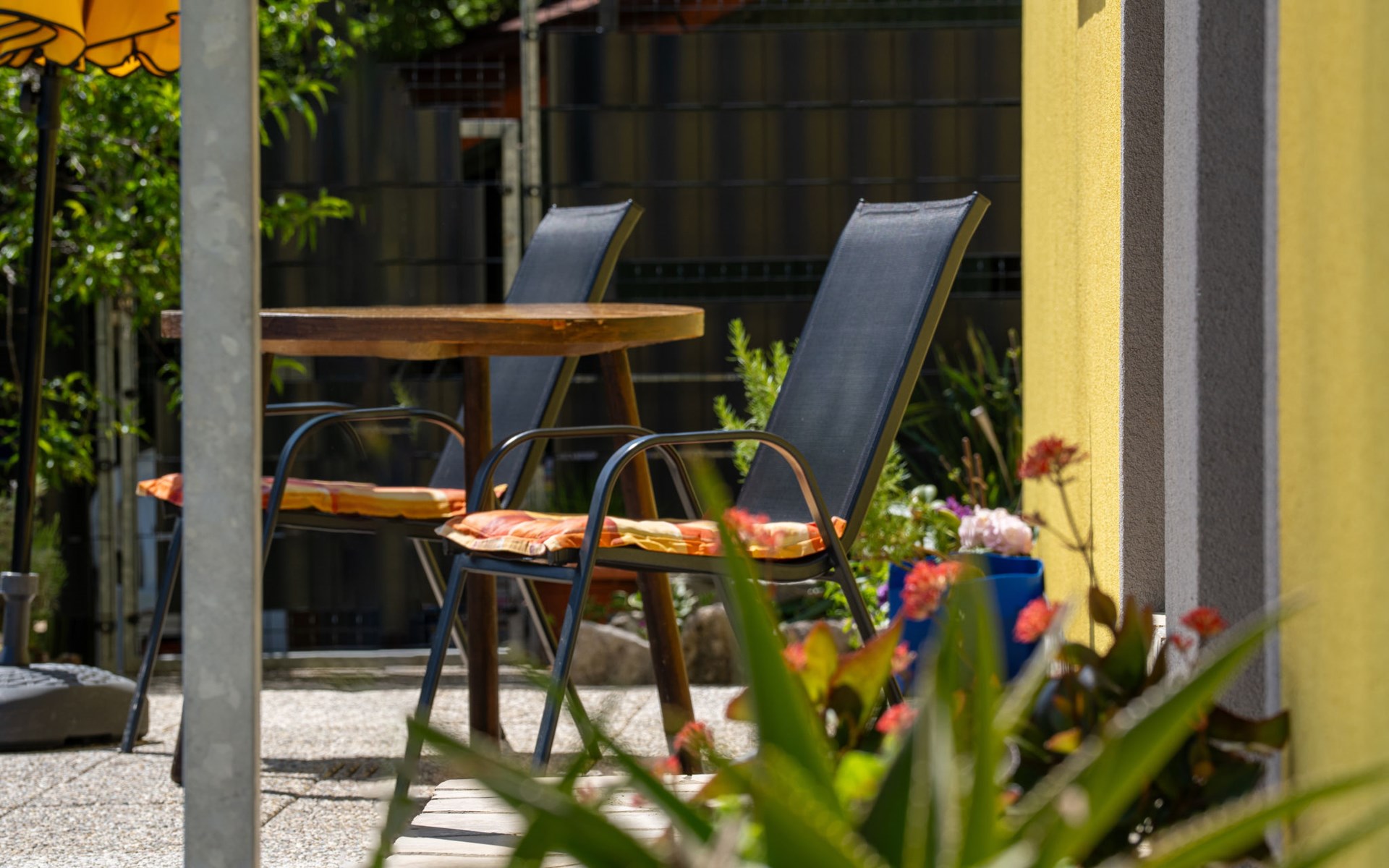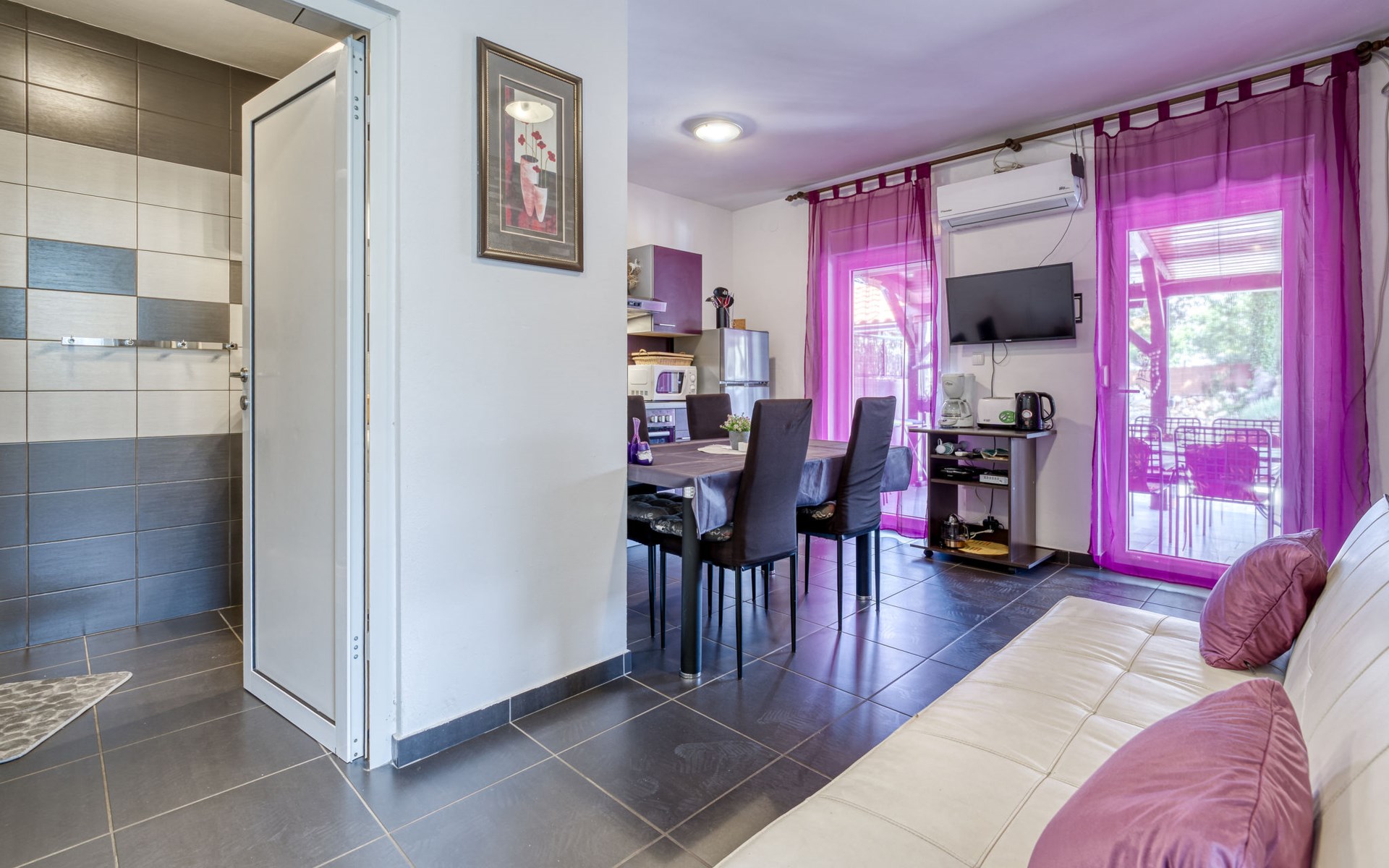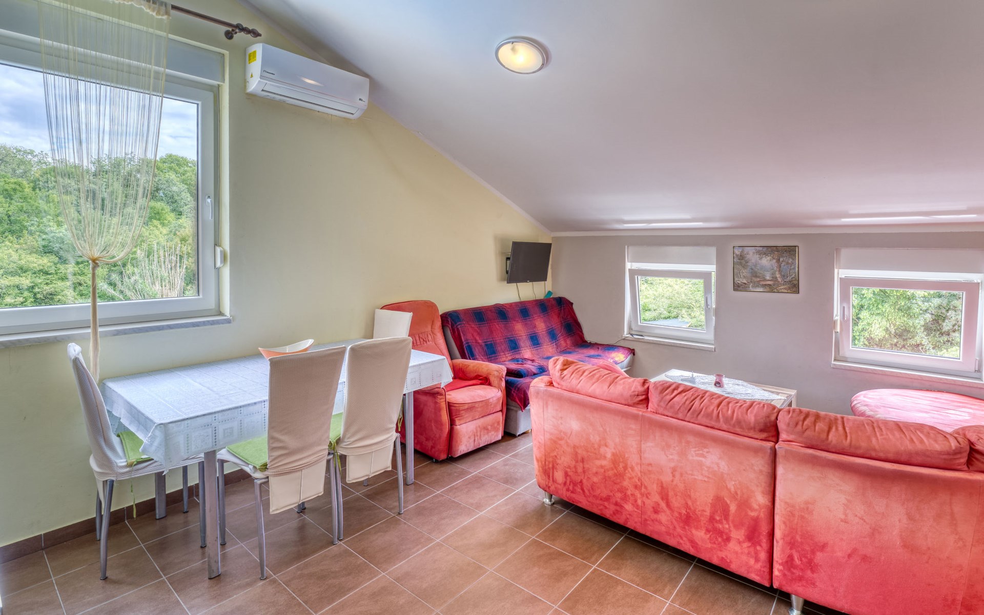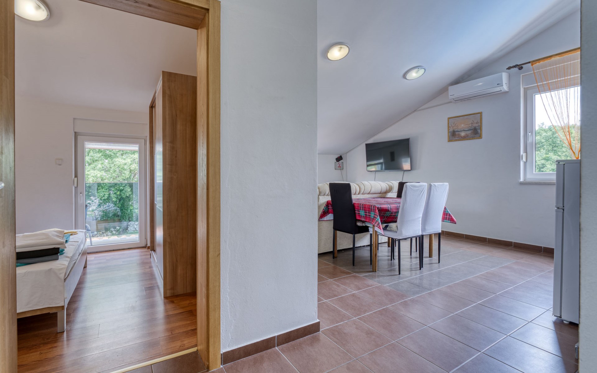 8-room semi-detached house 160 m2 on 2 levels. Living/dining room with 2 sofabeds (100 cm, length 180 cm), satellite TV and air conditioning. Exit to the terrace, to the swimming pool. 1 room with 1 french bed (180 cm, length 200 cm). Exit to the terrace, to the swimming pool. 1 room with 1 french bed (160 cm, length 200 cm). 1 room with 2 beds (90 cm, length 190 cm), satellite TV. Dining room with air conditioning. Exit to the terrace. Open kitchen (oven, dishwasher, 4 ceramic glass hob hotplates, toaster, kettle, microwave, freezer, electric coffee machine). 2 showers/WC. Upper floor: (exterior staircase) living/dining room with sloping ceilings, ceiling height 160 - 300 cm with 1 double sofabed (130 cm, length 200 cm), satellite TV and air conditioning. 1 room with sloping ceilings, ceiling height 160 - 300 cm with 1 french bed (160 cm, length 200 cm). Exit to the balcony. Living/dining room with sloping ceilings, ceiling height 160 - 300 cm with 1 sofabed (110 cm, length 190 cm), satellite TV and air conditioning. 1 room with sloping ceilings, ceiling height 160 - 300 cm with 1 french bed (160 cm, length 200 cm). Exit to the balcony. 2 showers/WC. Forced-air heating (extra). 2 balconies 2 m2, terrace 18 m2, roofed terrace 10 m2, roofed. Terrace furniture, balcony furniture, deck chairs (6). Facilities: children's high chair, baby cot (extra). Internet (WiFi, free). Maximum 2 pets/ dogs allowed. No internal connecting door between the floors. On the ground floor: one apartment with living/dining room, additional dining area, open kitchen and 3 bedrooms. 2 apartments on the first floor, each apartment with living / dining room with low placed windows and 1 bedroom. When there are less than the maximum number of guests staying at the property, one floor will not be available for use.