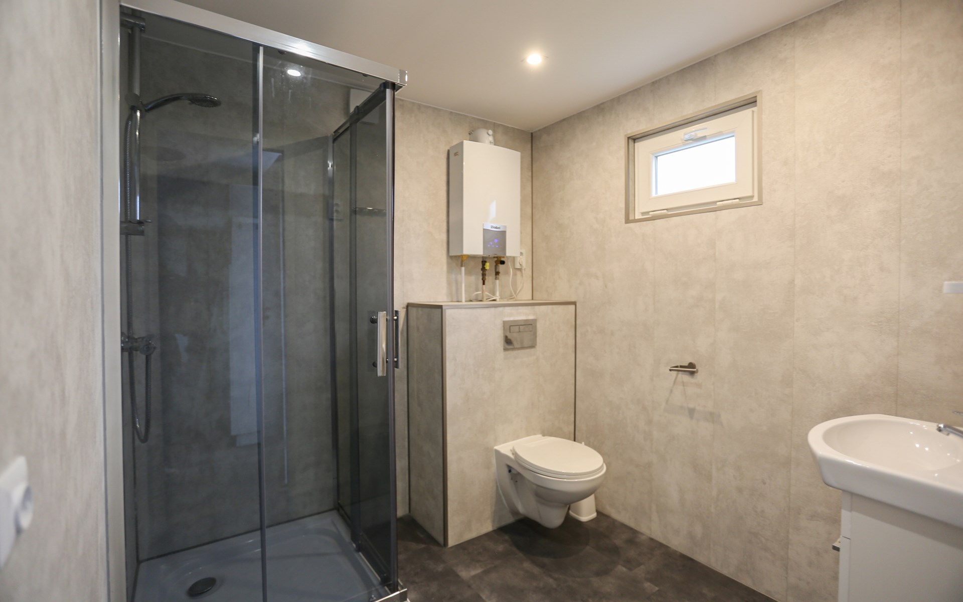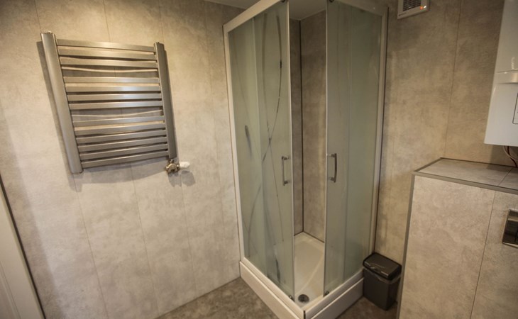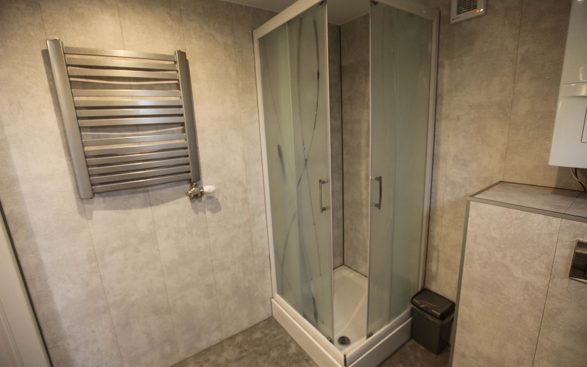 There are two bedrooms: one bedroom with a double bed and one bedroom with a single bed and a double bed. The bathroom is fitted with a shower and a toilet.