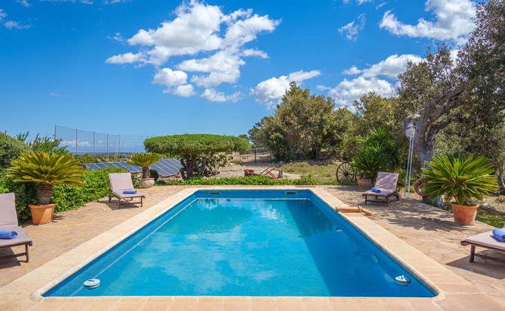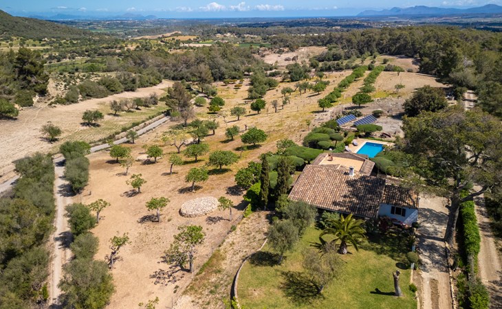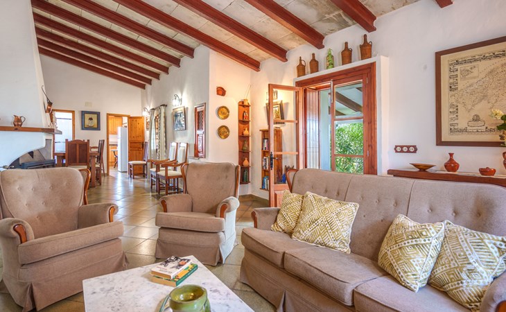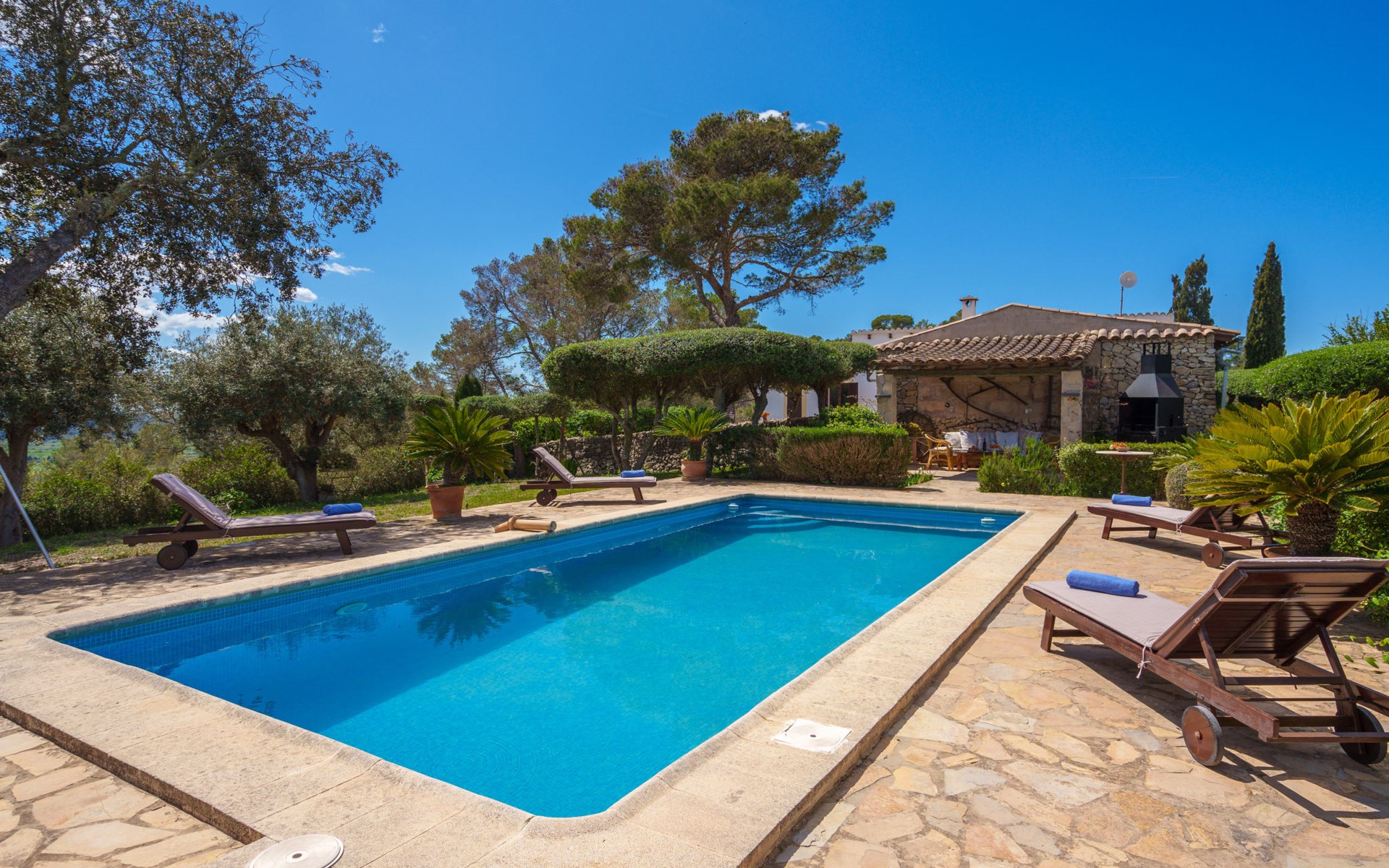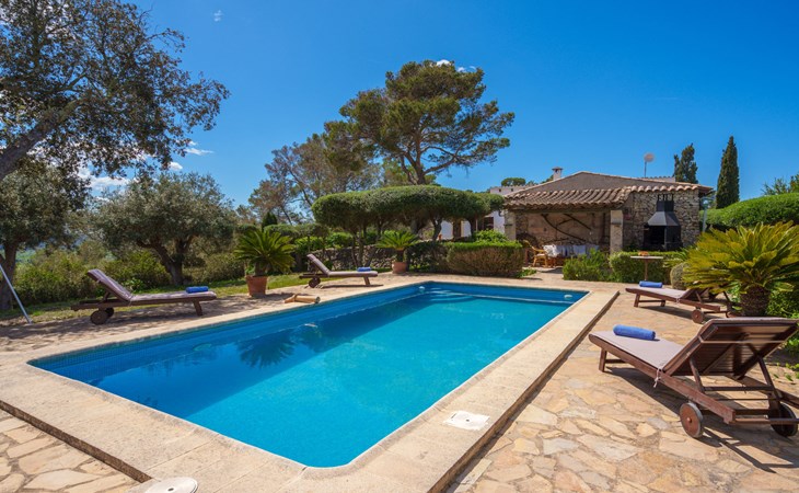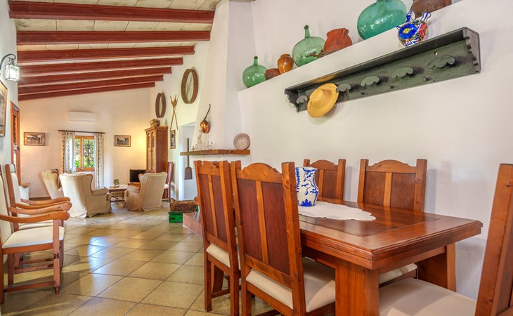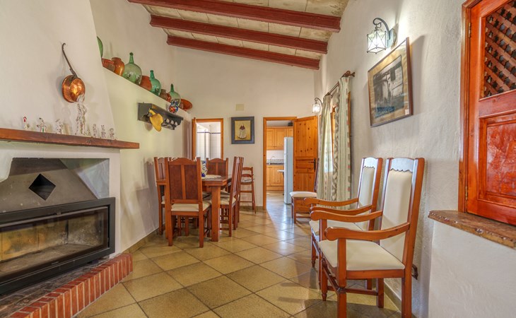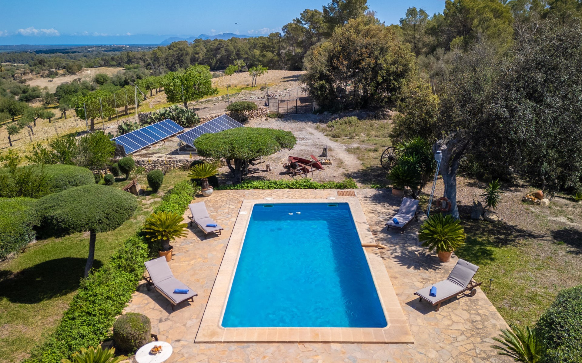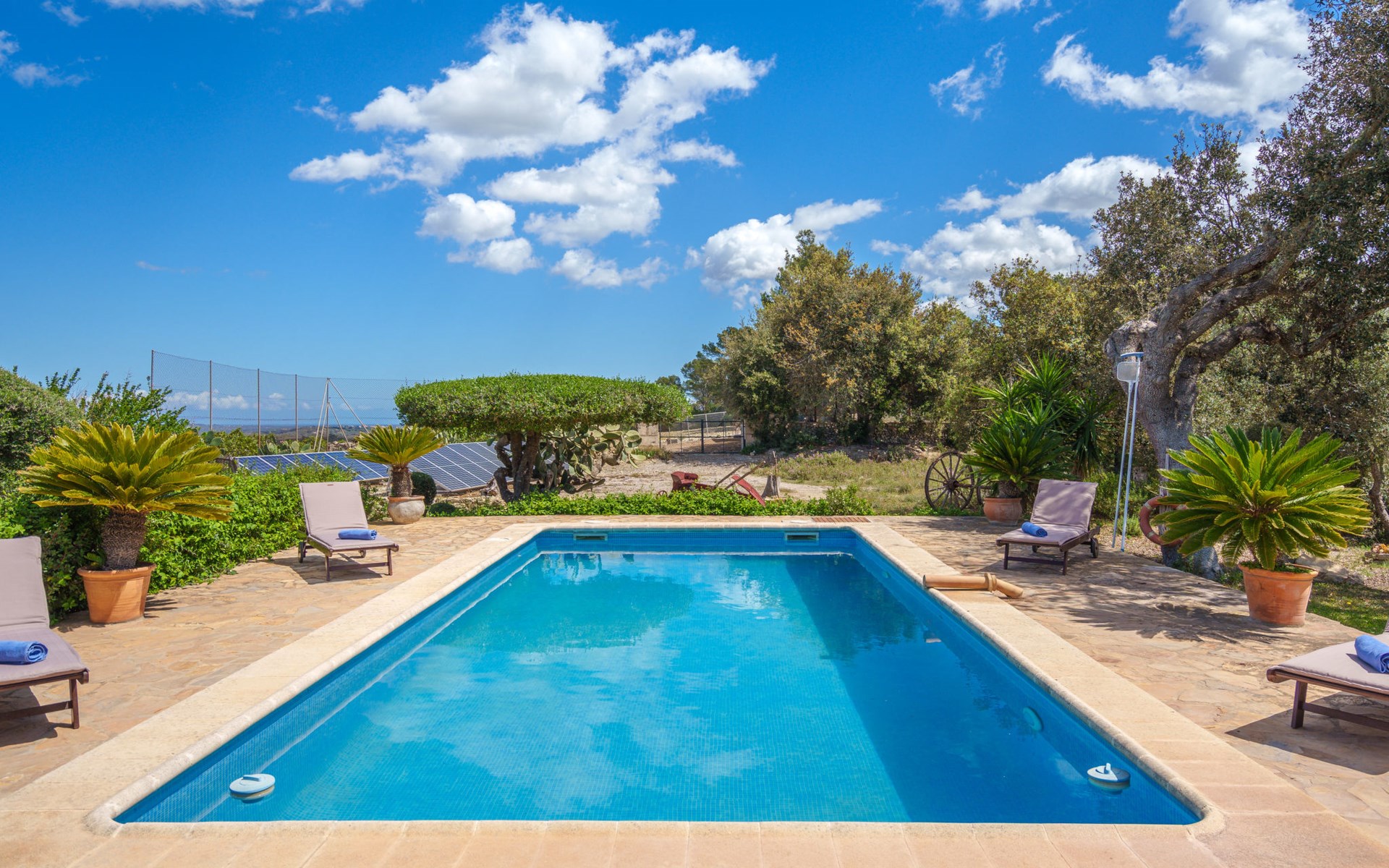 Sant Joan: Very beautiful, rustic farm estate "Sant Joan", surrounded by trees. Outside the resort, in a quiet, elevated position, 22 km from the sea. Private: garden with lawn and wildlife garden, swimming pool angular (10 x 5 m, seasonal availability: 01.Jan. - 31.Dec.). Patio, arbour, pergola, garden furniture, barbecue. In the house: internet access, WiFi, storage room for bicycles. 30 m long steep motor access to 40 m from the house. Parking at the house on the premises. Shop 1.8 km, grocery 1.8 km, supermarket 1.8 km, restaurant 1.8 km, bar 1.8 km, bakery 1.8 km, pub garden 1.8 km, 20 minute walk to the centre, bus stop 2 km, sandy beach "Can Picafort, Es trenc" 22 km, rocky beach "Can Picafort" 22 km. Sports harbour 22 km, marina 22 km, golf course (18 hole) 20 km, tennis 3 km, sports centre 3 km. Please note: car recommended. Suitable for families, suitable for seniors. Object suitable for 4 adults groups of teenagers on request only. Loading and unloading of baggage is possible at the holiday house. Airfield 37 km from the property. This house works with solar power.