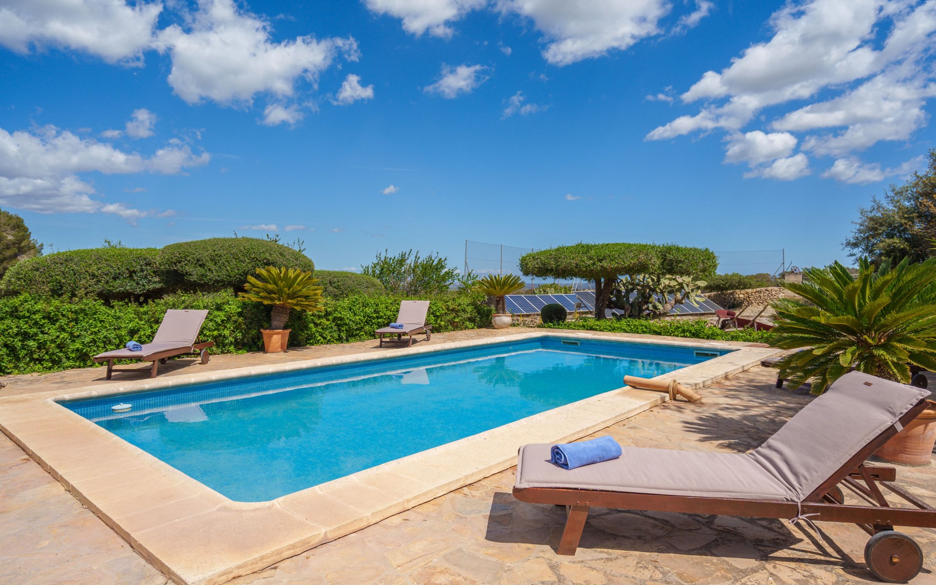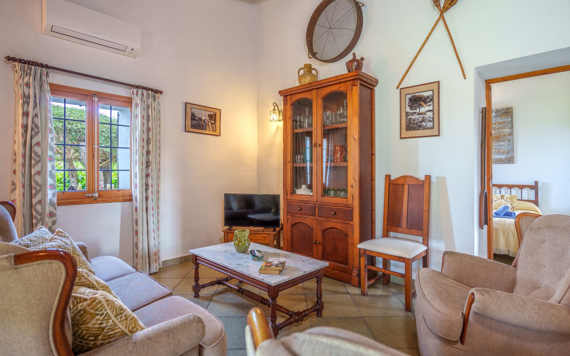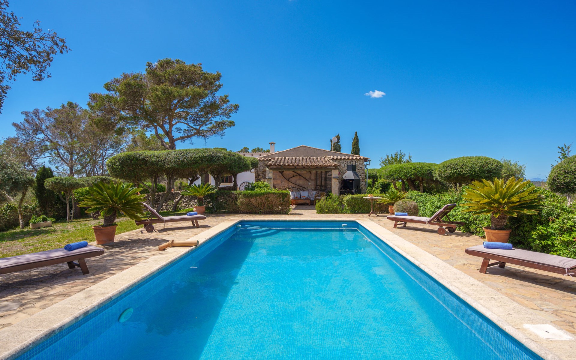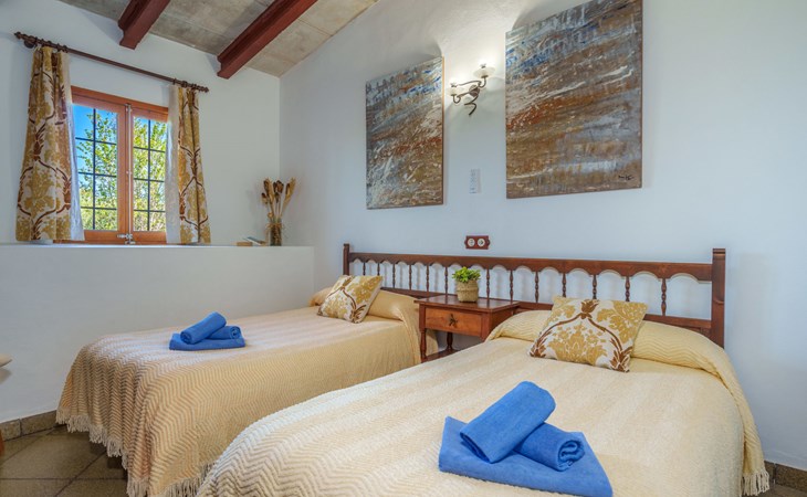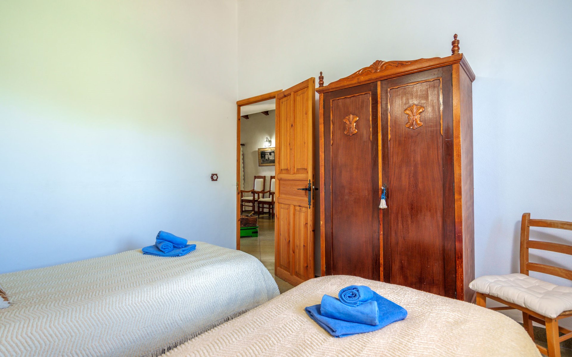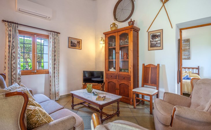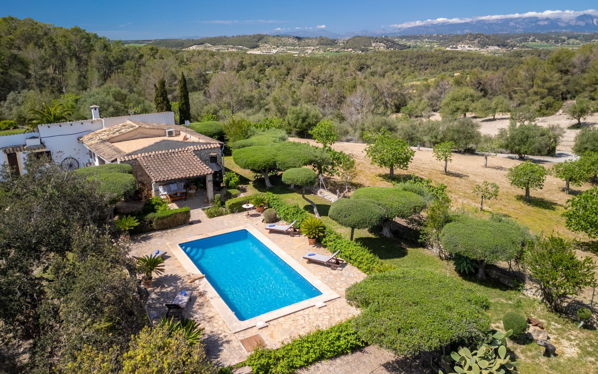 Sant Joan: Very beautiful, rustic farm estate "Sant Joan", surrounded by trees. Outside the resort, in a quiet, elevated position, 22 km from the sea. Private: garden with lawn and wildlife garden, swimming pool angular (10 x 5 m, seasonal availability: 01.Jan. - 31.Dec.). Patio, arbour, pergola, garden furniture, barbecue. In the house: internet access, WiFi, storage room for bicycles. 30 m long steep motor access to 40 m from the house. Parking at the house on the premises. Shop 1.8 km, grocery 1.8 km, supermarket 1.8 km, restaurant 1.8 km, bar 1.8 km, bakery 1.8 km, pub garden 1.8 km, 20 minute walk to the centre, bus stop 2 km, sandy beach "Can Picafort, Es trenc" 22 km, rocky beach "Can Picafort" 22 km. Sports harbour 22 km, marina 22 km, golf course (18 hole) 20 km, tennis 3 km, sports centre 3 km. Please note: car recommended. Suitable for families, suitable for seniors. Object suitable for 4 adults groups of teenagers on request only. Loading and unloading of baggage is possible at the holiday house. Airfield 37 km from the property. This house works with solar power.