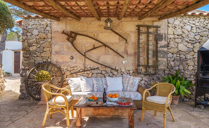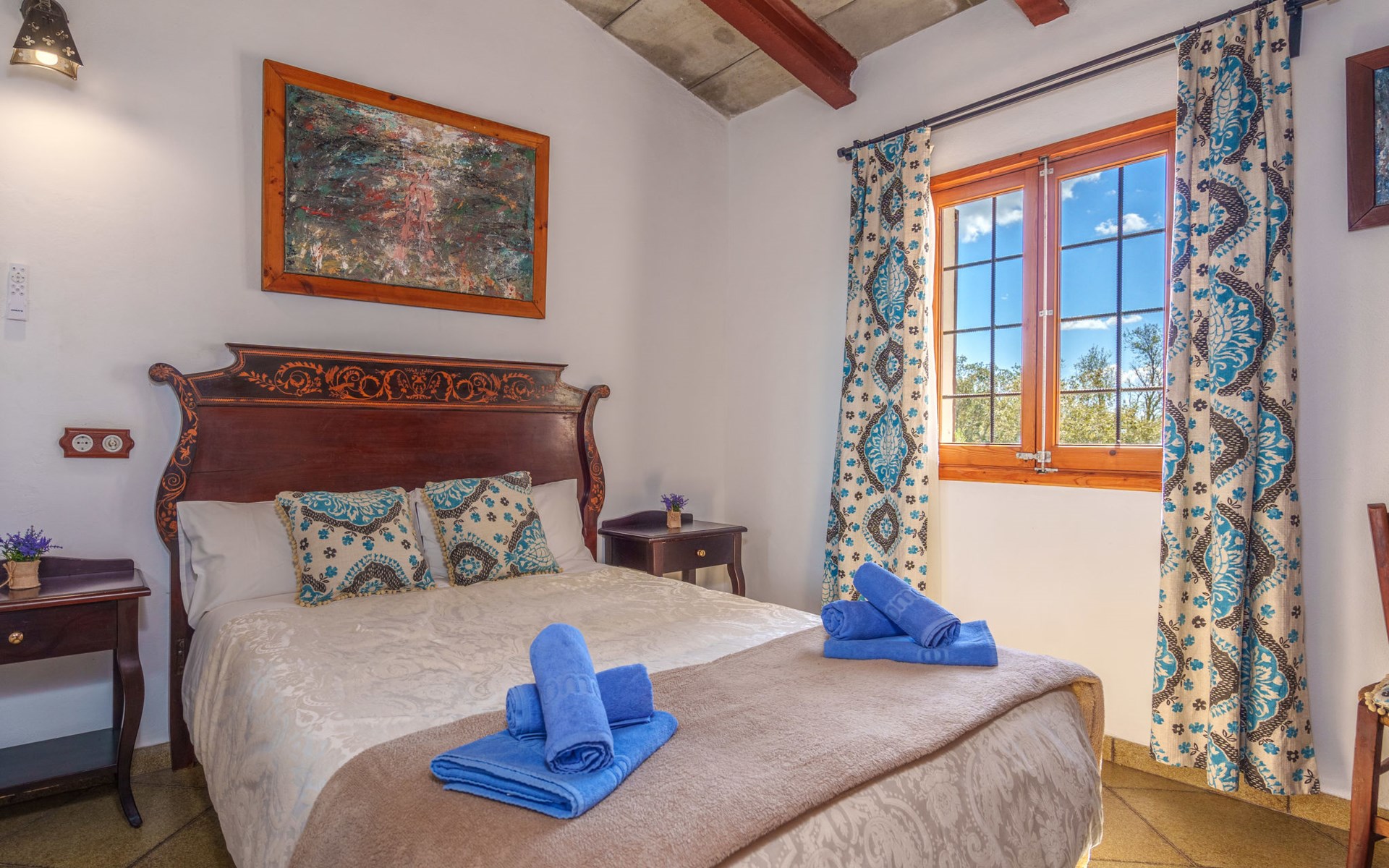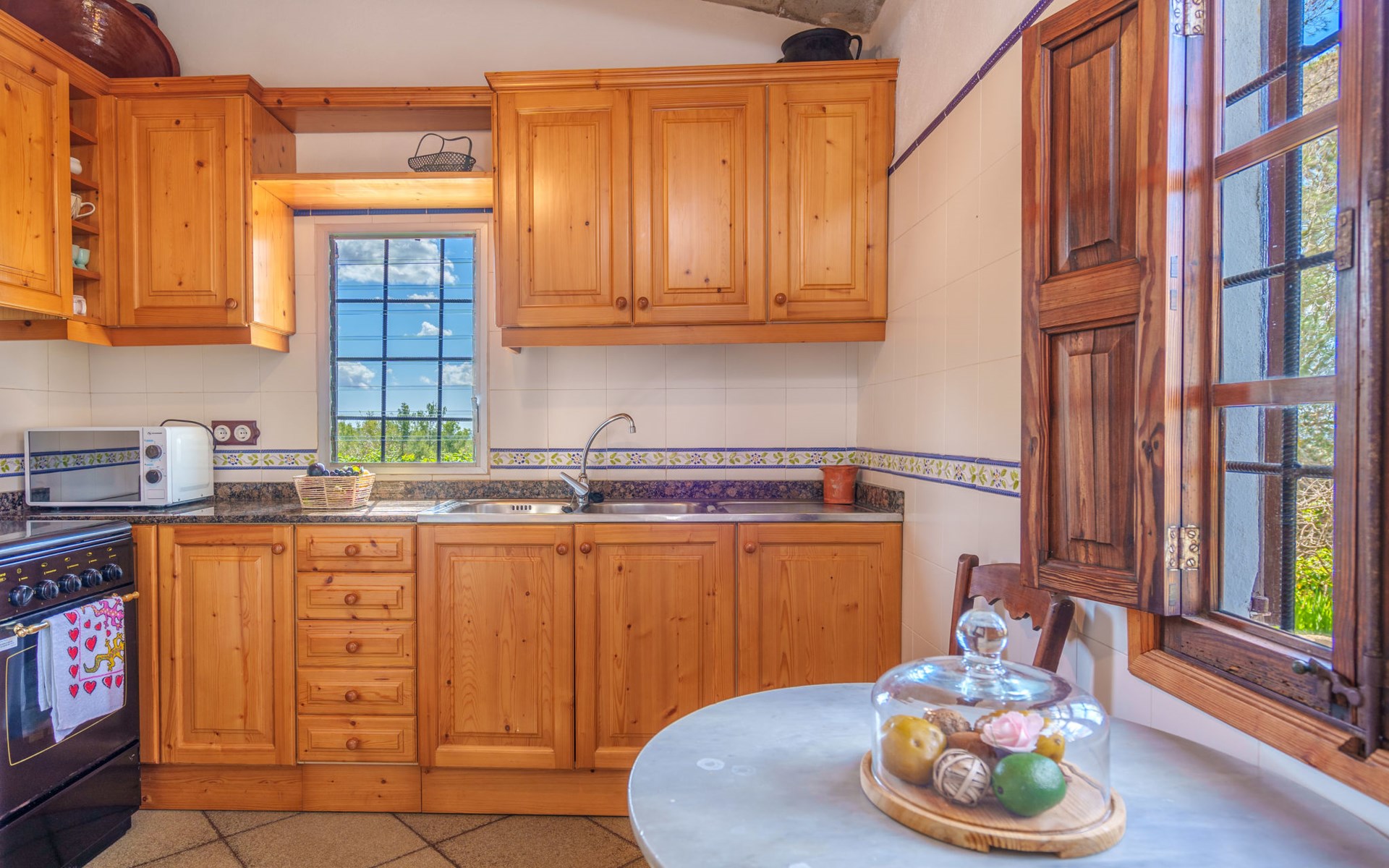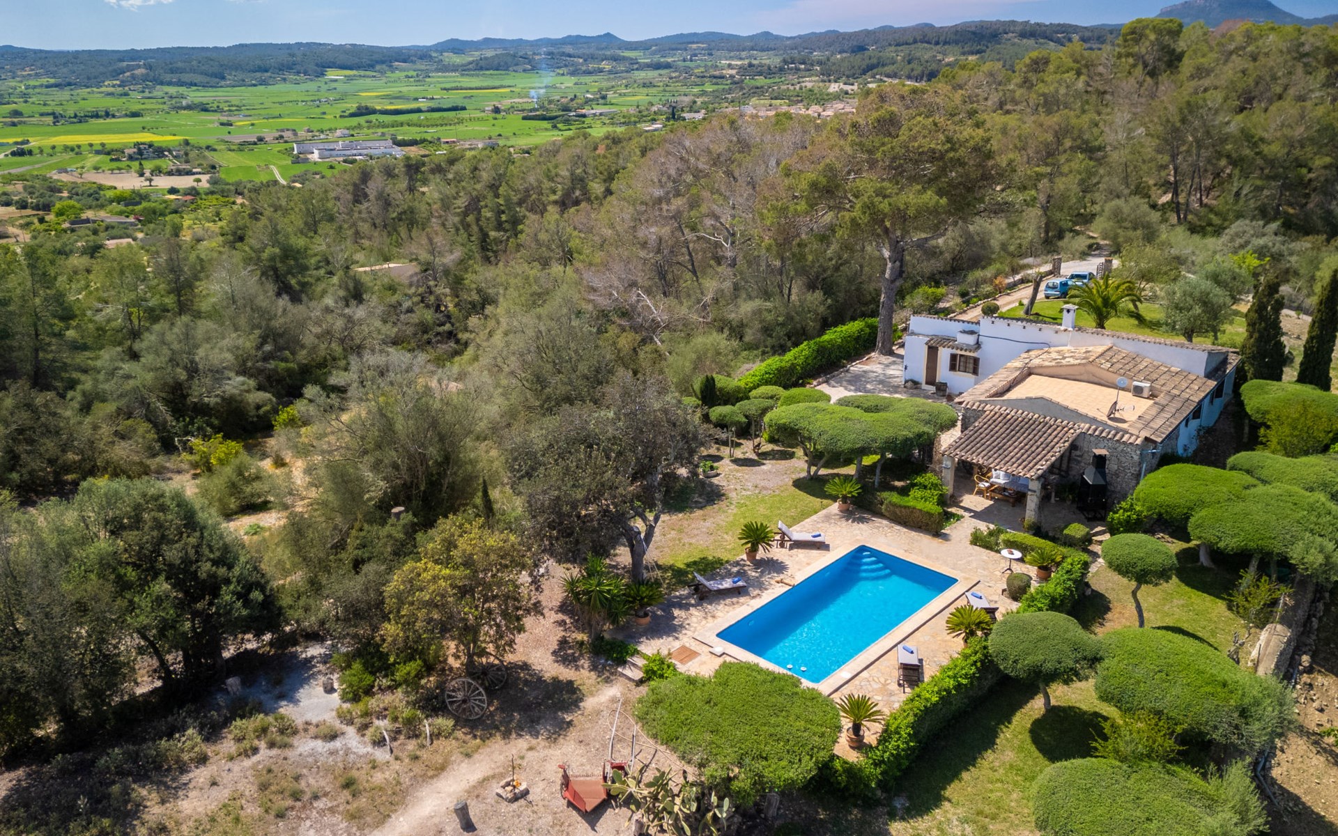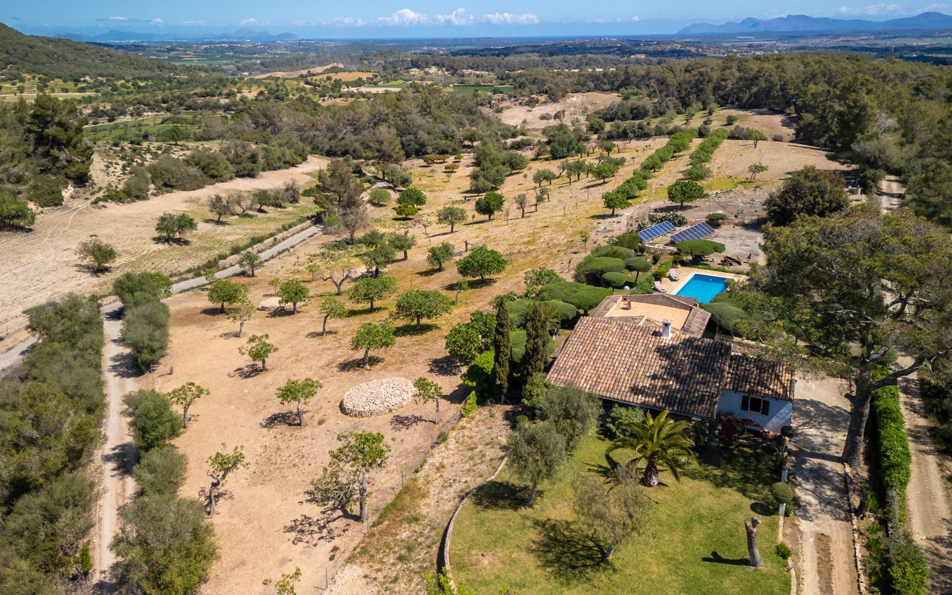 Sant Joan: Very beautiful, rustic farm estate "Sant Joan", surrounded by trees. Outside the resort, in a quiet, elevated position, 22 km from the sea. Private: garden with lawn and wildlife garden, swimming pool angular (10 x 5 m, seasonal availability: 01.Jan. - 31.Dec.). Patio, arbour, pergola, garden furniture, barbecue. In the house: internet access, WiFi, storage room for bicycles. 30 m long steep motor access to 40 m from the house. Parking at the house on the premises. Shop 1.8 km, grocery 1.8 km, supermarket 1.8 km, restaurant 1.8 km, bar 1.8 km, bakery 1.8 km, pub garden 1.8 km, 20 minute walk to the centre, bus stop 2 km, sandy beach "Can Picafort, Es trenc" 22 km, rocky beach "Can Picafort" 22 km. Sports harbour 22 km, marina 22 km, golf course (18 hole) 20 km, tennis 3 km, sports centre 3 km. Please note: car recommended. Suitable for families, suitable for seniors. Object suitable for 4 adults groups of teenagers on request only. Loading and unloading of baggage is possible at the holiday house. Airfield 37 km from the property. This house works with solar power.