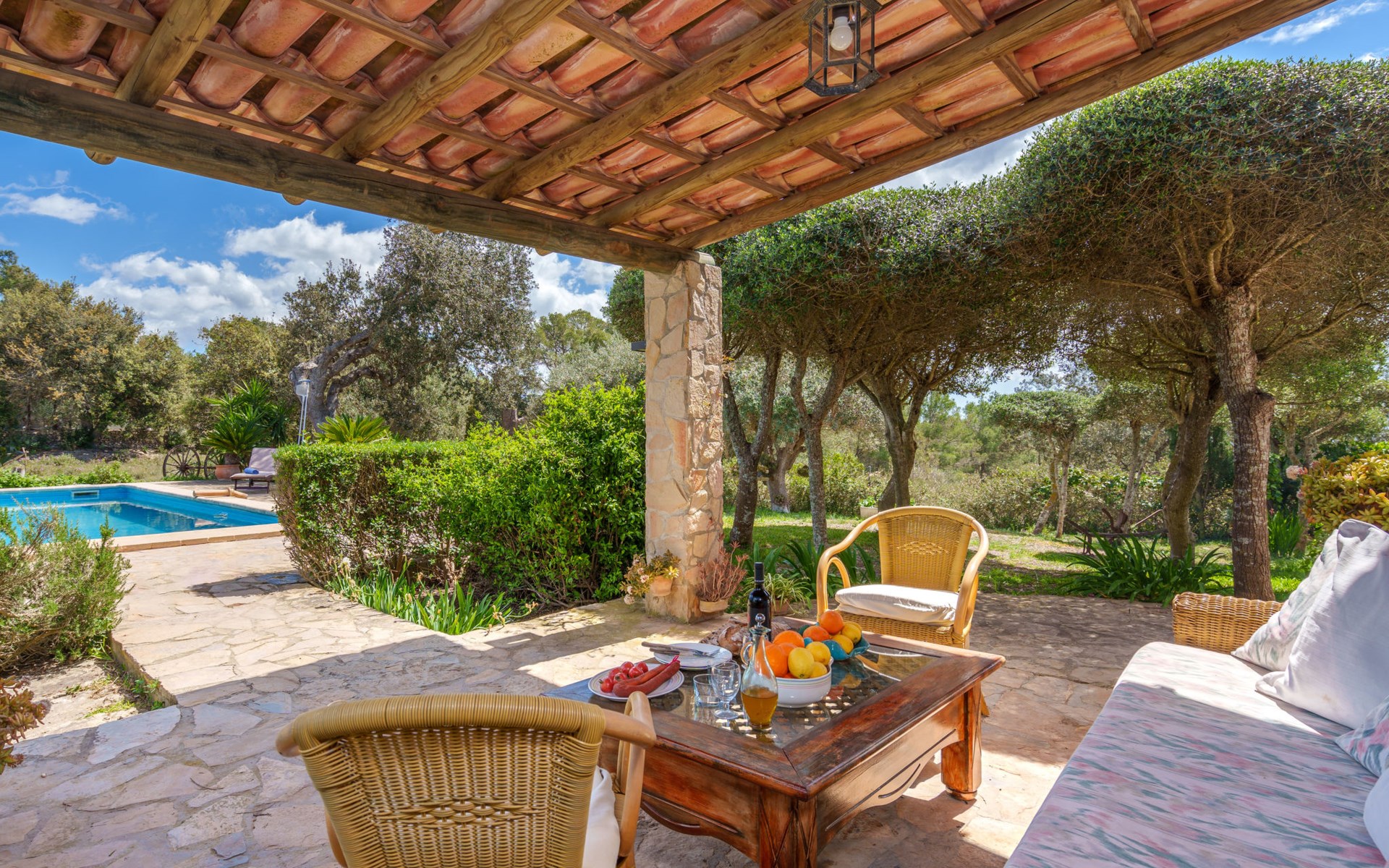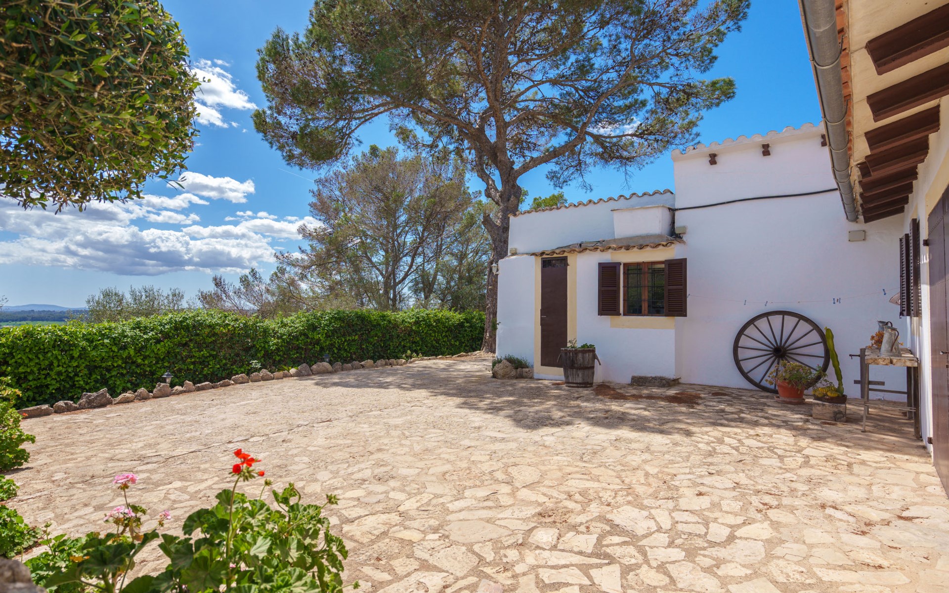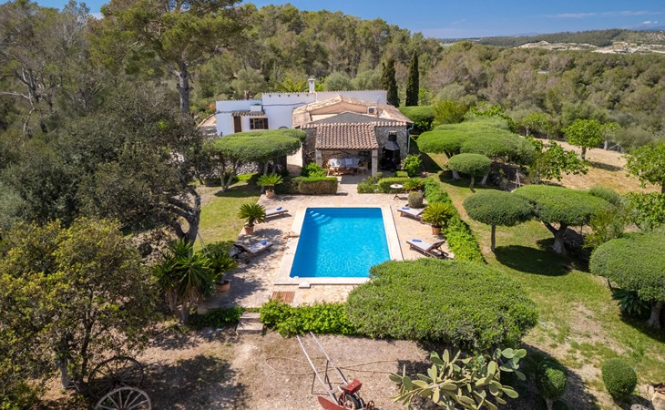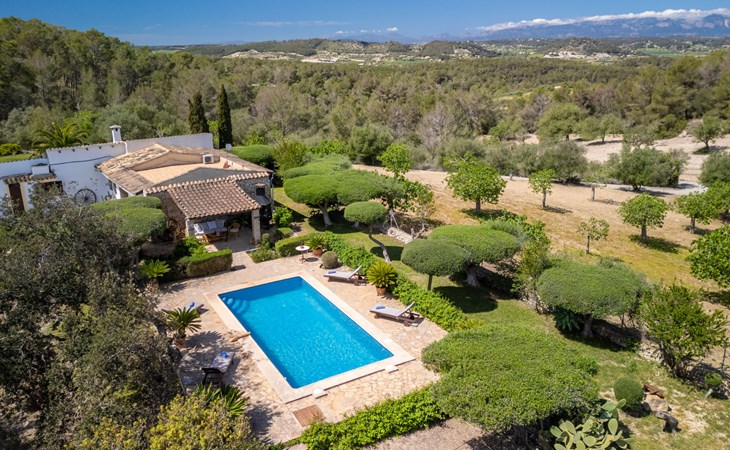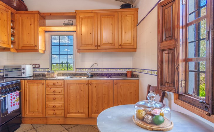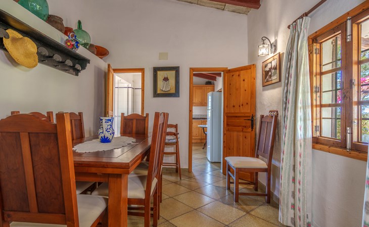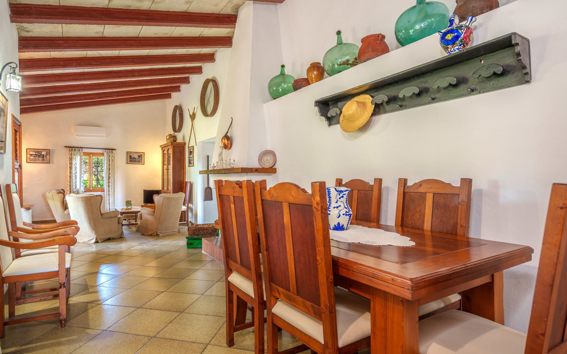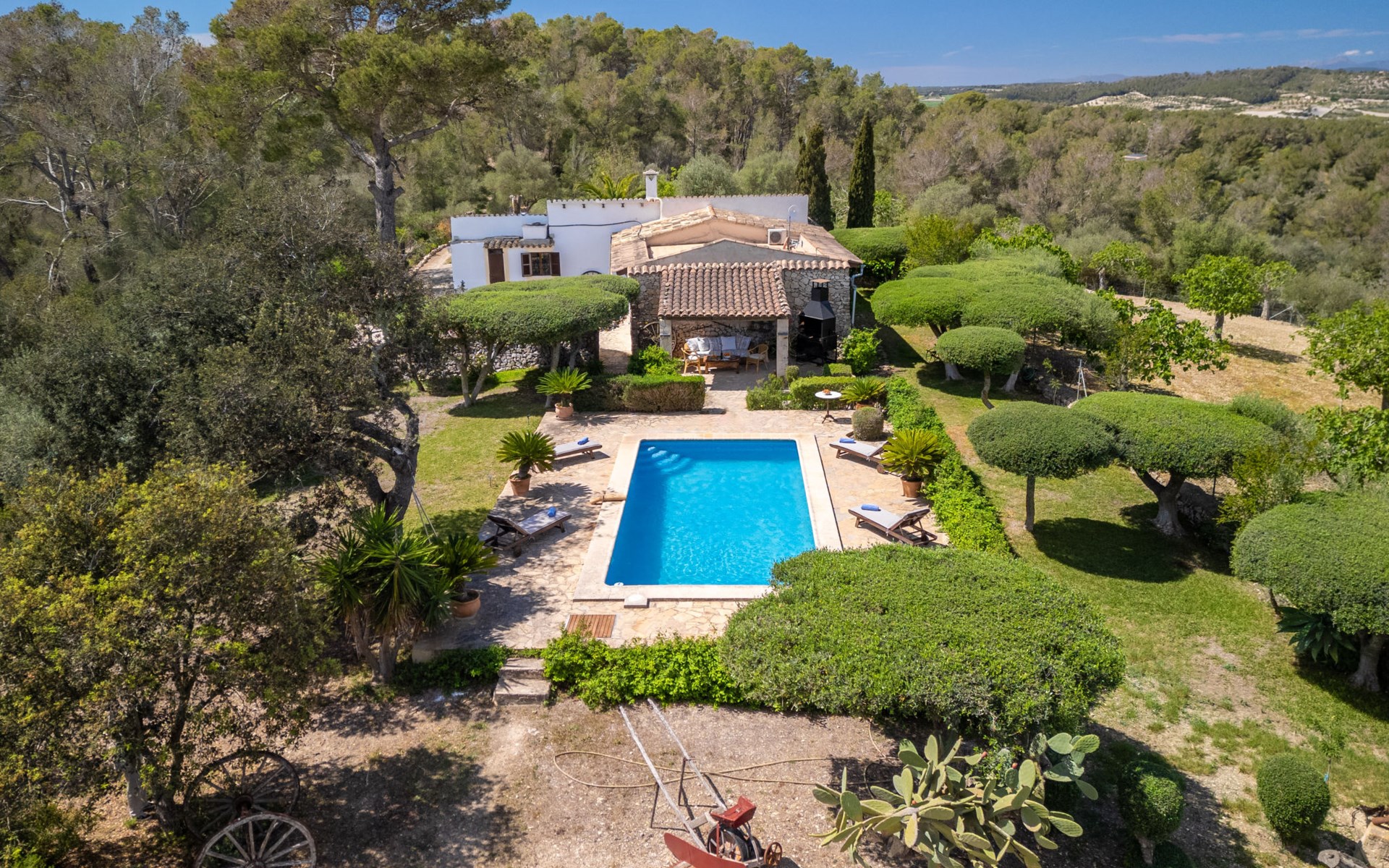 Sant Joan: Very beautiful, rustic farm estate "Sant Joan", surrounded by trees. Outside the resort, in a quiet, elevated position, 22 km from the sea. Private: garden with lawn and wildlife garden, swimming pool angular (10 x 5 m, seasonal availability: 01.Jan. - 31.Dec.). Patio, arbour, pergola, garden furniture, barbecue. In the house: internet access, WiFi, storage room for bicycles. 30 m long steep motor access to 40 m from the house. Parking at the house on the premises. Shop 1.8 km, grocery 1.8 km, supermarket 1.8 km, restaurant 1.8 km, bar 1.8 km, bakery 1.8 km, pub garden 1.8 km, 20 minute walk to the centre, bus stop 2 km, sandy beach "Can Picafort, Es trenc" 22 km, rocky beach "Can Picafort" 22 km. Sports harbour 22 km, marina 22 km, golf course (18 hole) 20 km, tennis 3 km, sports centre 3 km. Please note: car recommended. Suitable for families, suitable for seniors. Object suitable for 4 adults groups of teenagers on request only. Loading and unloading of baggage is possible at the holiday house. Airfield 37 km from the property. This house works with solar power.