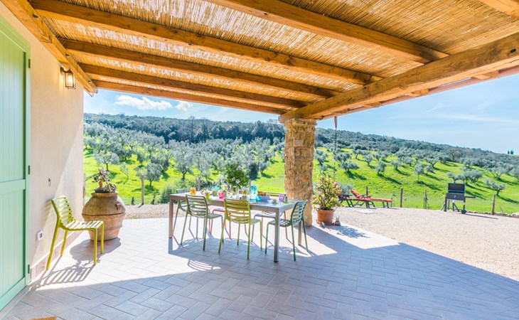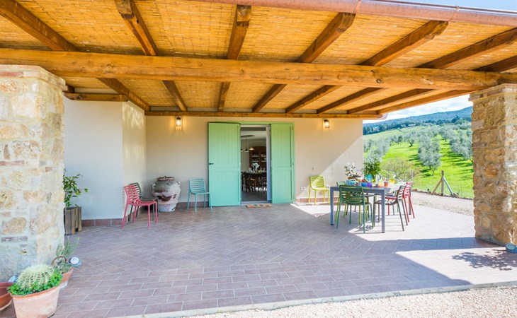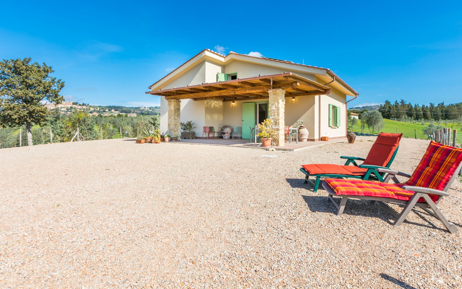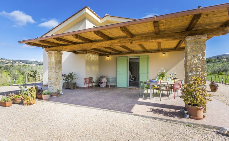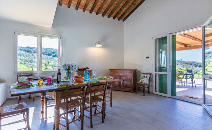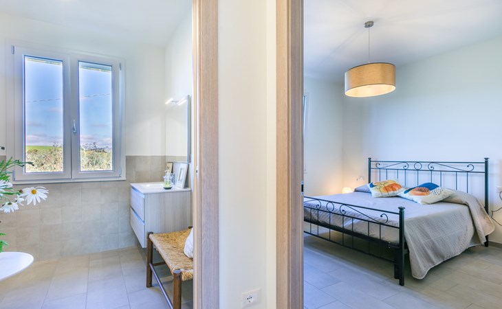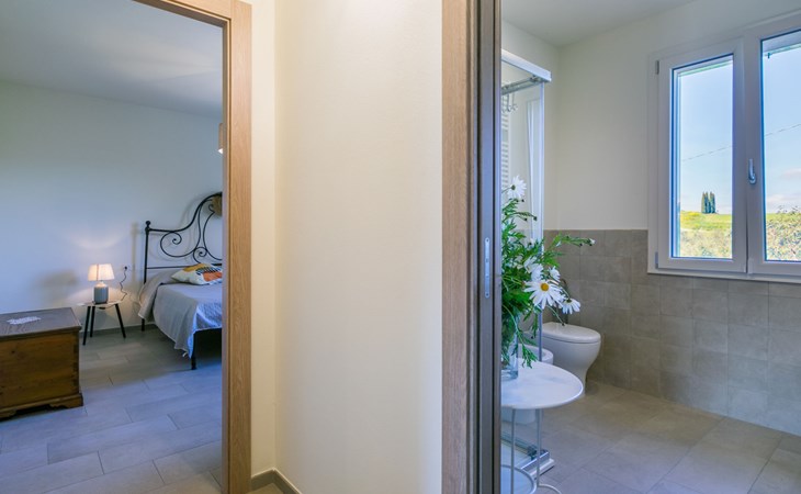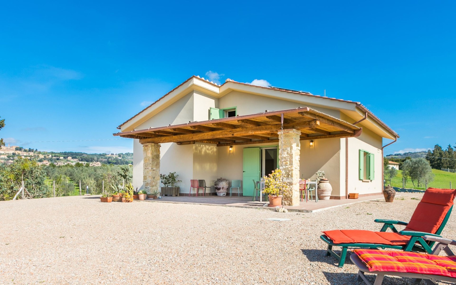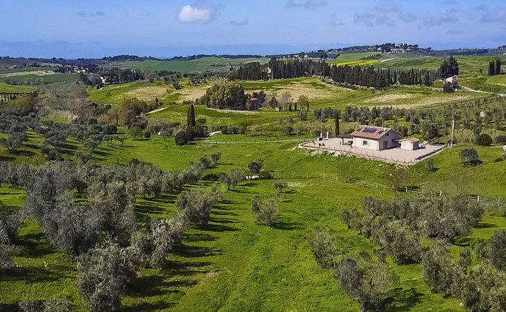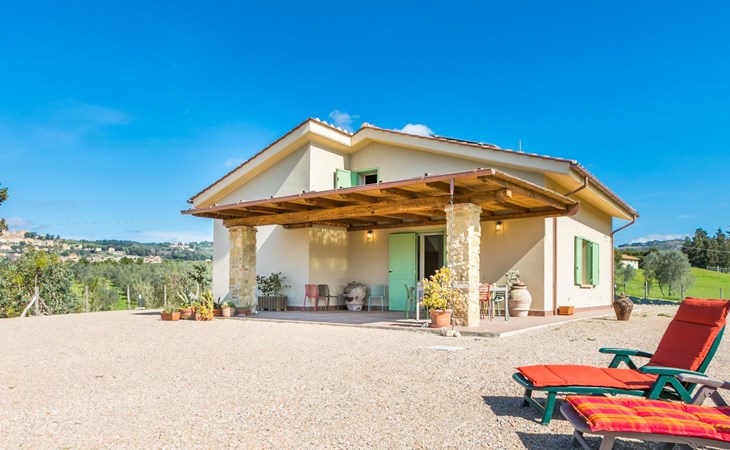 Modern, beautiful house "Nena", surrounded by fields and vineyards. 3 km from the centre of Casale Marittimo, 5.5 km from the centre of Bibbona, 13 km from the sea, 13 km from the beach. Private: property 4 ha, garden (fenced). Motor access (1 km via unmade road). Parking at the house. Grocery 3 km, supermarket 12 km, bar 3 km, bakery 3 km, bus stop "Bivio 3 Comuni" 2 km, sandy beach "Marina di Bibbona" 13 km, rocky beach "Castiglioncello" 33 km, thermal baths "Calidario" 36 km. Surf school 18 km. Nearby attractions: Bolgheri 11 km, Pisa 68 km, Lucca 94 km, Firenze 140 km.