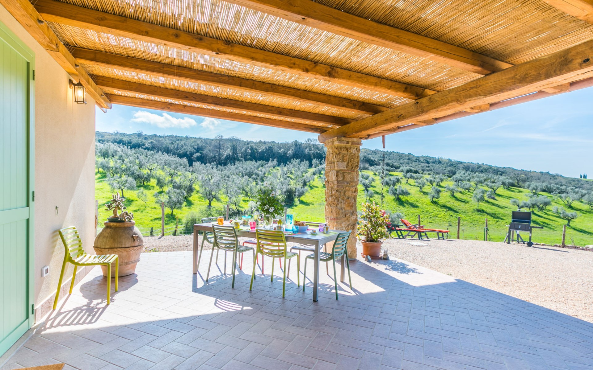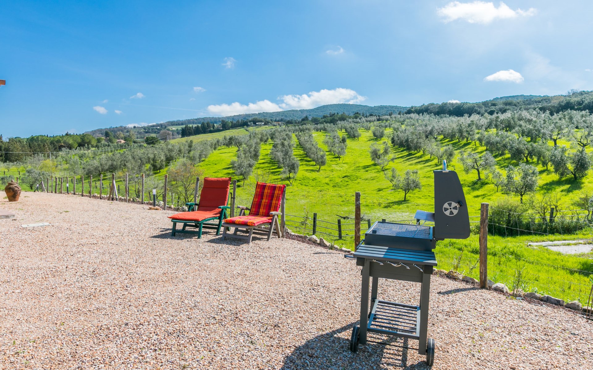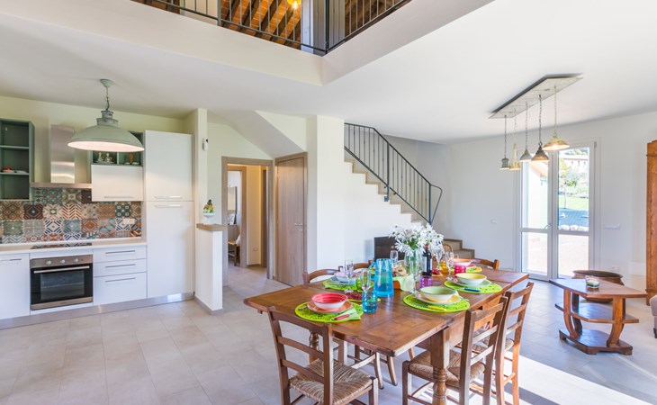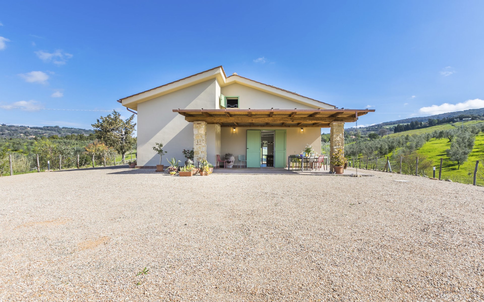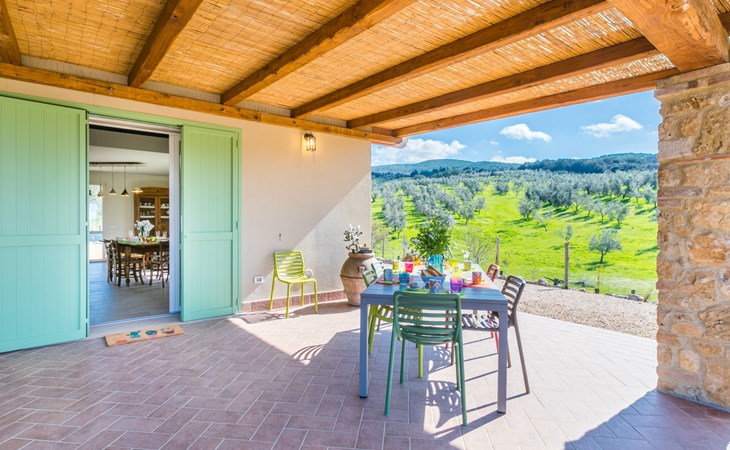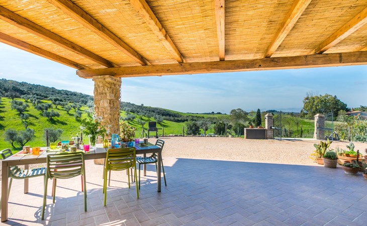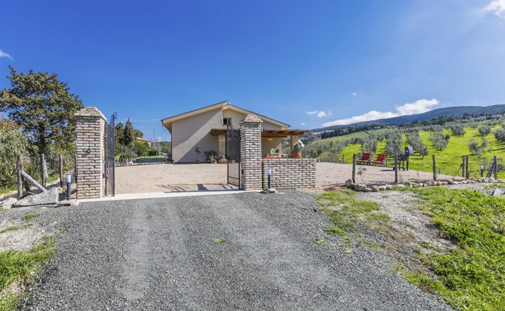 Modern, beautiful house "Nena", surrounded by fields and vineyards. 3 km from the centre of Casale Marittimo, 5.5 km from the centre of Bibbona, 13 km from the sea, 13 km from the beach. Private: property 4 ha, garden (fenced). Motor access (1 km via unmade road). Parking at the house. Grocery 3 km, supermarket 12 km, bar 3 km, bakery 3 km, bus stop "Bivio 3 Comuni" 2 km, sandy beach "Marina di Bibbona" 13 km, rocky beach "Castiglioncello" 33 km, thermal baths "Calidario" 36 km. Surf school 18 km. Nearby attractions: Bolgheri 11 km, Pisa 68 km, Lucca 94 km, Firenze 140 km.
