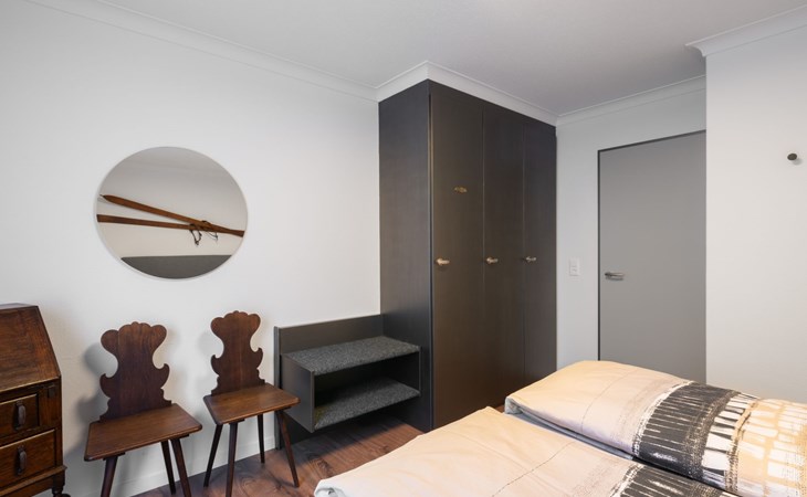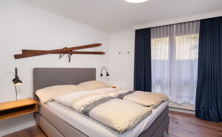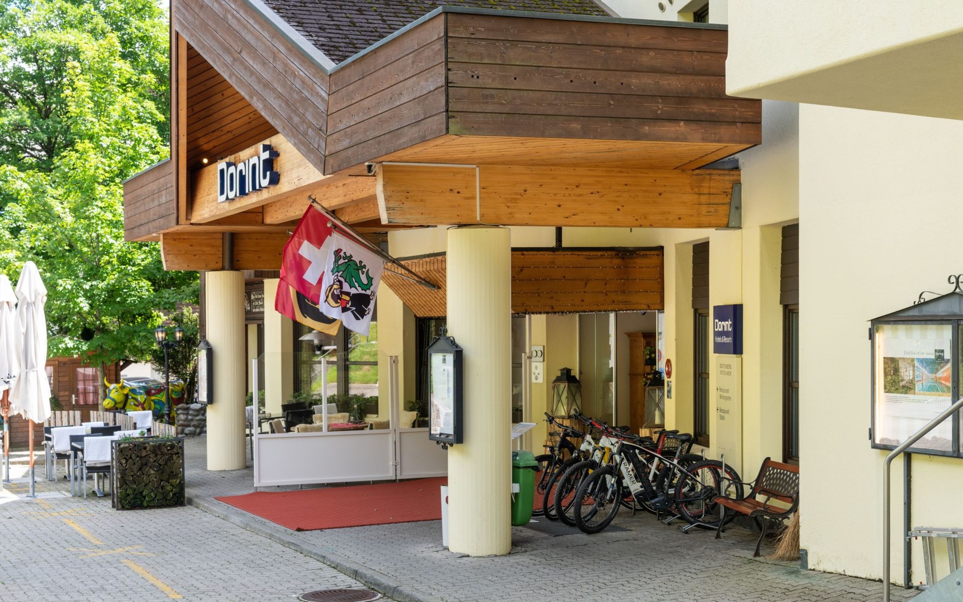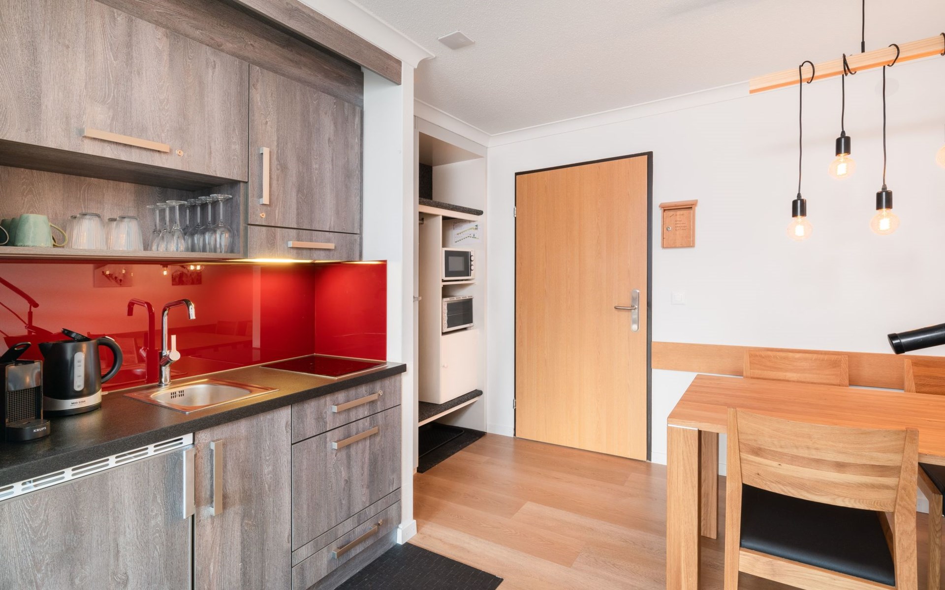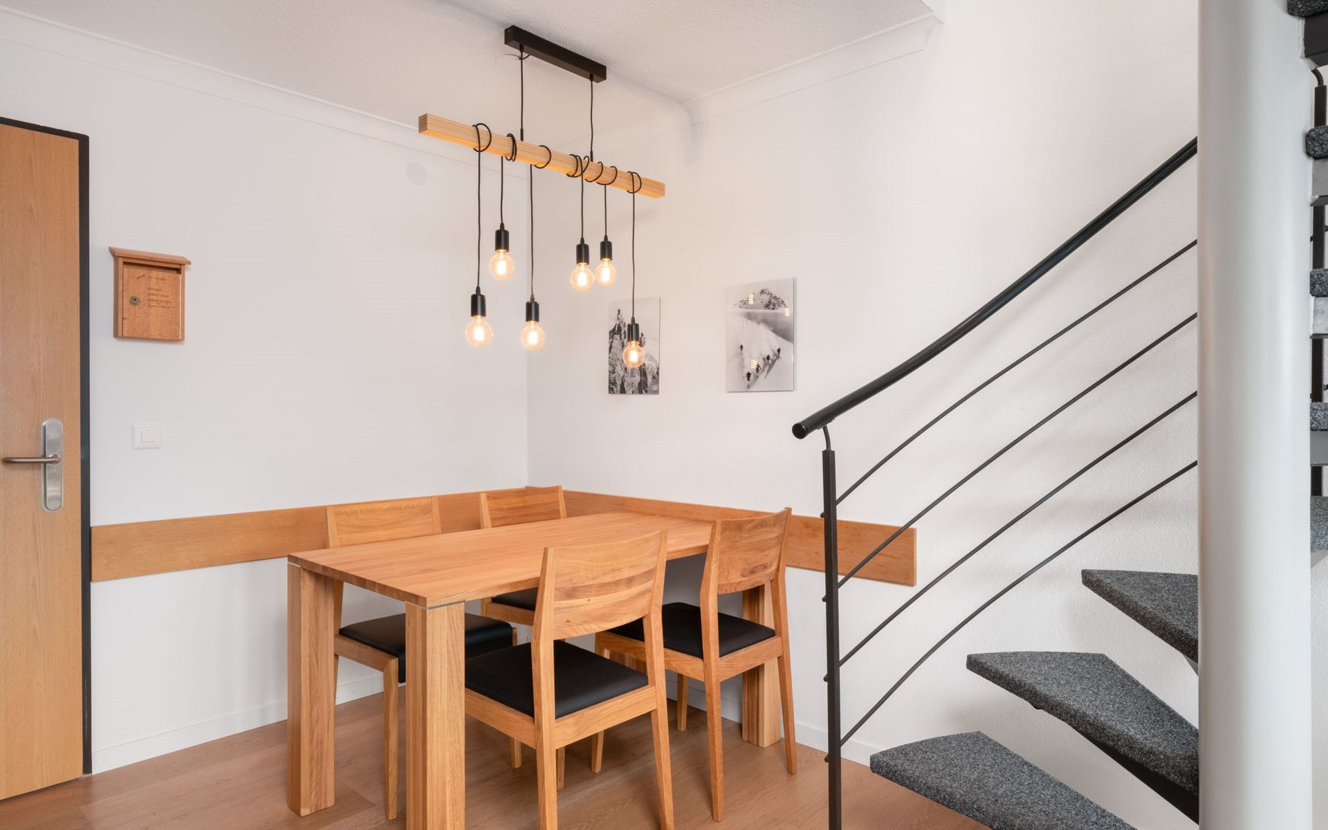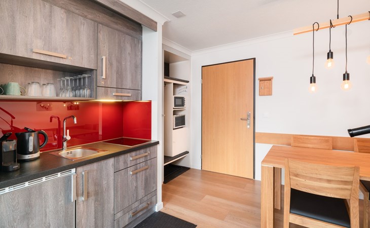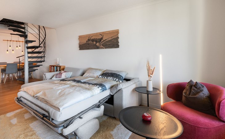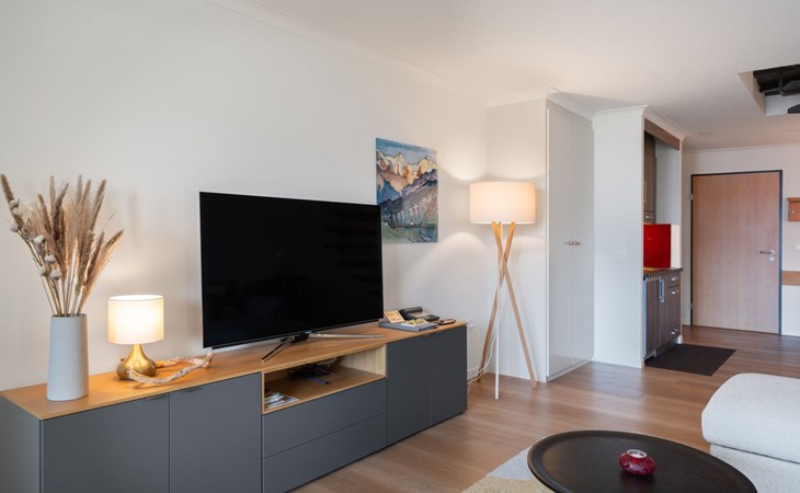 The cozy 2.5 room apartment has 1 bedroom for 2 persons and 1 bathroom with bath/shower combined and a toilet. The apartment has a fully equipped kitchenette (2 hotplates, dishwasher, Nespresso coffee machine, microwave, oven) and a cozy dining and living area with a sofa bed rotatable (day/night) for 2 more people, cable TV/radio. A balcony with a wonderful panoramic view of the surrounding mountains. Free wireless LAN and 1 underground parking space are included in the rental price. Pets are welcome, smoking in the house is not allowed. The apartment is directly connected to a 4-star hotel and the hotel facilities such as indoor pool, bio sauna, Finnish sauna, steam bath and several fitness facilities can be used free of charge.