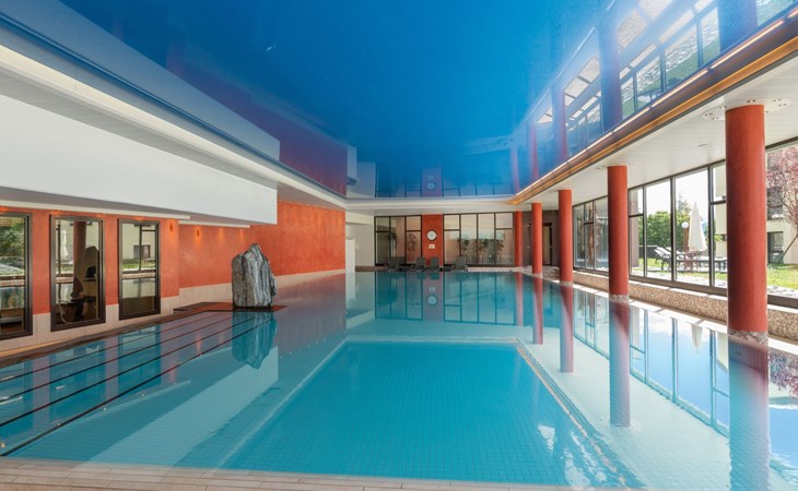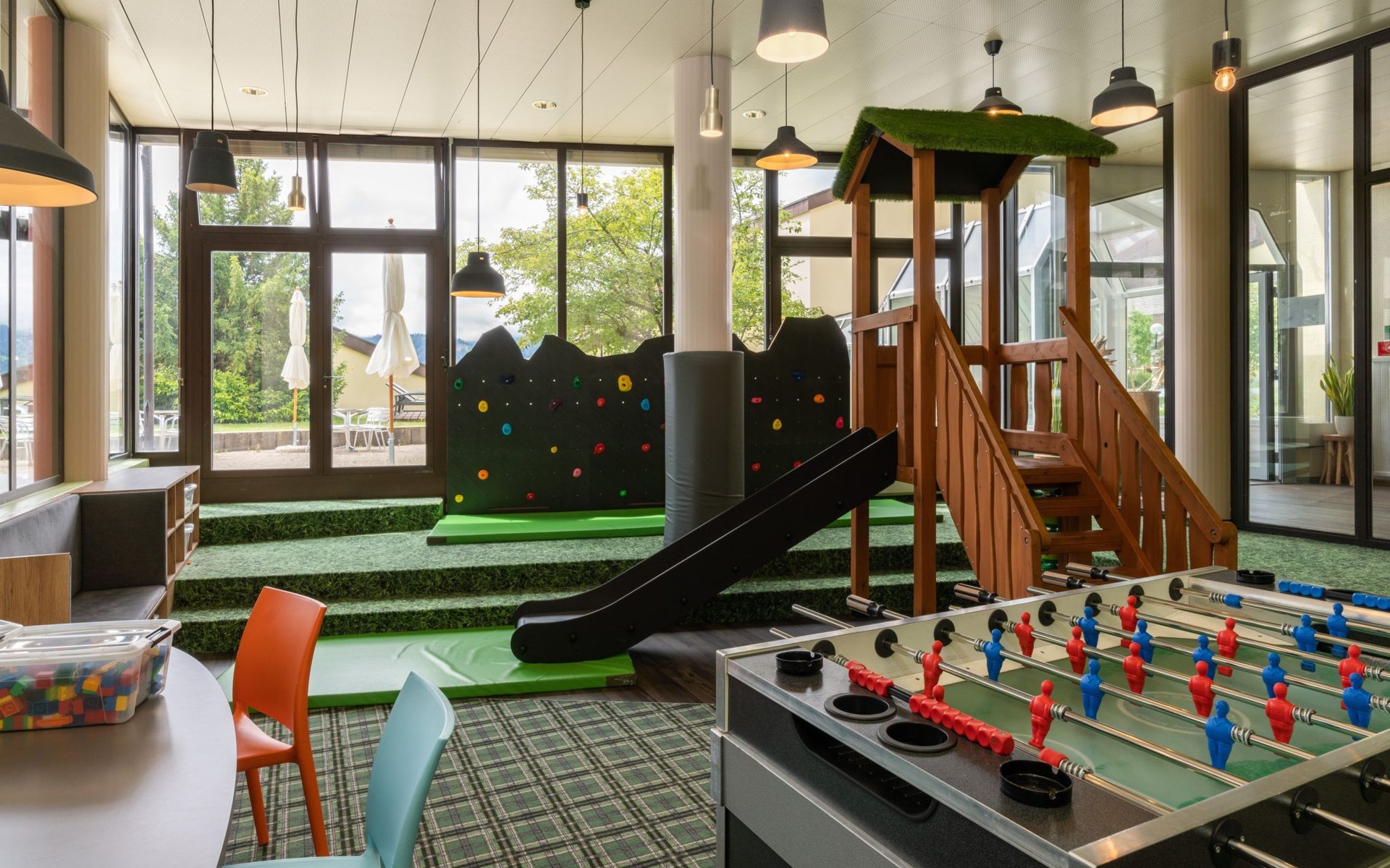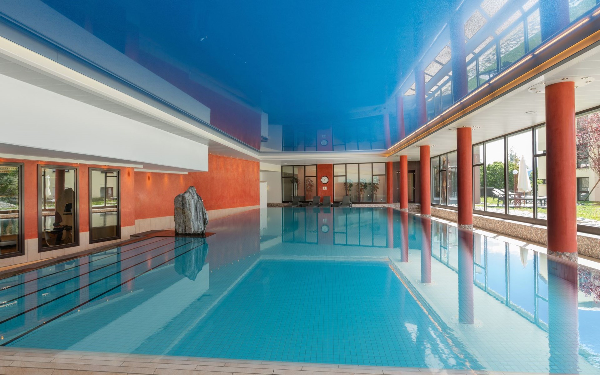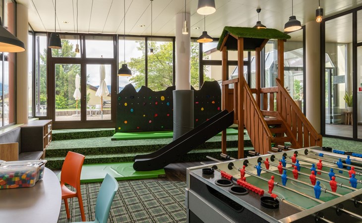 Reception, restaurant, bar, breakfast room, lounge, indoor pool, wellness area (bio sauna, steam bath, Finnish sauna, relaxation room, experience shower, infrared cabin, massage (extra), fitness room, table tennis, billiard table, playroom, elevator, storage room for bicycles, sun terrace, storage room for skis, central heating system, washing machine/dryer (for shared use, extra). Breakfast possible (extra), room service possible (extra). Reserved parking space in underground parking lot. Charging stations for electric vehicles.
