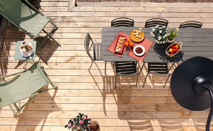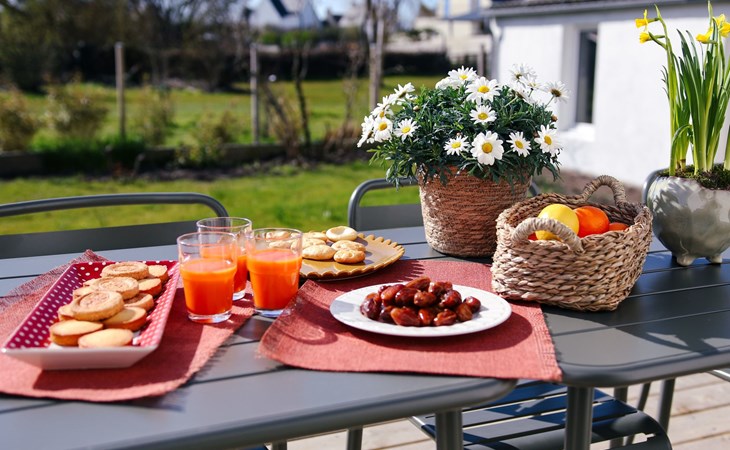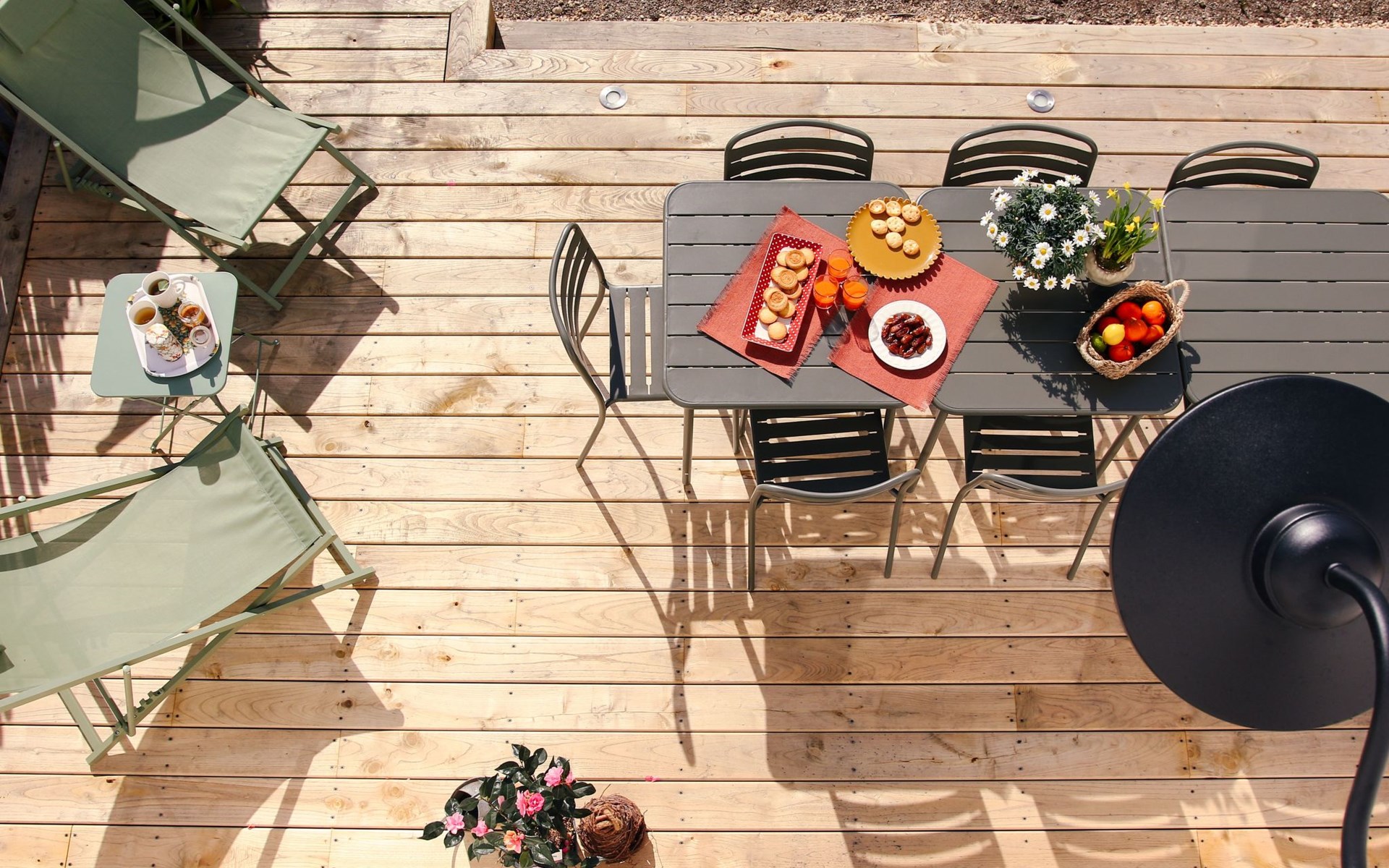 A south-facing wooden terrace invites you to relax (garden furniture, sun loungers, barbecue, parasol).