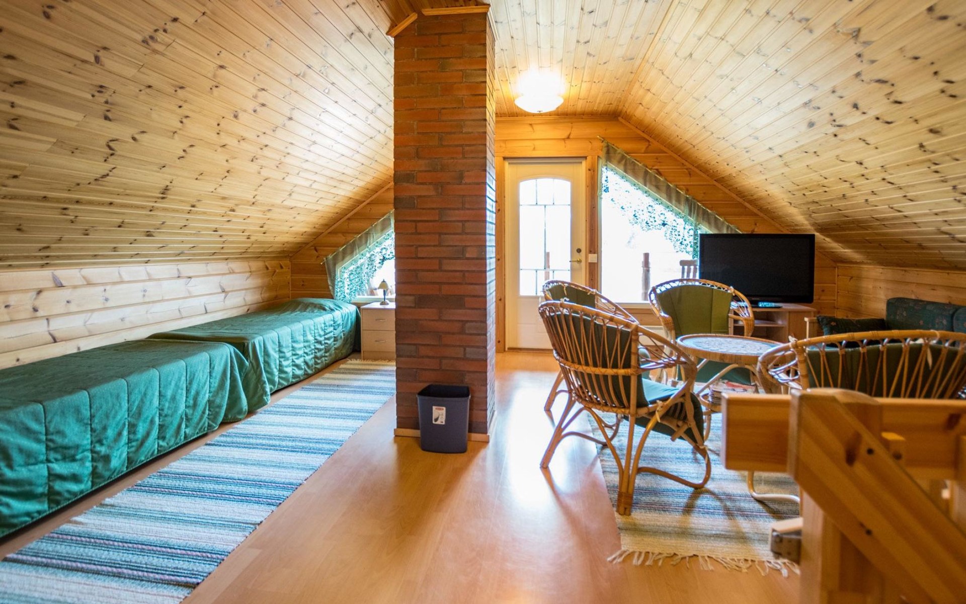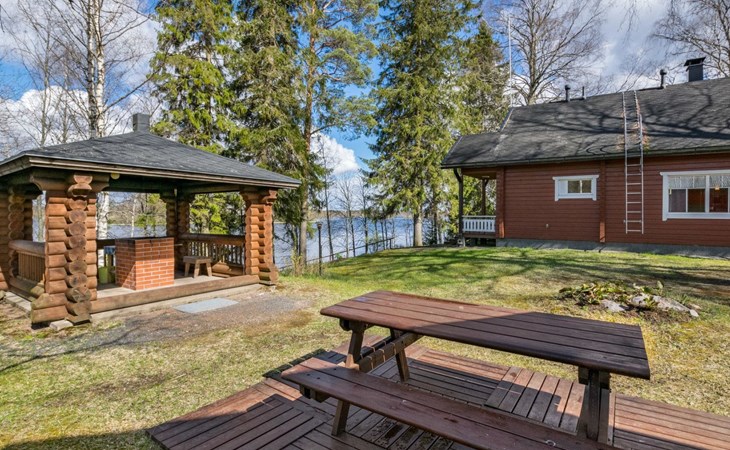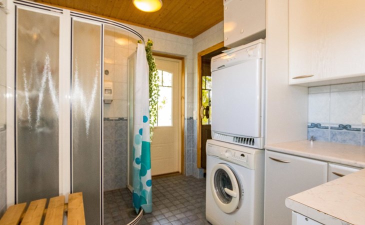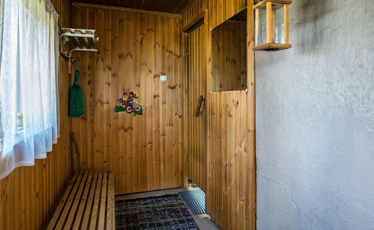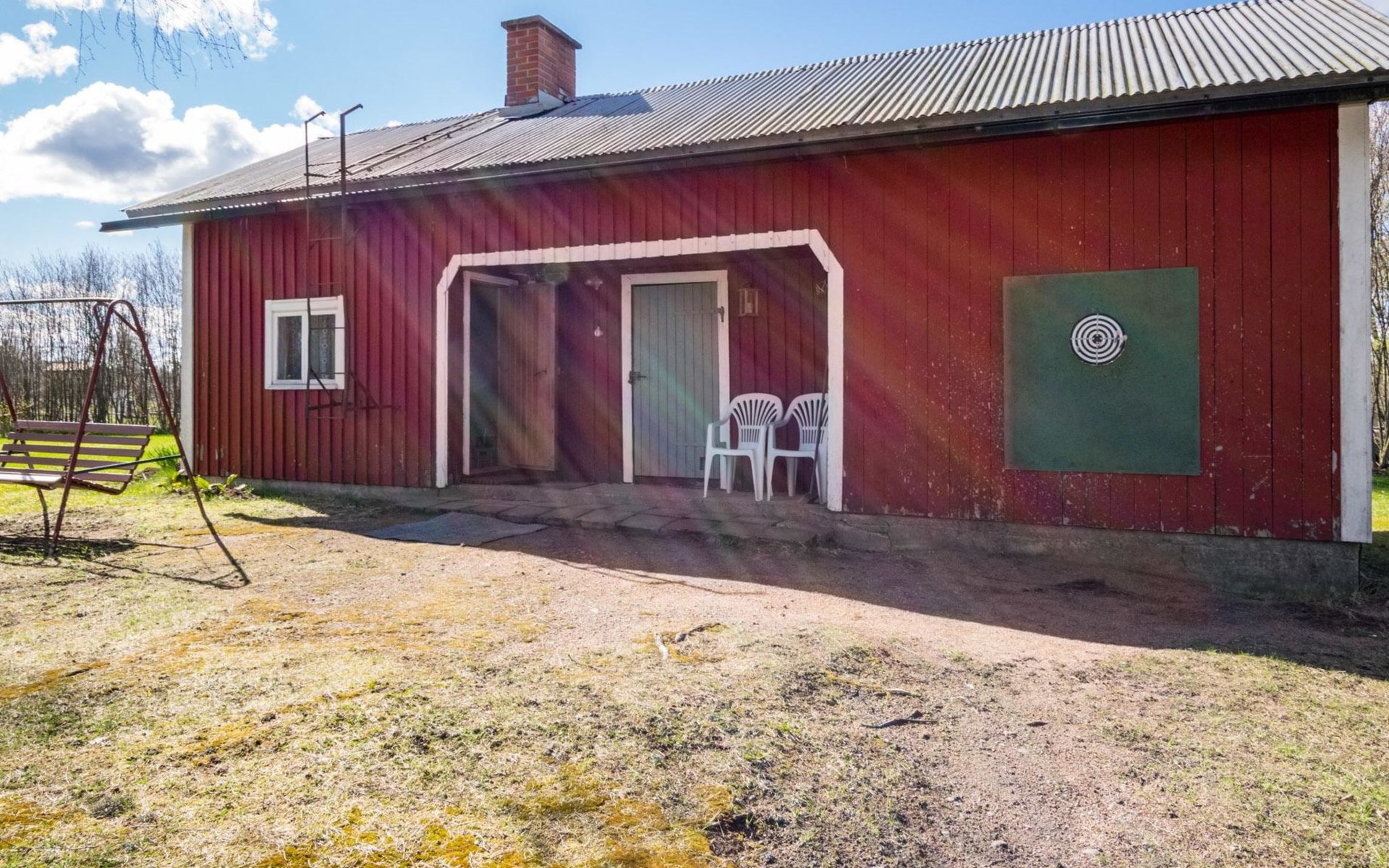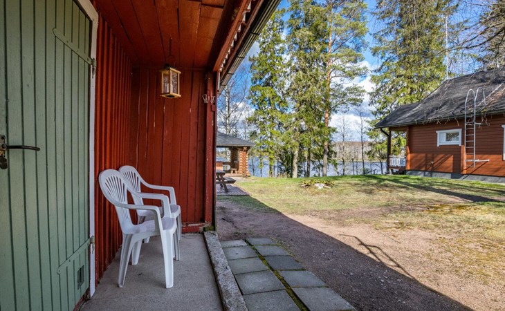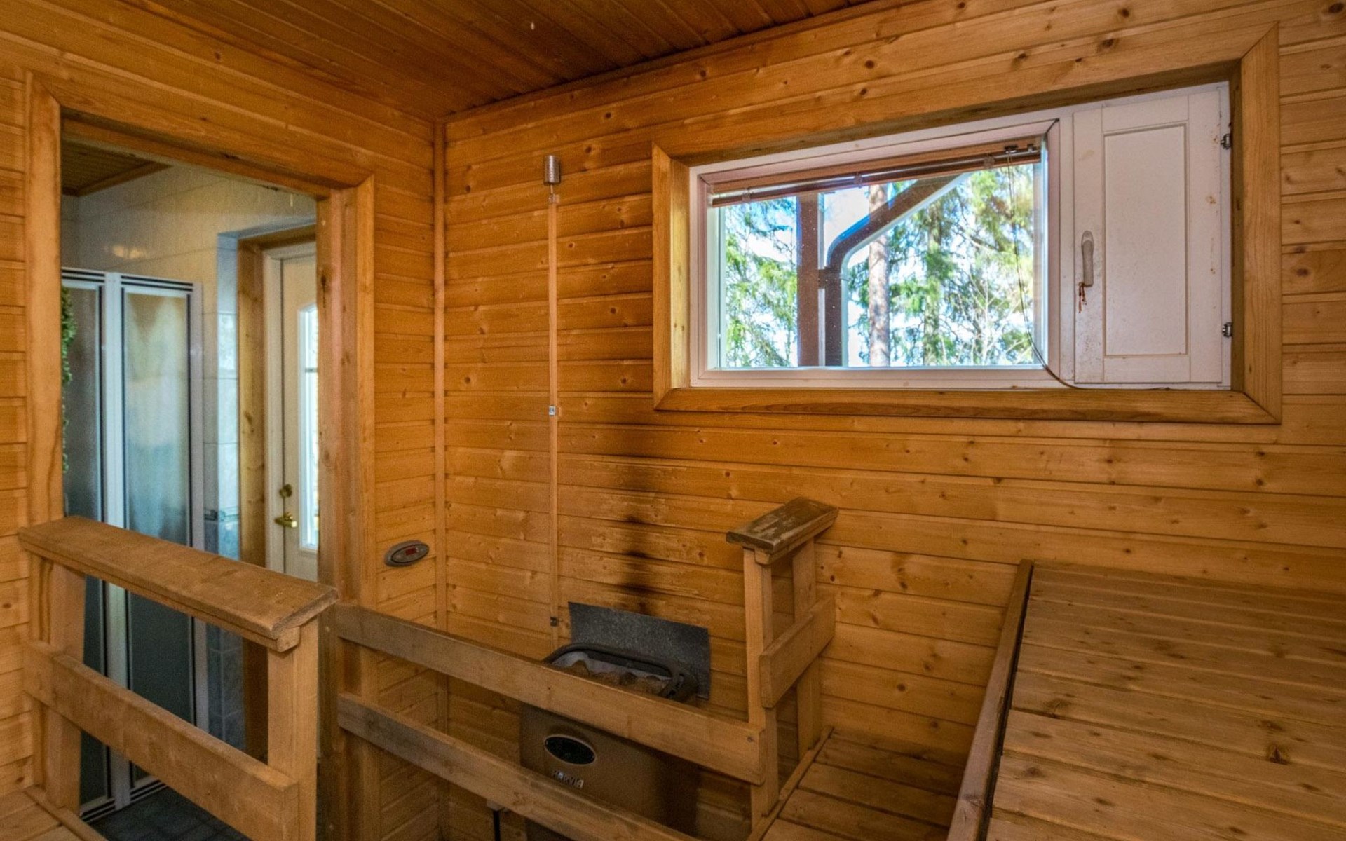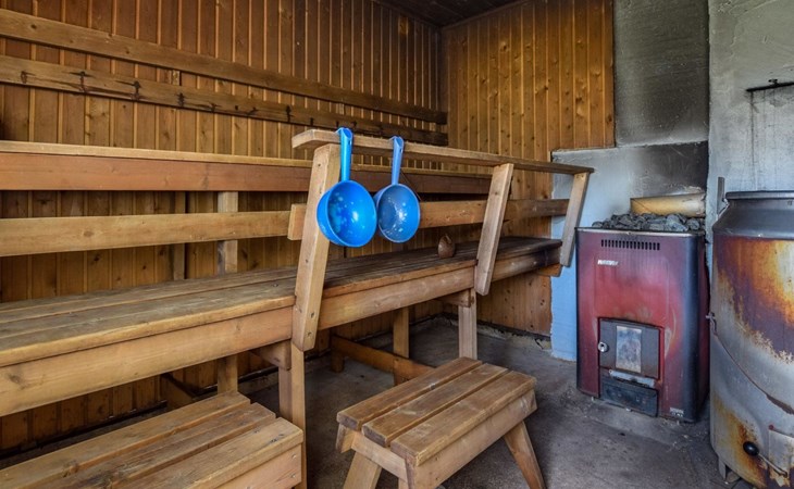 Yard building 35 m², with wood-burning sauna, dressing room, living room, sauna has elec. light and cold water. There is an air source heat pump with cooling and warming functionality on the cabin.