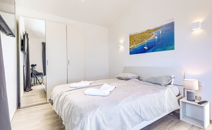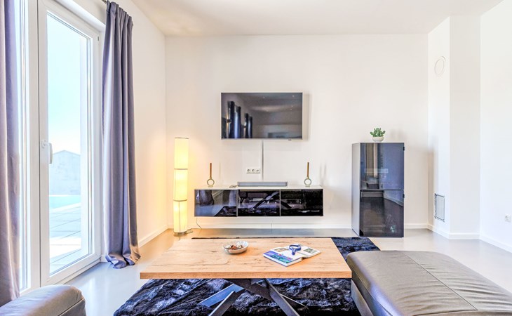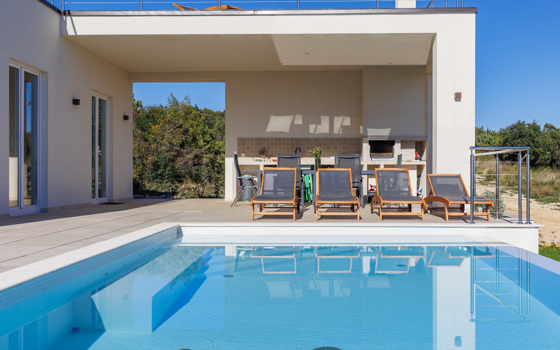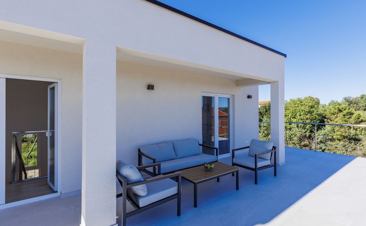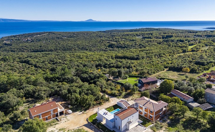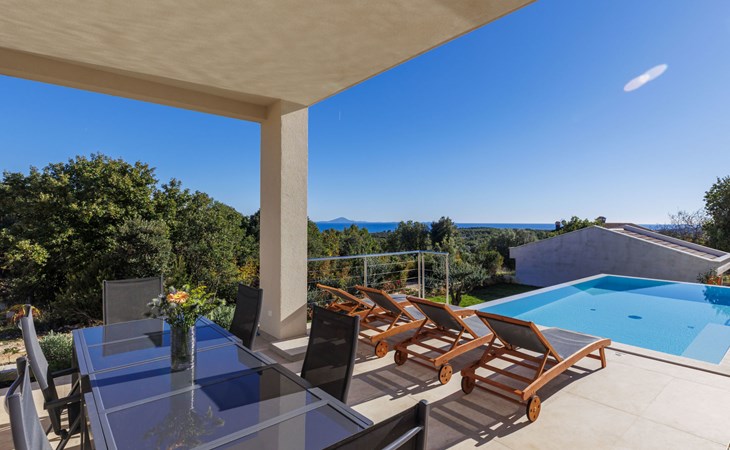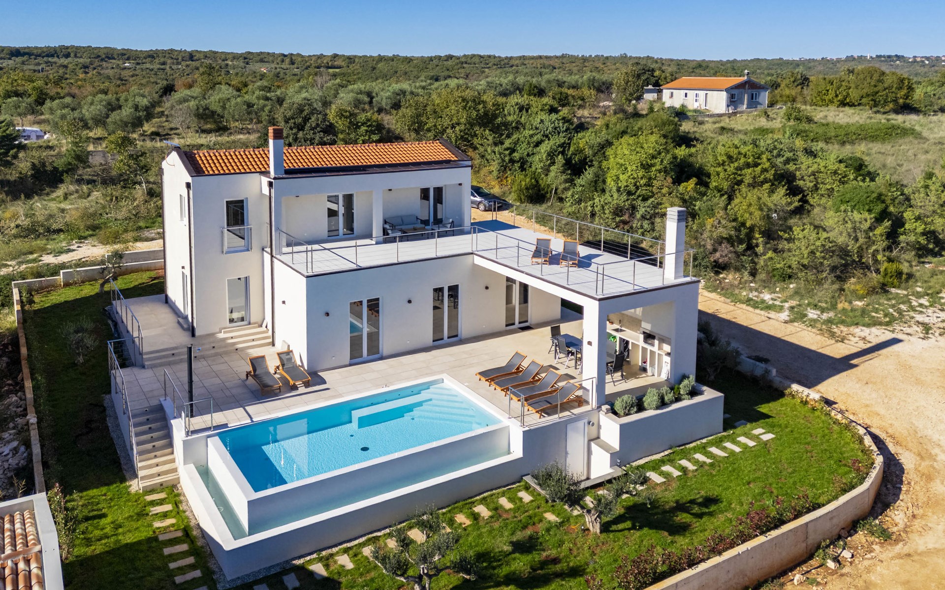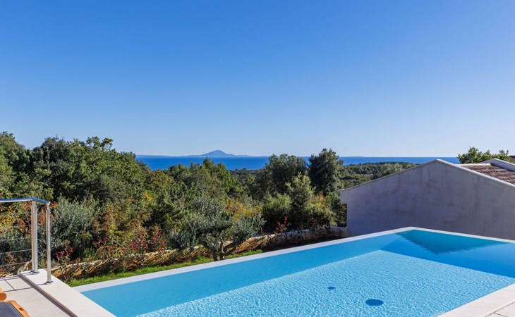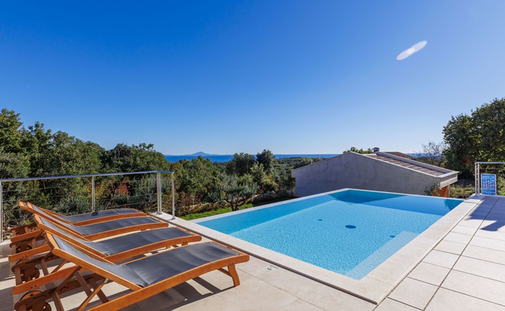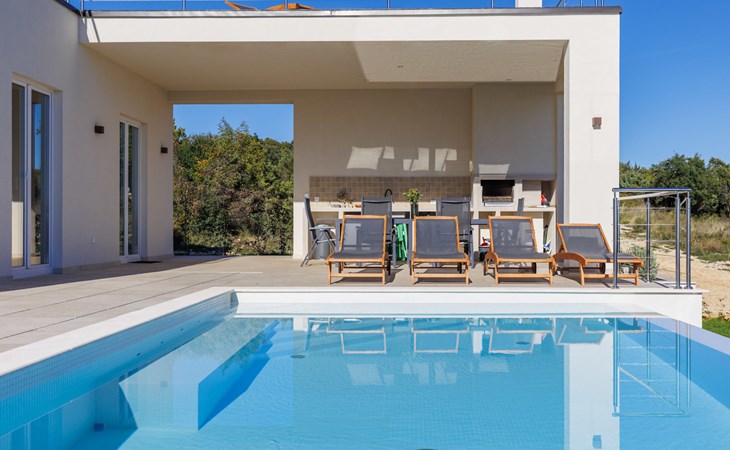 Very beautiful villa "Cappenberg", 2 storeys, built in 2025. 1 km from the centre of Peruški, 8 km from the centre of Marčana, 20 km from the centre of Pula, in an elevated position, 700 m from the sea, 700 m from the beach. Private: property 730 m2, swimming pool angular, heated (8 x 4 m, 32 m2, depth 140 cm, seasonal availability: 01.Mar. - 01.Dec.) with internal staircase and salt-electrolysis pool-cleaning system. Outdoor shower, hot tub, terrace (75 m2), garden furniture, barbecue. In the house: internet access, sauna, table tennis, roof terrace, washing machine, tumble dryer. Parking (for 3 cars) at the house on the premises. E-charging station. Shop 1.5 km, bus stop 7.5 km, pebble beach 3 km, rocky beach 700 m. Groups of teenagers on request only. Heated swimming pool. It is necessary to notify us 7 days in advance if you wish to have the pool heating turned on.