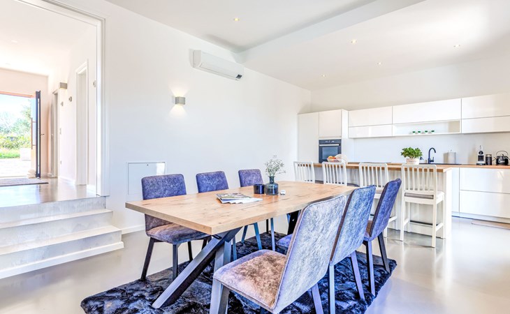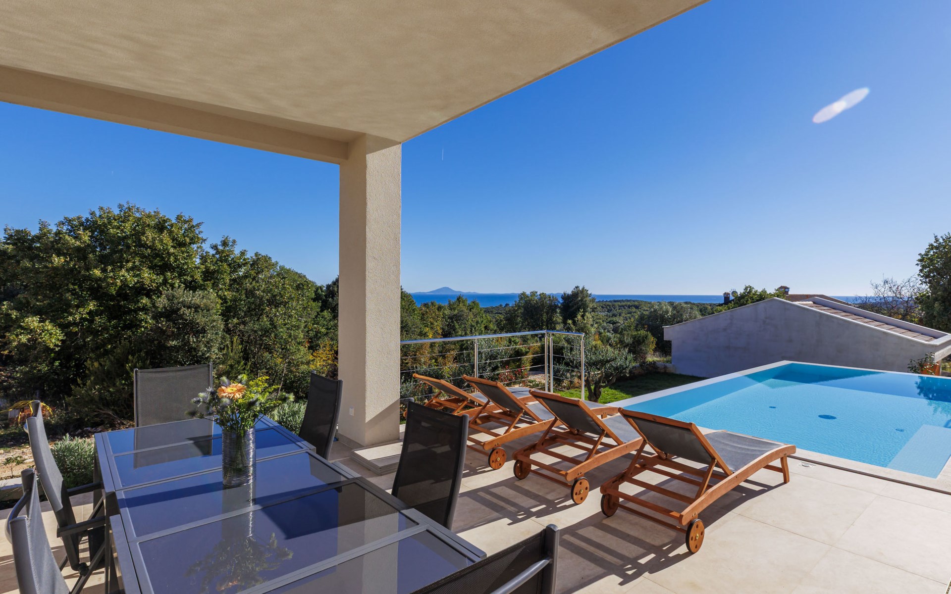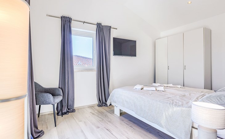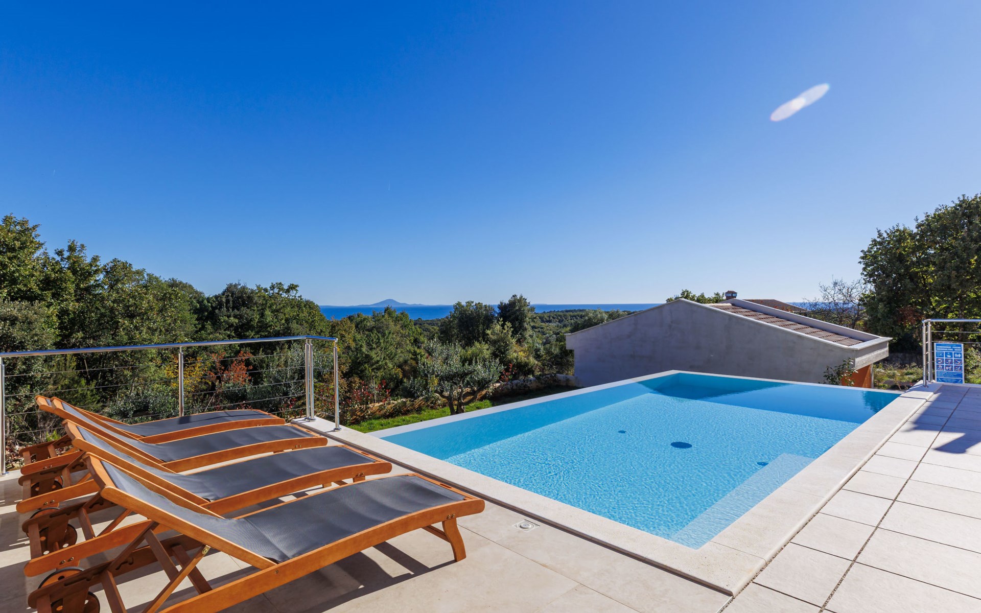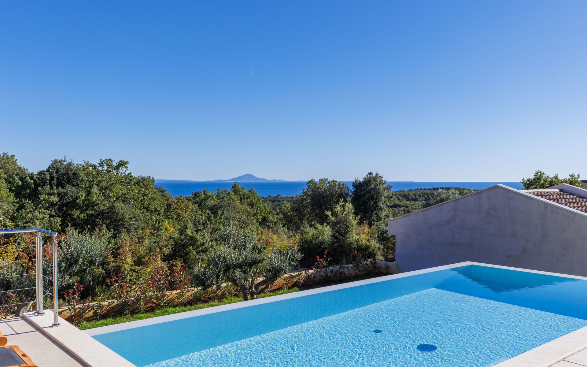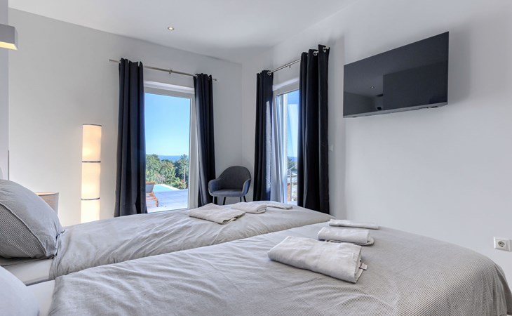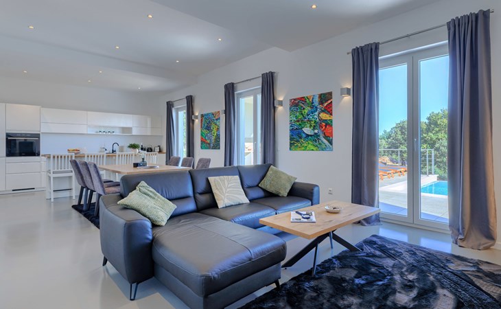 Very beautiful villa "Cappenberg", 2 storeys, built in 2025. 1 km from the centre of Peruški, 8 km from the centre of Marčana, 20 km from the centre of Pula, in an elevated position, 700 m from the sea, 700 m from the beach. Private: property 730 m2, swimming pool angular, heated (8 x 4 m, 32 m2, depth 140 cm, seasonal availability: 01.Mar. - 01.Dec.) with internal staircase and salt-electrolysis pool-cleaning system. Outdoor shower, hot tub, terrace (75 m2), garden furniture, barbecue. In the house: internet access, sauna, table tennis, roof terrace, washing machine, tumble dryer. Parking (for 3 cars) at the house on the premises. E-charging station. Shop 1.5 km, bus stop 7.5 km, pebble beach 3 km, rocky beach 700 m. Groups of teenagers on request only. Heated swimming pool. It is necessary to notify us 7 days in advance if you wish to have the pool heating turned on.