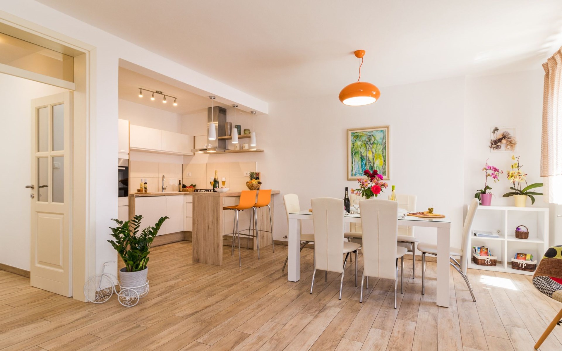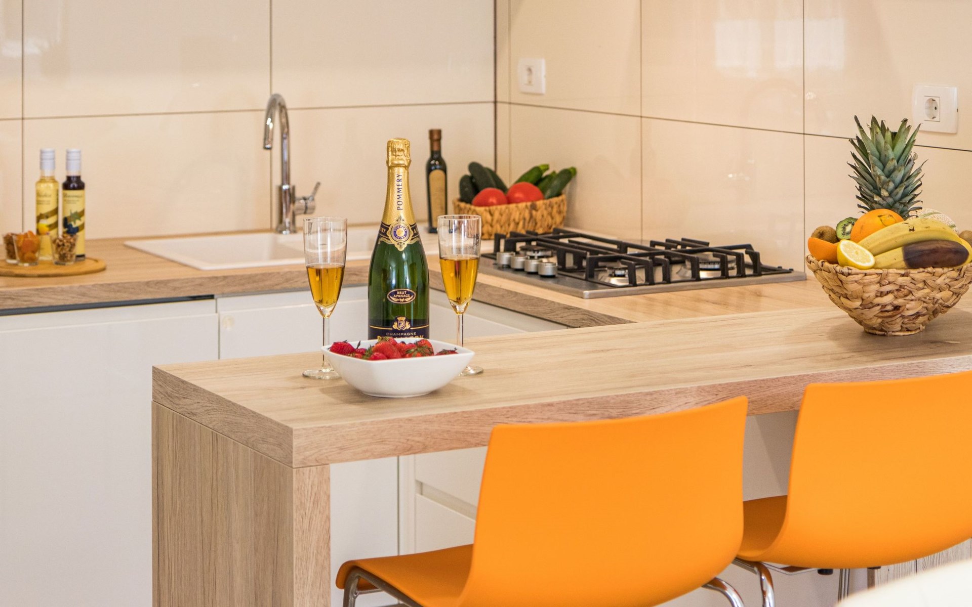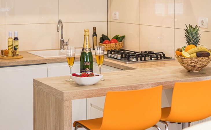 The air-conditioned holiday home on the ground floor has 80m² of living space spread over two floors. The large living room is furnished with a cosy corner sofa and a flat-screen TV with satellite channels. The fold-out sofa here can also be used as a bed (1.60 x 2m). The open-plan kitchen is separated by a breakfast bar and has a fridge with freezer compartment, gas hob, oven and all important electrical appliances such as microwave, kettle, toaster and coffee machine. There is also a guest WC. Upstairs you will find two bedrooms, one of which is furnished with a double bed (1.80m wide) and the other with two single beds (each 90cm wide). The owner will be happy to provide you with a baby cot and a high chair free of charge. The large bathroom is equipped with towel heating, a large washbasin and a walk-in shower, WC, bidet and hairdryer. A washing machine is also available. WLAN is available free of charge throughout the house.