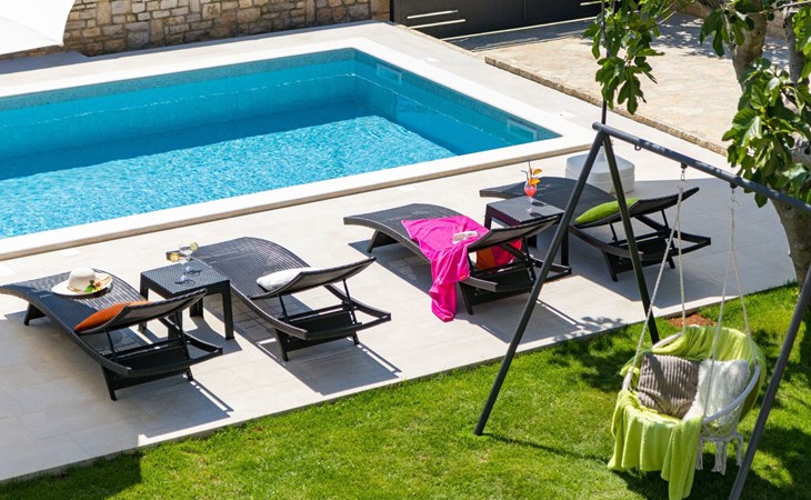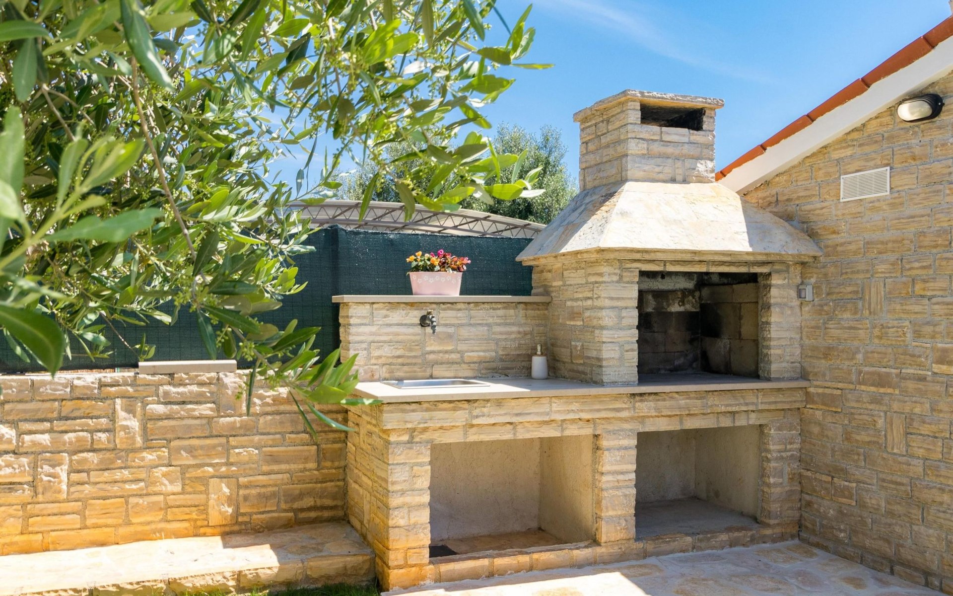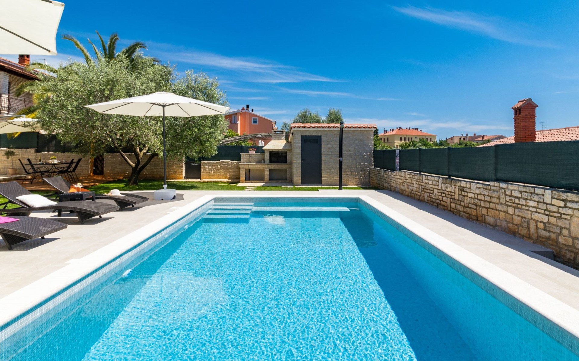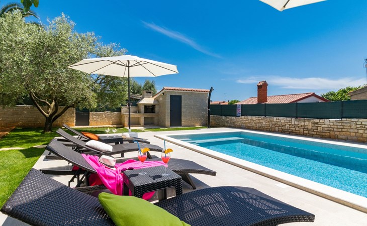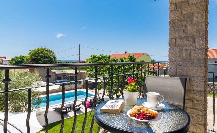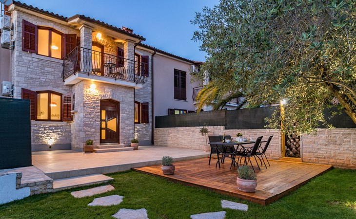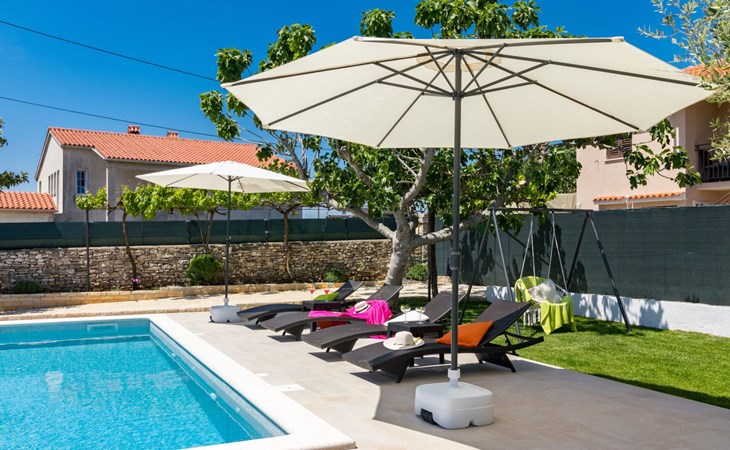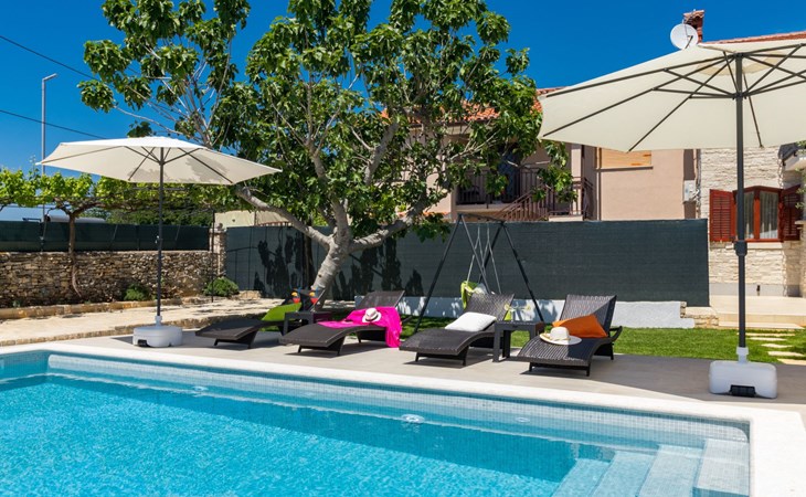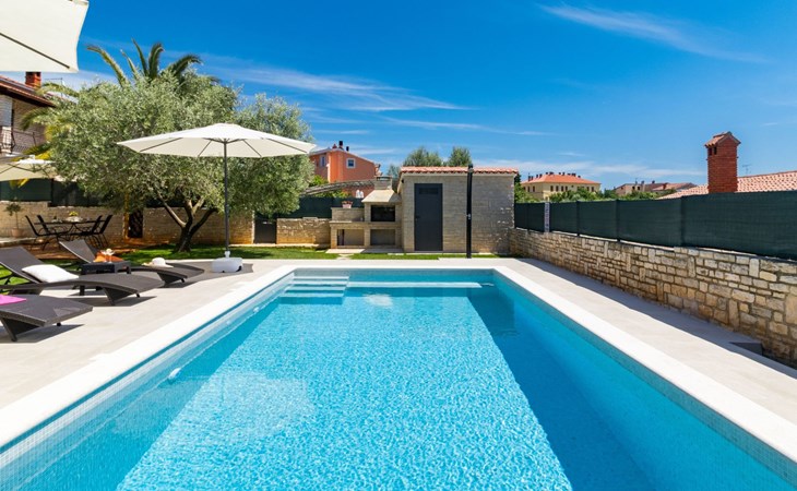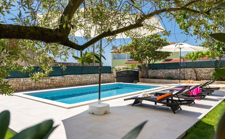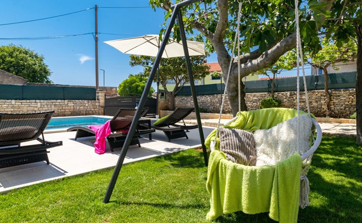 From the bedroom on the upper floor, you step out onto the balcony, which overlooks the garden and from which you can enjoy the view of the island of Brijuni and the sea. From the living room you can access the terrace, which is furnished with a table and chairs and a barbecue for al fresco dining. Adjacent to this is the large garden, where you will find the approx. 3.5 x 7 metre pool with a depth of approx. 1.3 metres. On the enclosed plot in front of the house there is another terrace, as well as the two parking spaces, which are for your private use. 1-3 pets are allowed on request.