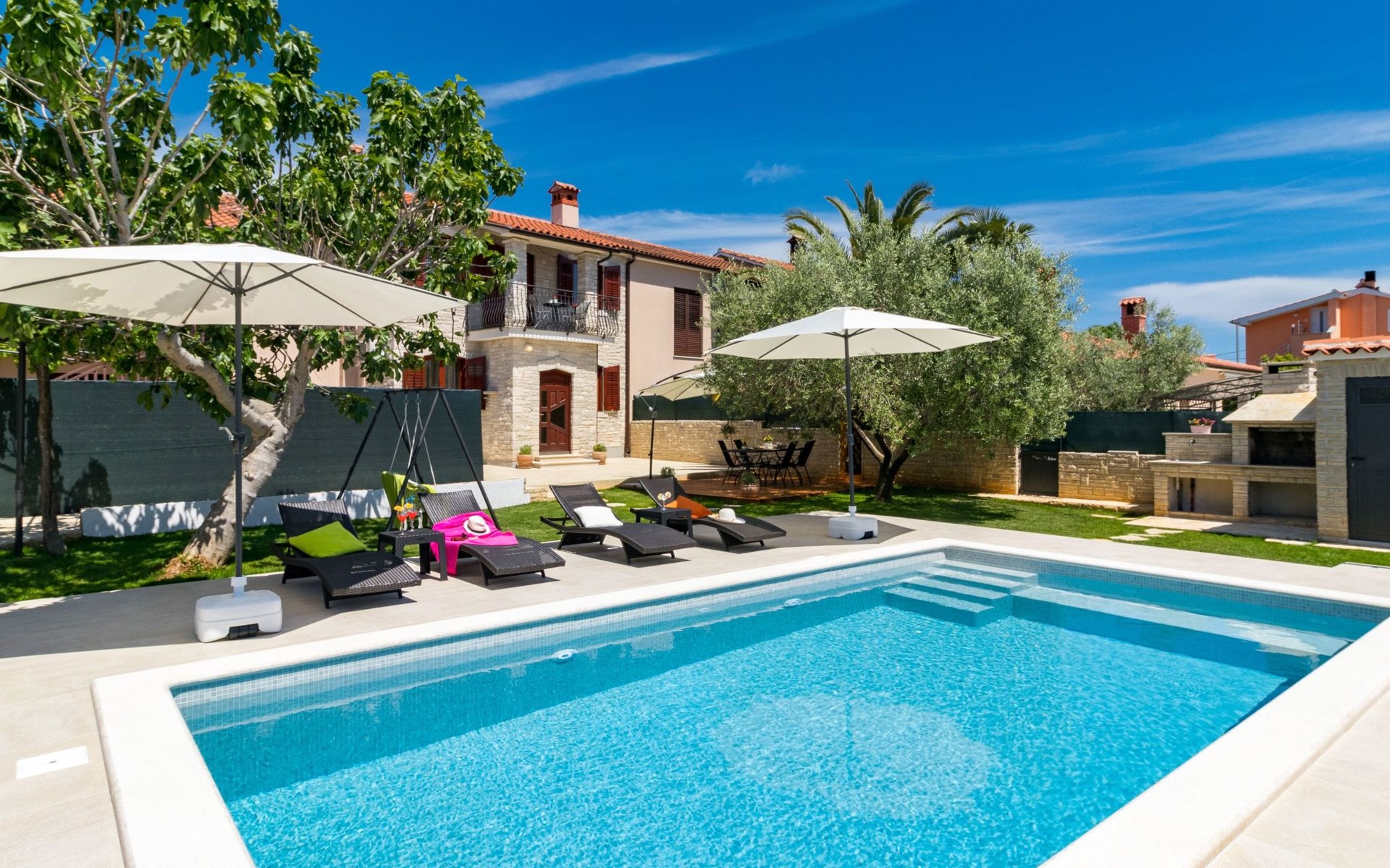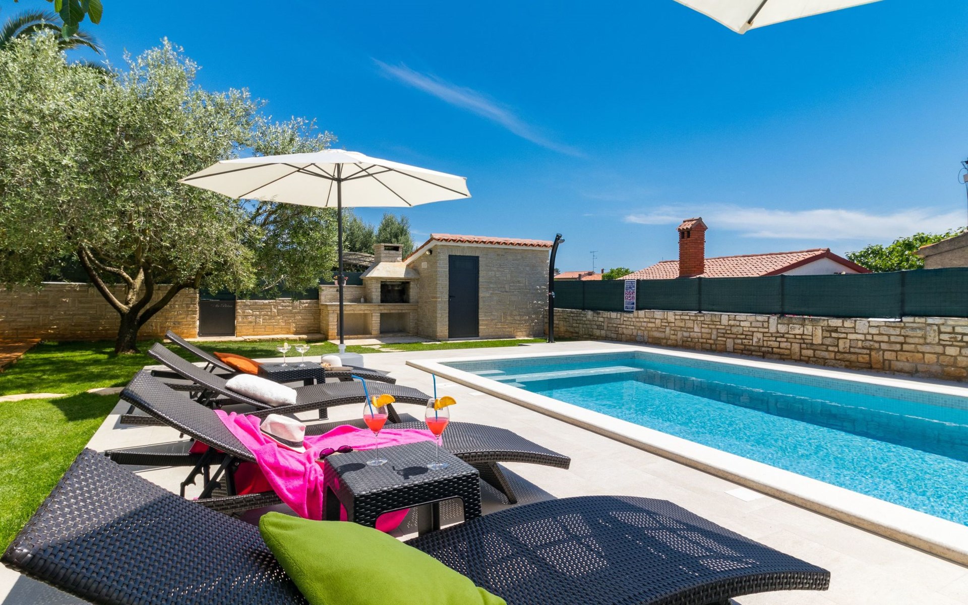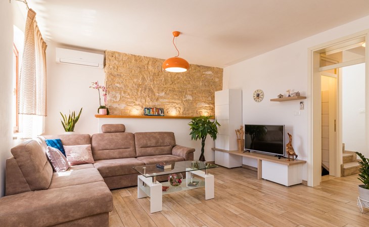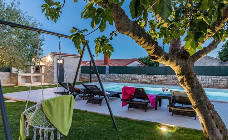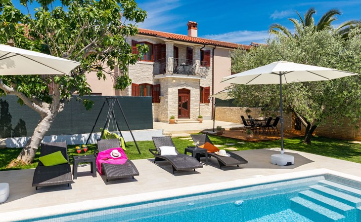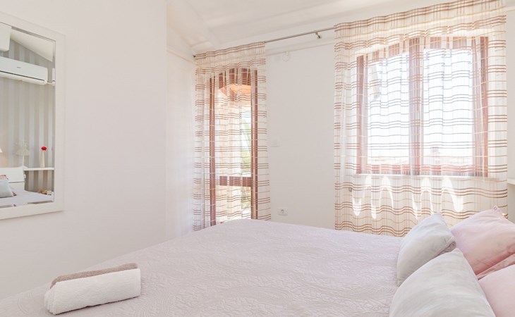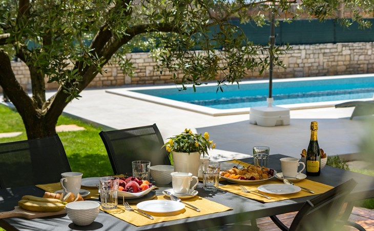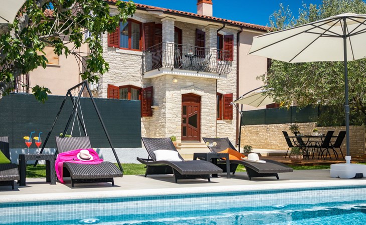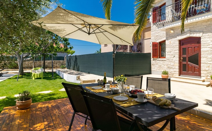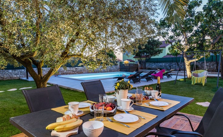From the bedroom on the upper floor, you step out onto the balcony, which overlooks the garden and from which you can enjoy the view of the island of Brijuni and the sea. From the living room you can access the terrace, which is furnished with a table and chairs and a barbecue for al fresco dining. Adjacent to this is the large garden, where you will find the approx. 3.5 x 7 metre pool with a depth of approx. 1.3 metres. On the enclosed plot in front of the house there is another terrace, as well as the two parking spaces, which are for your private use. 1-3 pets are allowed on request.