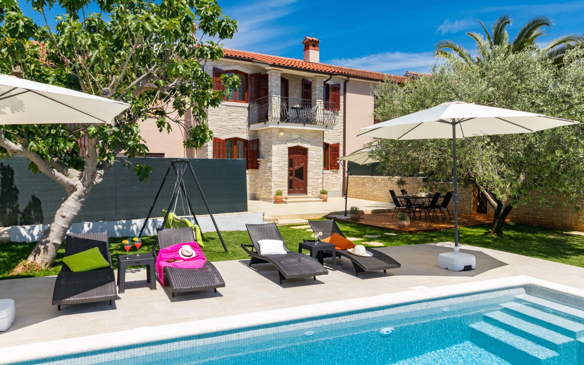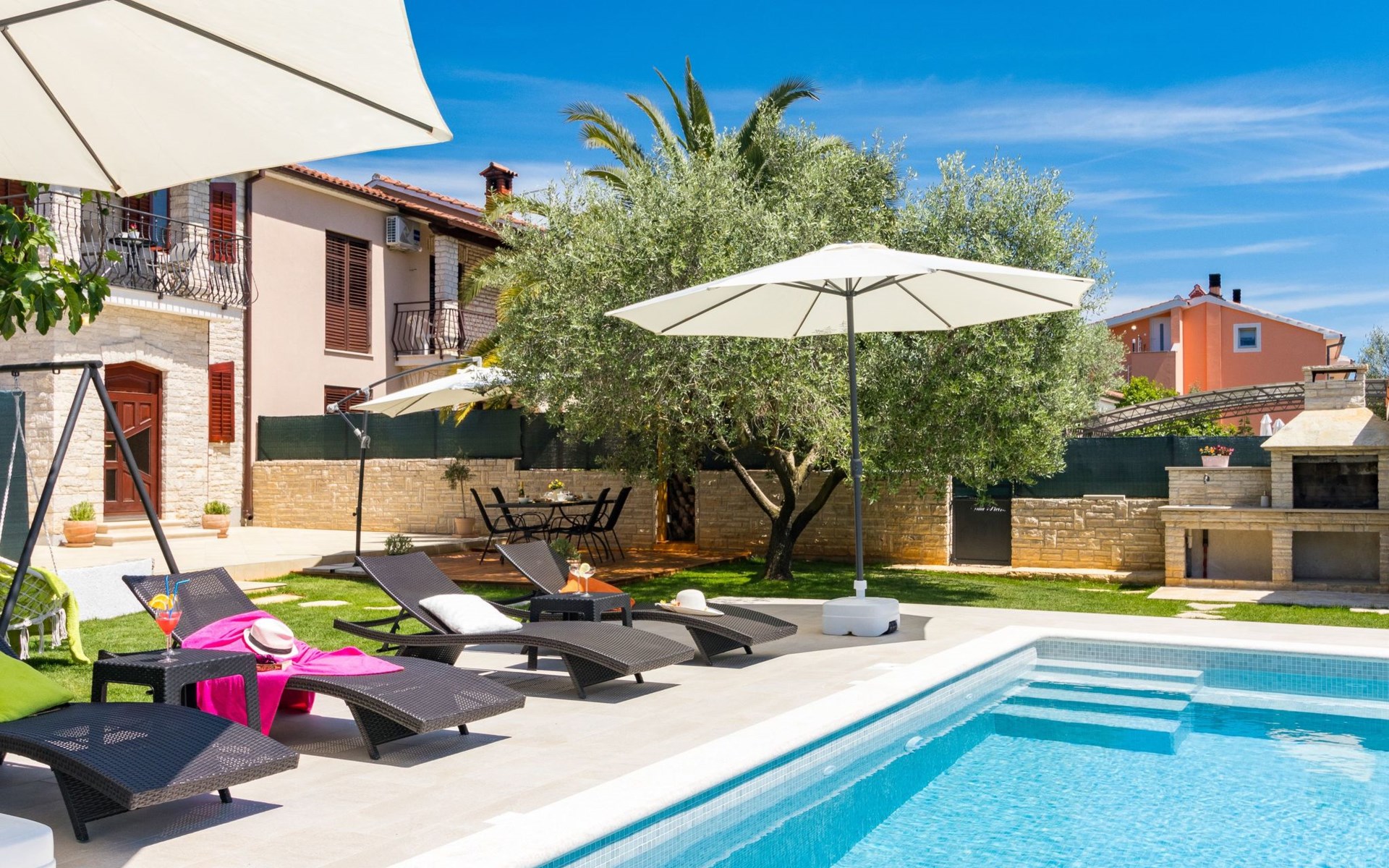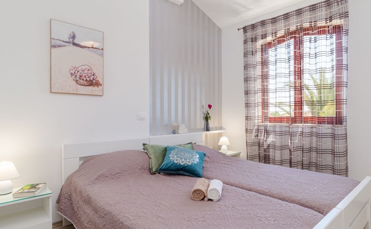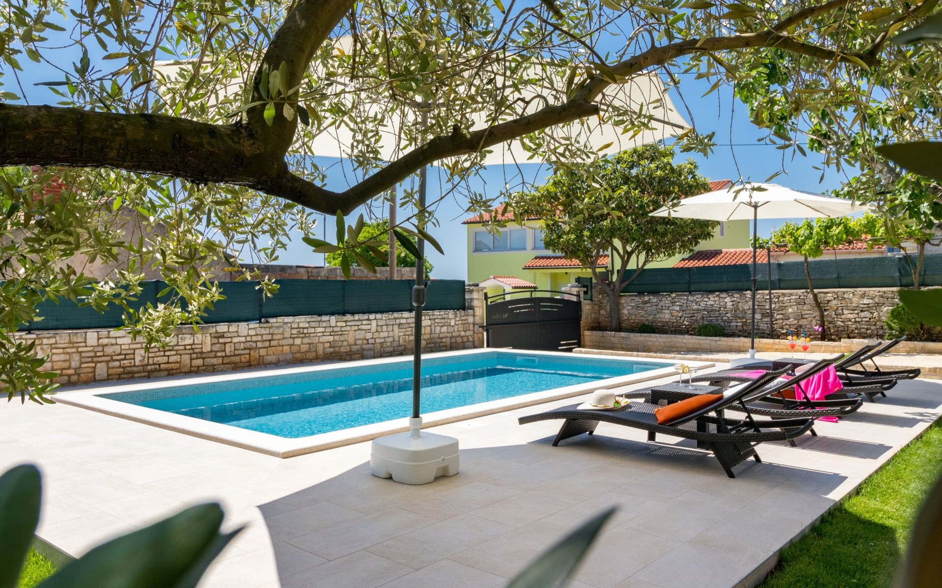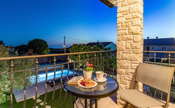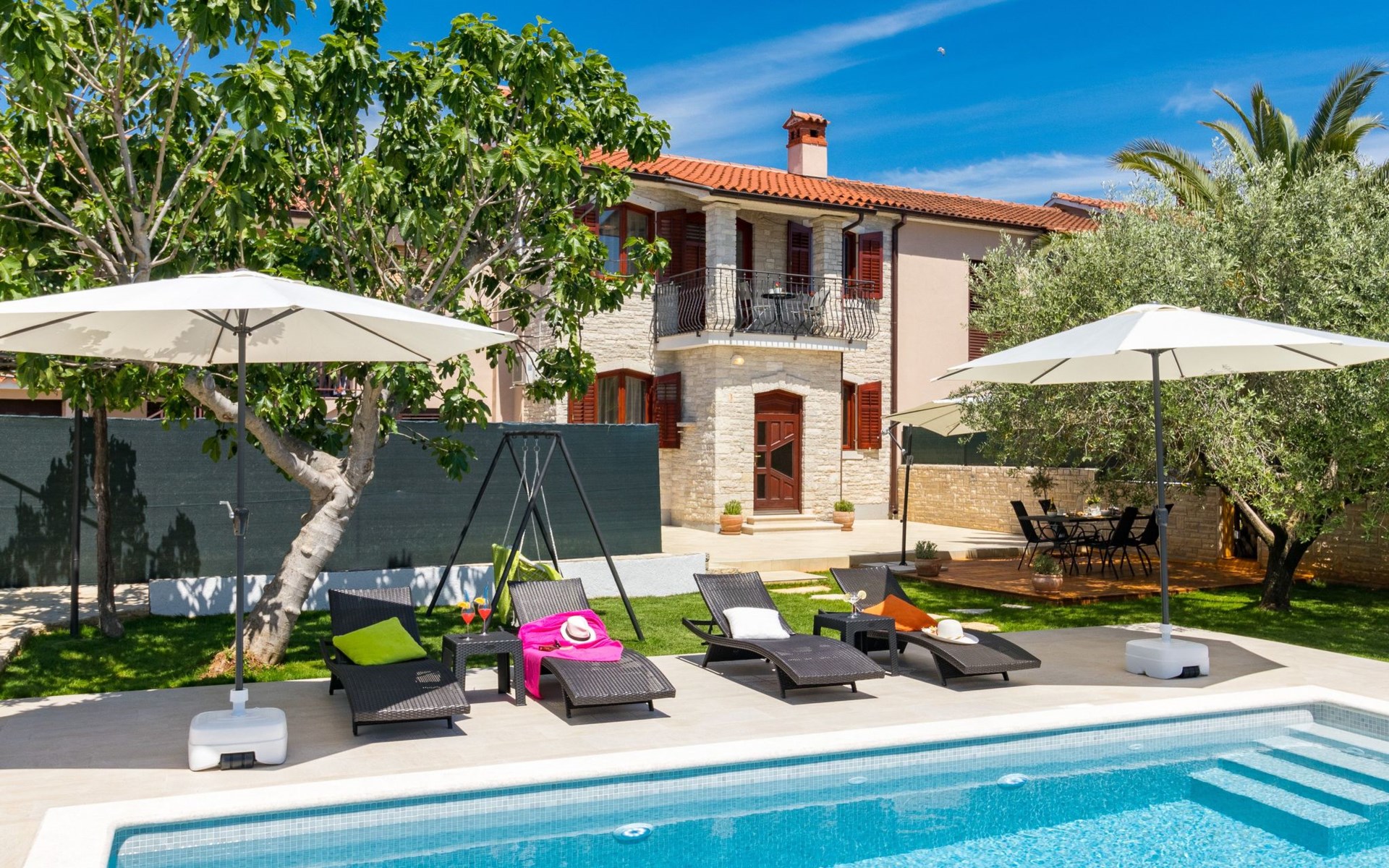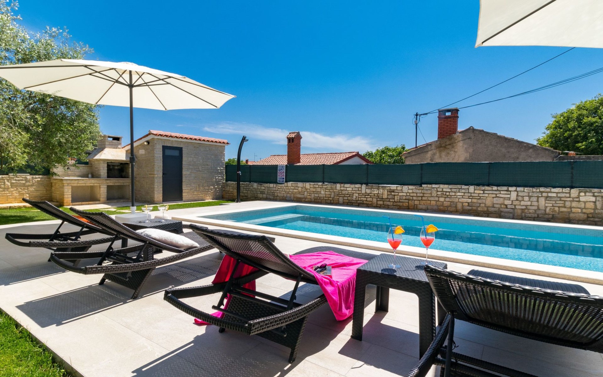 From the bedroom on the upper floor, you step out onto the balcony, which overlooks the garden and from which you can enjoy the view of the island of Brijuni and the sea. From the living room you can access the terrace, which is furnished with a table and chairs and a barbecue for al fresco dining. Adjacent to this is the large garden, where you will find the approx. 3.5 x 7 metre pool with a depth of approx. 1.3 metres. On the enclosed plot in front of the house there is another terrace, as well as the two parking spaces, which are for your private use. 1-3 pets are allowed on request.