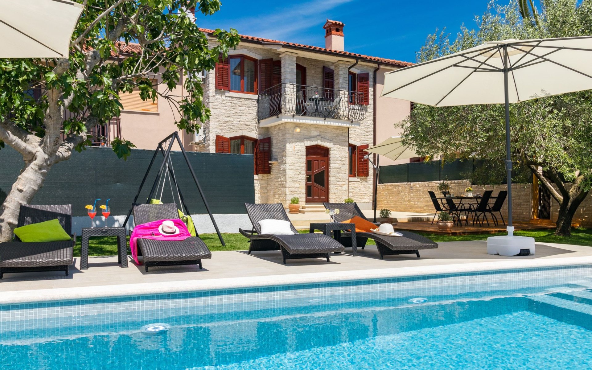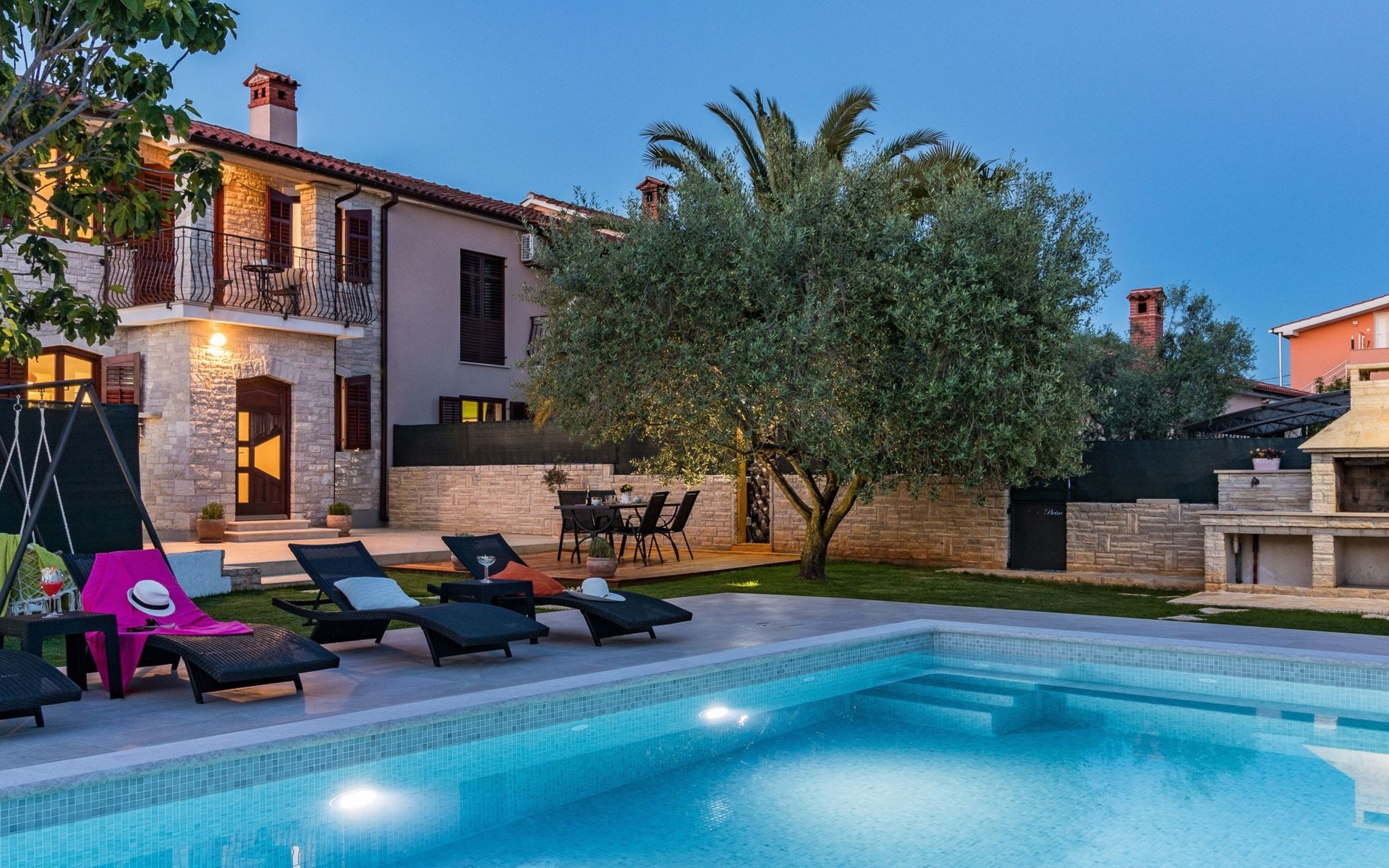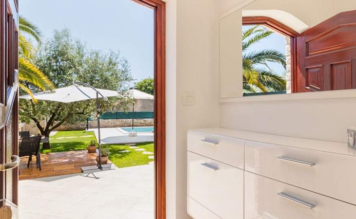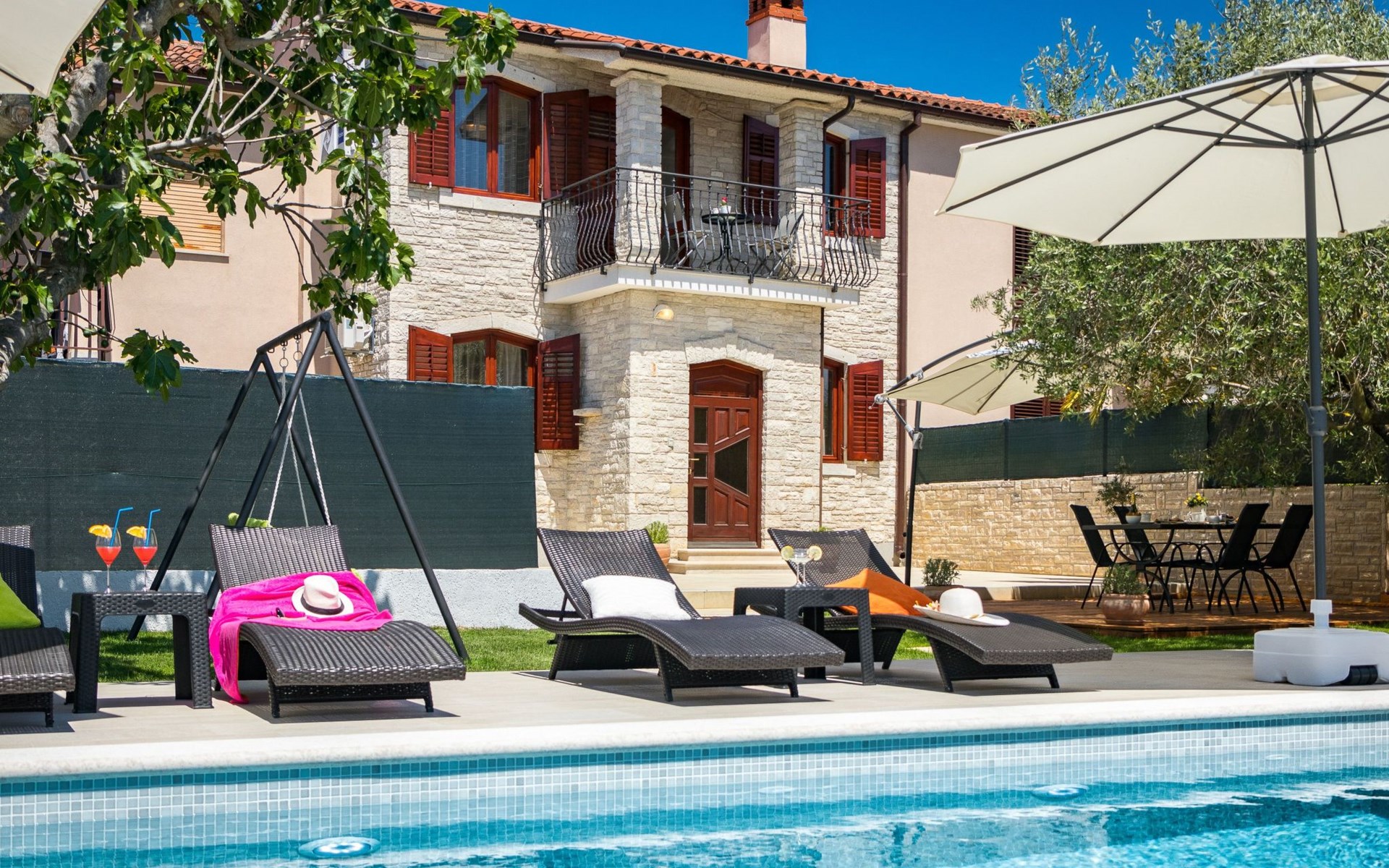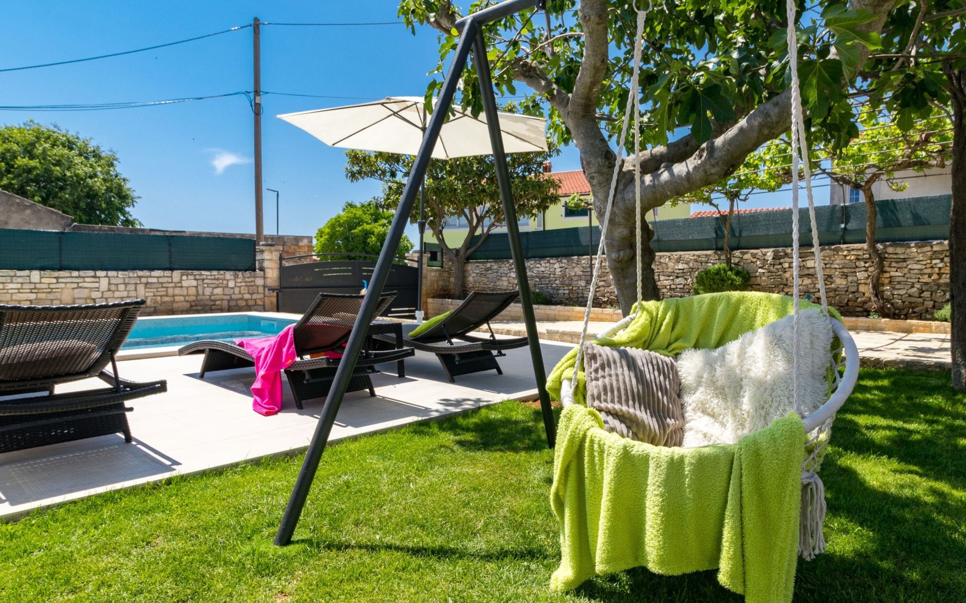 From the bedroom on the upper floor, you step out onto the balcony, which overlooks the garden and from which you can enjoy the view of the island of Brijuni and the sea. From the living room you can access the terrace, which is furnished with a table and chairs and a barbecue for al fresco dining. Adjacent to this is the large garden, where you will find the approx. 3.5 x 7 metre pool with a depth of approx. 1.3 metres. On the enclosed plot in front of the house there is another terrace, as well as the two parking spaces, which are for your private use. 1-3 pets are allowed on request.
