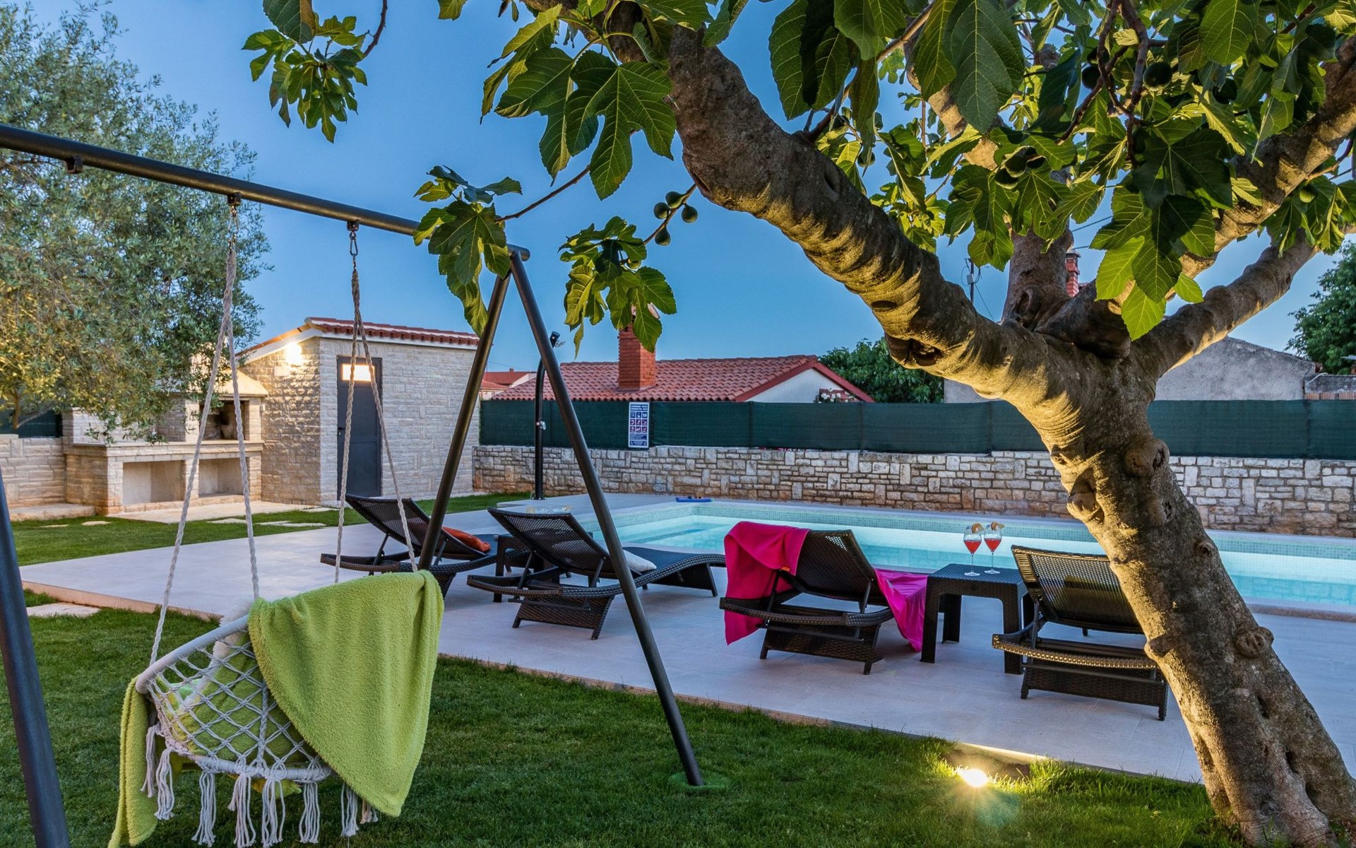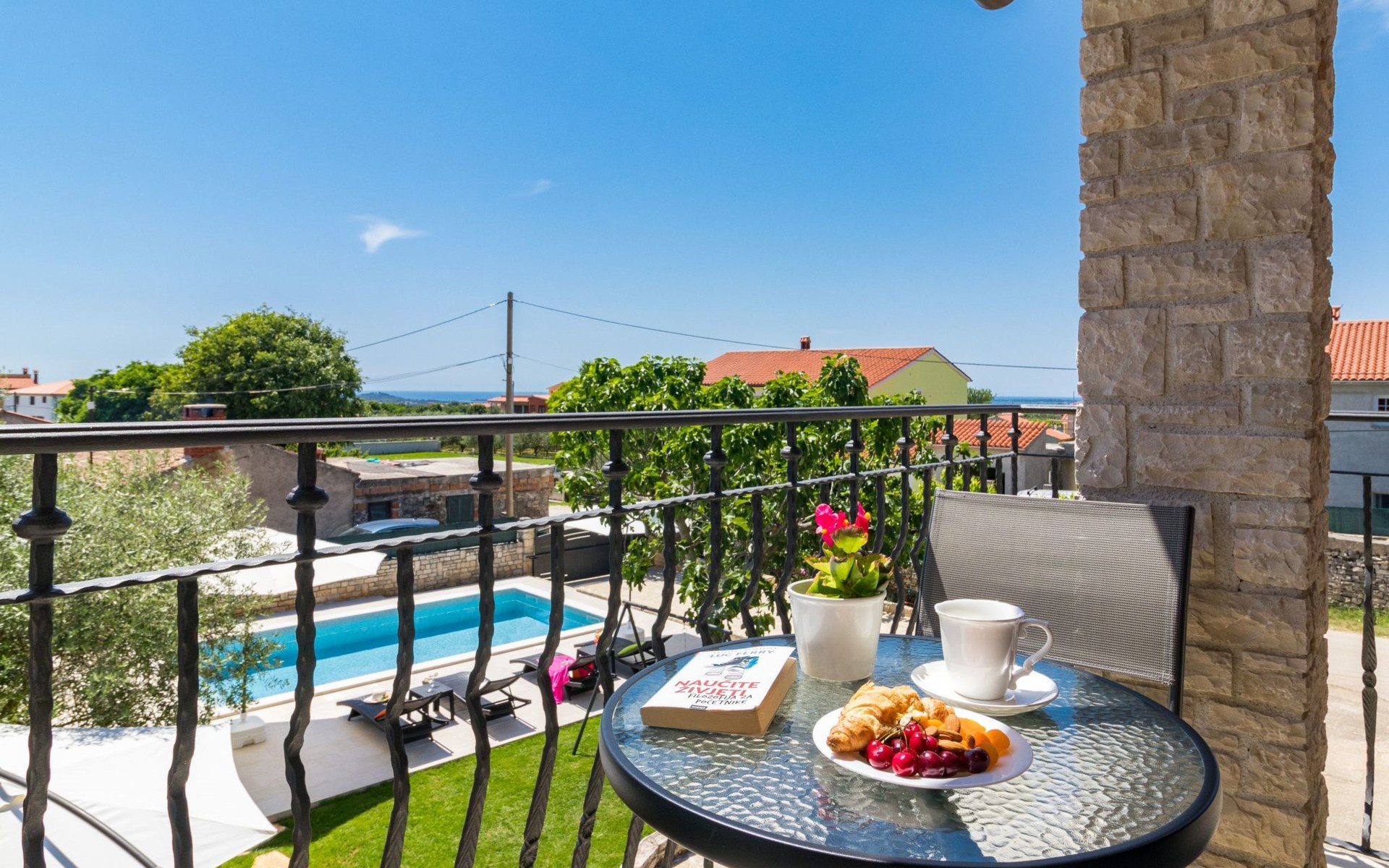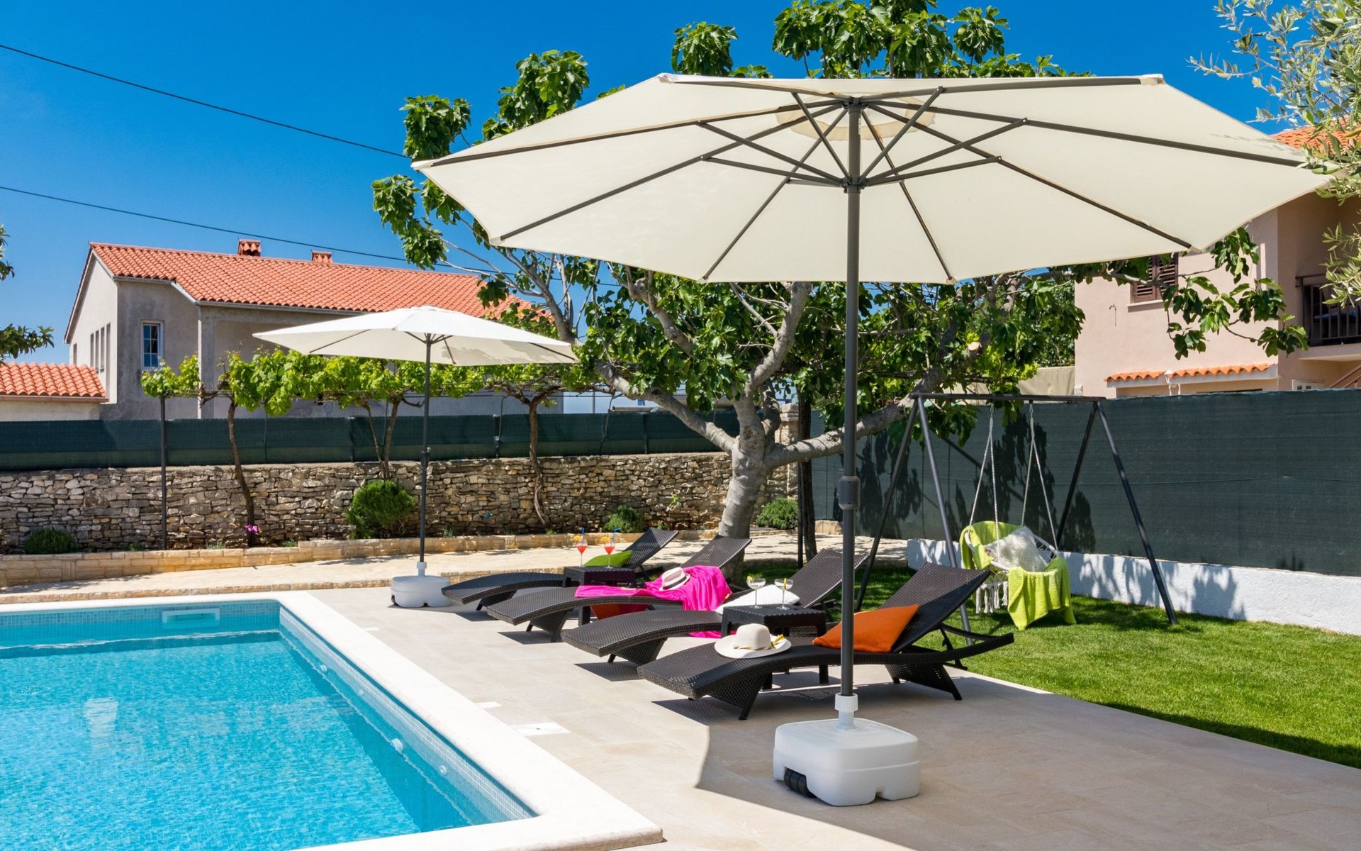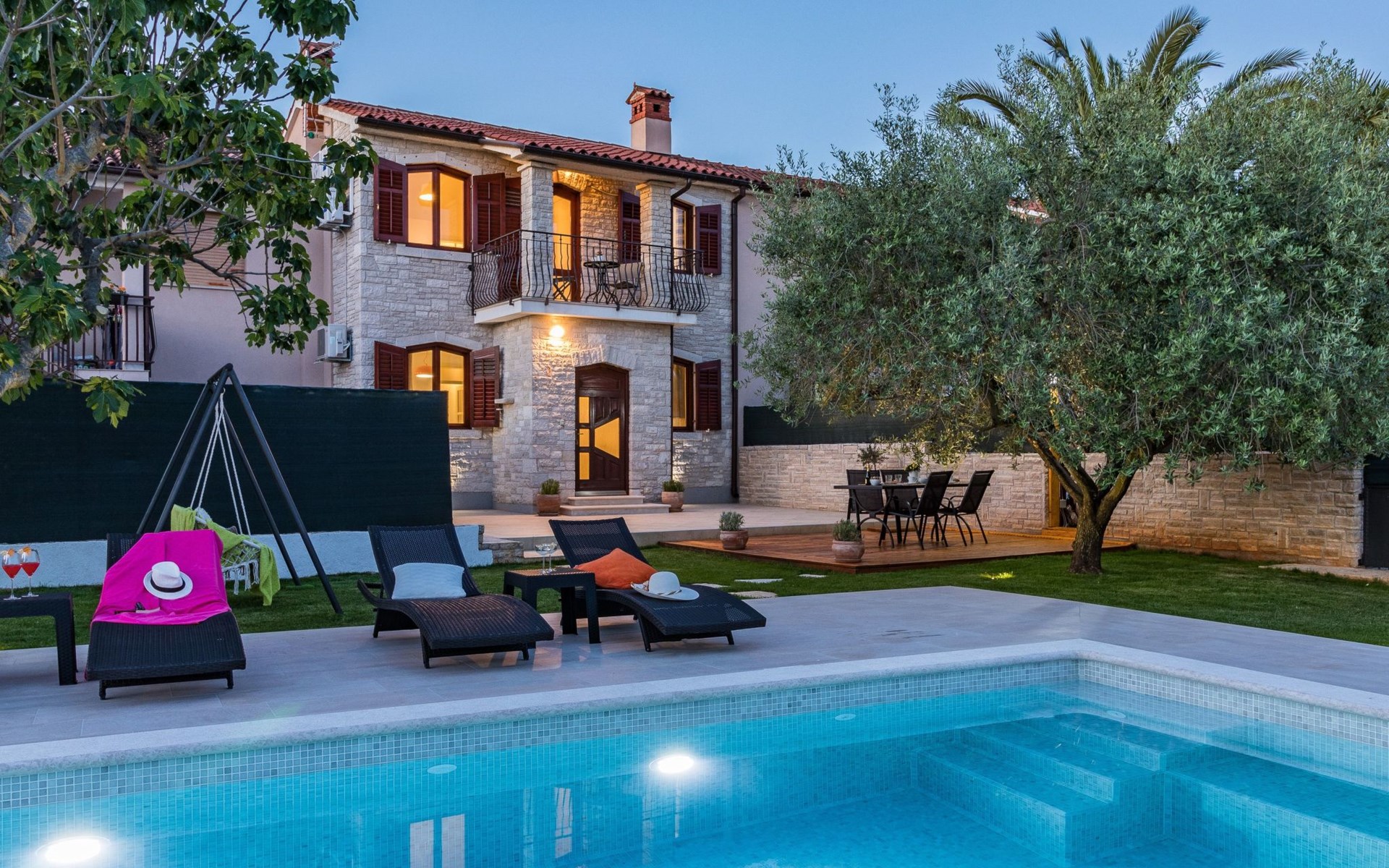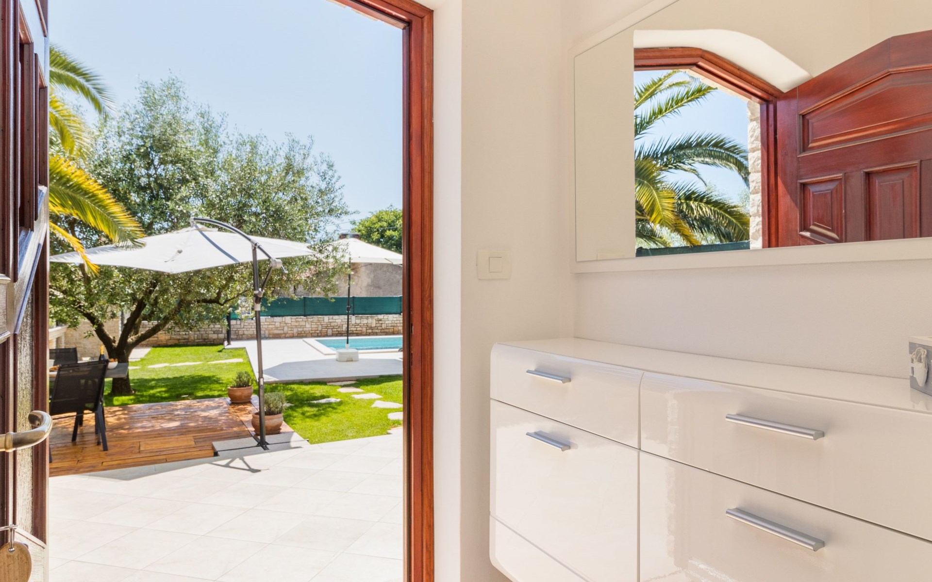 From the bedroom on the upper floor, you step out onto the balcony, which overlooks the garden and from which you can enjoy the view of the island of Brijuni and the sea. From the living room you can access the terrace, which is furnished with a table and chairs and a barbecue for al fresco dining. Adjacent to this is the large garden, where you will find the approx. 3.5 x 7 metre pool with a depth of approx. 1.3 metres. On the enclosed plot in front of the house there is another terrace, as well as the two parking spaces, which are for your private use. 1-3 pets are allowed on request.