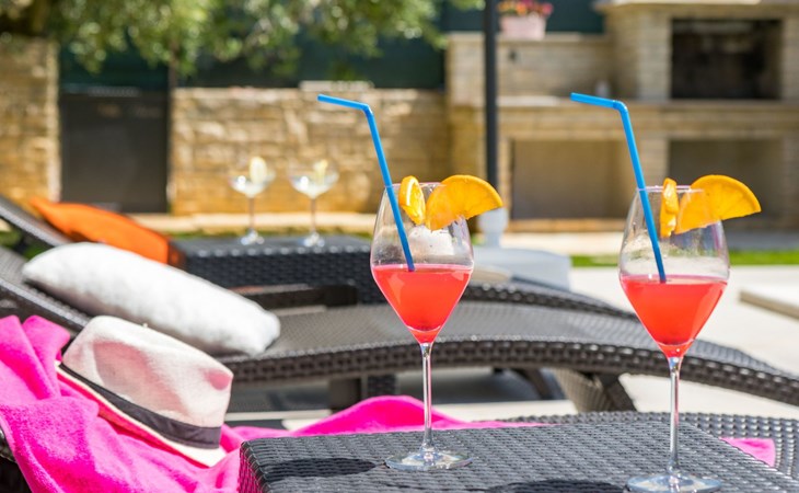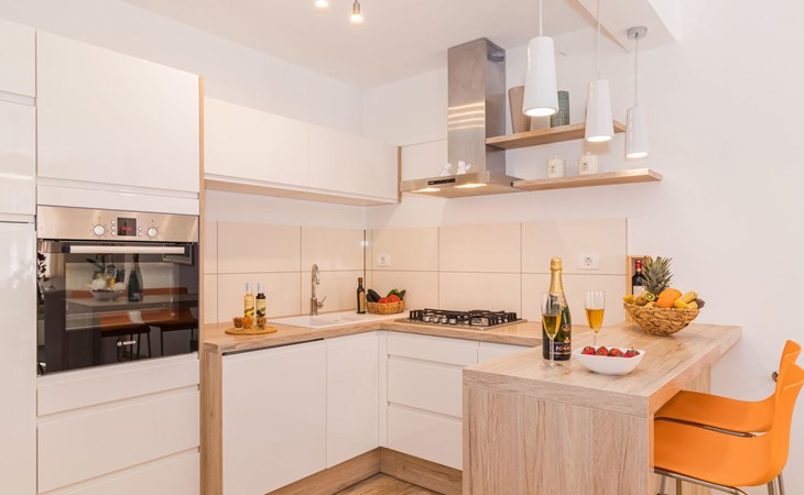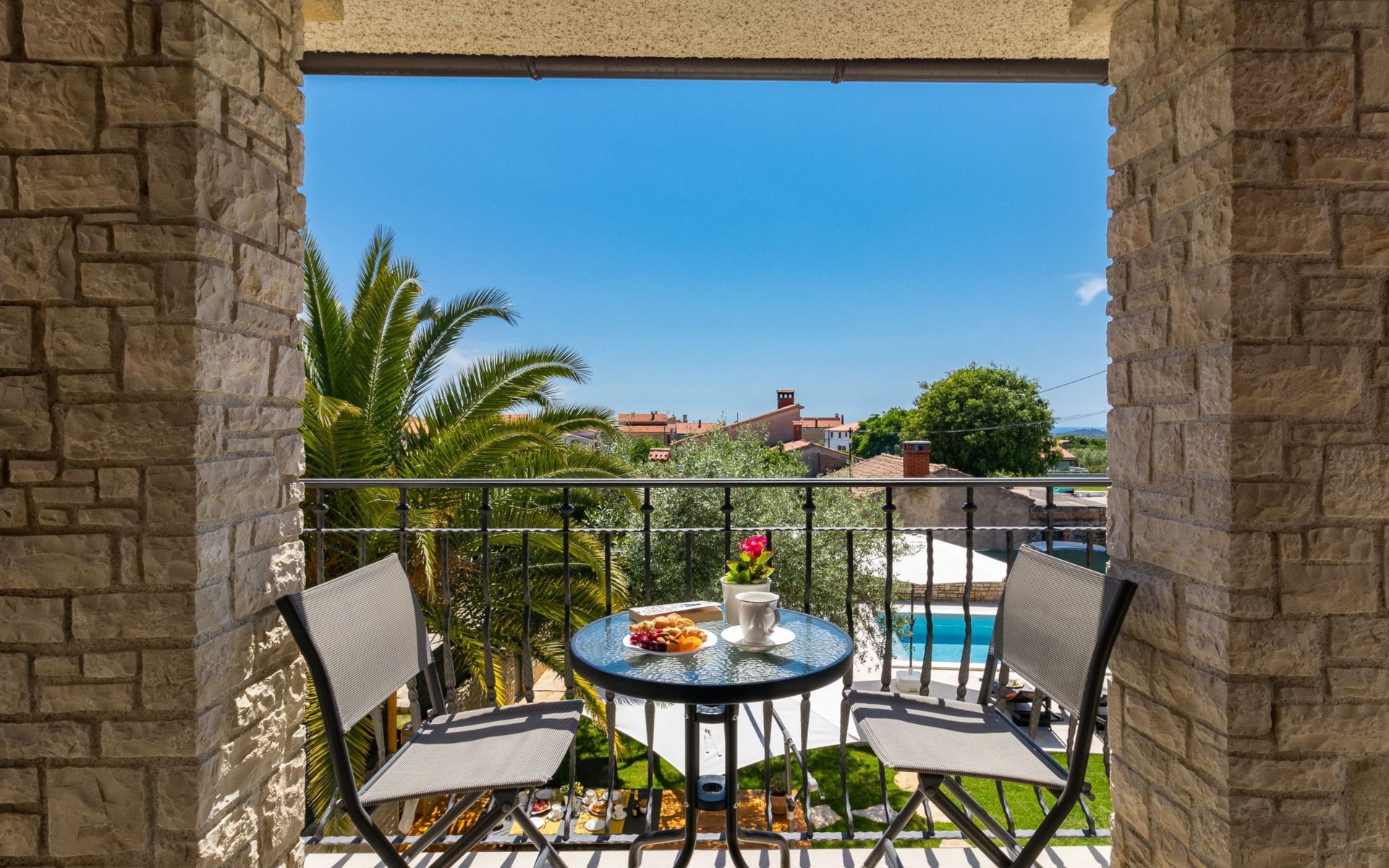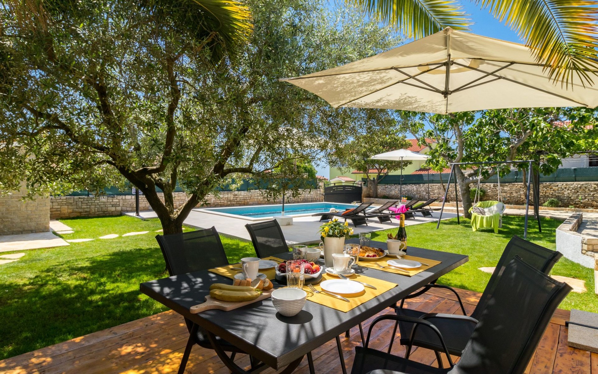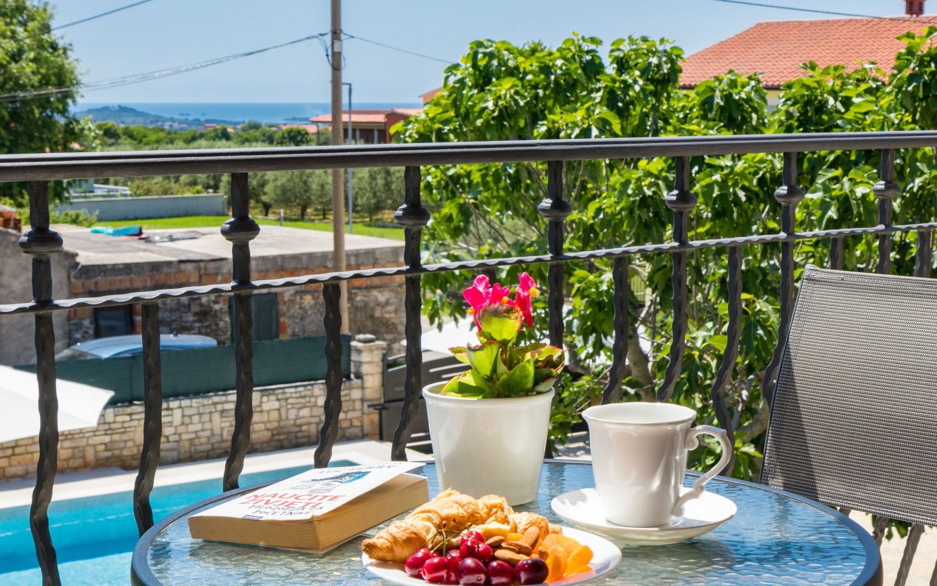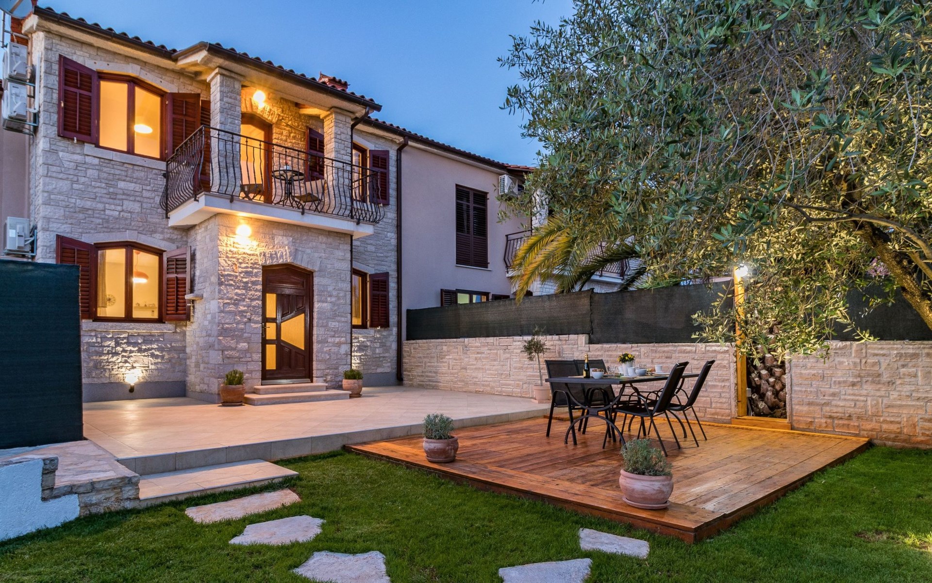 From the bedroom on the upper floor, you step out onto the balcony, which overlooks the garden and from which you can enjoy the view of the island of Brijuni and the sea. From the living room you can access the terrace, which is furnished with a table and chairs and a barbecue for al fresco dining. Adjacent to this is the large garden, where you will find the approx. 3.5 x 7 metre pool with a depth of approx. 1.3 metres. On the enclosed plot in front of the house there is another terrace, as well as the two parking spaces, which are for your private use. 1-3 pets are allowed on request.