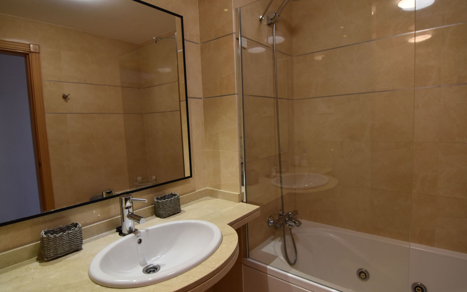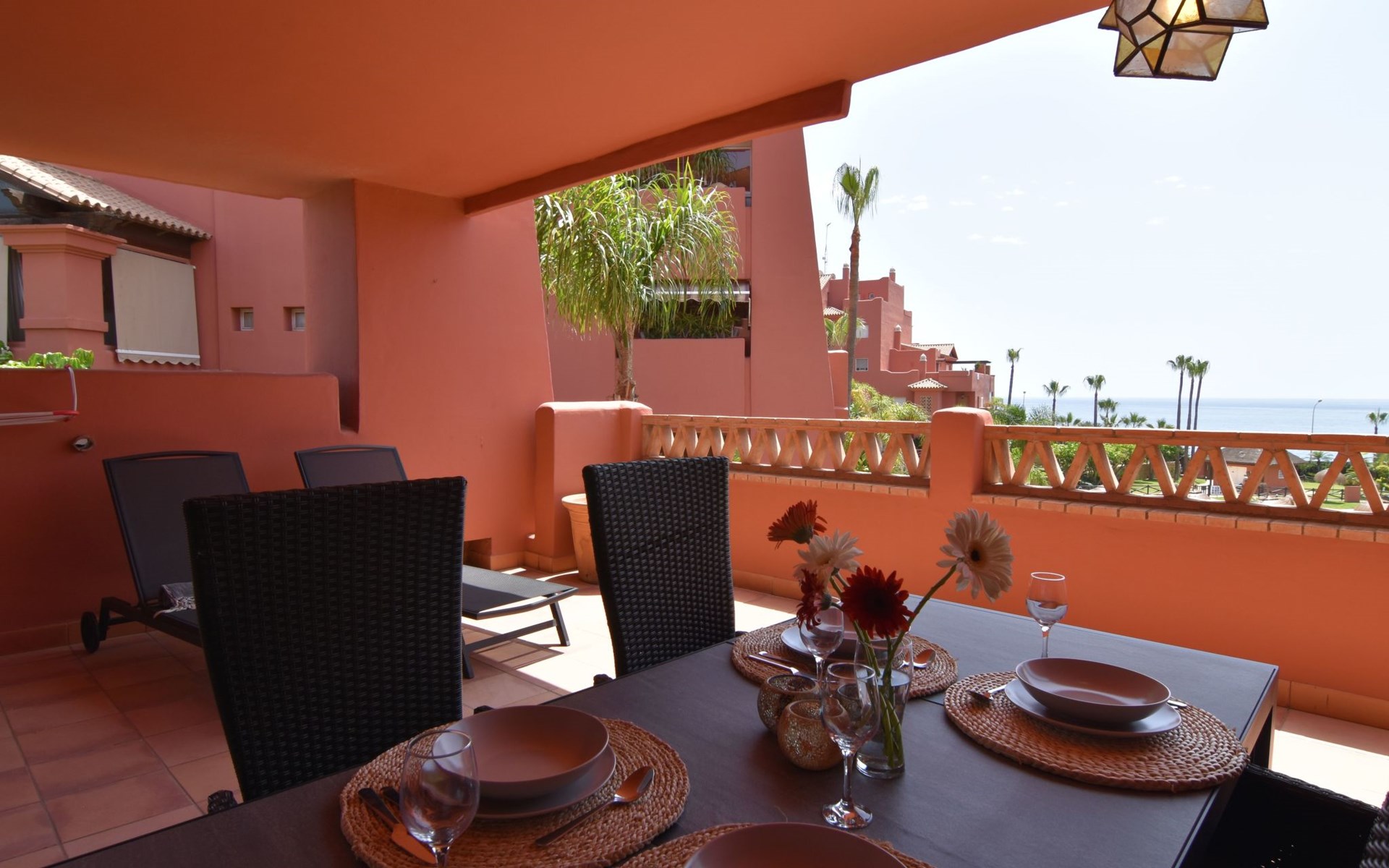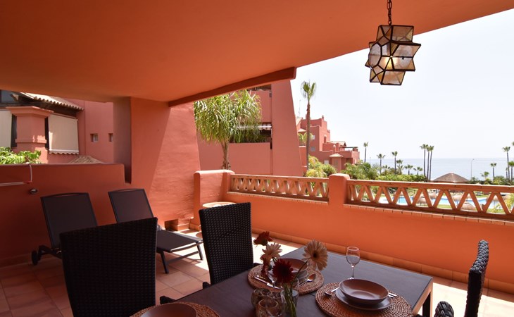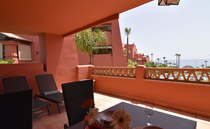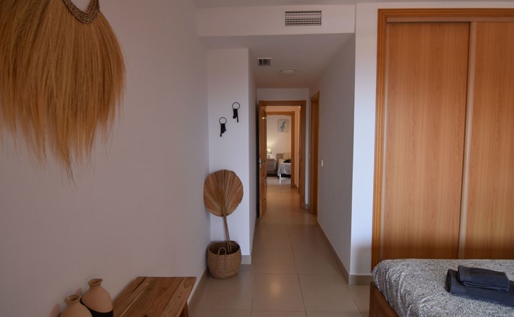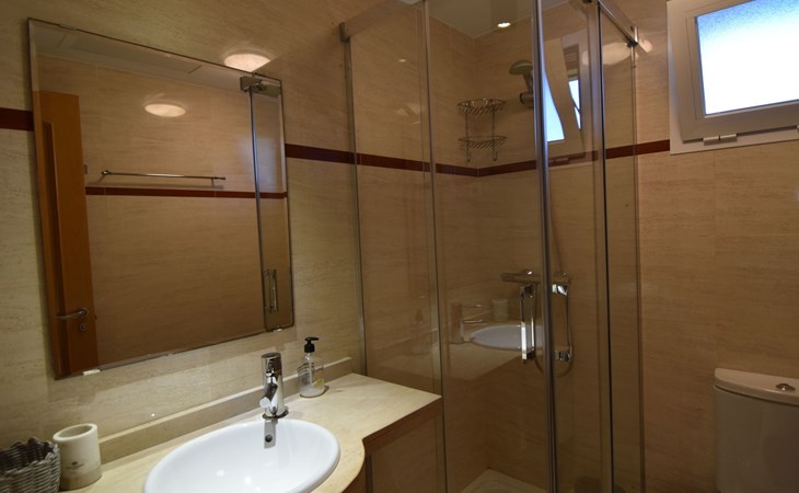 The apartment is located on the first floor with a lift and offers accommodation for up to 4 people. Upon entering to our left is a separate fully-equipped kitchen, with dishwasher, oven, electric stove, Dolce Gusto coffee maker and much more. An outside laundry corner with a washing machine is located here as well. The living room/dining room has plenty of room, and offers dining table, large Smart TV, comfortable sofa, and free Wifi. Through a double glazed large window is an access to a spacious covered terrace with two sun loungers and outside table to fully enjoy the outside space and the amazing sea views. The apartment comprises two double bedrooms each with two beds pushed together creating a king size bed for more comfort. One of the bedrooms has an en-suite bathroom with a hydro massage bath tub with a combination of a shower and bide. This south-east-facing bedroom has built in wardrobes and enjoys an access to the same large terrace as the living room. The second bedroom is north-east-facing and also has built-in wardrobe and a side terrace. Another separate bathroom with a walk-in shower. A rare feature is a central heating / cooling system throughout, clean and quiet. The rooms and living room also have modern style, electric ceiling fans.