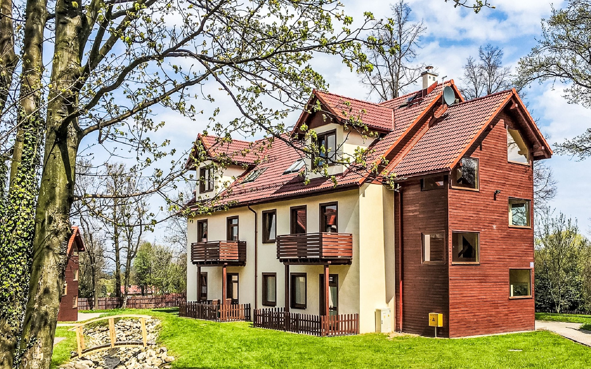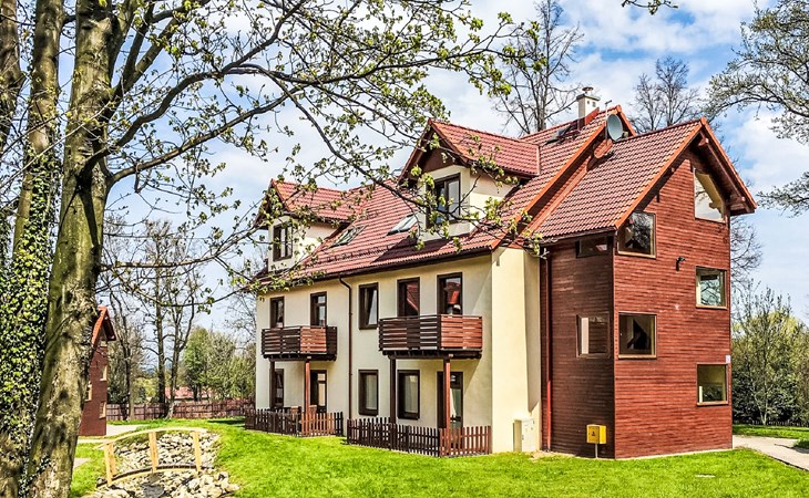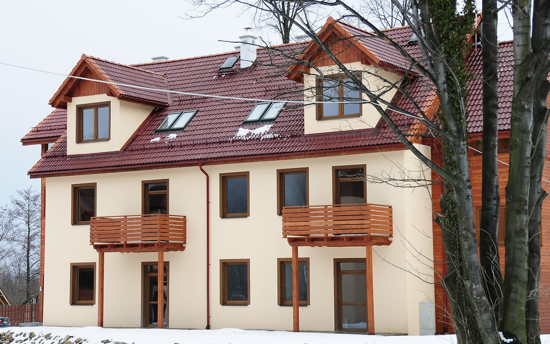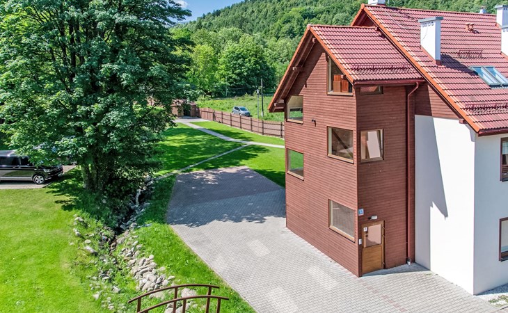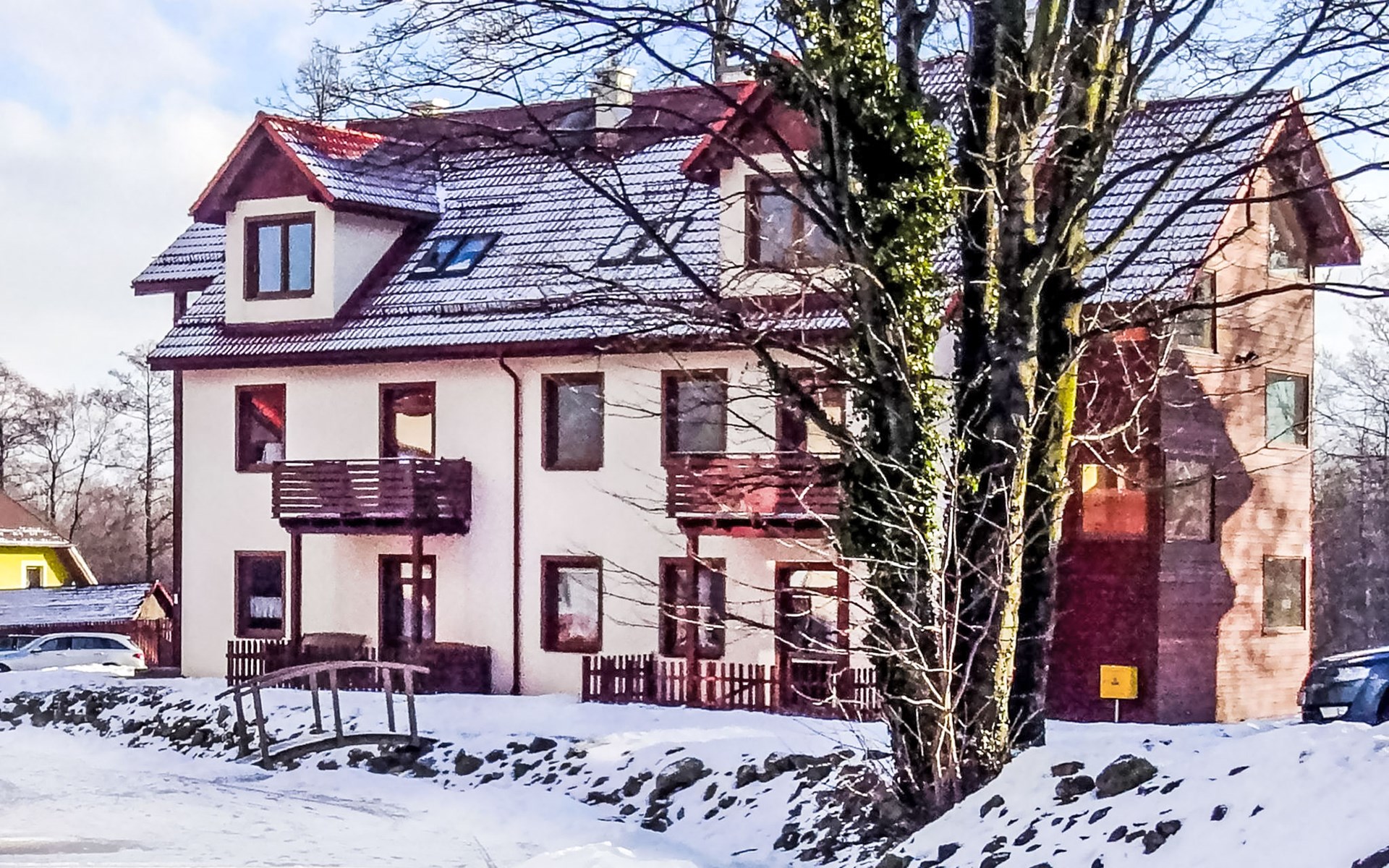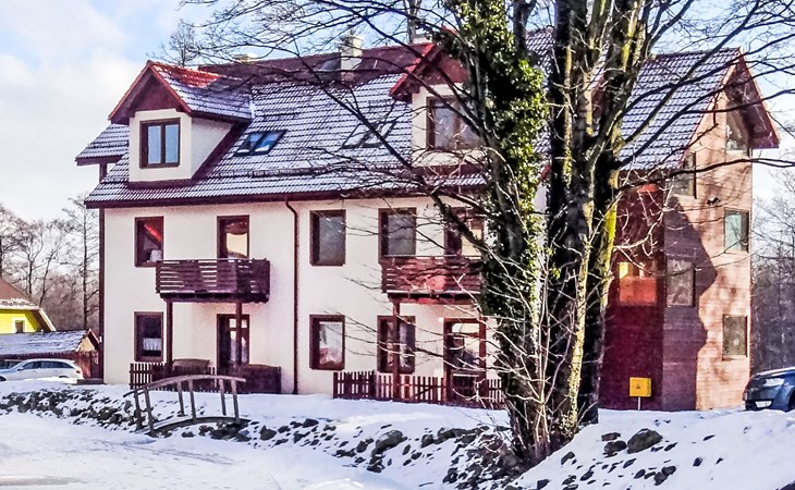 Modern apartment block "Nad Łomniczką", 480 m a.s.l., 3 storeys, built in 2009, surrounded by trees. In the resort, 1 km from the centre, in a quiet, sunny position in the residential district, 3 km from the skiing area, 500 m from the stream, located by a road, in the countryside. For shared use: property 9'000 m2 (fenced). Barbecue house. In the house: central heating system. Parking at the house on the premises. Supermarket 200 m, restaurant 800 m, bus stop 100 m, indoor swimming pool 2 km. Tennis 3 km, walking paths from the house 500 m, ski lift 3 km, ski rental 3 km, ski school 3 km, sled run 2 km, ice rink 2 km. Please note: suitable for families. The complex has night security. Numerous castles in the area.