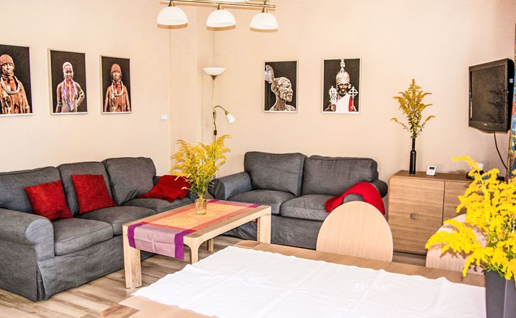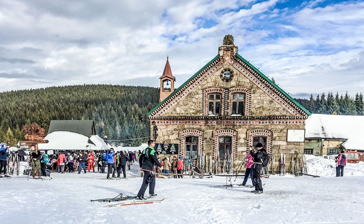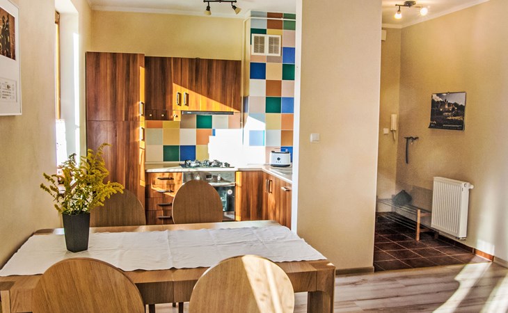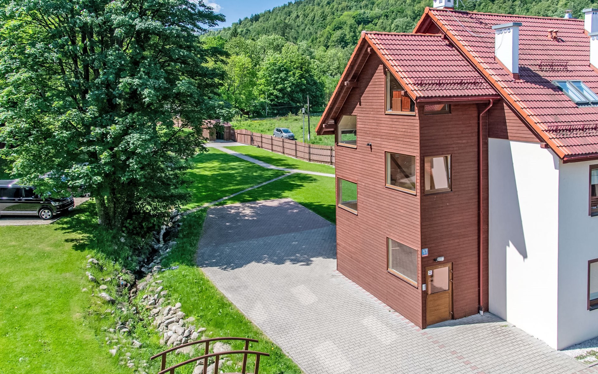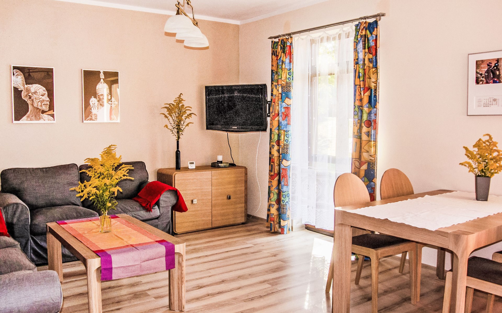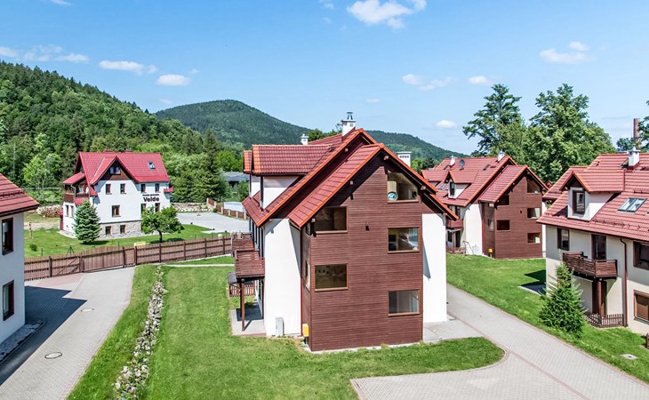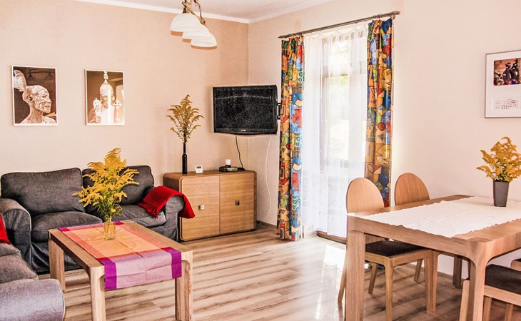Modern apartment block "Nad Łomniczką", 480 m a.s.l., 3 storeys, built in 2009, surrounded by trees. In the resort, 1 km from the centre, in a quiet, sunny position in the residential district, 3 km from the skiing area, 500 m from the stream, located by a road, in the countryside. For shared use: property 9'000 m2 (fenced). Barbecue house. In the house: central heating system. Parking at the house on the premises. Supermarket 200 m, restaurant 800 m, bus stop 100 m, indoor swimming pool 2 km. Tennis 3 km, walking paths from the house 500 m, ski lift 3 km, ski rental 3 km, ski school 3 km, sled run 2 km, ice rink 2 km. Please note: suitable for families. The complex has night security. Numerous castles in the area.