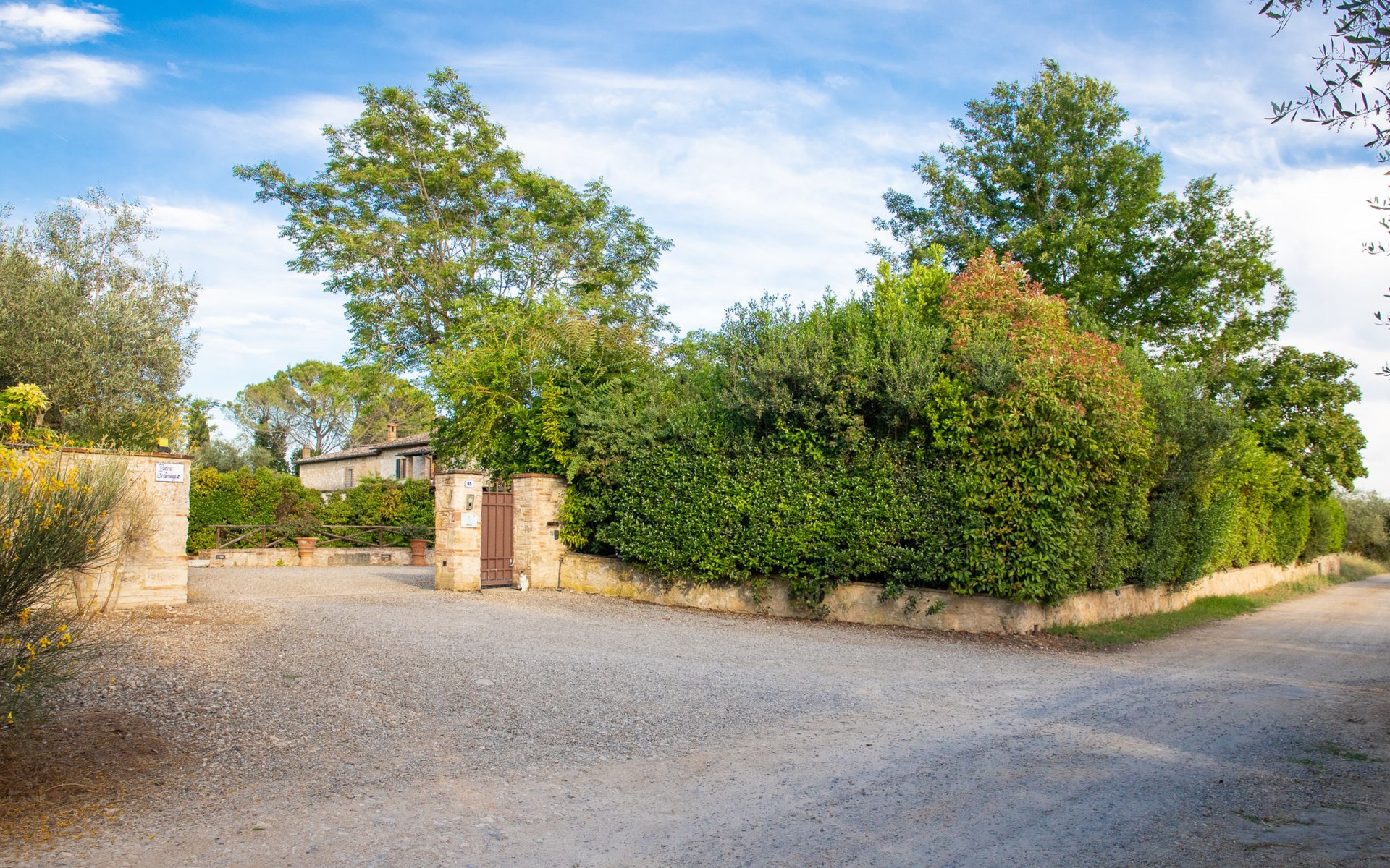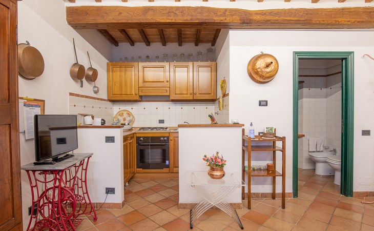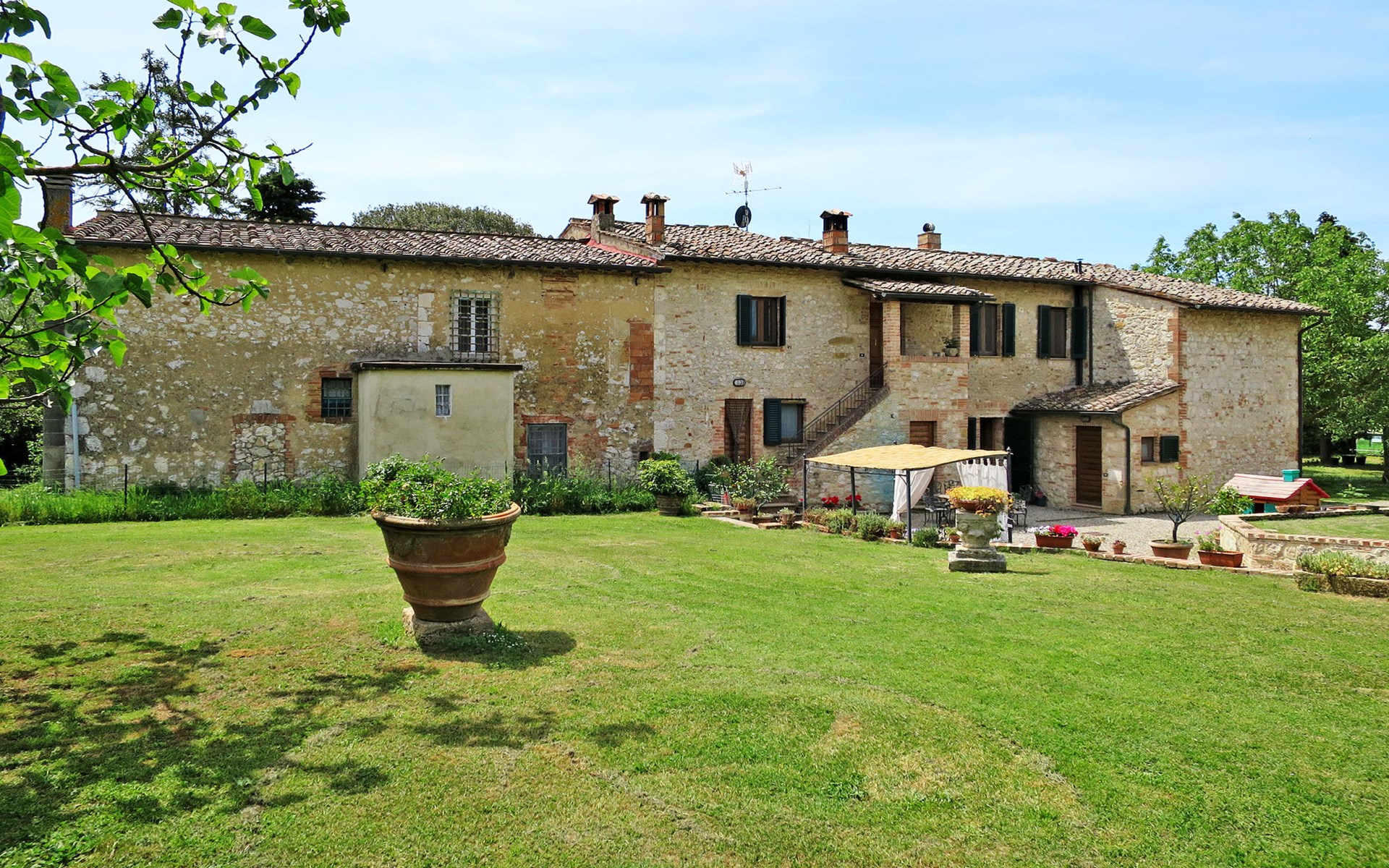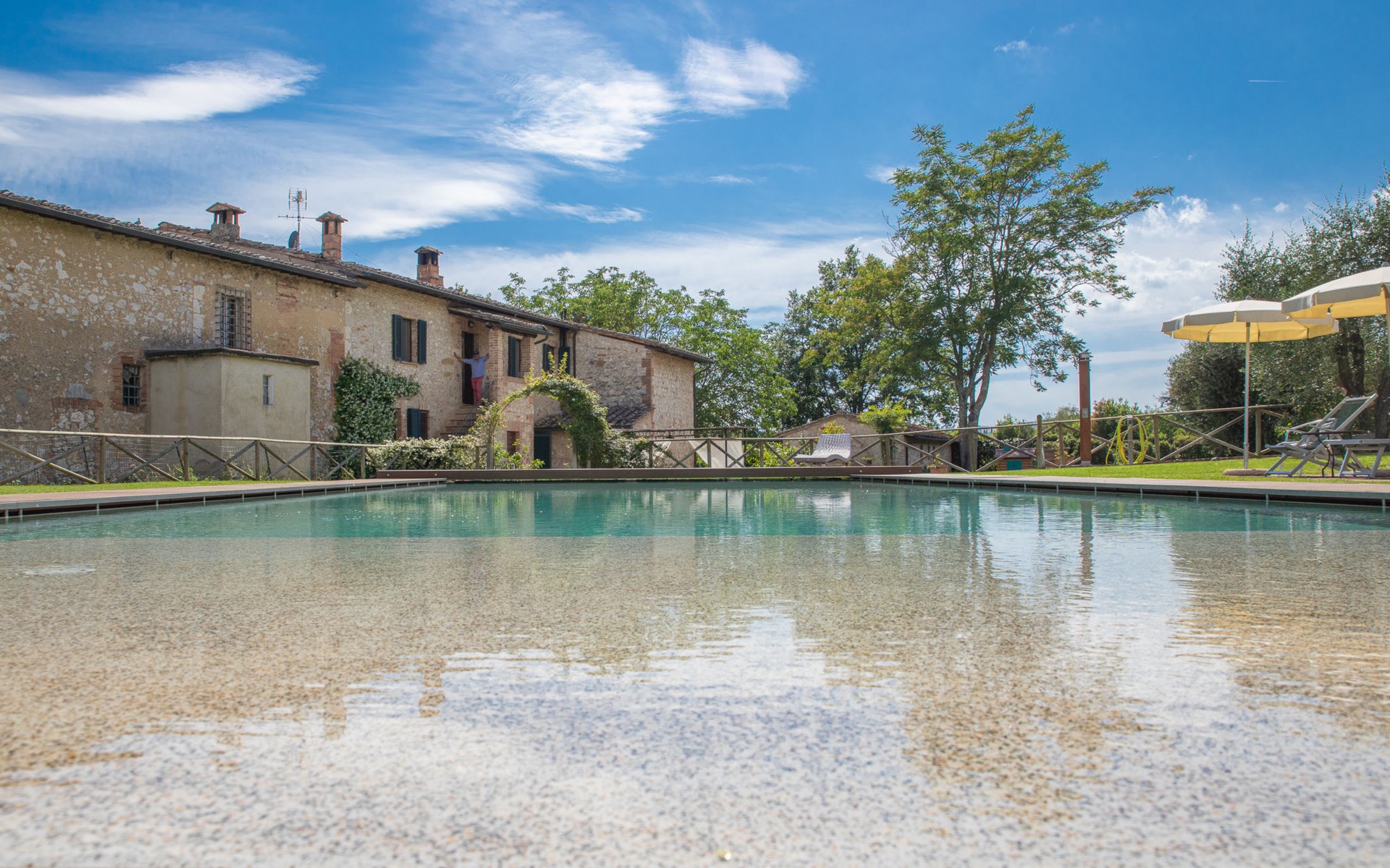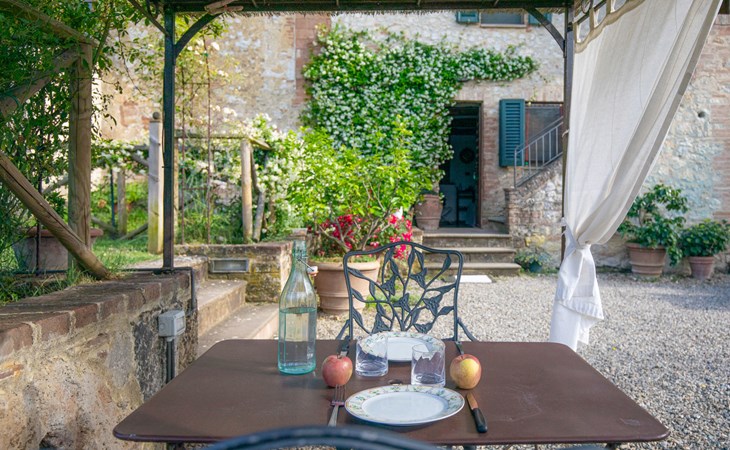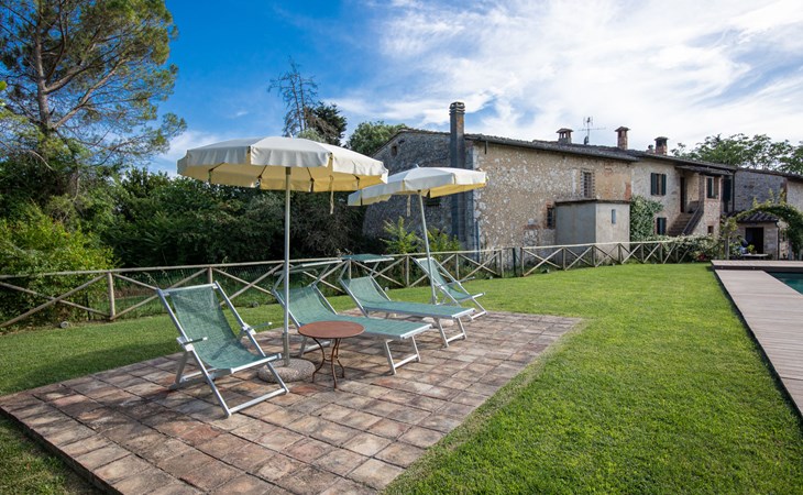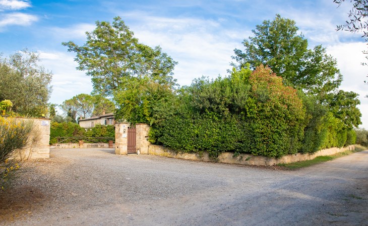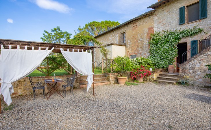 Campiglia 4 km from Colle di Val d'Elsa: Cosy country house "Podere Fontemaggio", surrounded by trees and fields. 2 houses in the residence. 4 apartments in the residence. In the district of Campiglia (700 m) 4 km from the centre of Colle di Val d'Elsa, 13 km from the centre of San Gimignano, outside the resort, 33 km from the centre of Siena. For shared use: property 3 ha, garden with plants and trees, orchard, swimming pool (16 x 6 m, depth 140 cm, seasonal availability: 25.Apr. - 17.Oct.) with salt-electrolysis pool-cleaning system. Shower/WC in the pool area, outdoor shower, terrace, barbecue. In the house: washing machine, tumble dryer (for shared use). 400 m long motor access (via unmade road). Parking on the premises. Grocery 700 m, supermarket 4 km, restaurant 4 km, bus stop 700 m, railway station "Colle di Val d'Elsa" 4 km, park "Cecina Mare" 60 km, outdoor swimming pool 4 km, indoor swimming pool 4 km. Local sale of farm products. Please note: residence with electric gates. The owner lives on the same property.