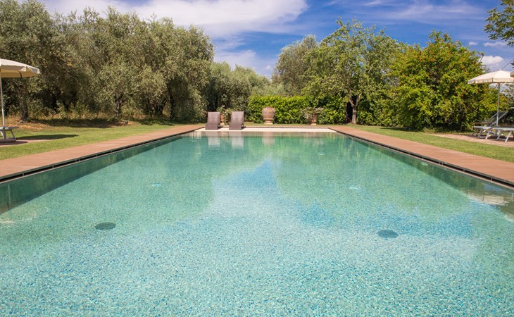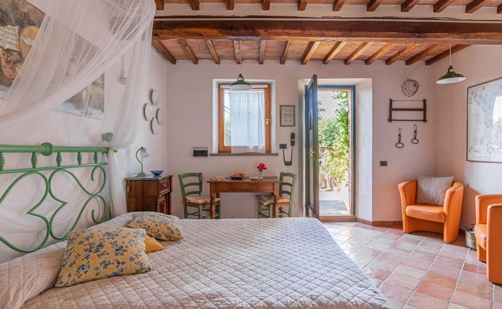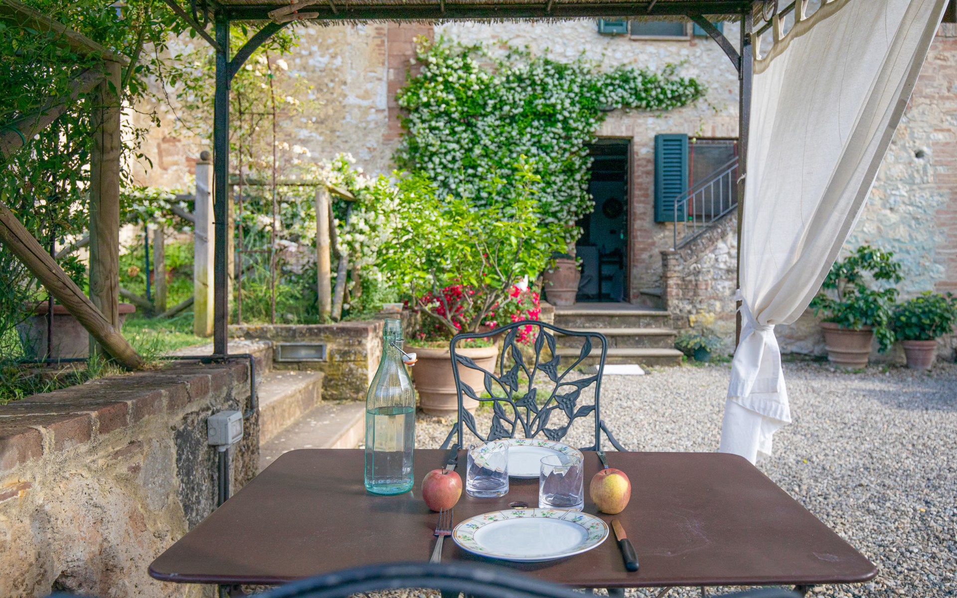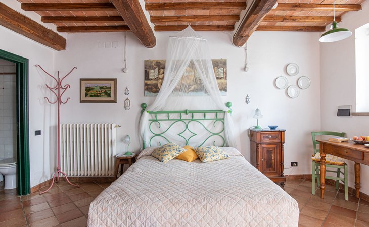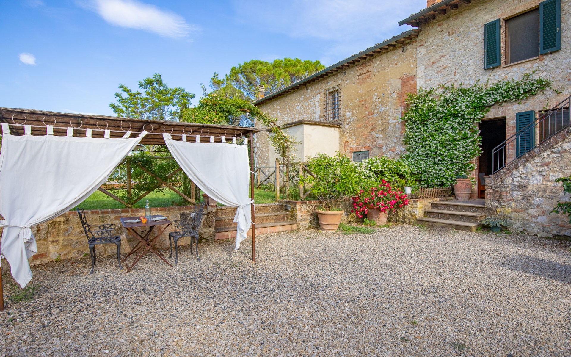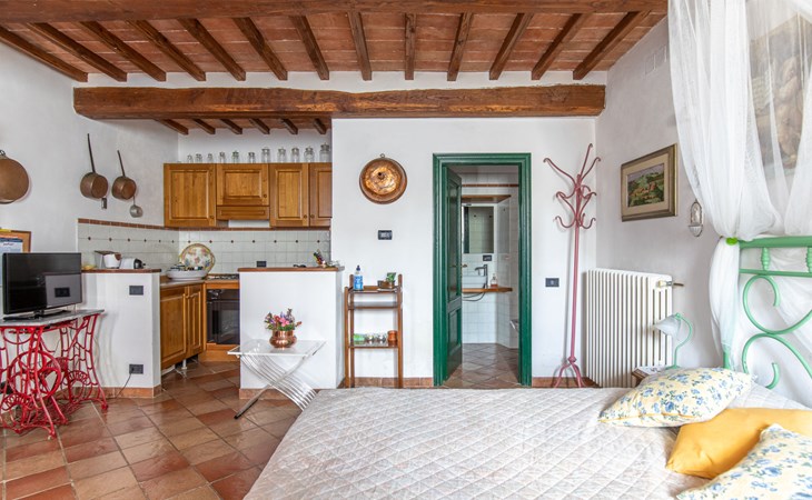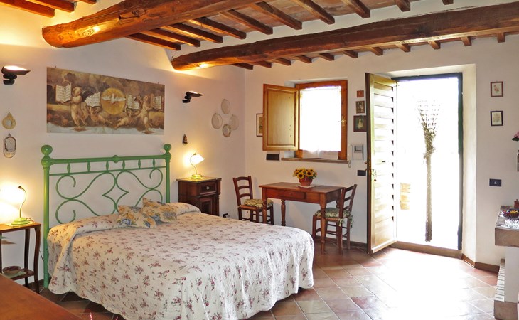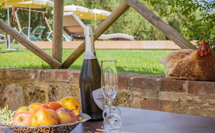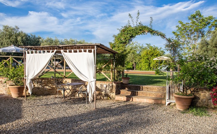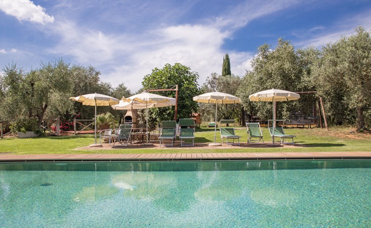 Campiglia 4 km from Colle di Val d'Elsa: Cosy country house "Podere Fontemaggio", surrounded by trees and fields. 2 houses in the residence. 4 apartments in the residence. In the district of Campiglia (700 m) 4 km from the centre of Colle di Val d'Elsa, 13 km from the centre of San Gimignano, outside the resort, 33 km from the centre of Siena. For shared use: property 3 ha, garden with plants and trees, orchard, swimming pool (16 x 6 m, depth 140 cm, seasonal availability: 25.Apr. - 17.Oct.) with salt-electrolysis pool-cleaning system. Shower/WC in the pool area, outdoor shower, terrace, barbecue. In the house: washing machine, tumble dryer (for shared use). 400 m long motor access (via unmade road). Parking on the premises. Grocery 700 m, supermarket 4 km, restaurant 4 km, bus stop 700 m, railway station "Colle di Val d'Elsa" 4 km, park "Cecina Mare" 60 km, outdoor swimming pool 4 km, indoor swimming pool 4 km. Local sale of farm products. Please note: residence with electric gates. The owner lives on the same property.
