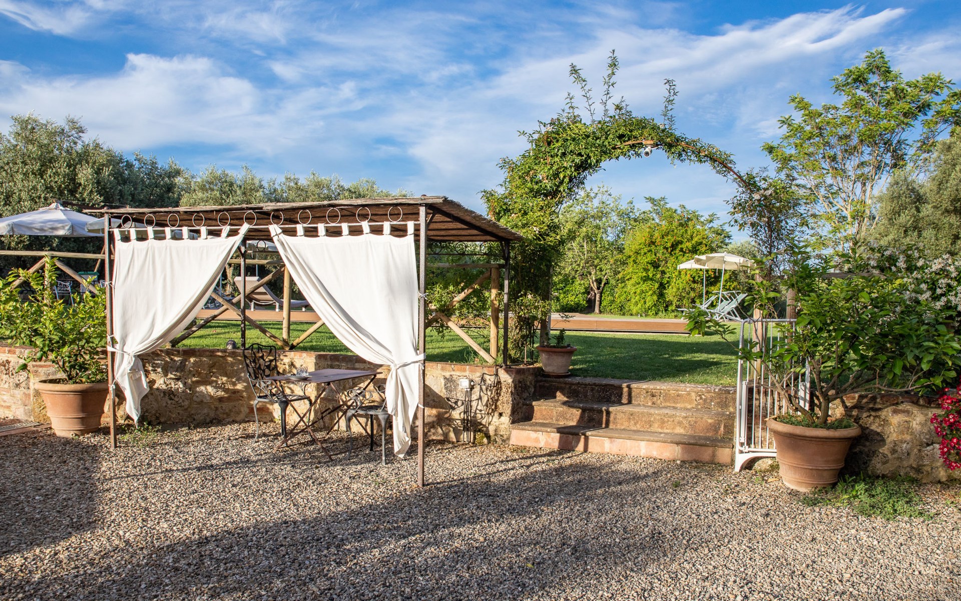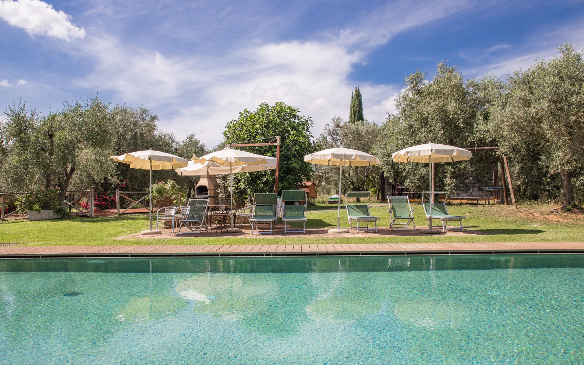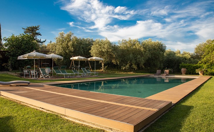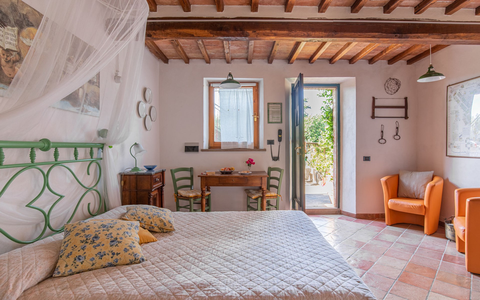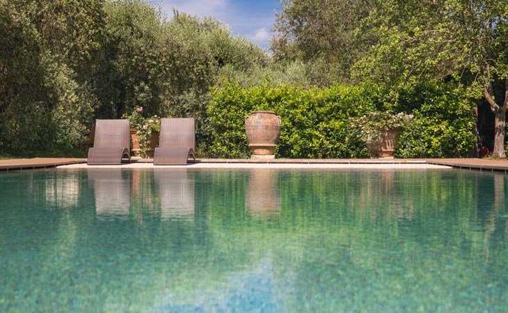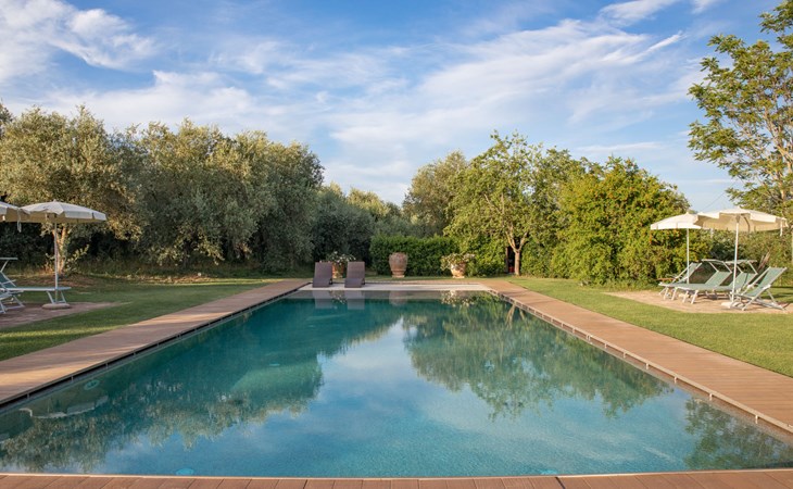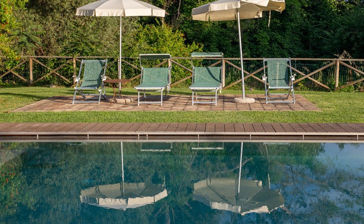 Campiglia 4 km from Colle di Val d'Elsa: Cosy country house "Podere Fontemaggio", surrounded by trees and fields. 2 houses in the residence. 4 apartments in the residence. In the district of Campiglia (700 m) 4 km from the centre of Colle di Val d'Elsa, 13 km from the centre of San Gimignano, outside the resort, 33 km from the centre of Siena. For shared use: property 3 ha, garden with plants and trees, orchard, swimming pool (16 x 6 m, depth 140 cm, seasonal availability: 25.Apr. - 17.Oct.) with salt-electrolysis pool-cleaning system. Shower/WC in the pool area, outdoor shower, terrace, barbecue. In the house: washing machine, tumble dryer (for shared use). 400 m long motor access (via unmade road). Parking on the premises. Grocery 700 m, supermarket 4 km, restaurant 4 km, bus stop 700 m, railway station "Colle di Val d'Elsa" 4 km, park "Cecina Mare" 60 km, outdoor swimming pool 4 km, indoor swimming pool 4 km. Local sale of farm products. Please note: residence with electric gates. The owner lives on the same property.
