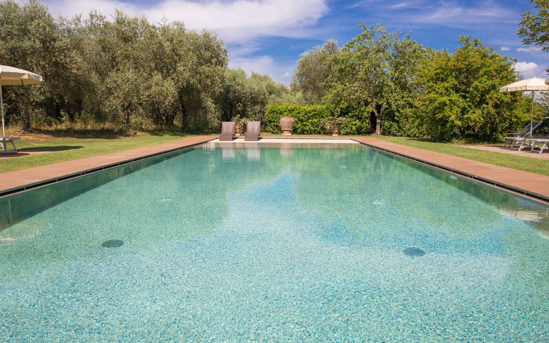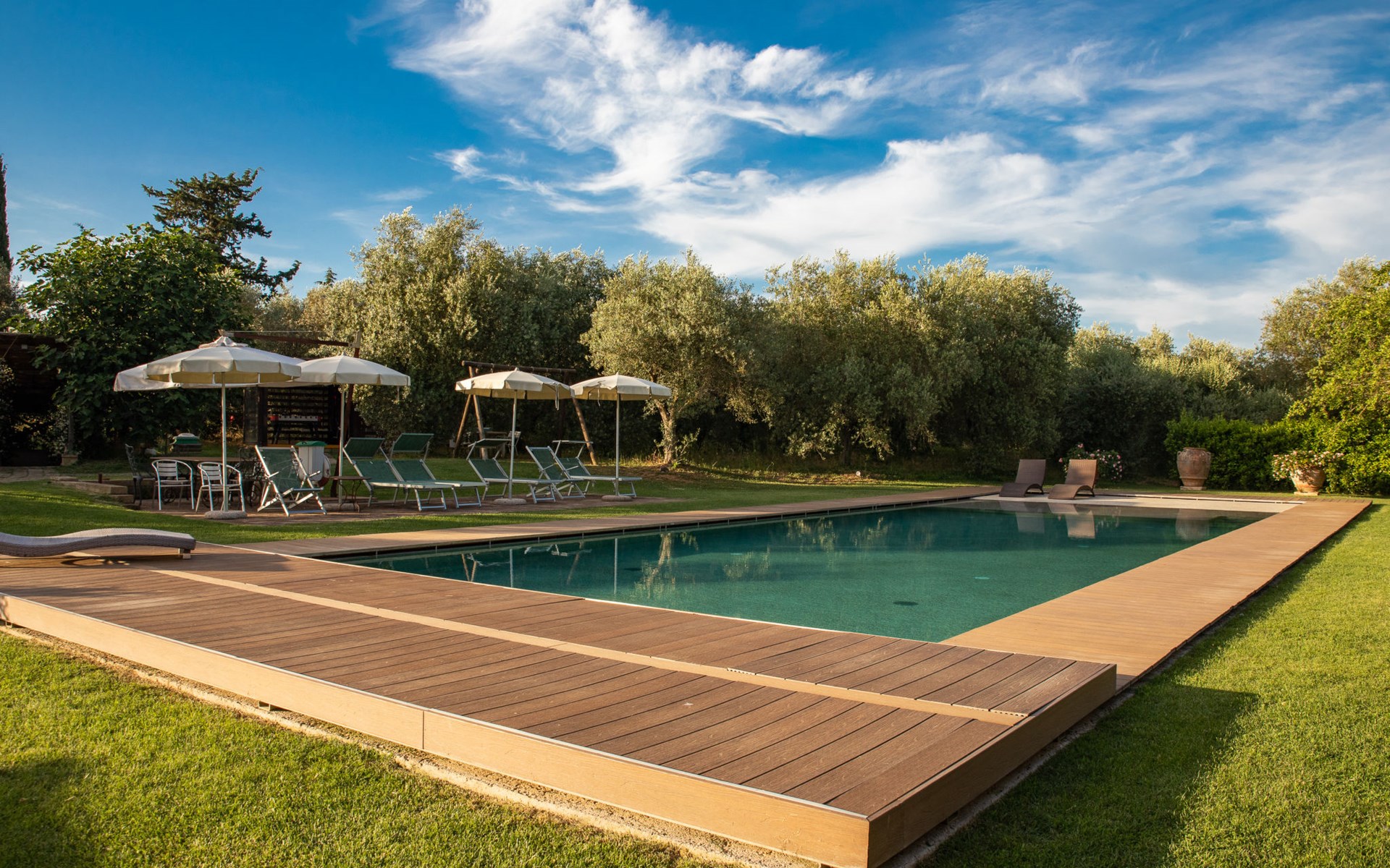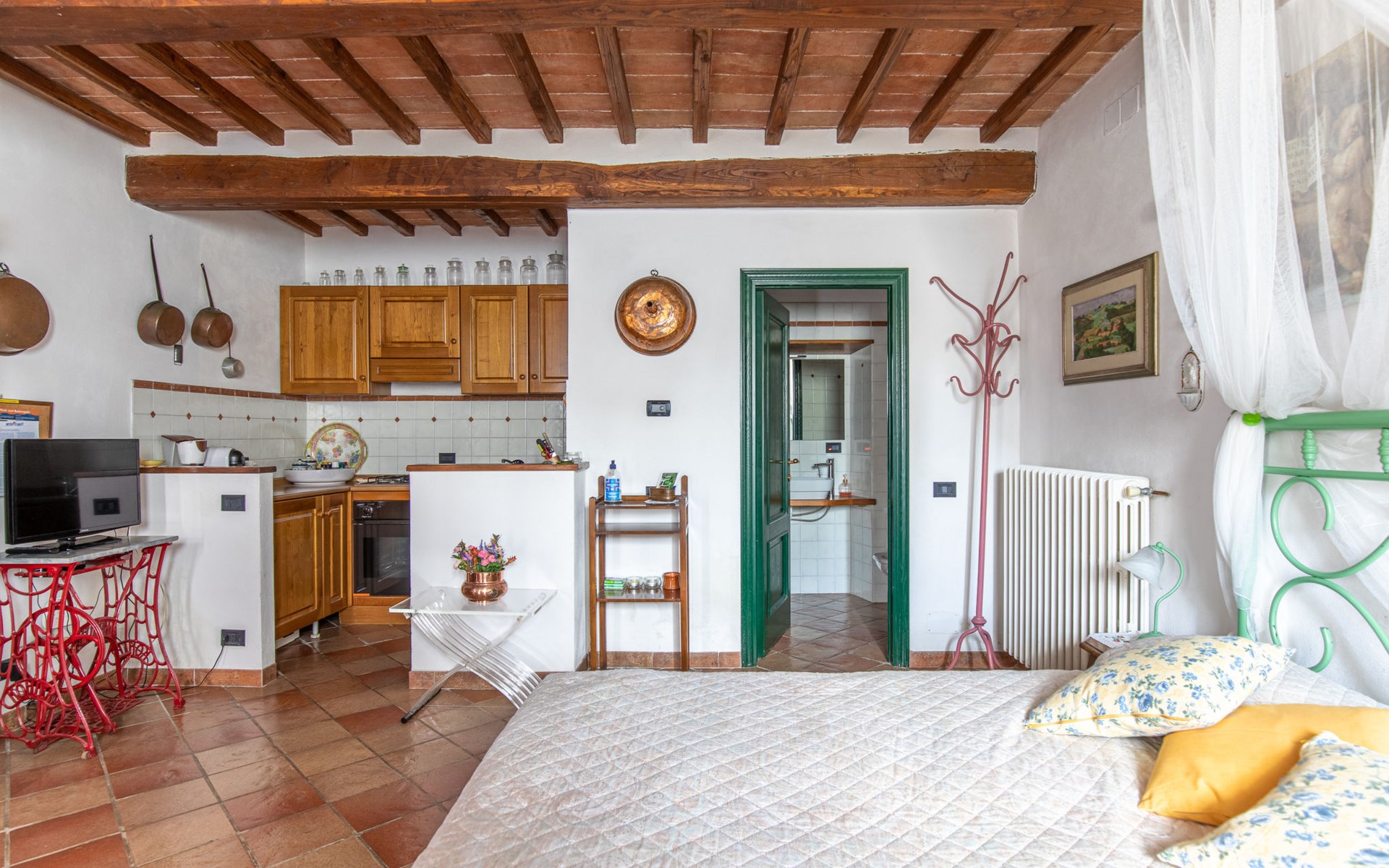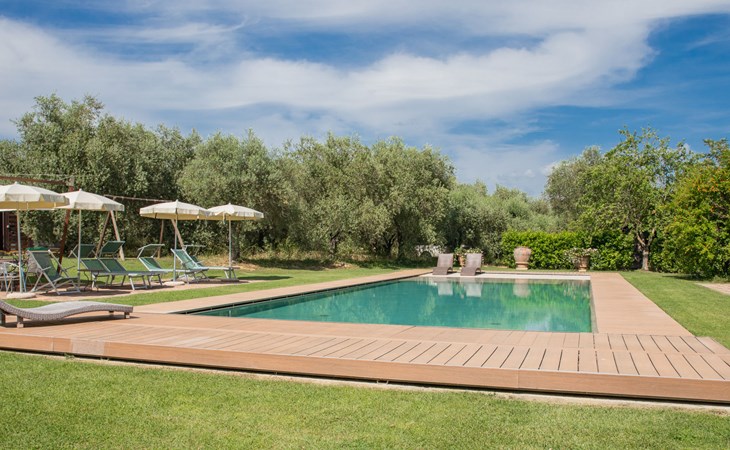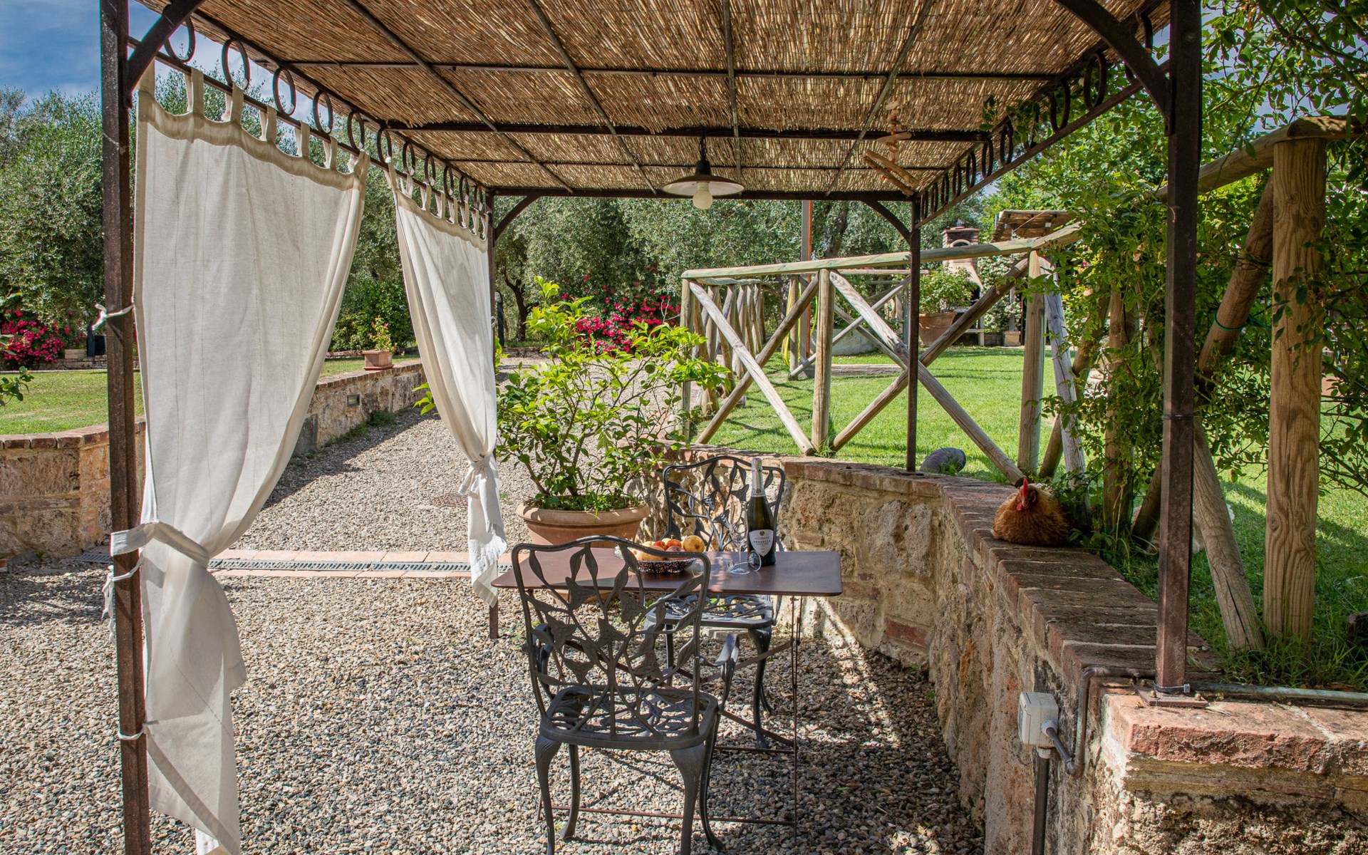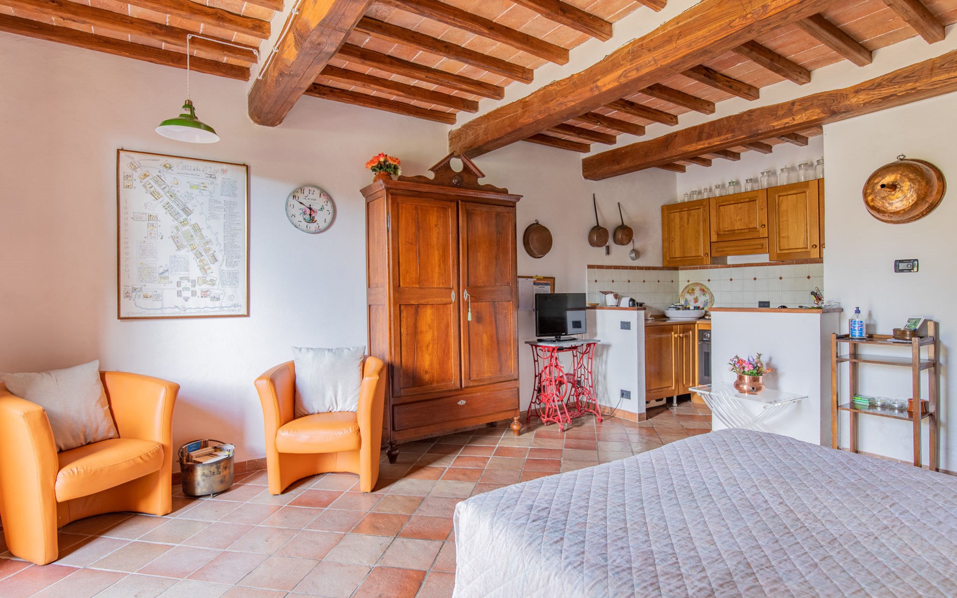 Campiglia 4 km from Colle di Val d'Elsa: Cosy country house "Podere Fontemaggio", surrounded by trees and fields. 2 houses in the residence. 4 apartments in the residence. In the district of Campiglia (700 m) 4 km from the centre of Colle di Val d'Elsa, 13 km from the centre of San Gimignano, outside the resort, 33 km from the centre of Siena. For shared use: property 3 ha, garden with plants and trees, orchard, swimming pool (16 x 6 m, depth 140 cm, seasonal availability: 25.Apr. - 17.Oct.) with salt-electrolysis pool-cleaning system. Shower/WC in the pool area, outdoor shower, terrace, barbecue. In the house: washing machine, tumble dryer (for shared use). 400 m long motor access (via unmade road). Parking on the premises. Grocery 700 m, supermarket 4 km, restaurant 4 km, bus stop 700 m, railway station "Colle di Val d'Elsa" 4 km, park "Cecina Mare" 60 km, outdoor swimming pool 4 km, indoor swimming pool 4 km. Local sale of farm products. Please note: residence with electric gates. The owner lives on the same property.