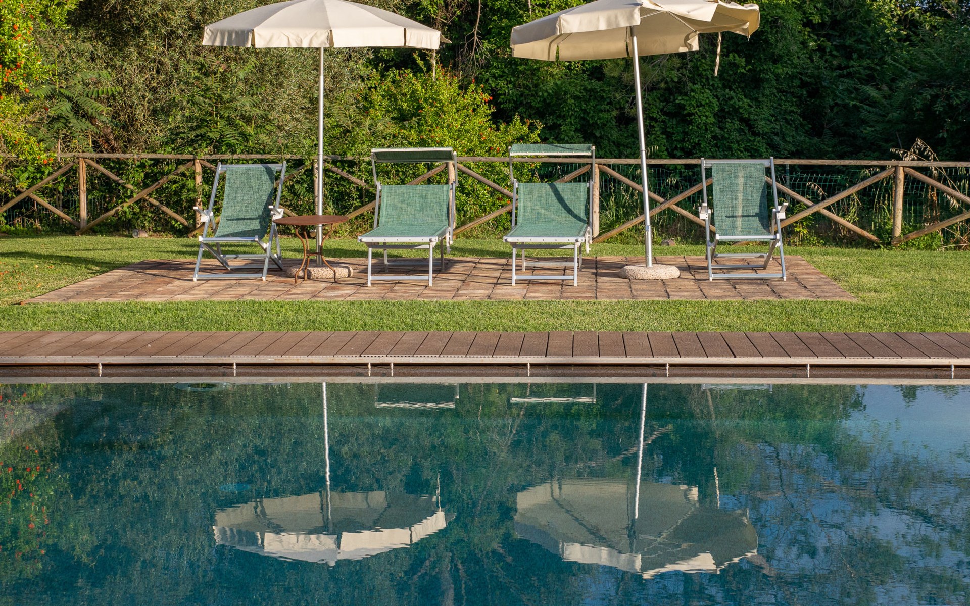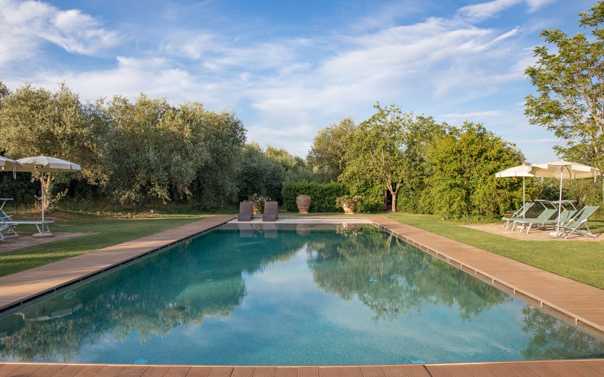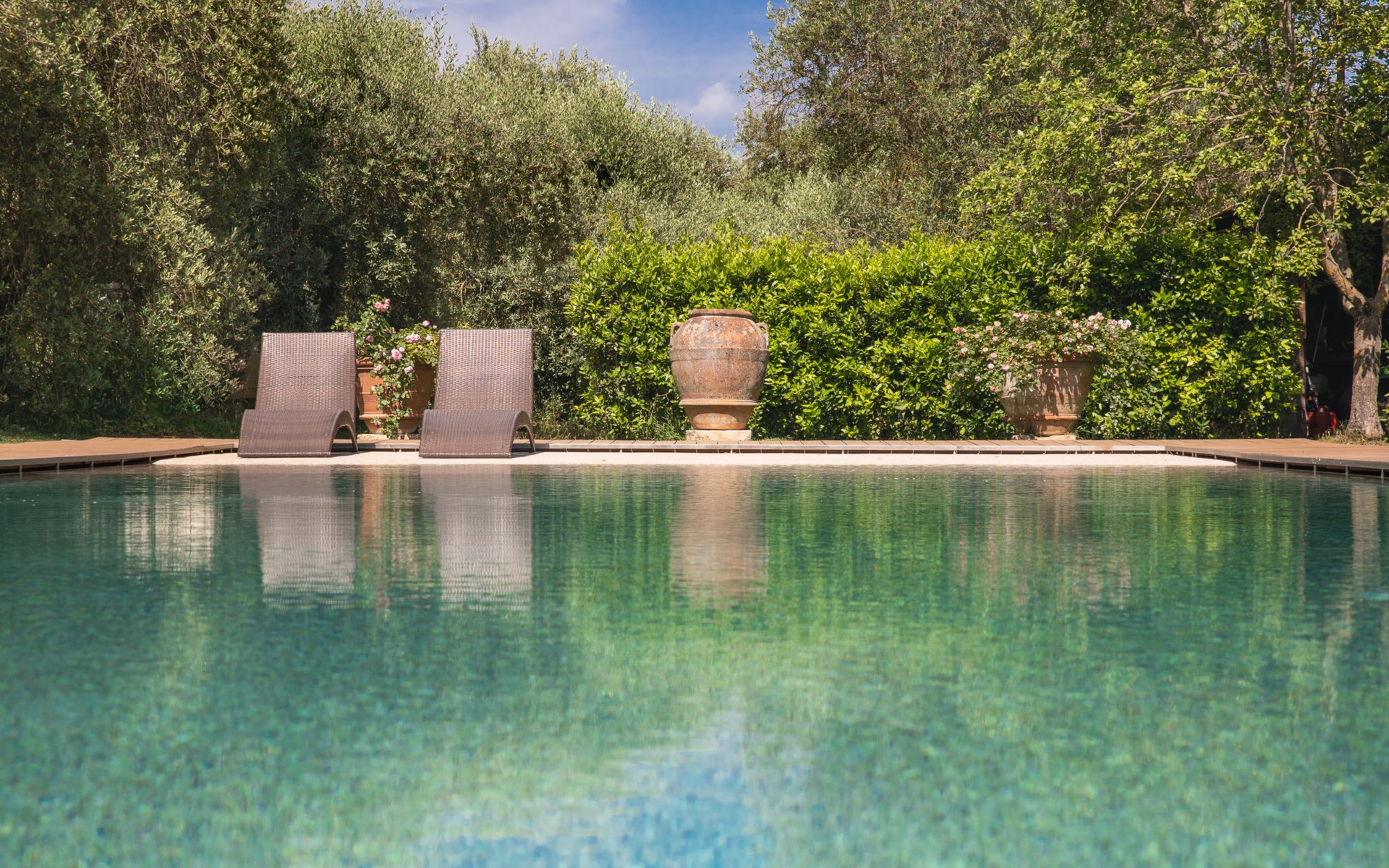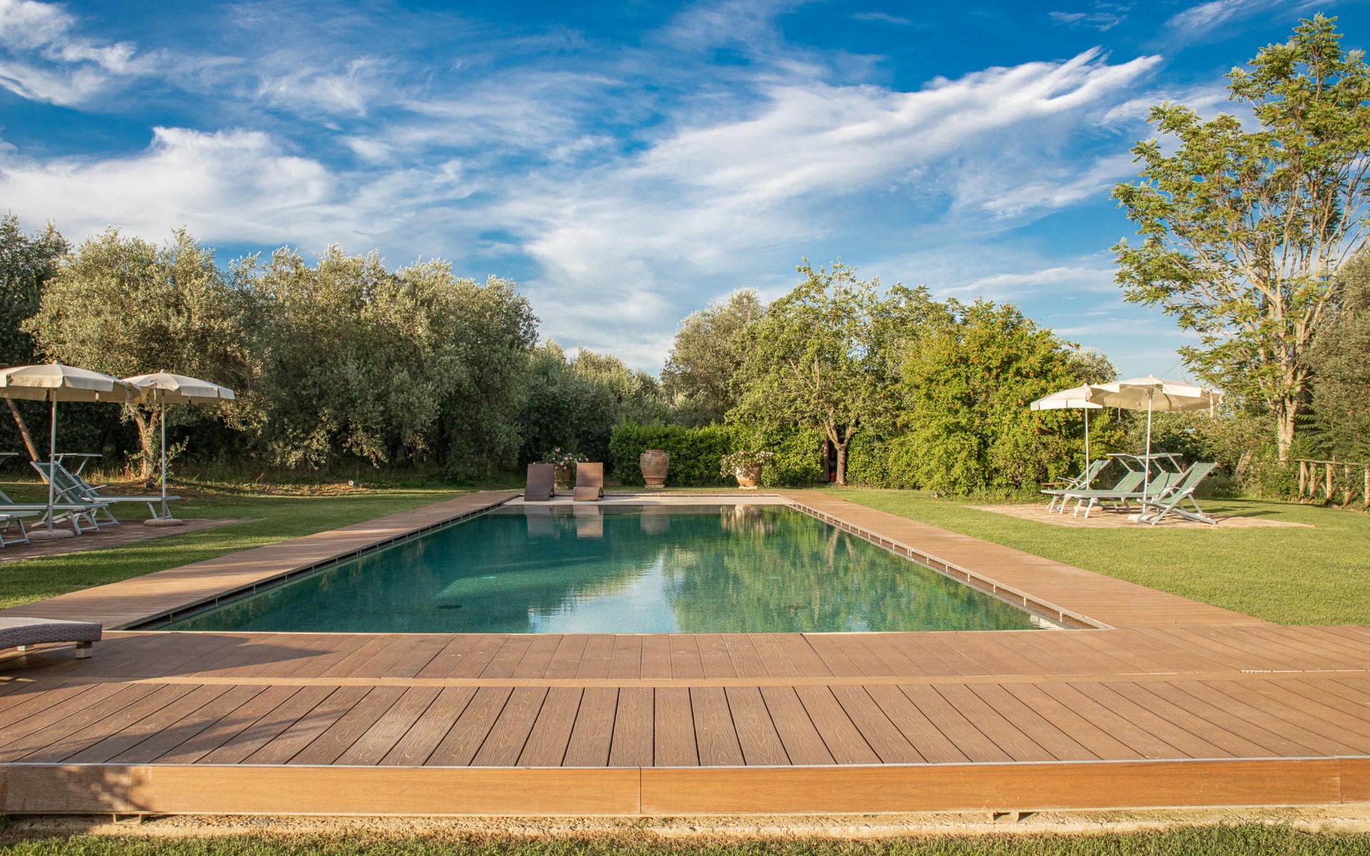 Campiglia 4 km from Colle di Val d'Elsa: Cosy country house "Podere Fontemaggio", surrounded by trees and fields. 2 houses in the residence. 4 apartments in the residence. In the district of Campiglia (700 m) 4 km from the centre of Colle di Val d'Elsa, 13 km from the centre of San Gimignano, outside the resort, 33 km from the centre of Siena. For shared use: property 3 ha, garden with plants and trees, orchard, swimming pool (16 x 6 m, depth 140 cm, seasonal availability: 25.Apr. - 17.Oct.) with salt-electrolysis pool-cleaning system. Shower/WC in the pool area, outdoor shower, terrace, barbecue. In the house: washing machine, tumble dryer (for shared use). 400 m long motor access (via unmade road). Parking on the premises. Grocery 700 m, supermarket 4 km, restaurant 4 km, bus stop 700 m, railway station "Colle di Val d'Elsa" 4 km, park "Cecina Mare" 60 km, outdoor swimming pool 4 km, indoor swimming pool 4 km. Local sale of farm products. Please note: residence with electric gates. The owner lives on the same property.