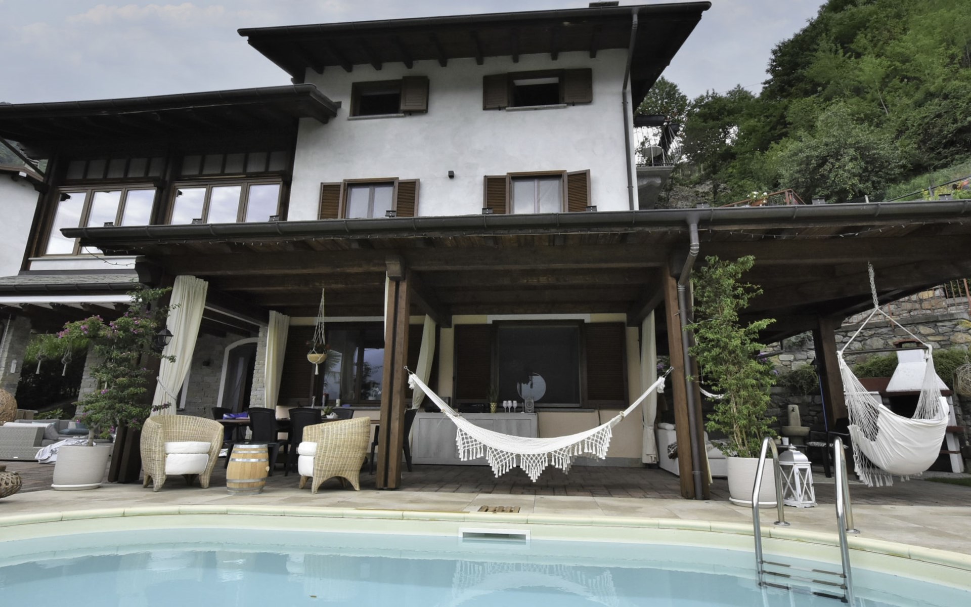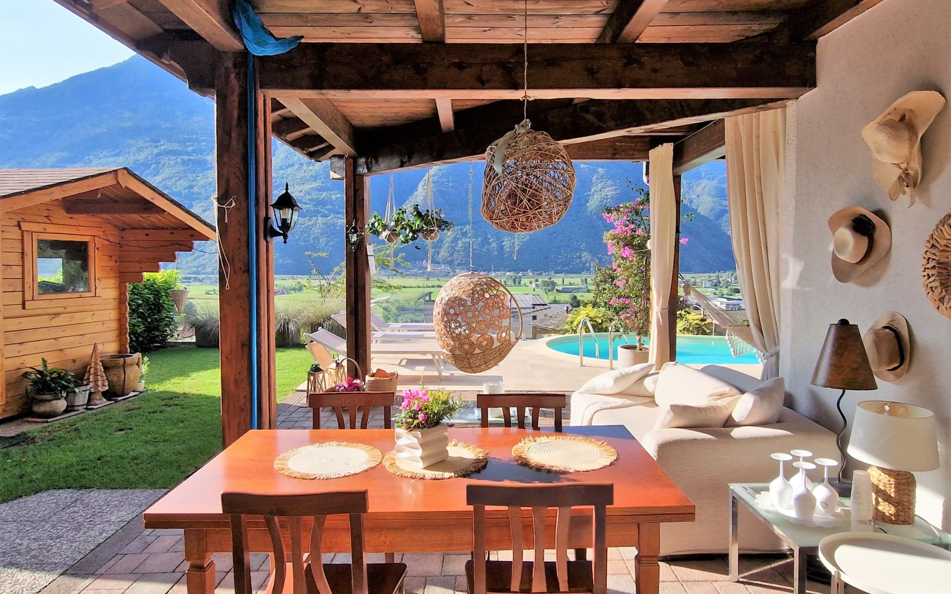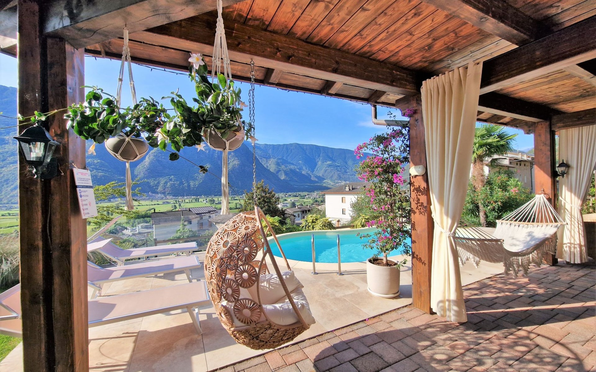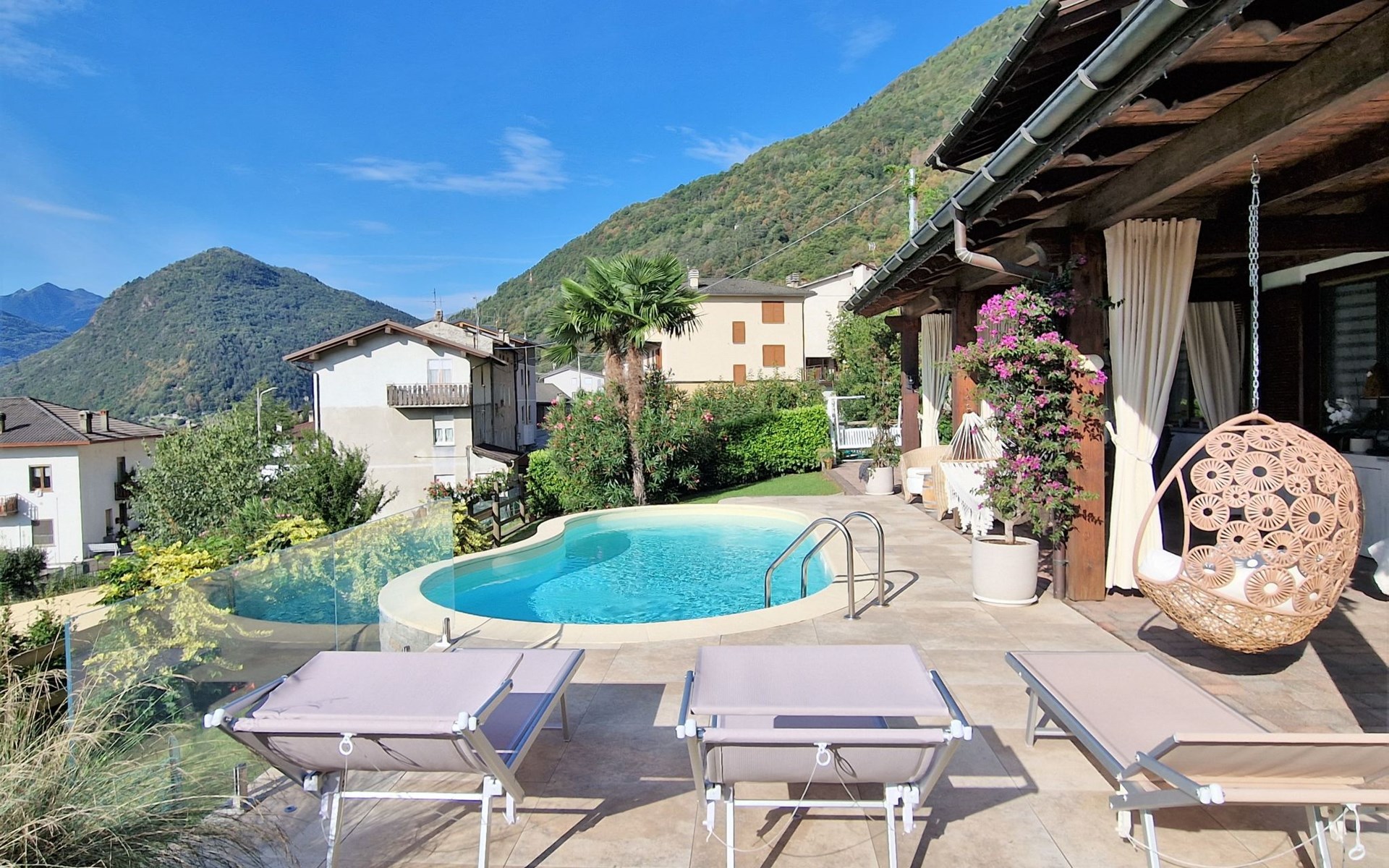 Small, beautiful apartment house "Valley View Pool Apartment", 266 m a.s.l., 3 storeys. 1 km from the centre of Ardenno, in a quiet, sunny position residential area (villas), south facing position. For shared use: large terraced garden (fenced), swimming pool kidney-shaped (depth 135 - 135 cm, seasonal availability: 15.Apr. - 15.Oct.). Terrace, garden furniture, barbecue, pool maintenance by the owner/gardener. In the house: storage room for bicycles, sun terrace, storage room for skis. Parking at the house. Supermarket 1 km, restaurant, bar 100 m, bus stop 700 m, thermal baths "Terme di Bormio" 82 km. Nearby attractions: Morbegno 13 km, Ponte Tibetano Ponte nel Cielo 16 km, Val di Mello 18 km, Fly Emotion (Zipline) 20 km, Sondrio 20 km, Train Bernina Express: Tirano-St Moritz 45 km. Well-known ski regions can easily be reached: Madesimo 66 km, Bormio 82 km. Well-known lakes can easily be reached: Lago di Como 25 km. Hiking paths: Bagni di Masino, Lago San Martino, Lago di Scermendone, Monte Belinghera, Sentiero Valtellina. Please note: car recommended. Residence with electric gates. The owner lives on the same property. The owner has a dog.