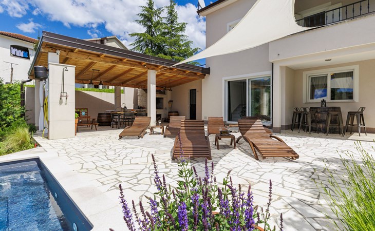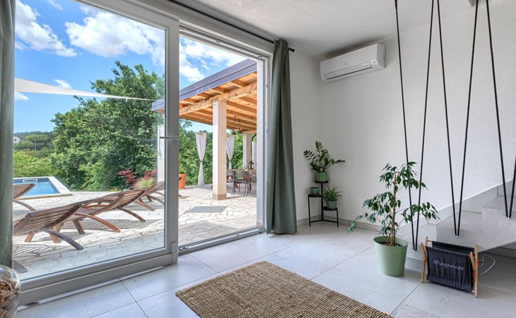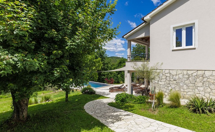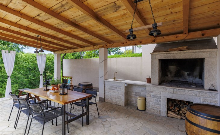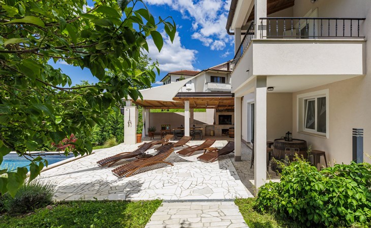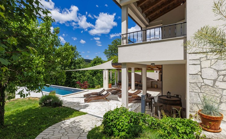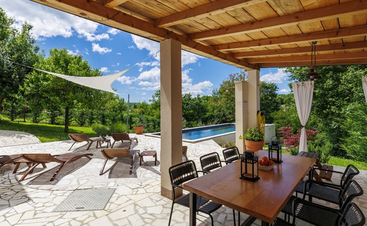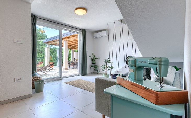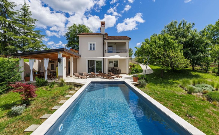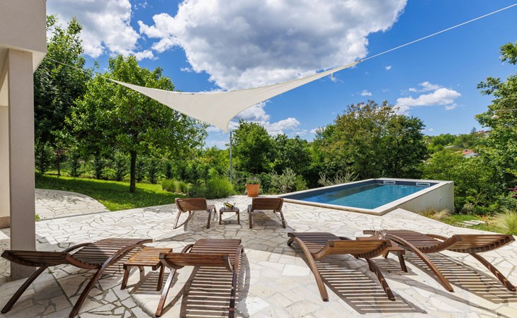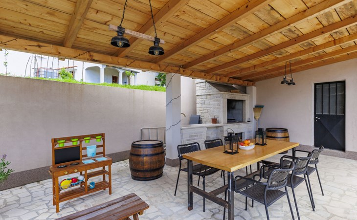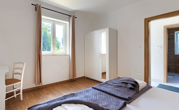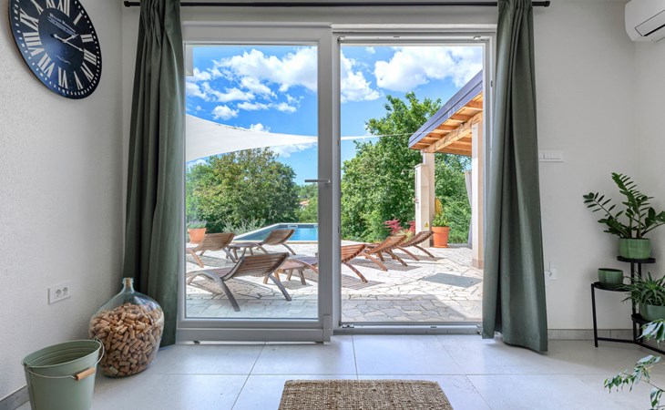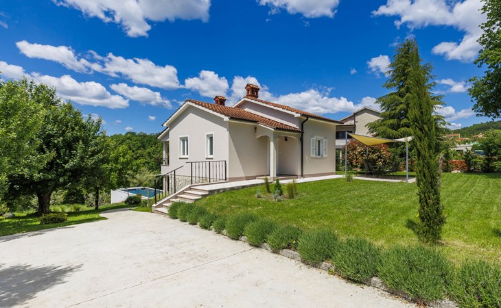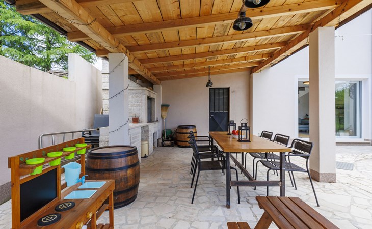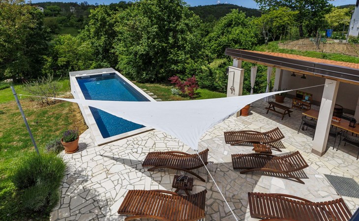 Single-family house "Klementini", 2 storeys, renovated in 2023. 8 km from the centre of Pazin, 22 km from the centre of Roč, in a sunny position, 40 km from the sea. Private: property 1'300 m2, lawn, swimming pool (9 x 3 m, depth 140 cm, seasonal availability: 01.May. - 01.Oct.) with internal staircase and salt-electrolysis pool-cleaning system. Outdoor shower, terrace (40 m2), garden furniture, barbecue, pool maintenance by the owner/gardener. In the house: internet access, washing machine. Parking (for 2 cars) at the house on the premises. Shop 100 m, supermarket 8 km, restaurant 100 m, bus stop 220 m, pebble beach 40 km, public bathing area 40 km. Walking paths from the house 50 m, cycle lane 100 m. Nearby attractions: Nature park Učka 27 km. The owner does not accept any youth groups.
