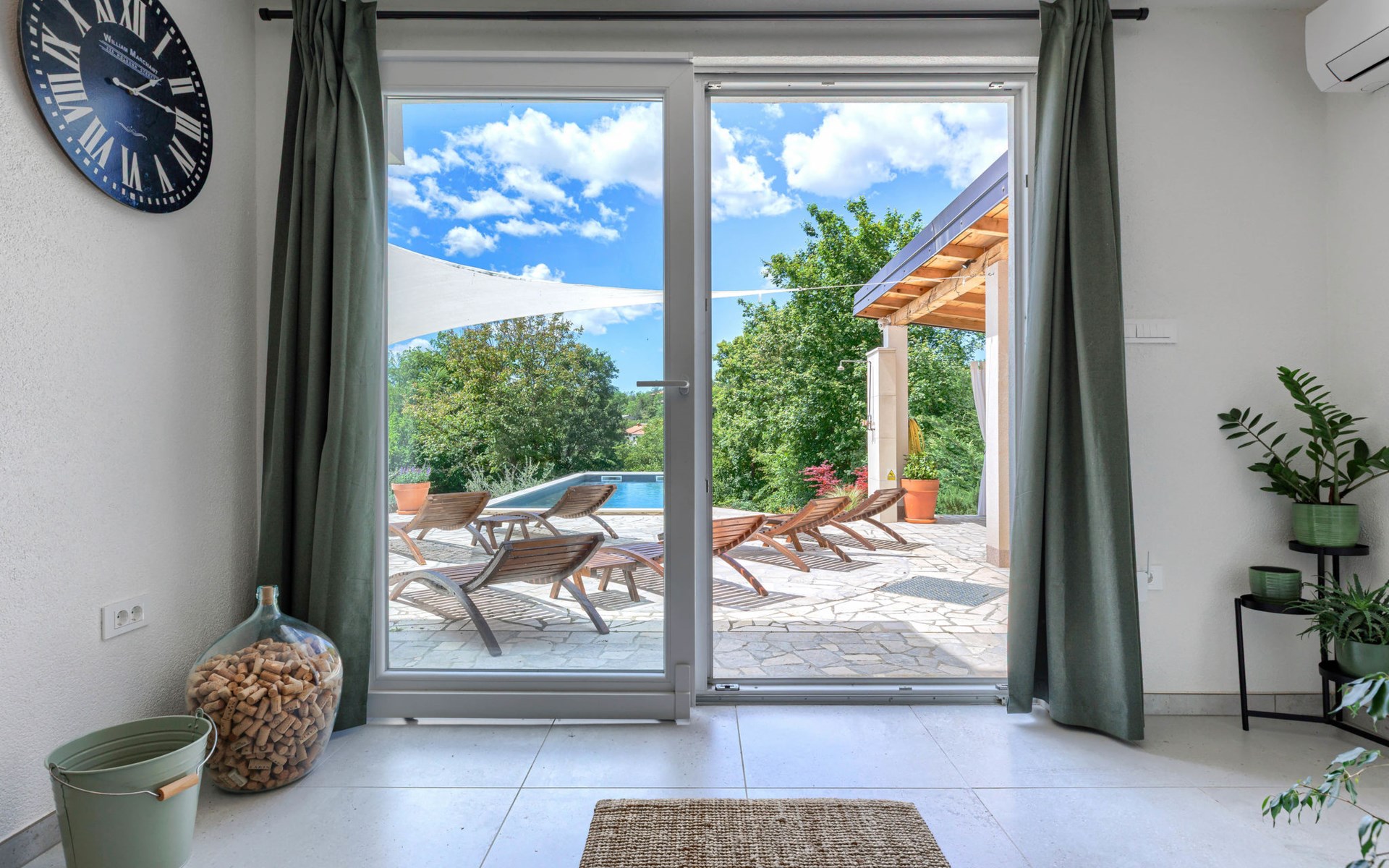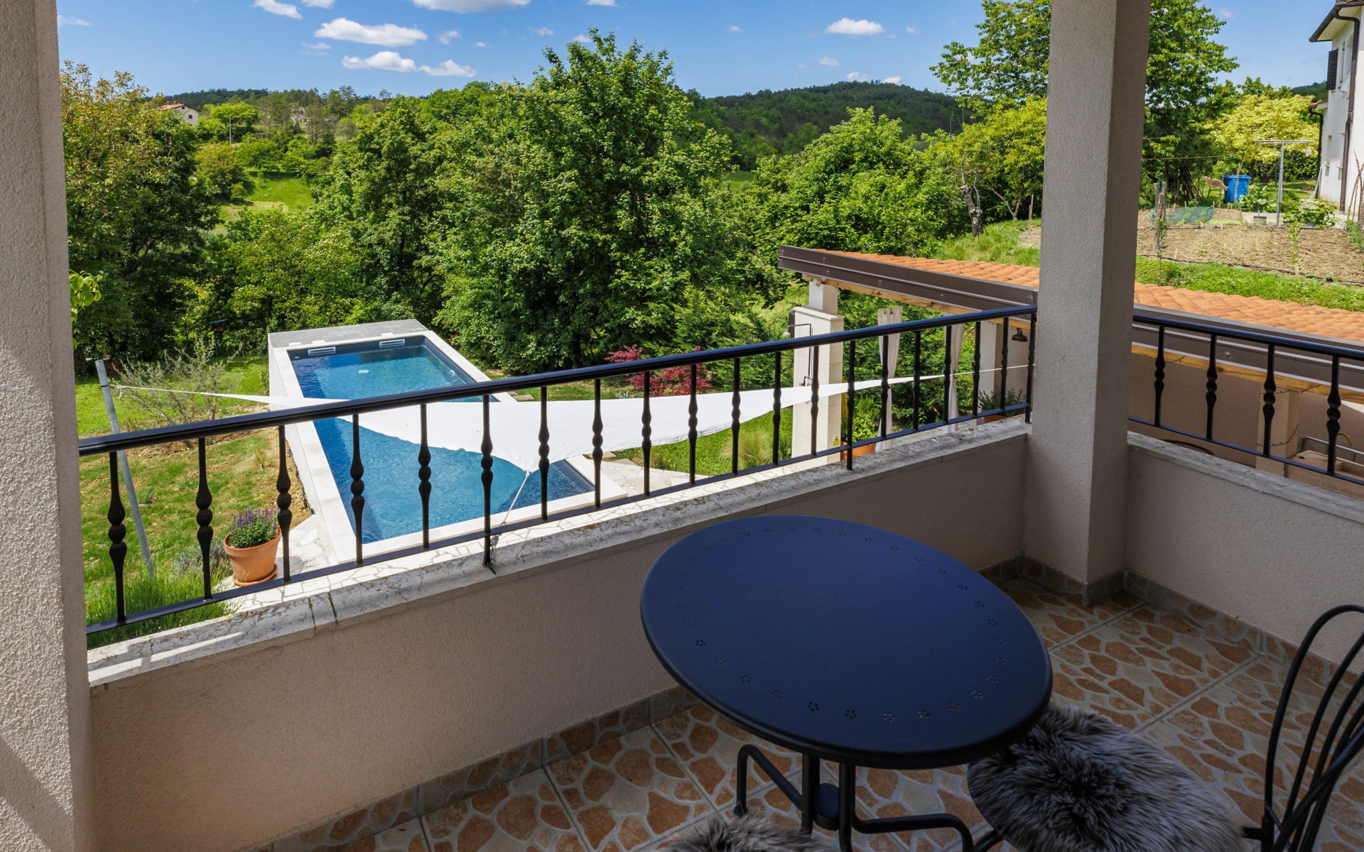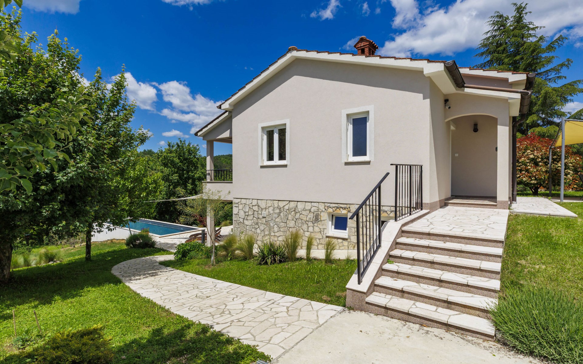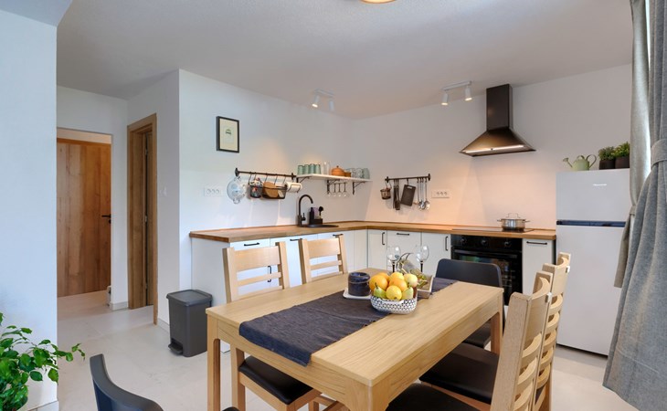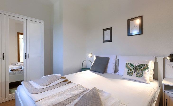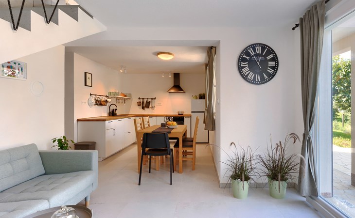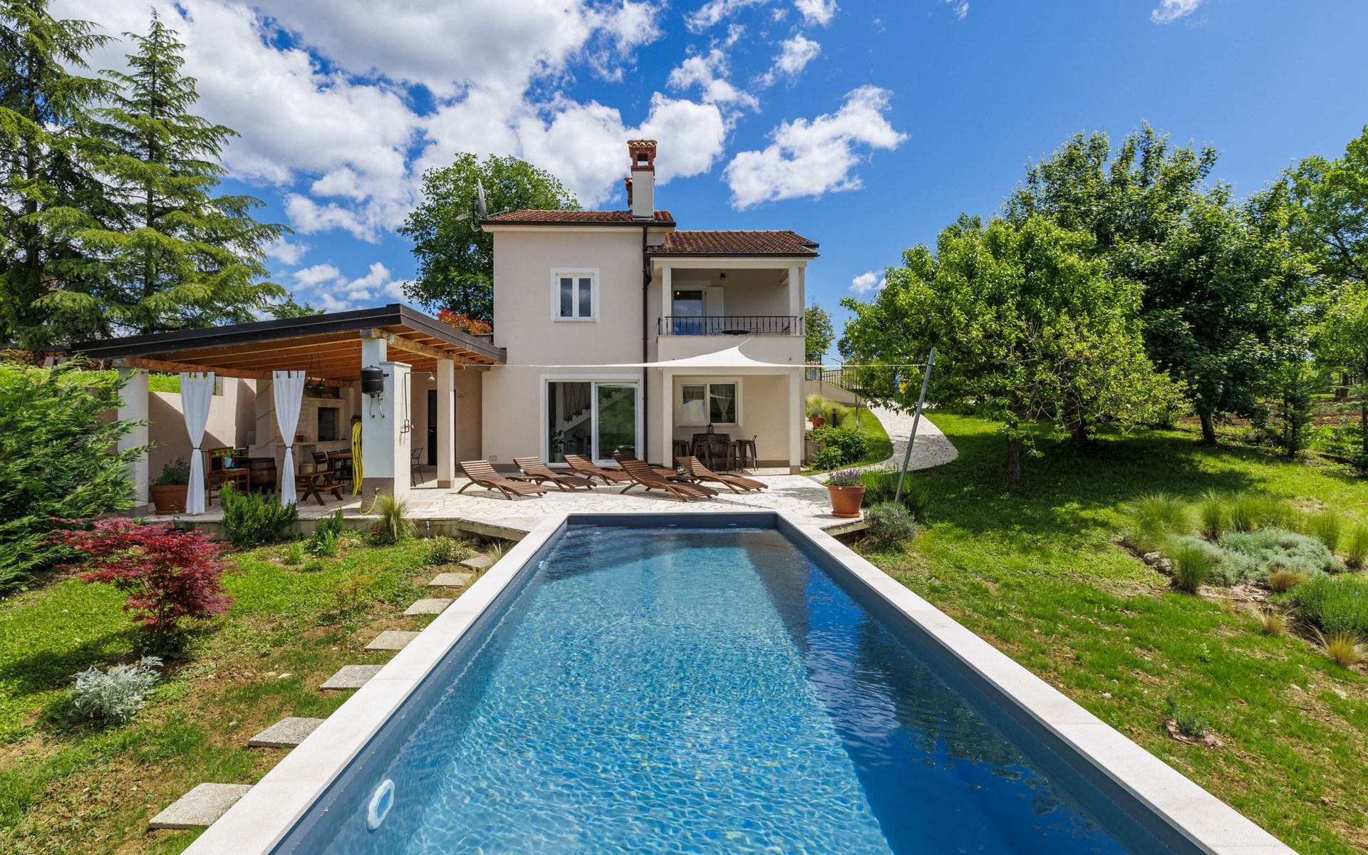 Single-family house "Klementini", 2 storeys, renovated in 2023. 8 km from the centre of Pazin, 22 km from the centre of Roč, in a sunny position, 40 km from the sea. Private: property 1'300 m2, lawn, swimming pool (9 x 3 m, depth 140 cm, seasonal availability: 01.May. - 01.Oct.) with internal staircase and salt-electrolysis pool-cleaning system. Outdoor shower, terrace (40 m2), garden furniture, barbecue, pool maintenance by the owner/gardener. In the house: internet access, washing machine. Parking (for 2 cars) at the house on the premises. Shop 100 m, supermarket 8 km, restaurant 100 m, bus stop 220 m, pebble beach 40 km, public bathing area 40 km. Walking paths from the house 50 m, cycle lane 100 m. Nearby attractions: Nature park Učka 27 km. The owner does not accept any youth groups.