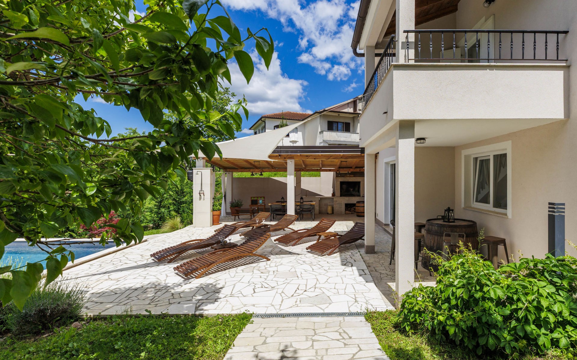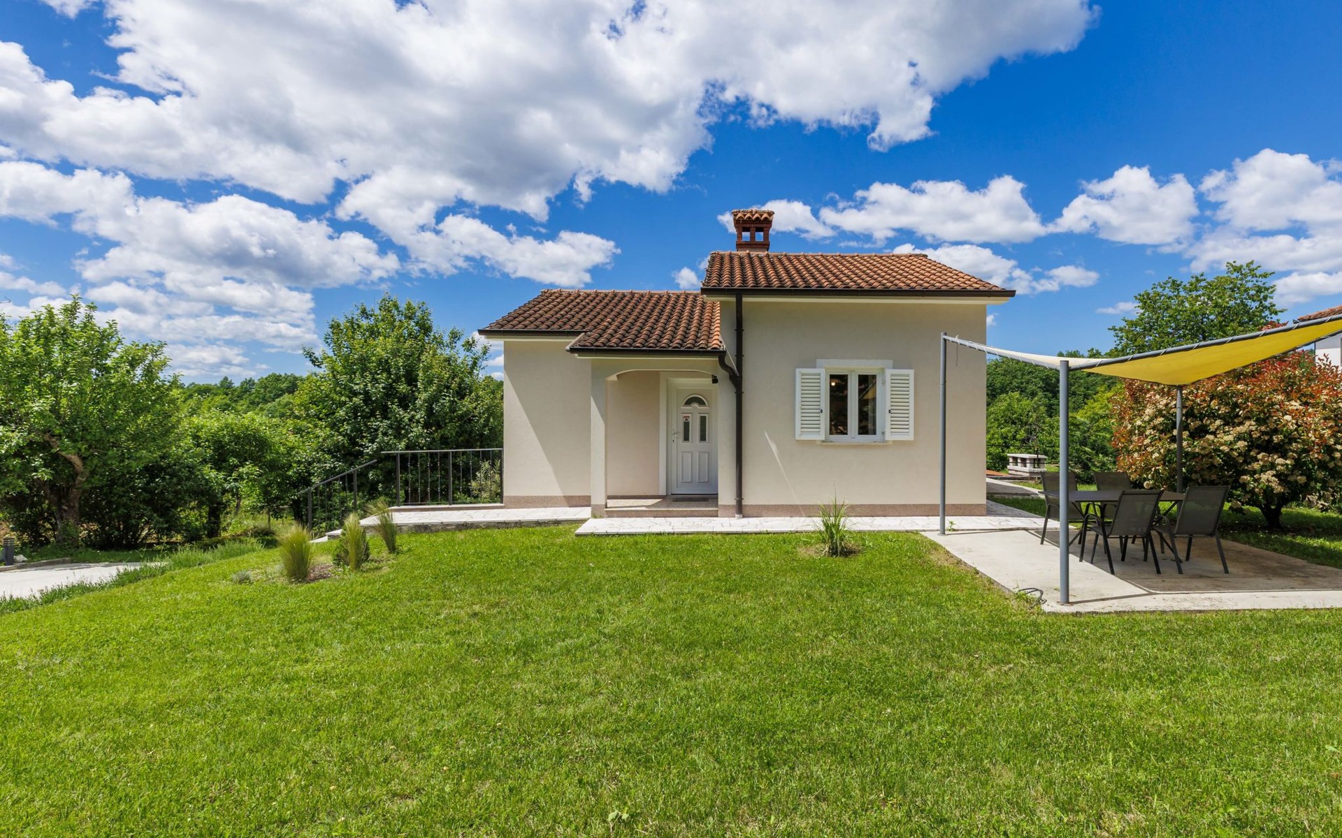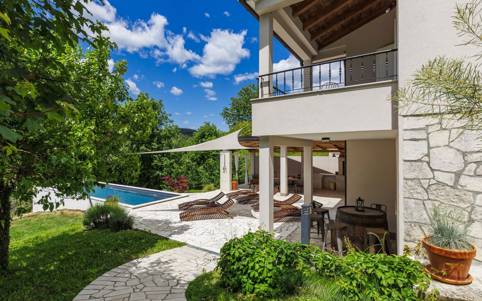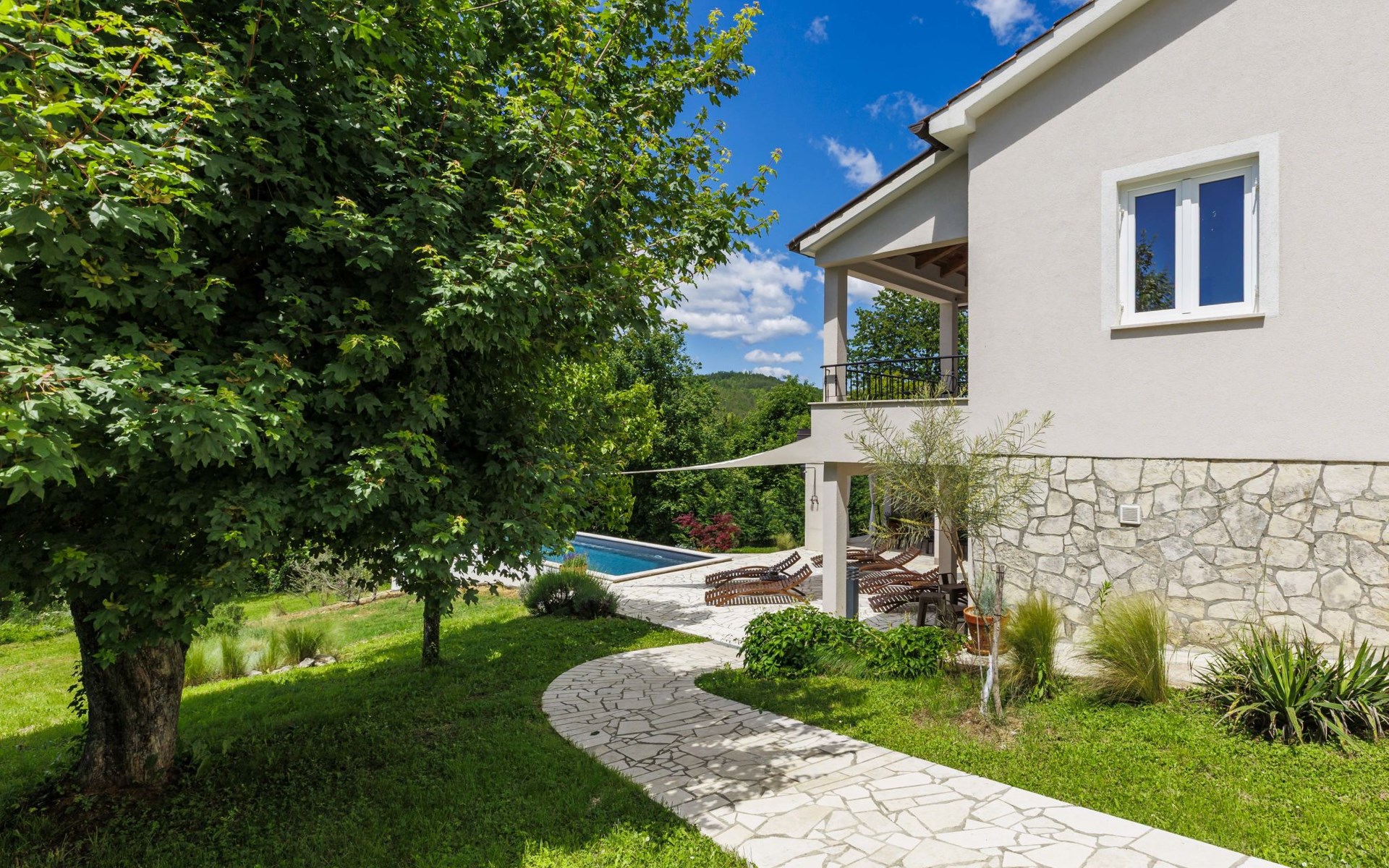 Single-family house "Klementini", 2 storeys, renovated in 2023. 8 km from the centre of Pazin, 22 km from the centre of Roč, in a sunny position, 40 km from the sea. Private: property 1'300 m2, lawn, swimming pool (9 x 3 m, depth 140 cm, seasonal availability: 01.May. - 01.Oct.) with internal staircase and salt-electrolysis pool-cleaning system. Outdoor shower, terrace (40 m2), garden furniture, barbecue, pool maintenance by the owner/gardener. In the house: internet access, washing machine. Parking (for 2 cars) at the house on the premises. Shop 100 m, supermarket 8 km, restaurant 100 m, bus stop 220 m, pebble beach 40 km, public bathing area 40 km. Walking paths from the house 50 m, cycle lane 100 m. Nearby attractions: Nature park Učka 27 km. The owner does not accept any youth groups.