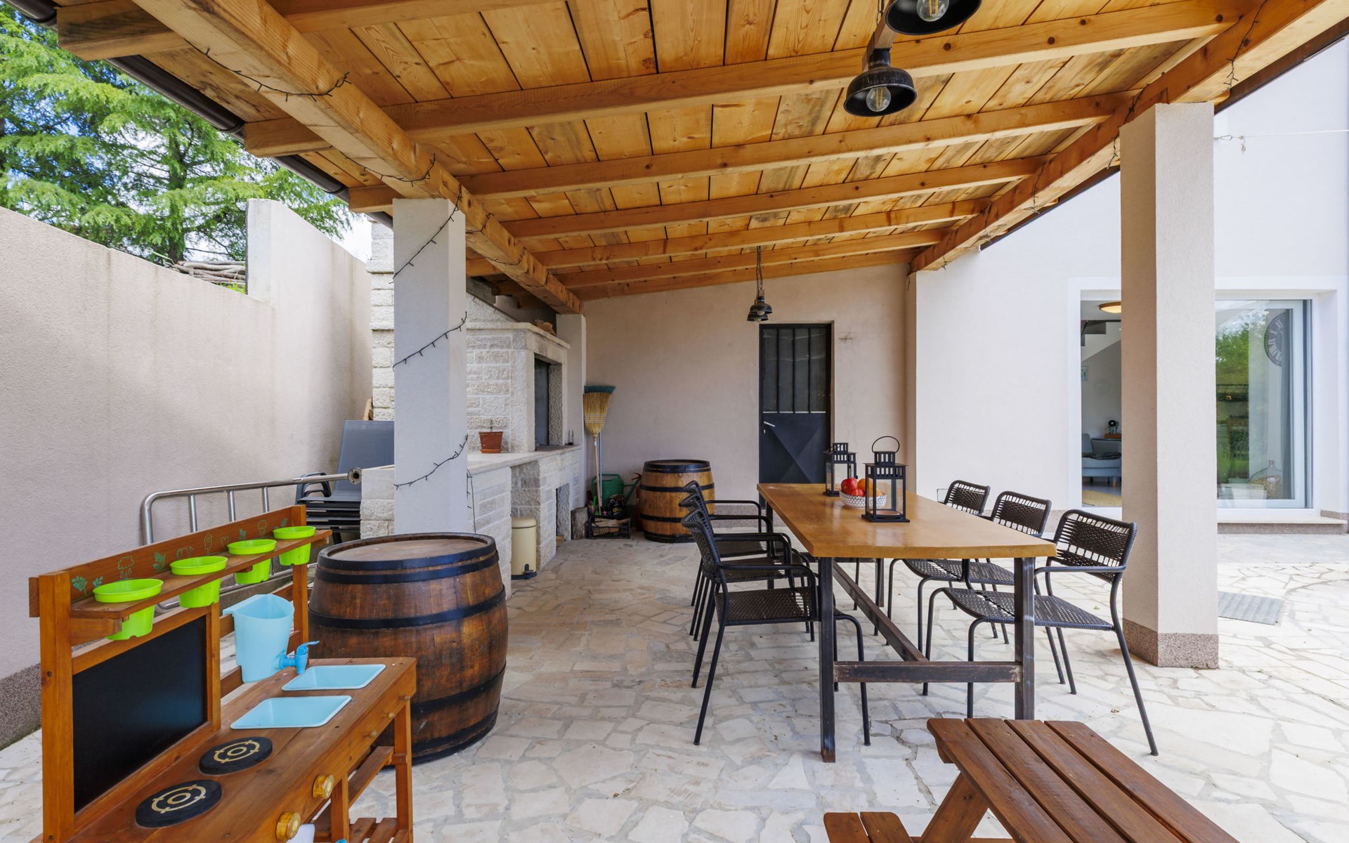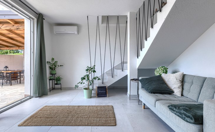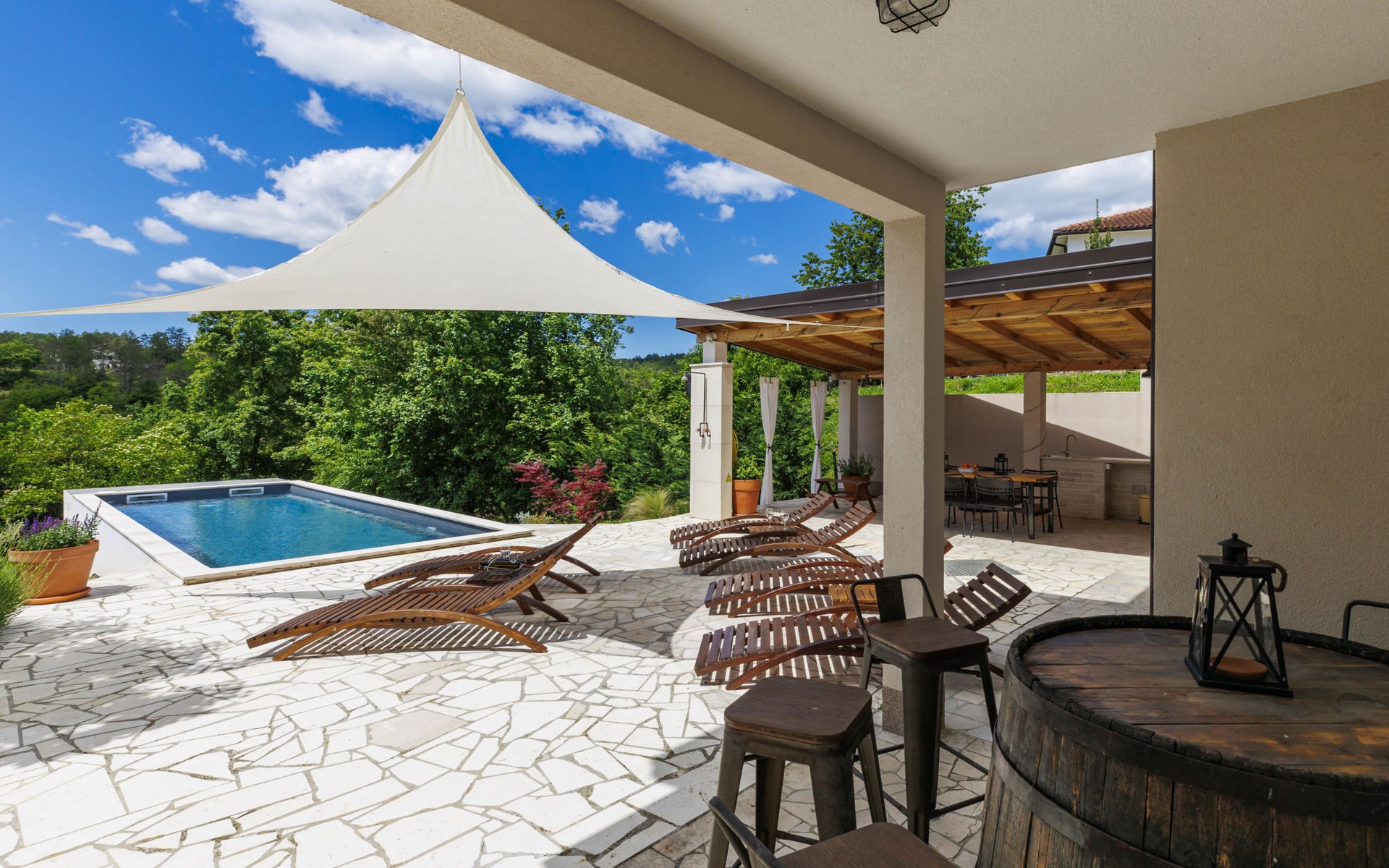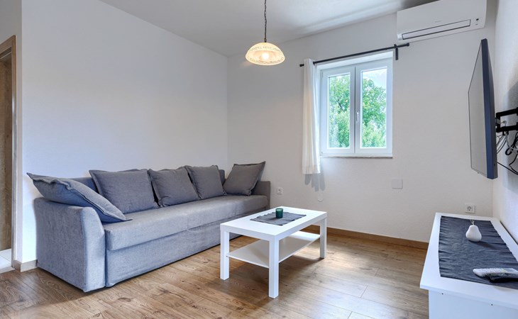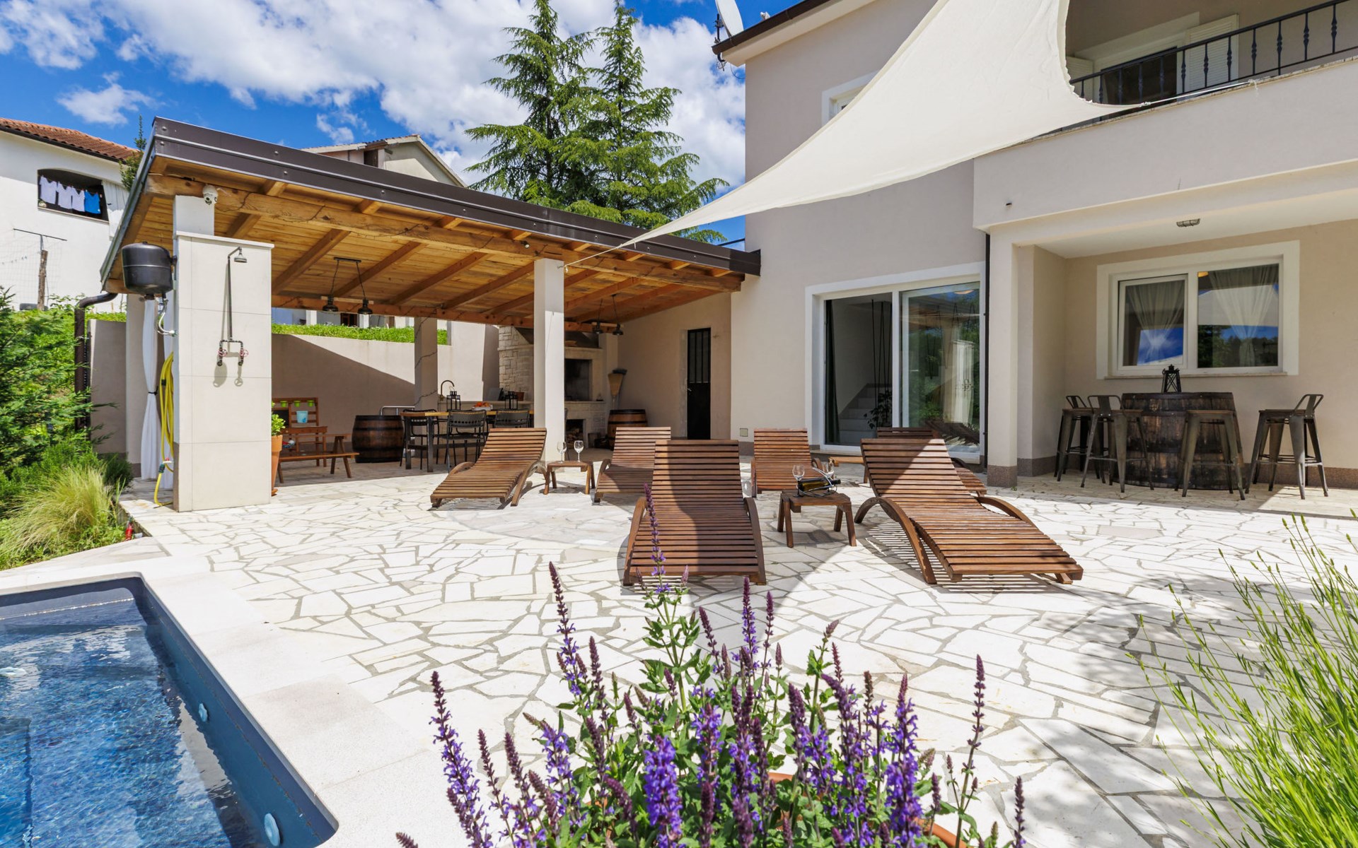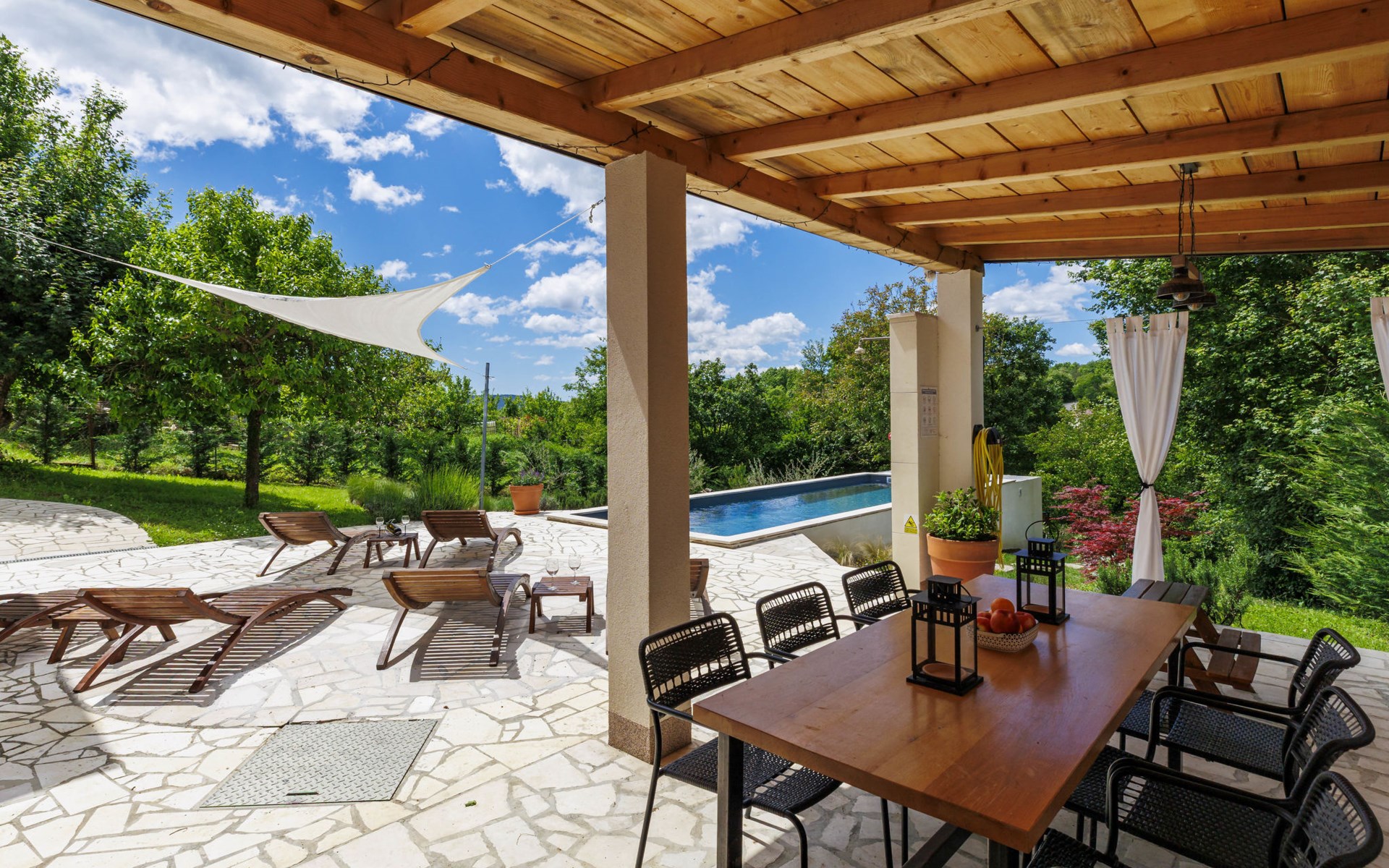 Single-family house "Klementini", 2 storeys, renovated in 2023. 8 km from the centre of Pazin, 22 km from the centre of Roč, in a sunny position, 40 km from the sea. Private: property 1'300 m2, lawn, swimming pool (9 x 3 m, depth 140 cm, seasonal availability: 01.May. - 01.Oct.) with internal staircase and salt-electrolysis pool-cleaning system. Outdoor shower, terrace (40 m2), garden furniture, barbecue, pool maintenance by the owner/gardener. In the house: internet access, washing machine. Parking (for 2 cars) at the house on the premises. Shop 100 m, supermarket 8 km, restaurant 100 m, bus stop 220 m, pebble beach 40 km, public bathing area 40 km. Walking paths from the house 50 m, cycle lane 100 m. Nearby attractions: Nature park Učka 27 km. The owner does not accept any youth groups.