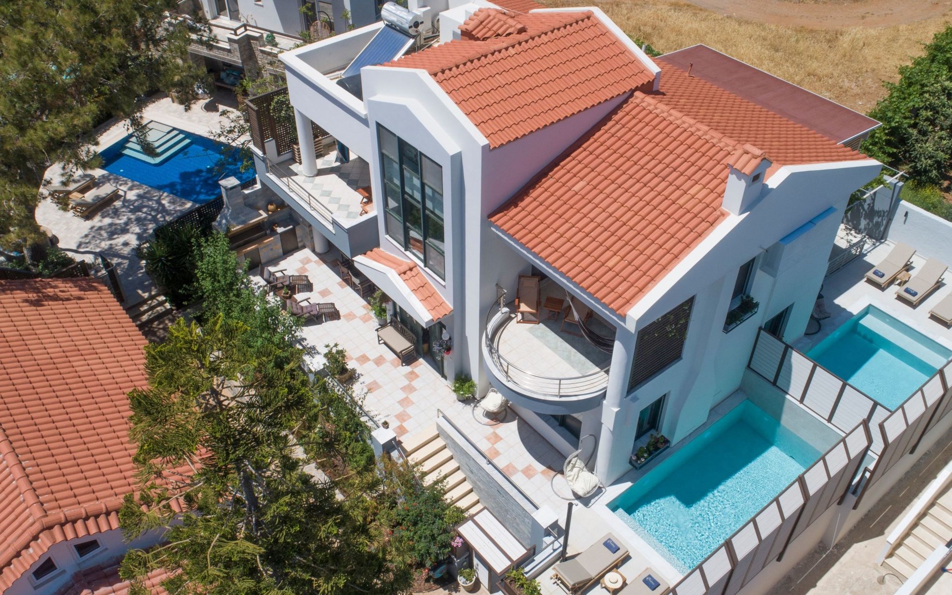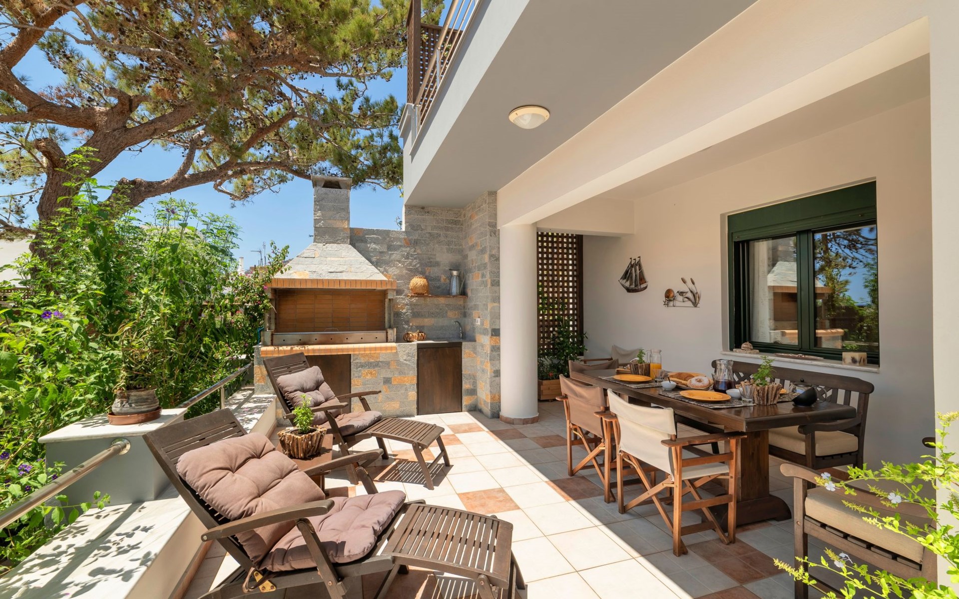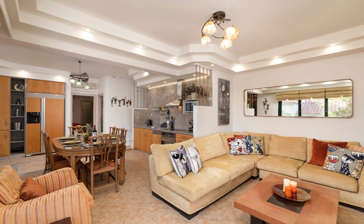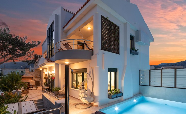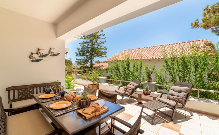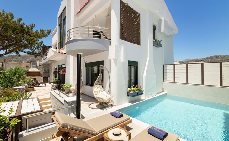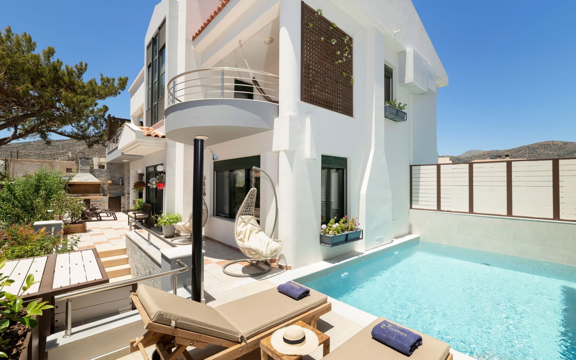 All 4 double bedrooms have en-suite bathrooms, thus the villa is ideal for up to 4 couples or multiple families. Extra sleeping in single beds, sofa beds and couch. Private pool with outdoor shower. Outdoor and indoor dining and private BBQ. Parking is available within gated gardens.