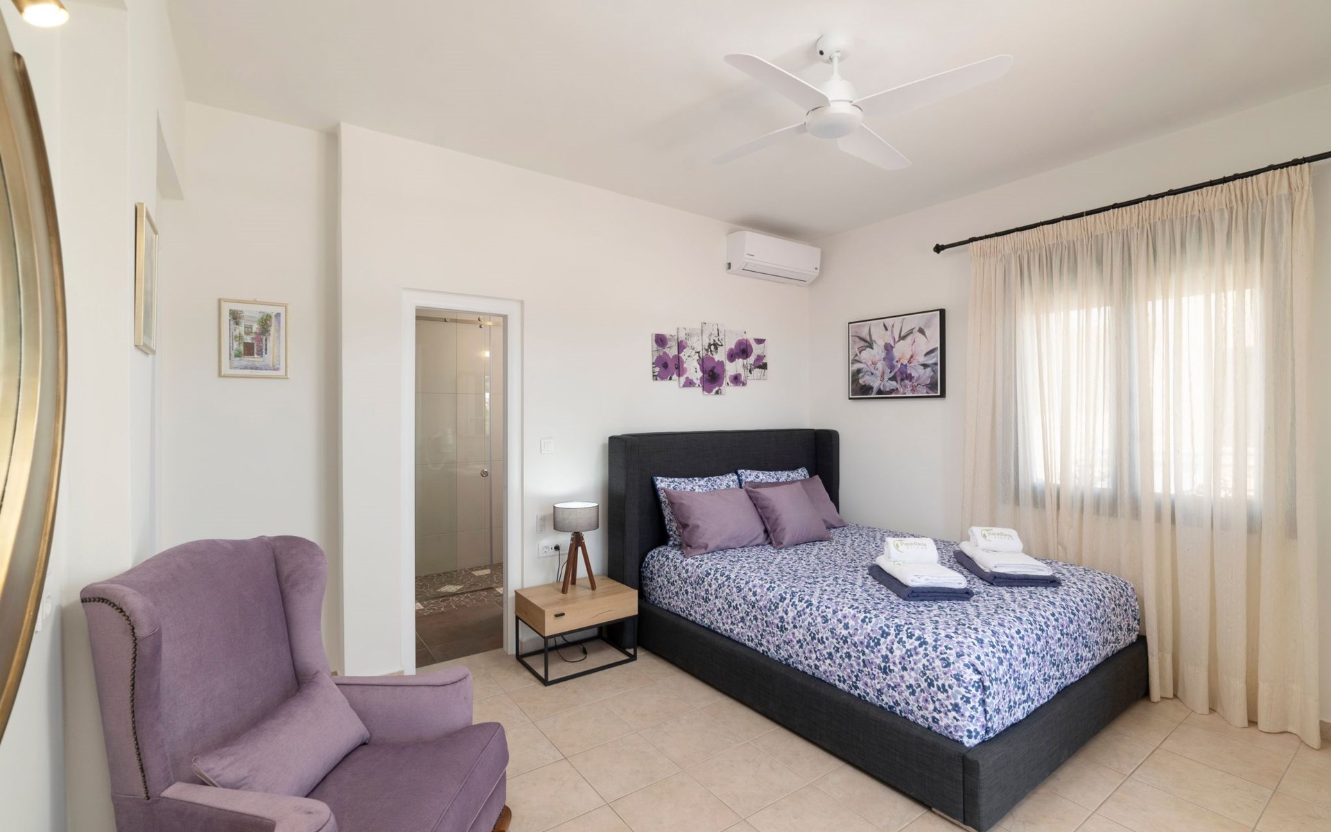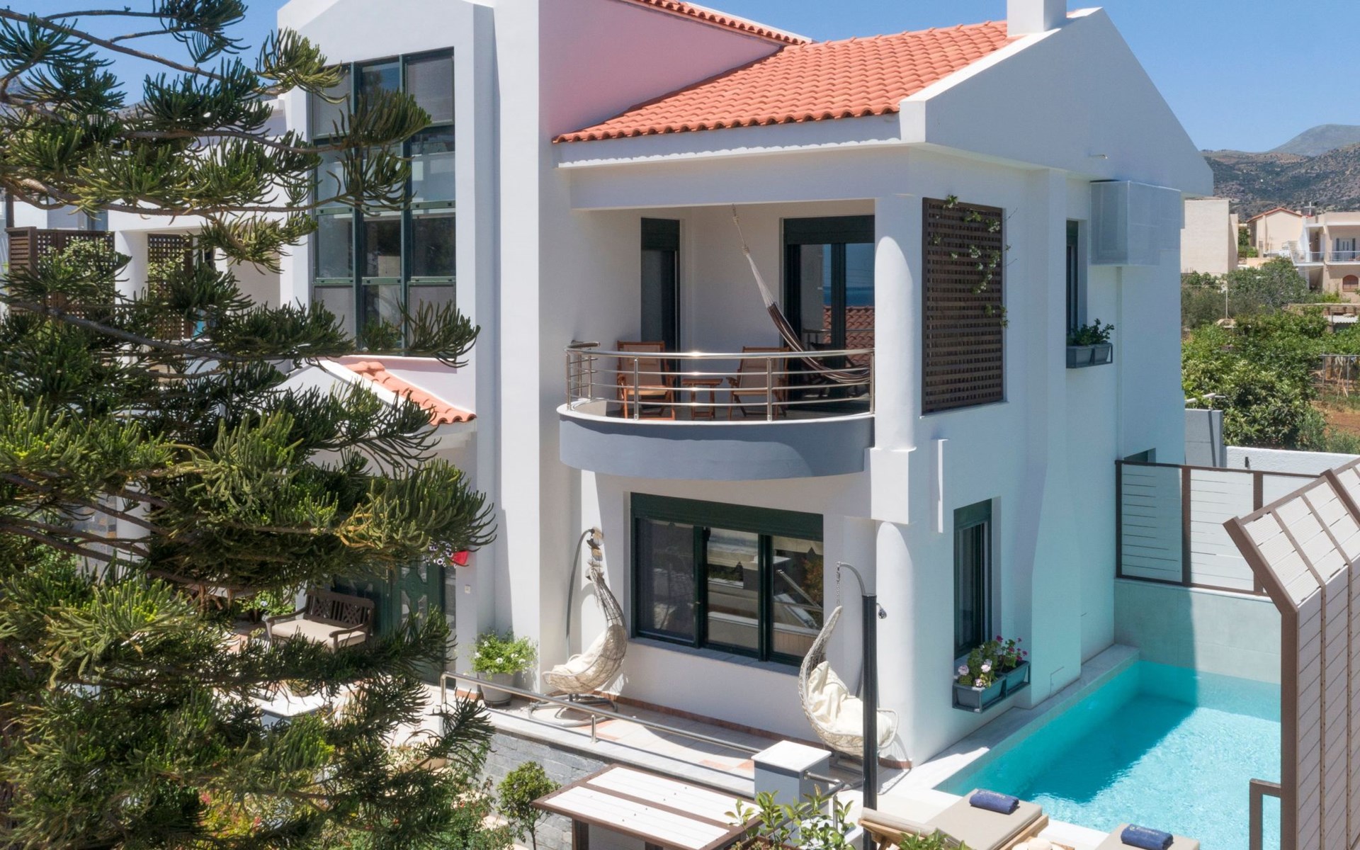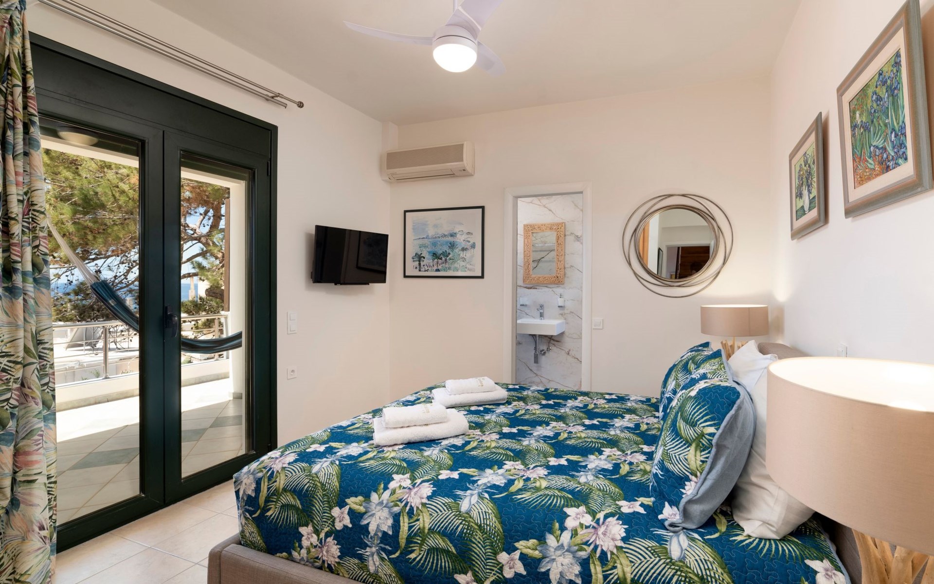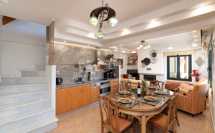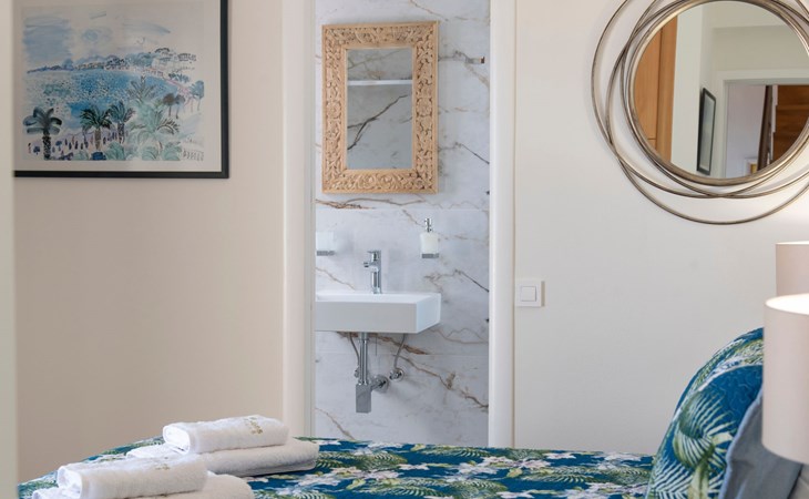 All 4 double bedrooms have en-suite bathrooms, thus the villa is ideal for up to 4 couples or multiple families. Extra sleeping in single beds, sofa beds and couch. Private pool with outdoor shower. Outdoor and indoor dining and private BBQ. Parking is available within gated gardens.