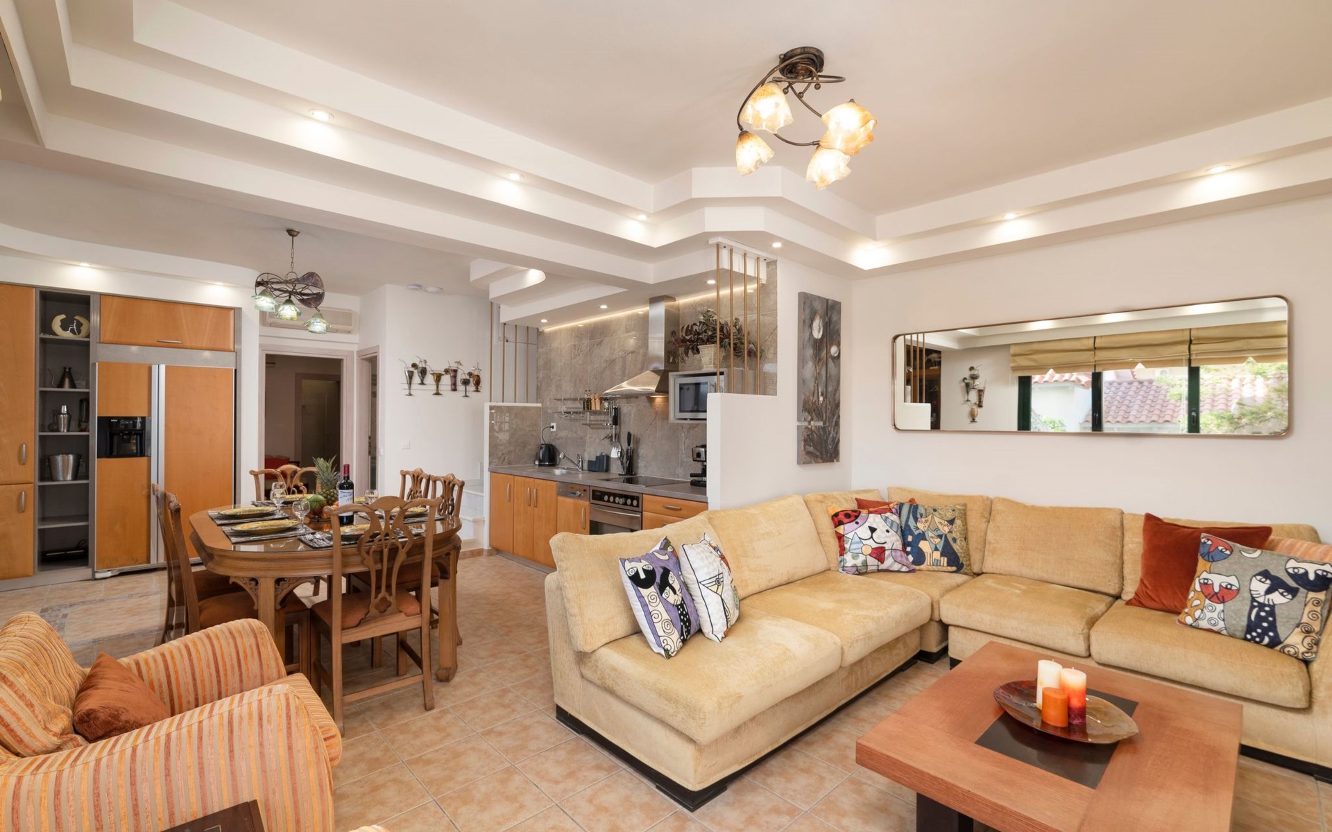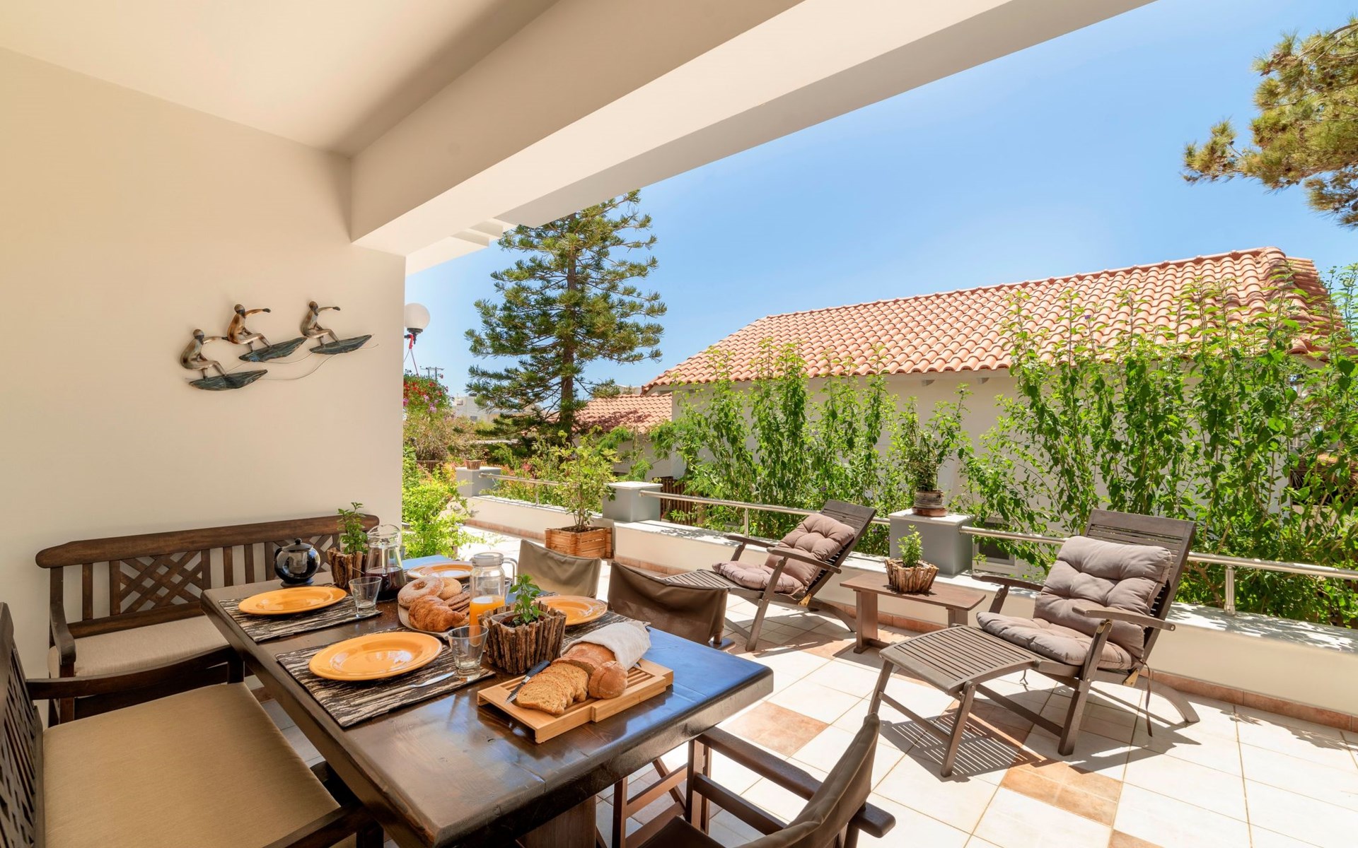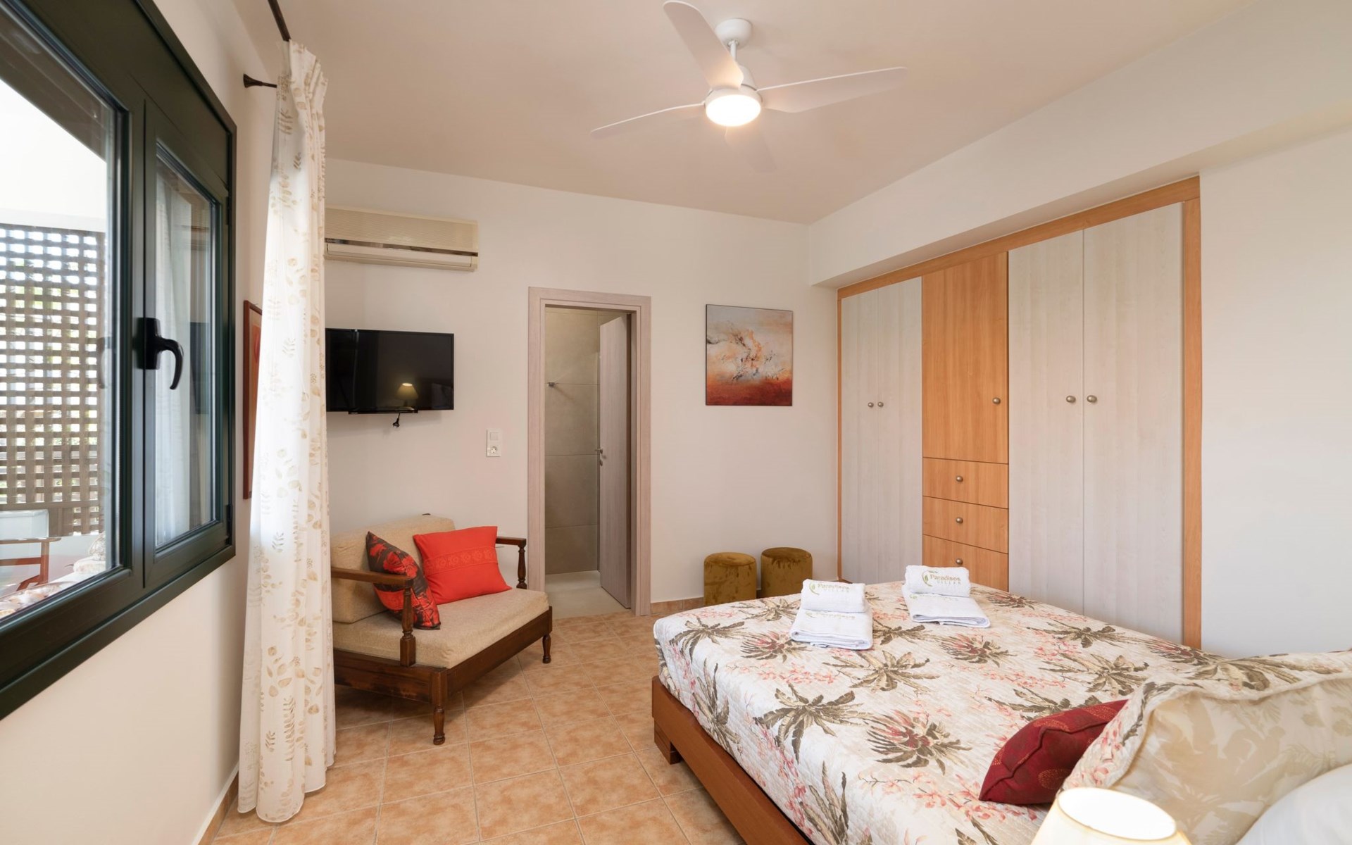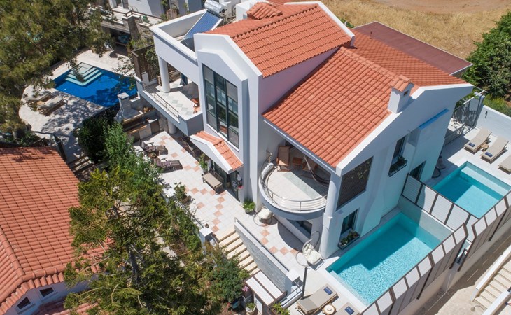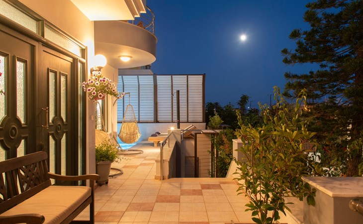 All 4 double bedrooms have en-suite bathrooms, thus the villa is ideal for up to 4 couples or multiple families. Extra sleeping in single beds, sofa beds and couch. Private pool with outdoor shower. Outdoor and indoor dining and private BBQ. Parking is available within gated gardens.