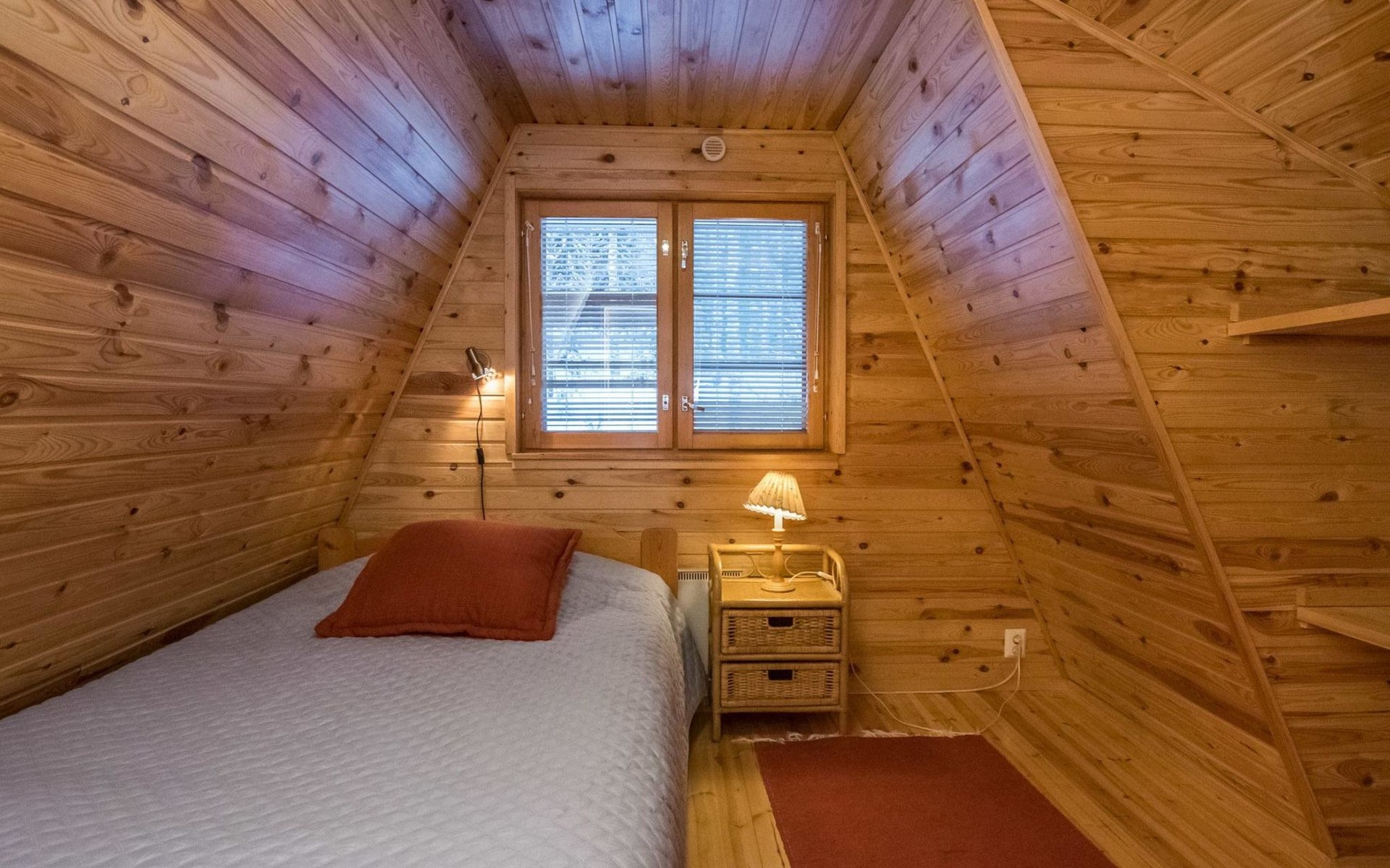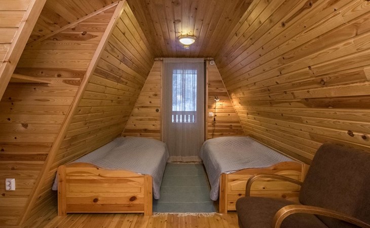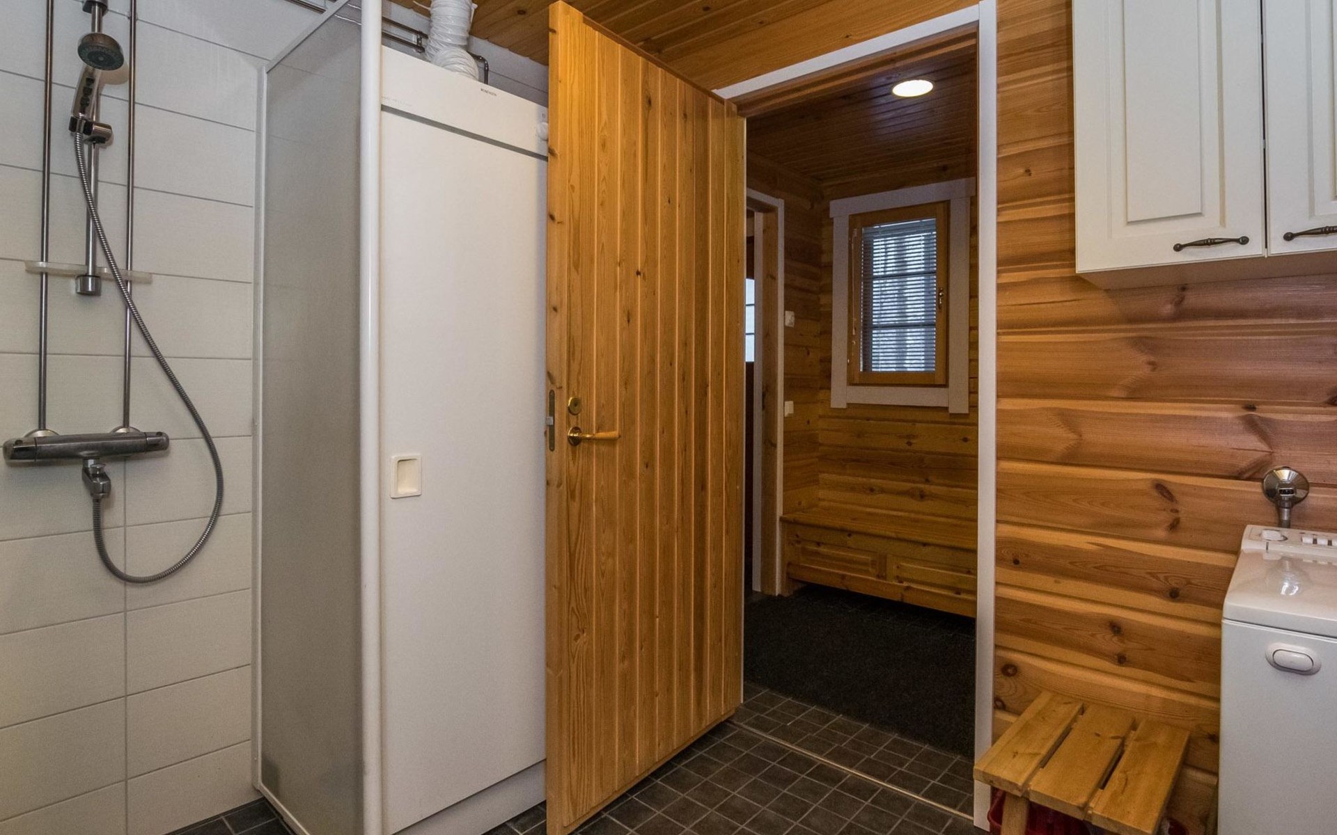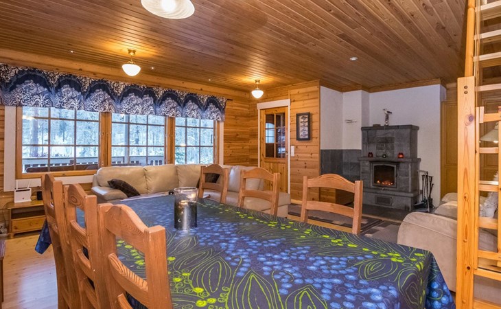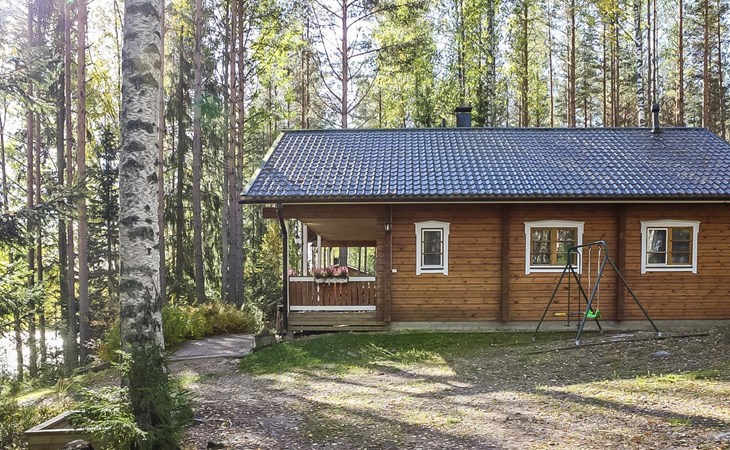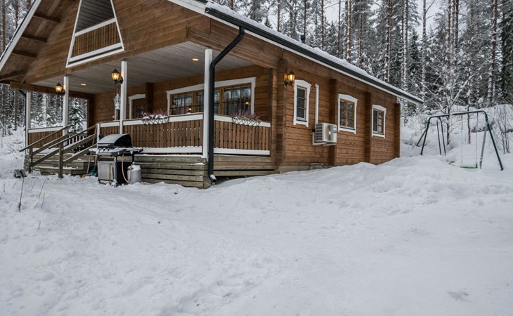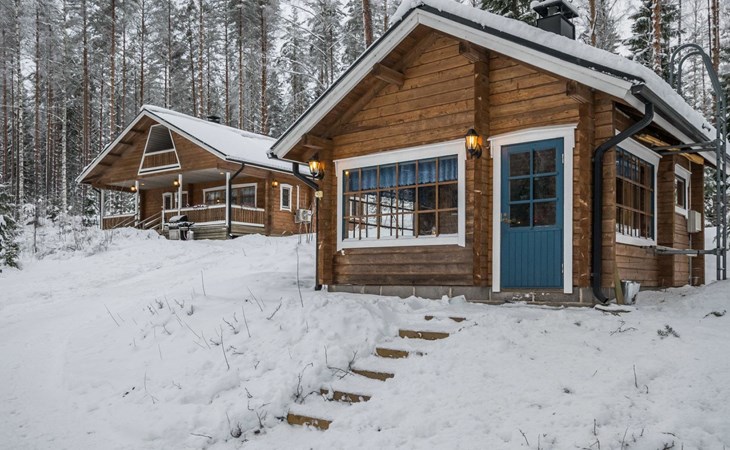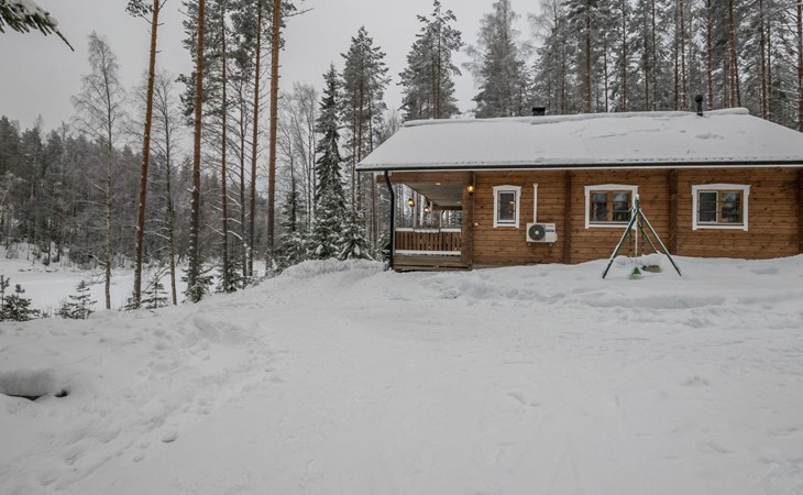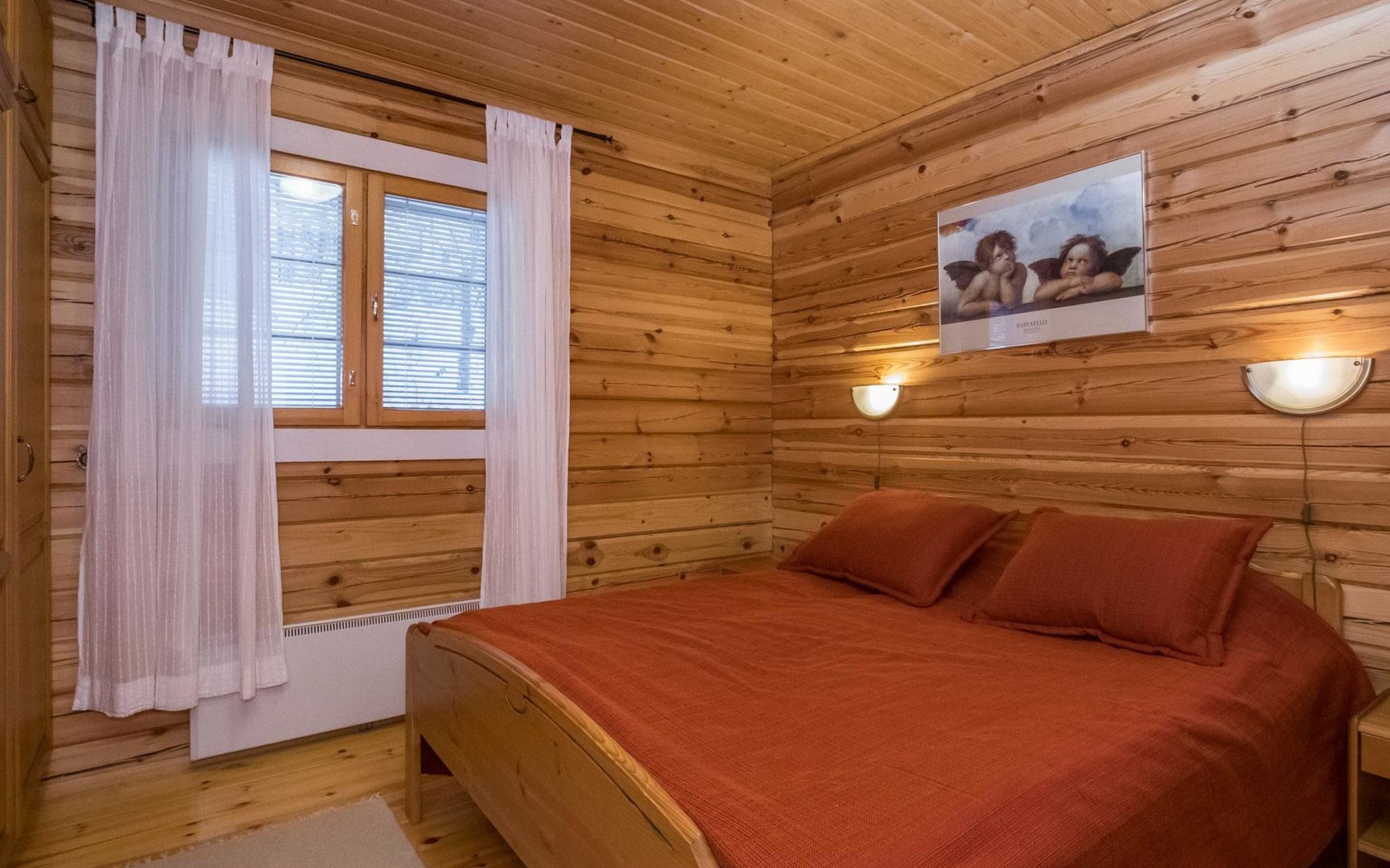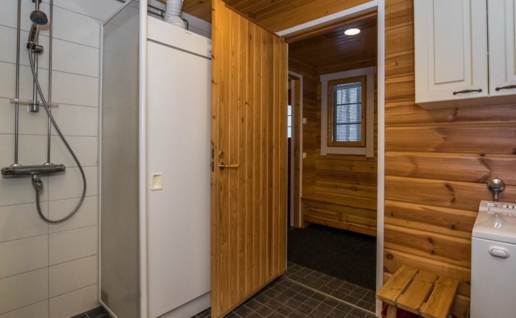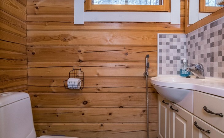 Log cabin 2001, partly renovated in 2017, kitchen, living room, bedroom with double bed and bedroom with 2 single beds, dressing room with toilet, washroom, sauna with electric stove, covered terrace. Air source heat pump, WiFi internet connection. Upstairs: bedroom with one 120 cm wide bed, supstairs lobby with 2 beds, balcony. Steep stairs to the loft, downstairs child safety gate. An additional table and chair are also available by prior arrangement, eg for teleworking.