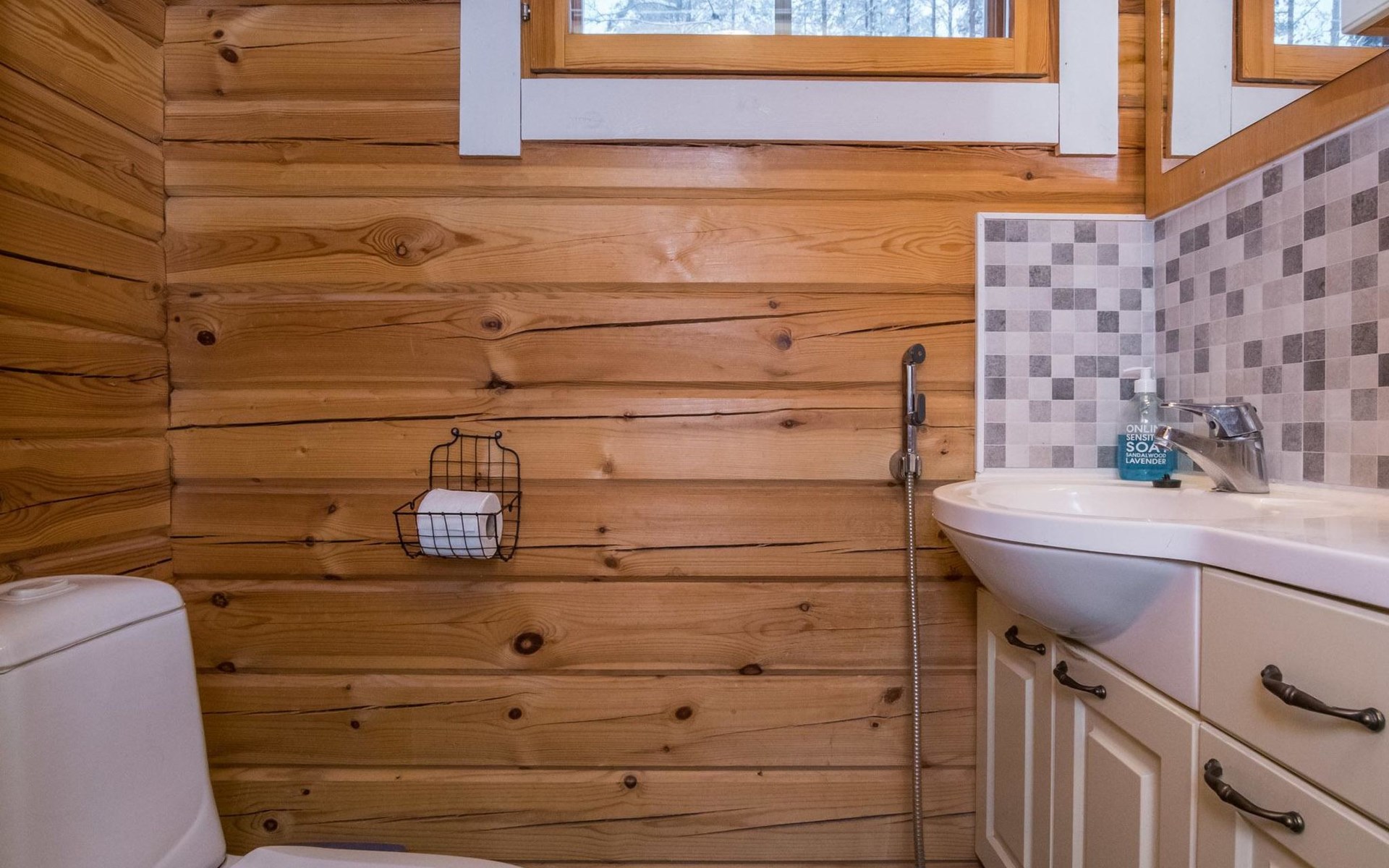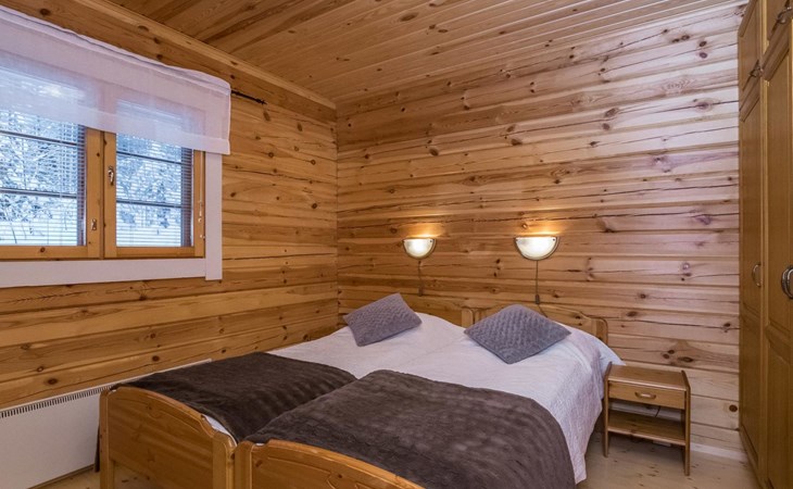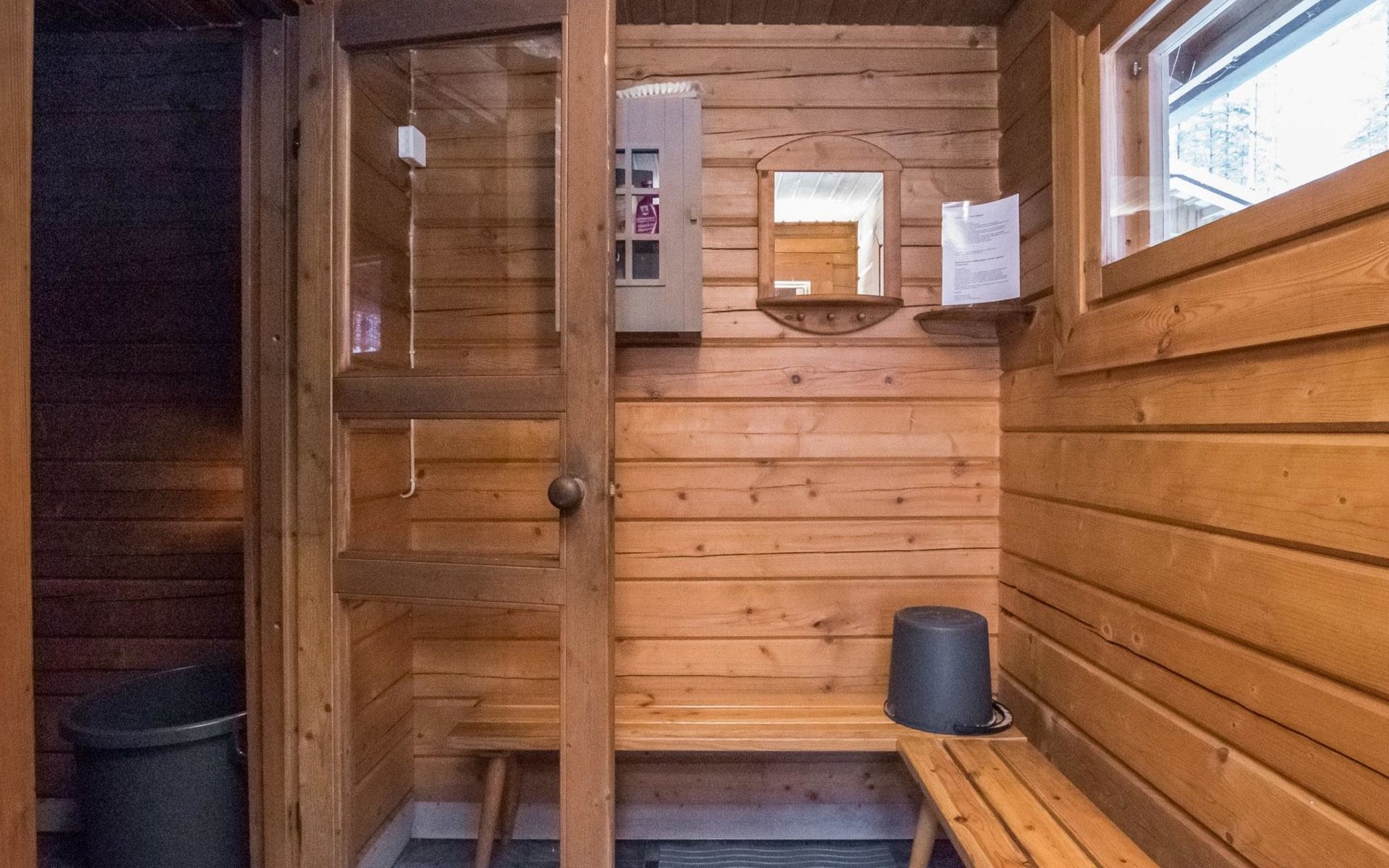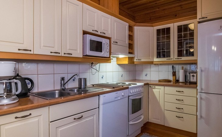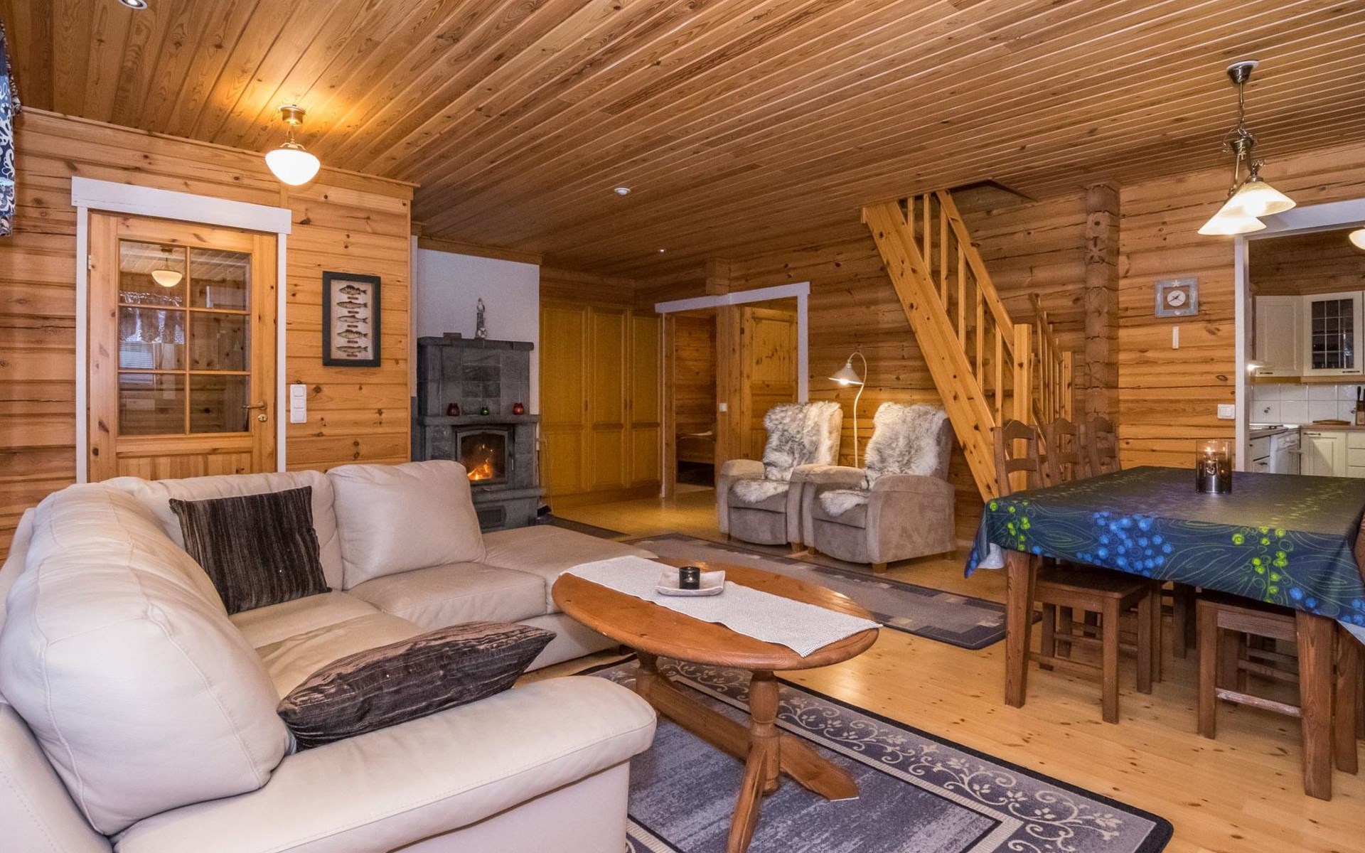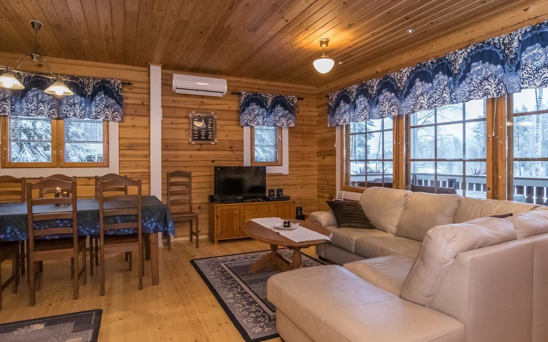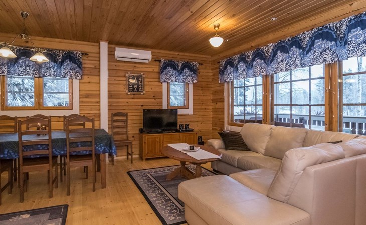 Log cabin 2001, partly renovated in 2017, kitchen, living room, bedroom with double bed and bedroom with 2 single beds, dressing room with toilet, washroom, sauna with electric stove, covered terrace. Air source heat pump, WiFi internet connection. Upstairs: bedroom with one 120 cm wide bed, supstairs lobby with 2 beds, balcony. Steep stairs to the loft, downstairs child safety gate. An additional table and chair are also available by prior arrangement, eg for teleworking.