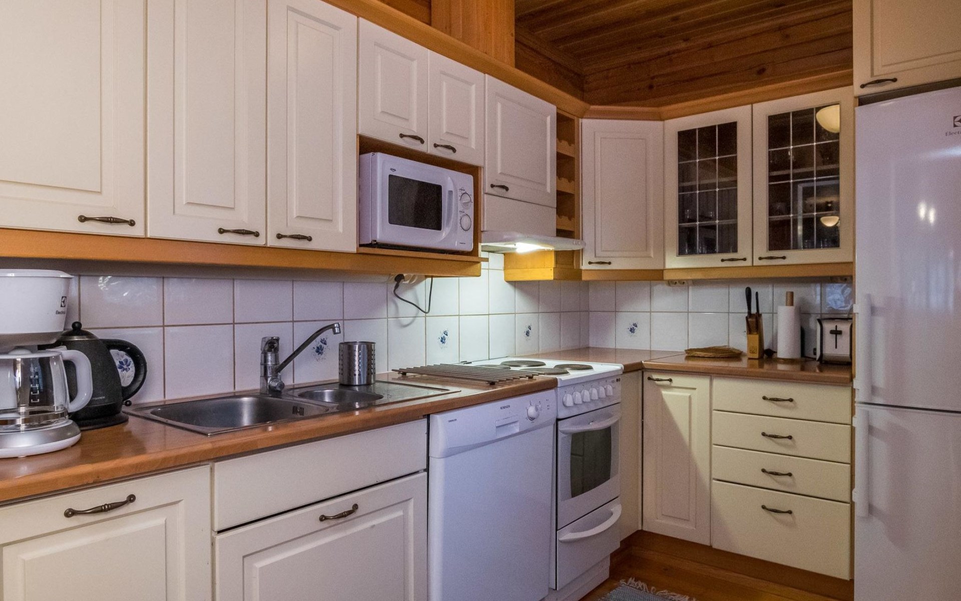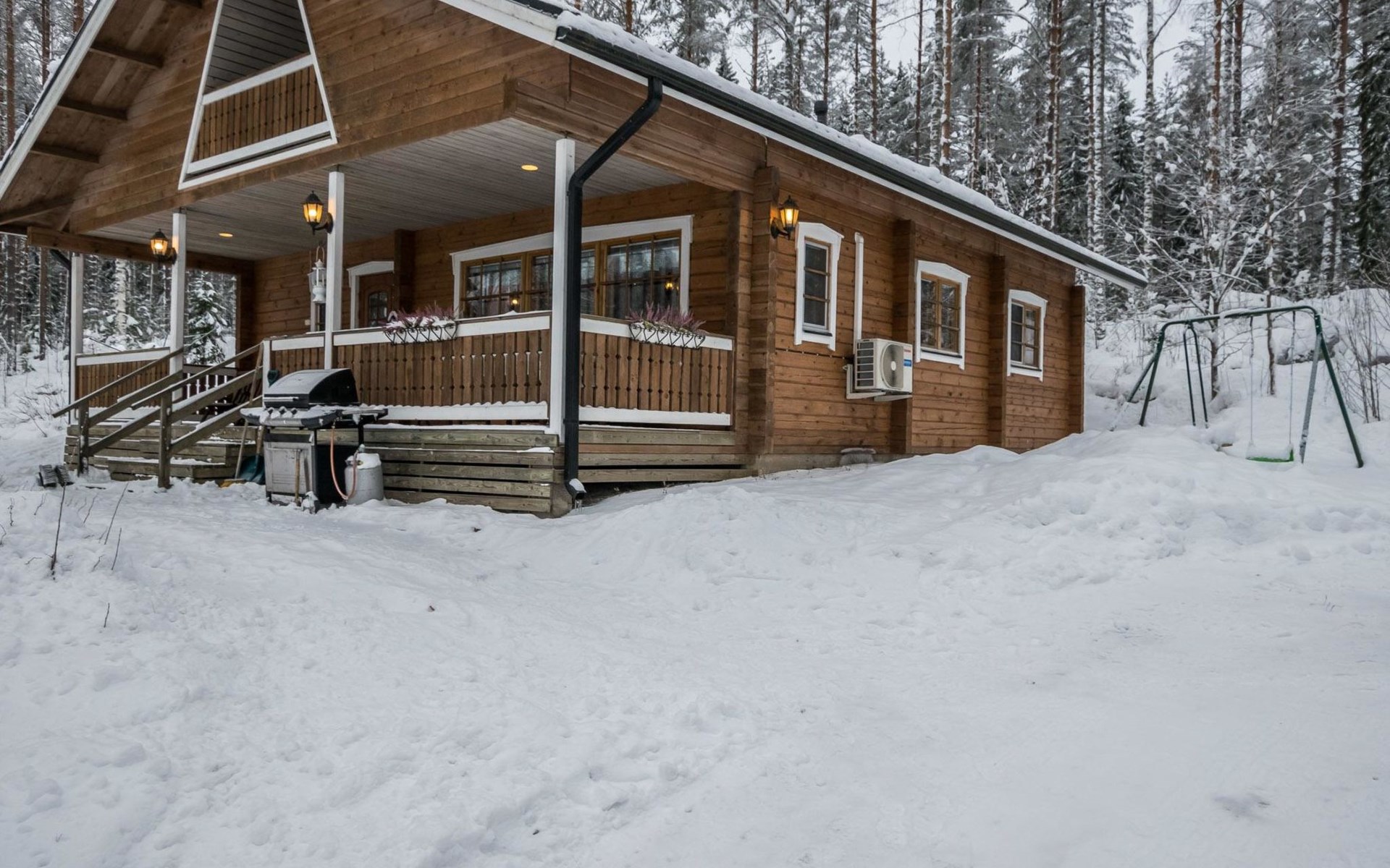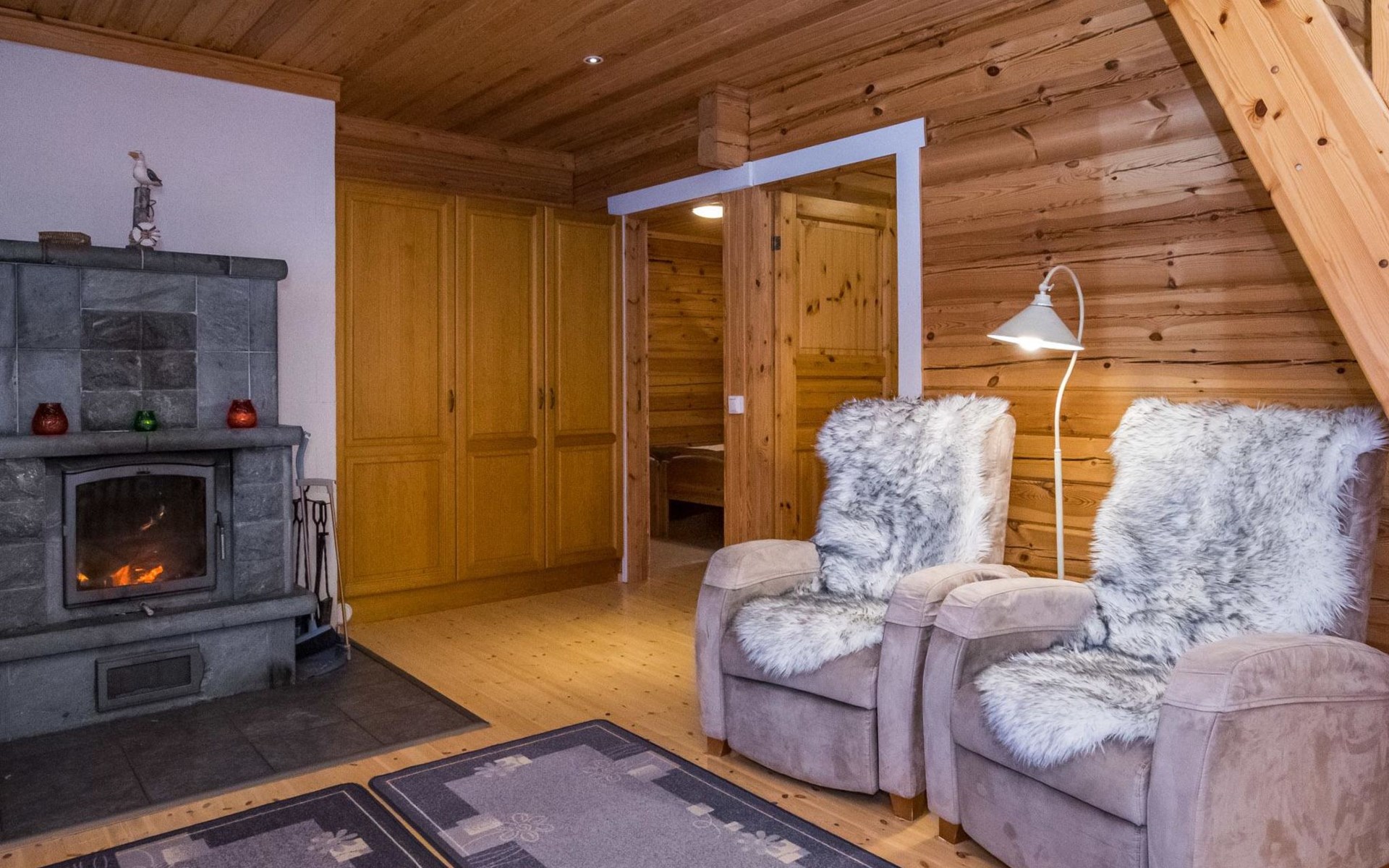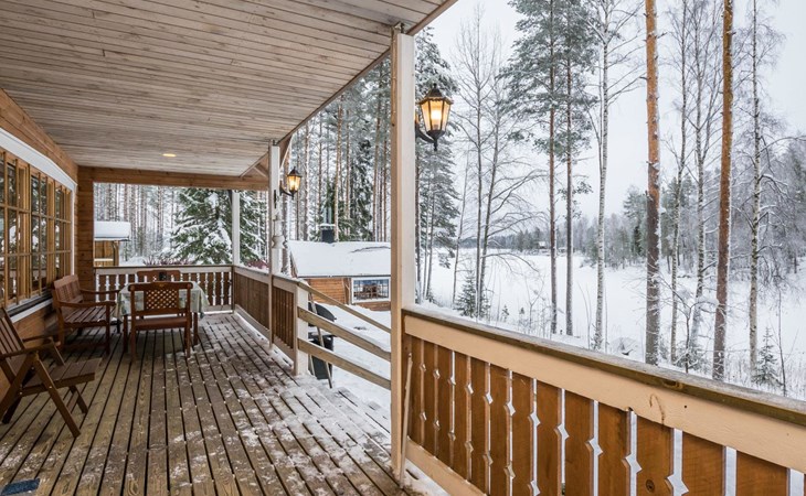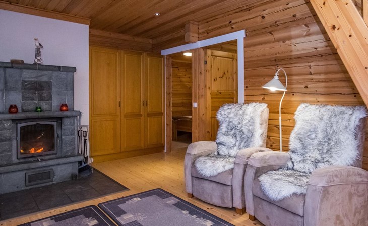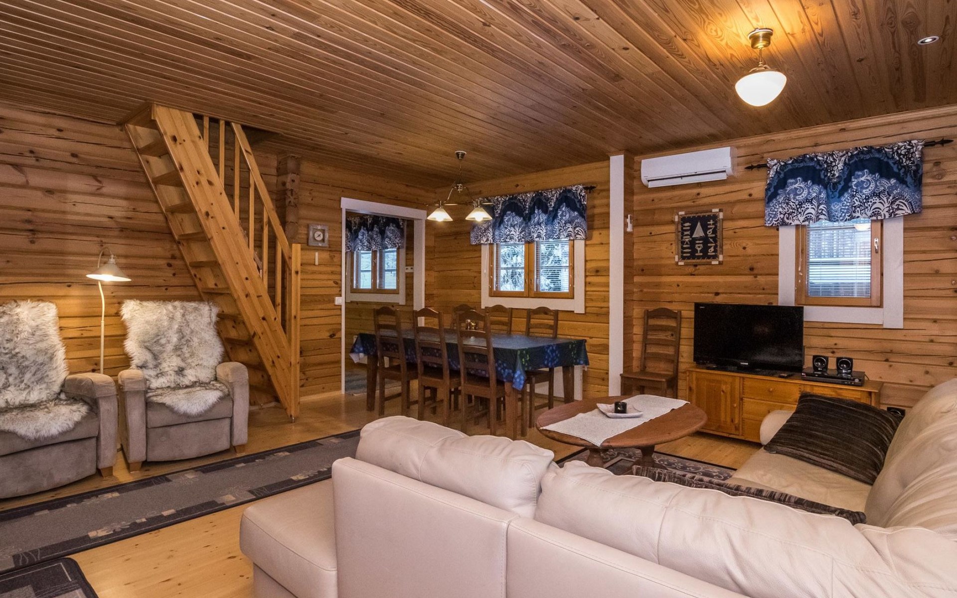 Log cabin 2001, partly renovated in 2017, kitchen, living room, bedroom with double bed and bedroom with 2 single beds, dressing room with toilet, washroom, sauna with electric stove, covered terrace. Air source heat pump, WiFi internet connection. Upstairs: bedroom with one 120 cm wide bed, supstairs lobby with 2 beds, balcony. Steep stairs to the loft, downstairs child safety gate. An additional table and chair are also available by prior arrangement, eg for teleworking.