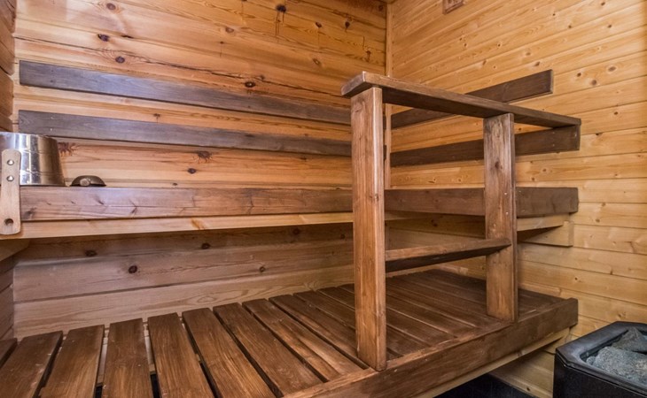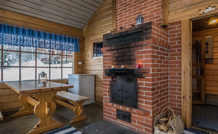 Lakeside sauna built in 2001, (20 m²) with electricity, dressing room and fireplace in galzed terrace. Lakeside sauna can be used all year round, but there's no running water.