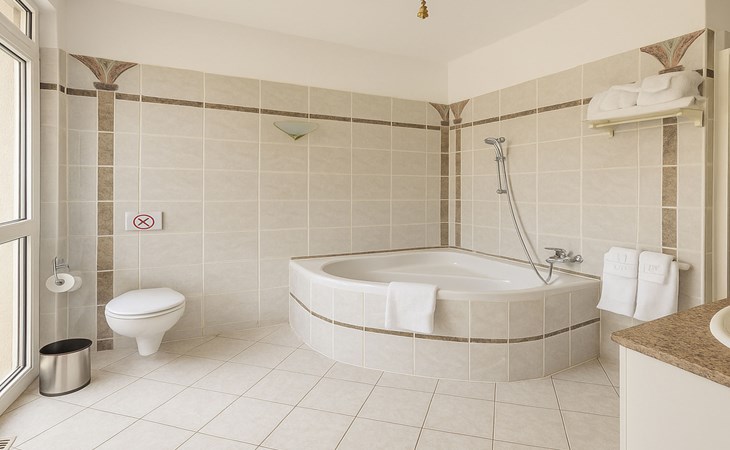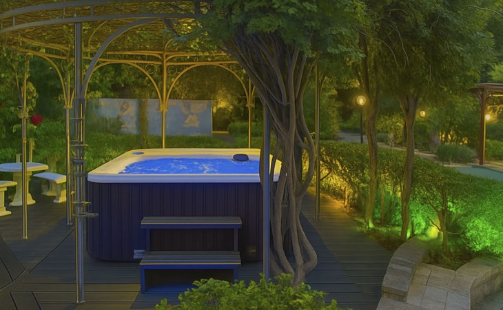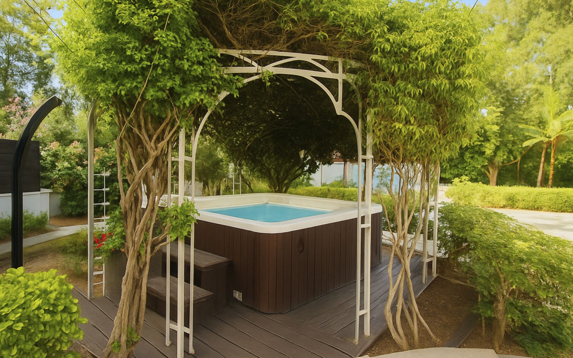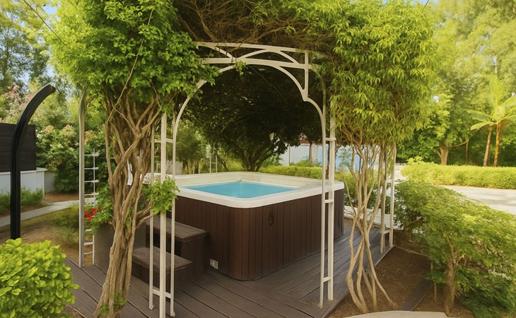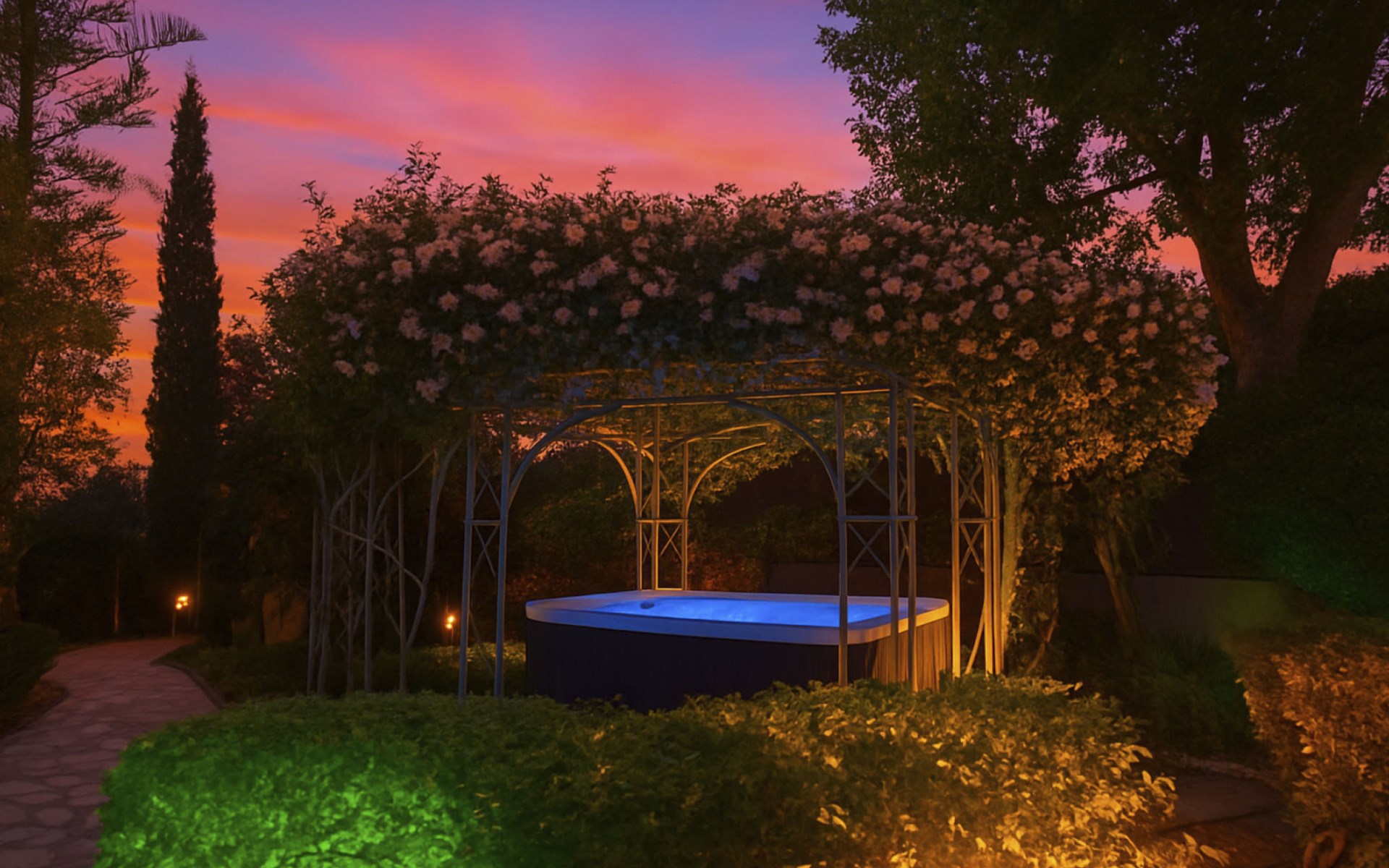 Within the garden, among the vibrant flowers, you will also find an outdoor hot tub for 5–6 people—ideal for a romantic or therapeutic soak enhanced by warm water and essential oils.