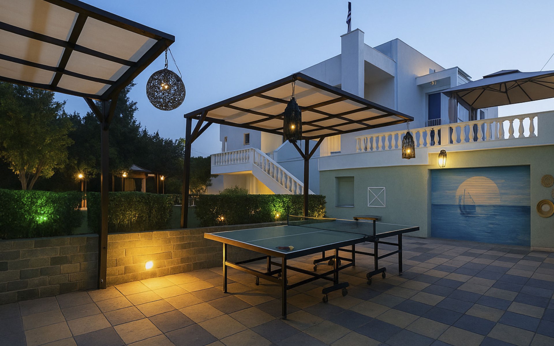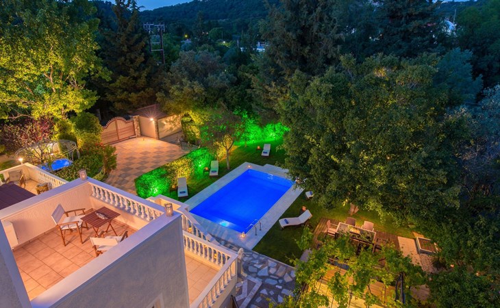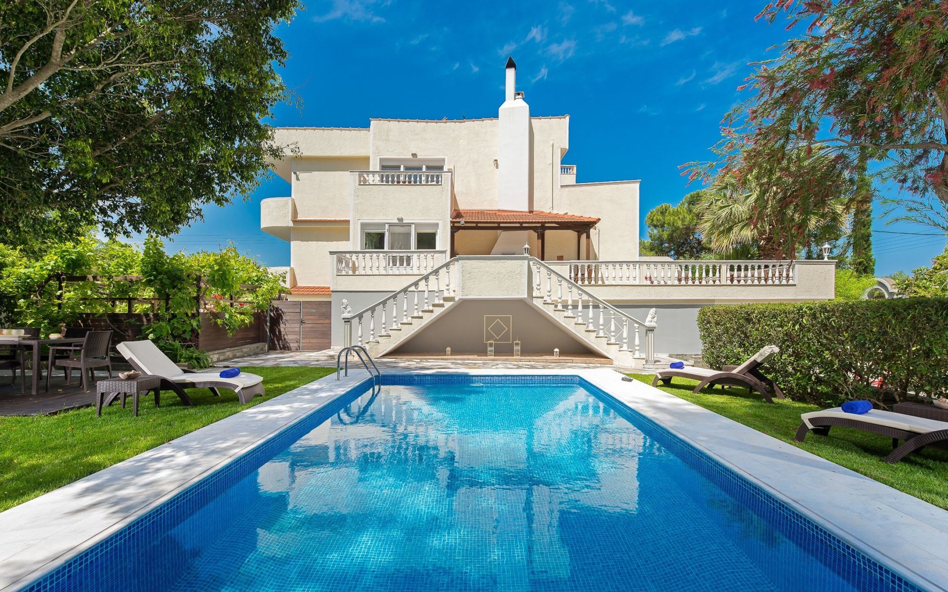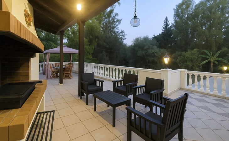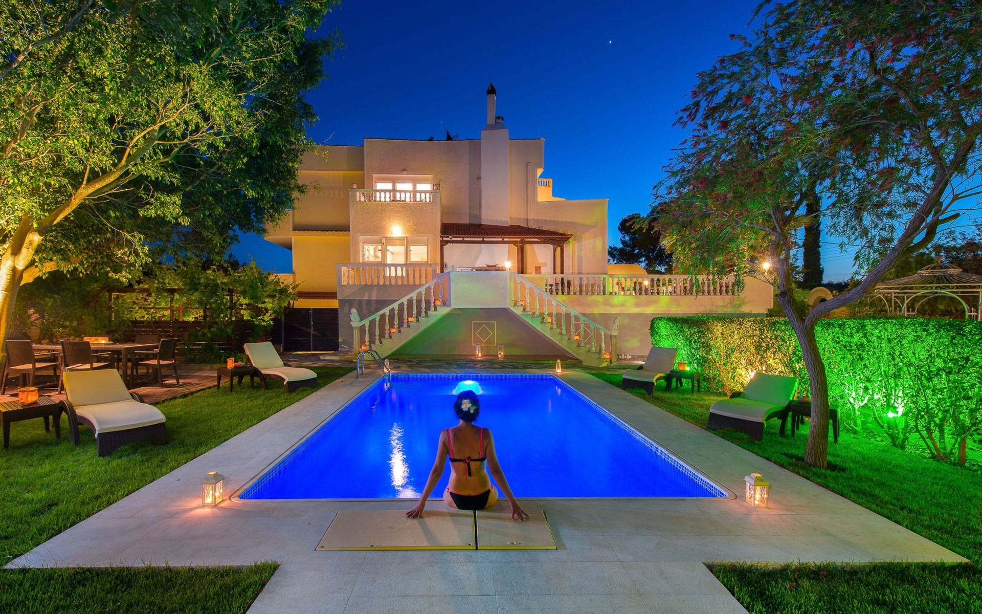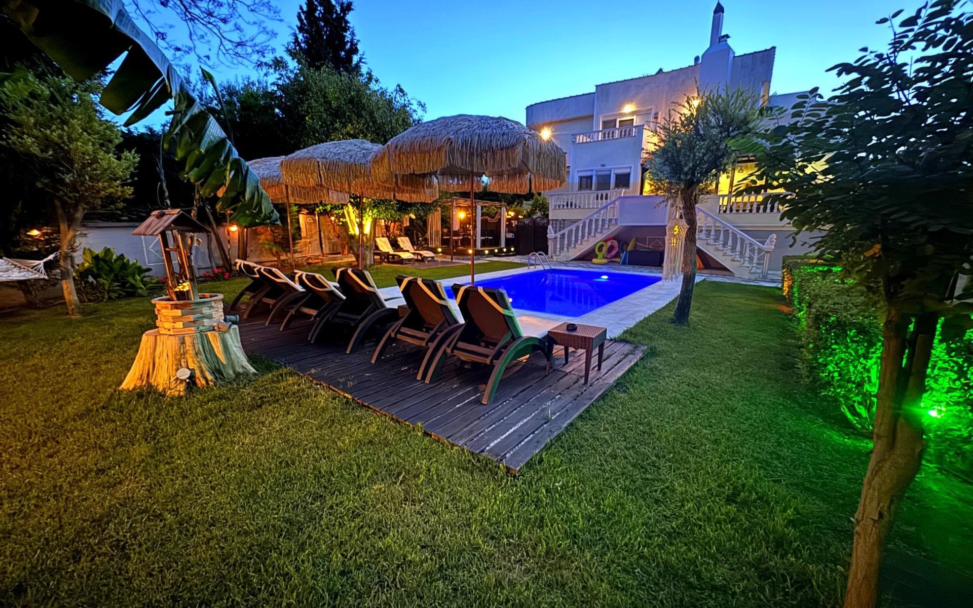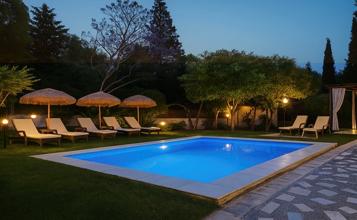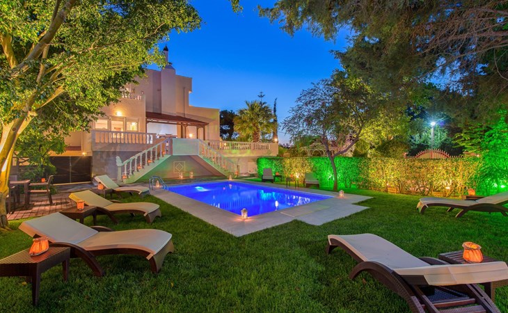 The freshwater swimming pool is adorned with elegant Greek white marble tiles and is surrounded by outdoor furniture. You can sunbathe on stylish loungers with comfortable cushions or relax on the lawn under the shade of the trees.